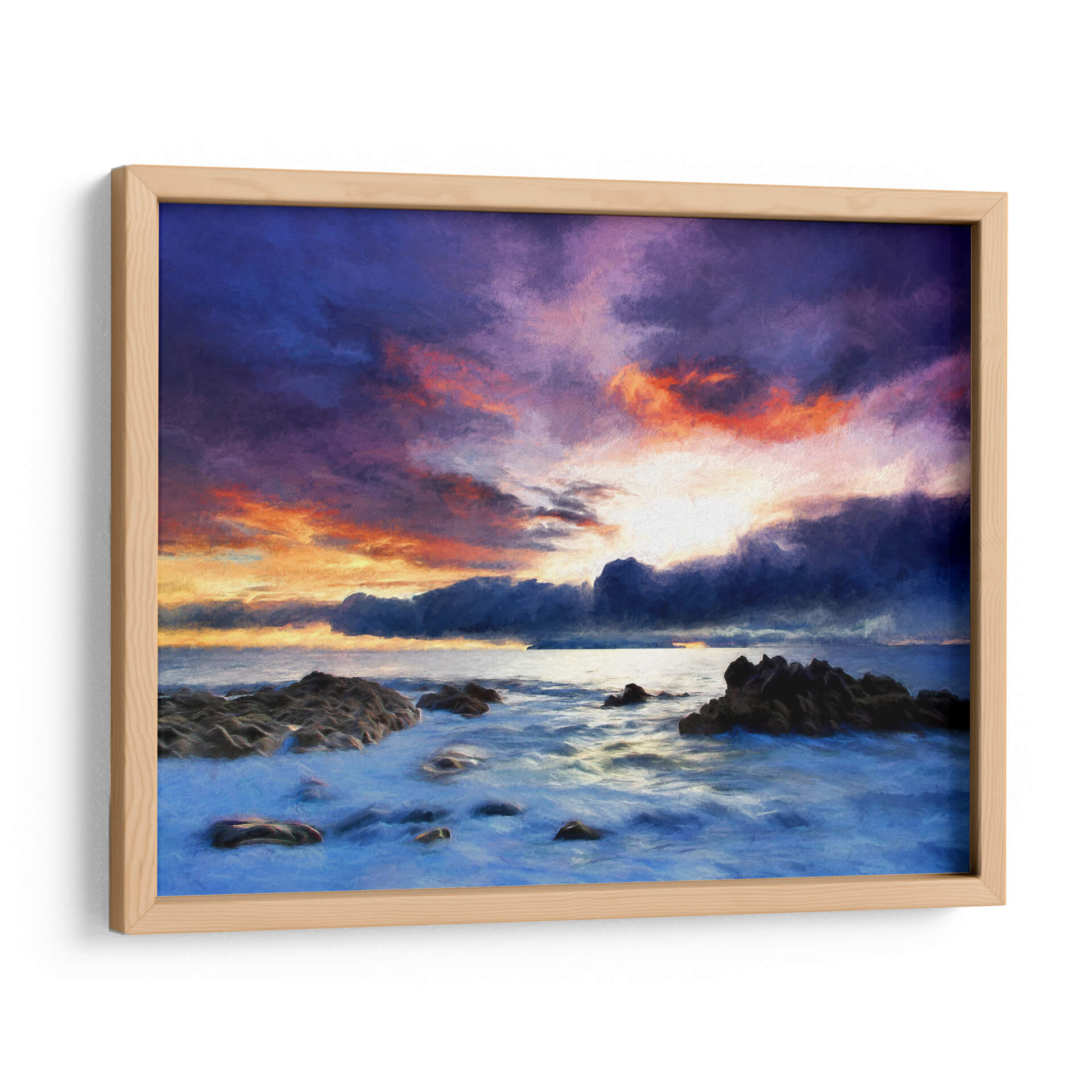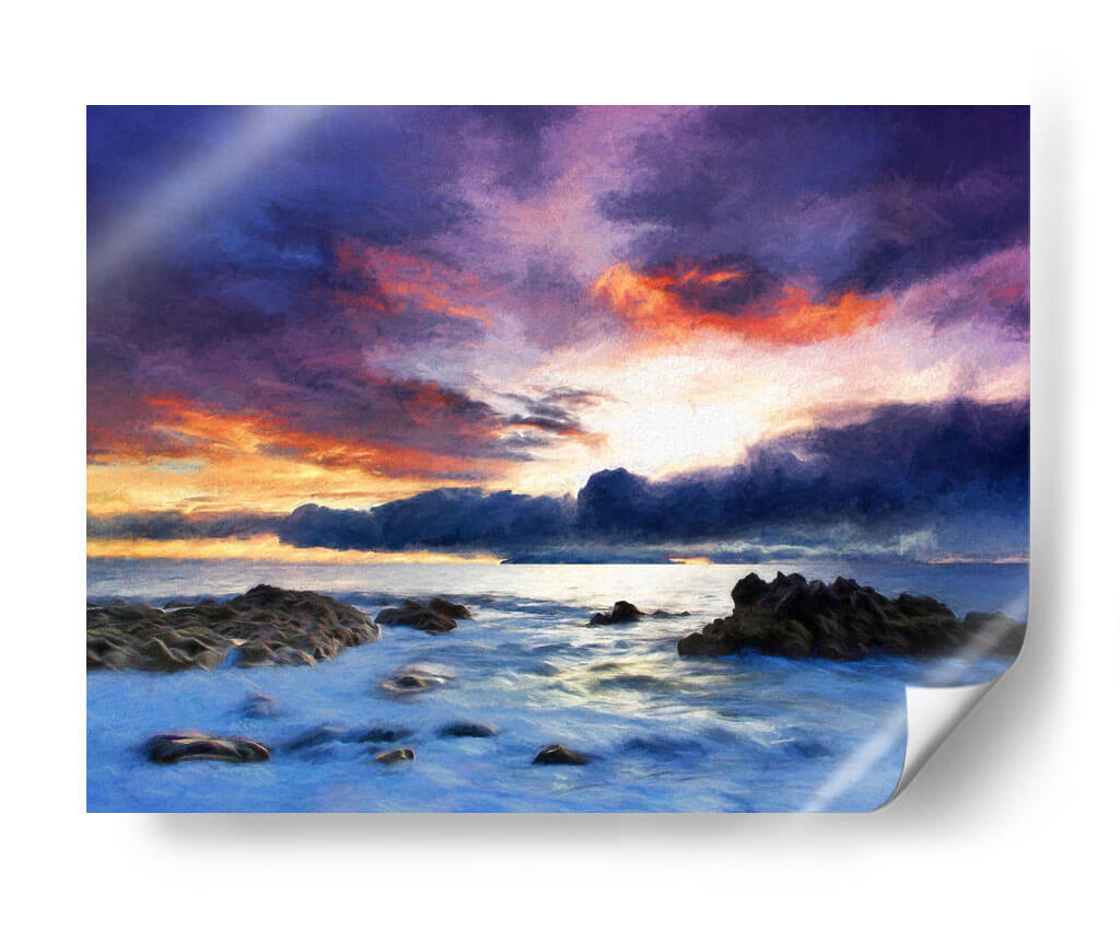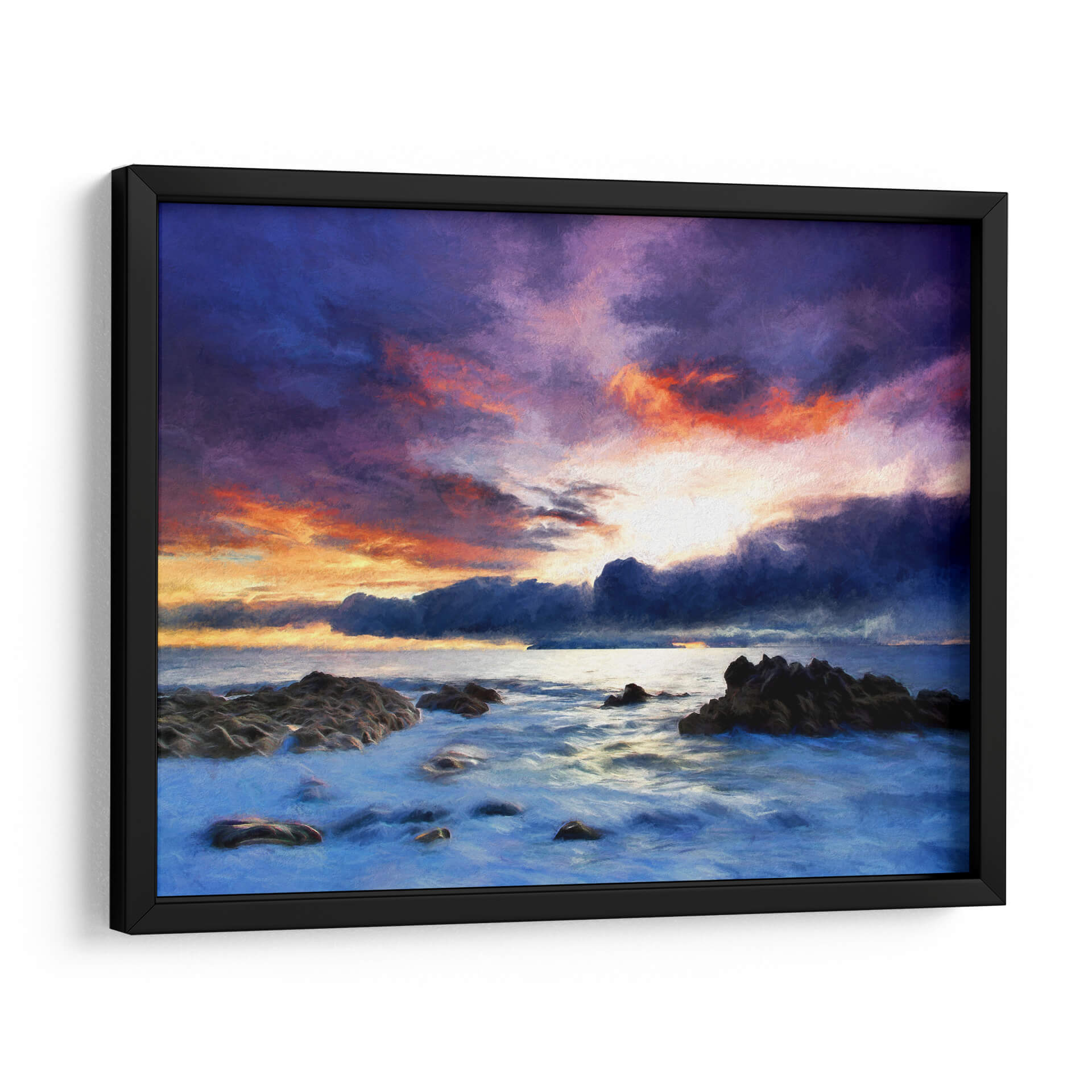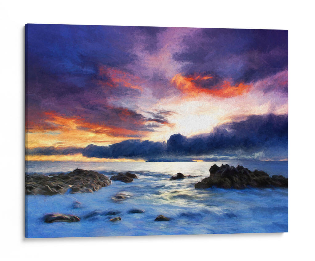 Sumérgete en la atmósfera cautivadora de "El Mar 11", una obra de arte que captura la dramática belleza de un atardecer sobre el océano. El artista Marcos Rodríguez nos transporta a una escena donde el cielo se tiñe de intensos púrpuras y naranjas vibrantes, contrastando con las nubes oscuras y densas que presagian la noche. Las olas, representadas con pinceladas expresivas, rompen suavemente contra rocas volcánicas sumergidas, creando un juego de luces y sombras que añade profundidad y movimiento a la composición. La paleta de colores, rica y emotiva, evoca una sensación de calma y poder de la naturaleza, perfecta para aquellos que buscan infundir serenidad y un toque de drama en su espacio vital. Este cuadro decorativo es ideal para salones modernos, dormitorios que buscan un refugio de paz, o incluso oficinas que desean un punto focal inspirador. "El Mar 11" no es solo una pieza decorativa, sino una ventana a la fuerza y la belleza del mundo natural, invitando a la reflexión y la contemplación. Su estilo pictórico, que recuerda a una interpretación contemporánea del impresionismo, permite que cada detalle sea apreciado, desde la textura del agua hasta el juego cromático del cielo. Añade esta obra maestra a tu colección y transforma tu entorno en un oasis de tranquilidad y arte.