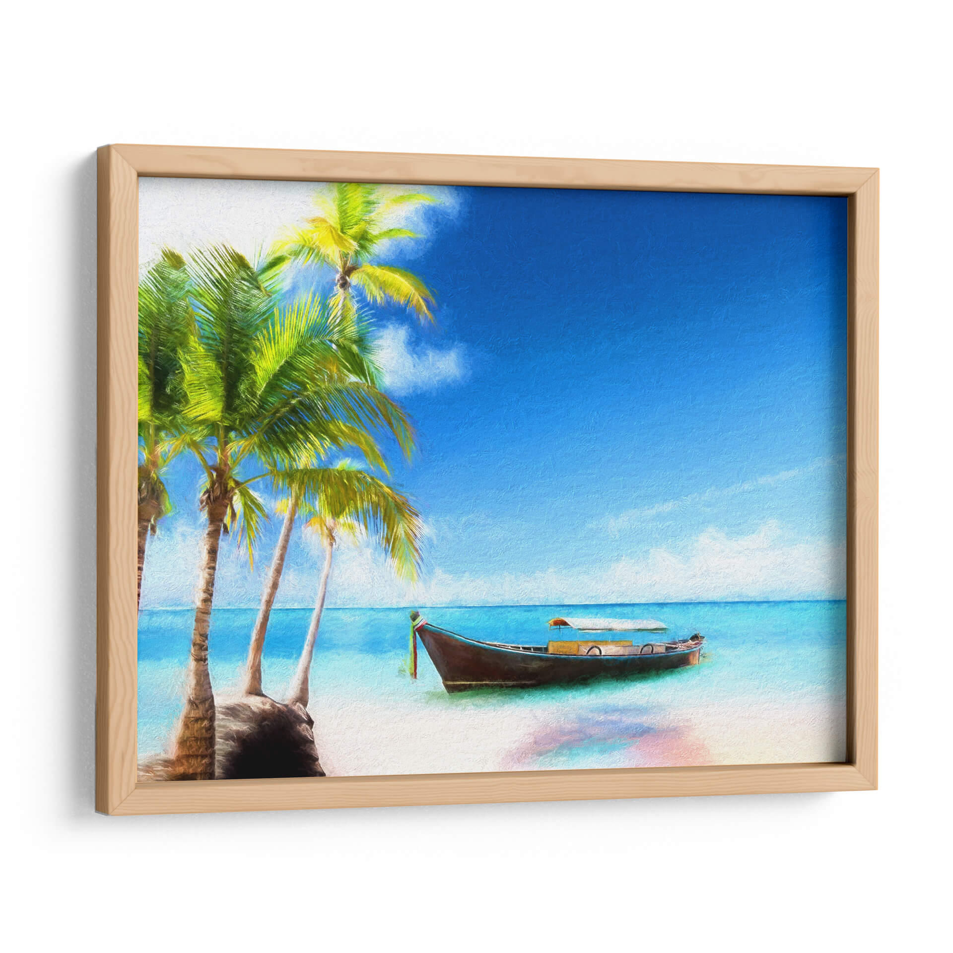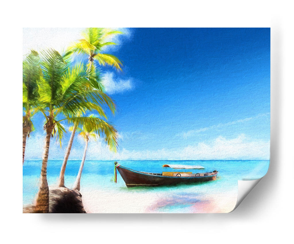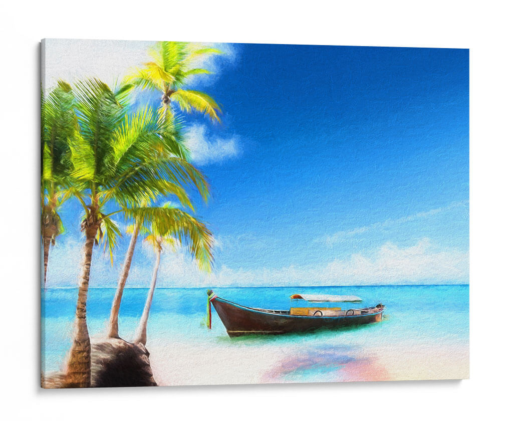 Sumérgete en la serenidad del trópico con "El Mar 13", una obra de arte cautivadora del artista Marcos Rodríguez. Este cuadro decorativo transporta al espectador a una playa paradisíaca, donde vibrantes palmeras se alzan majestuosamente contra un cielo azul intenso y despejado, salpicado por tenues nubes blancas. Las aguas cristalinas, de un turquesa translúcido, invitan a la contemplación, reflejando sutiles toques de color en la arena blanca y limpia. En el centro de la composición, una embarcación tradicional descansa plácidamente sobre el mar, evocando una sensación de calma y escapismo. La técnica pictórica utilizada, con pinceladas que recuerdan al óleo, añade una textura rica y una profundidad visual que da vida a la escena. "El Mar 13" es ideal para aquellos que buscan infundir en su hogar u oficina una atmósfera de paz, vacaciones y conexión con la naturaleza. Este lienzo es perfecto para crear un rincón de relajación en tu sala de estar, dormitorio o cualquier espacio que necesite un toque de frescura y vitalidad, transformando tu entorno en un oasis de tranquilidad y belleza natural, un verdadero escape visual.