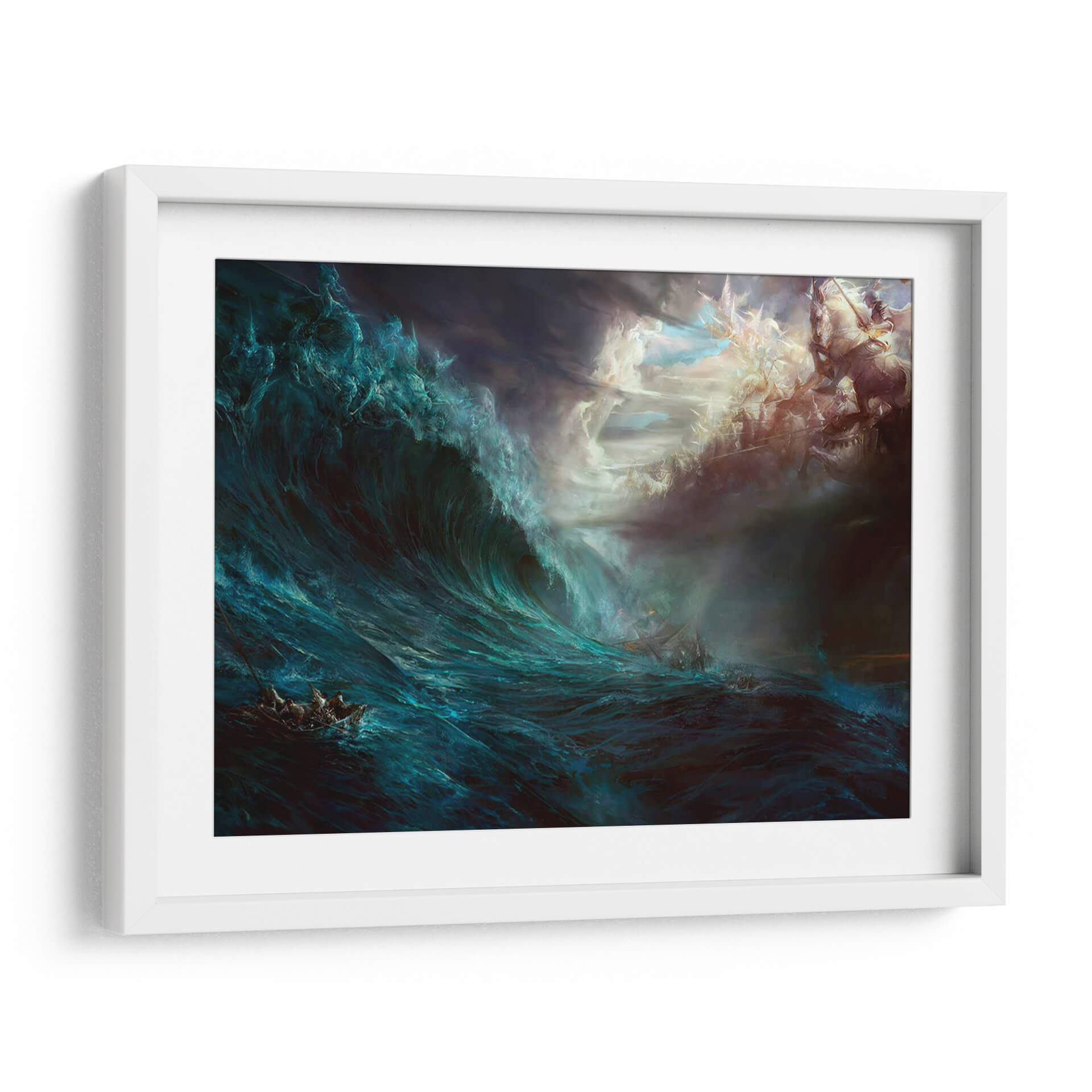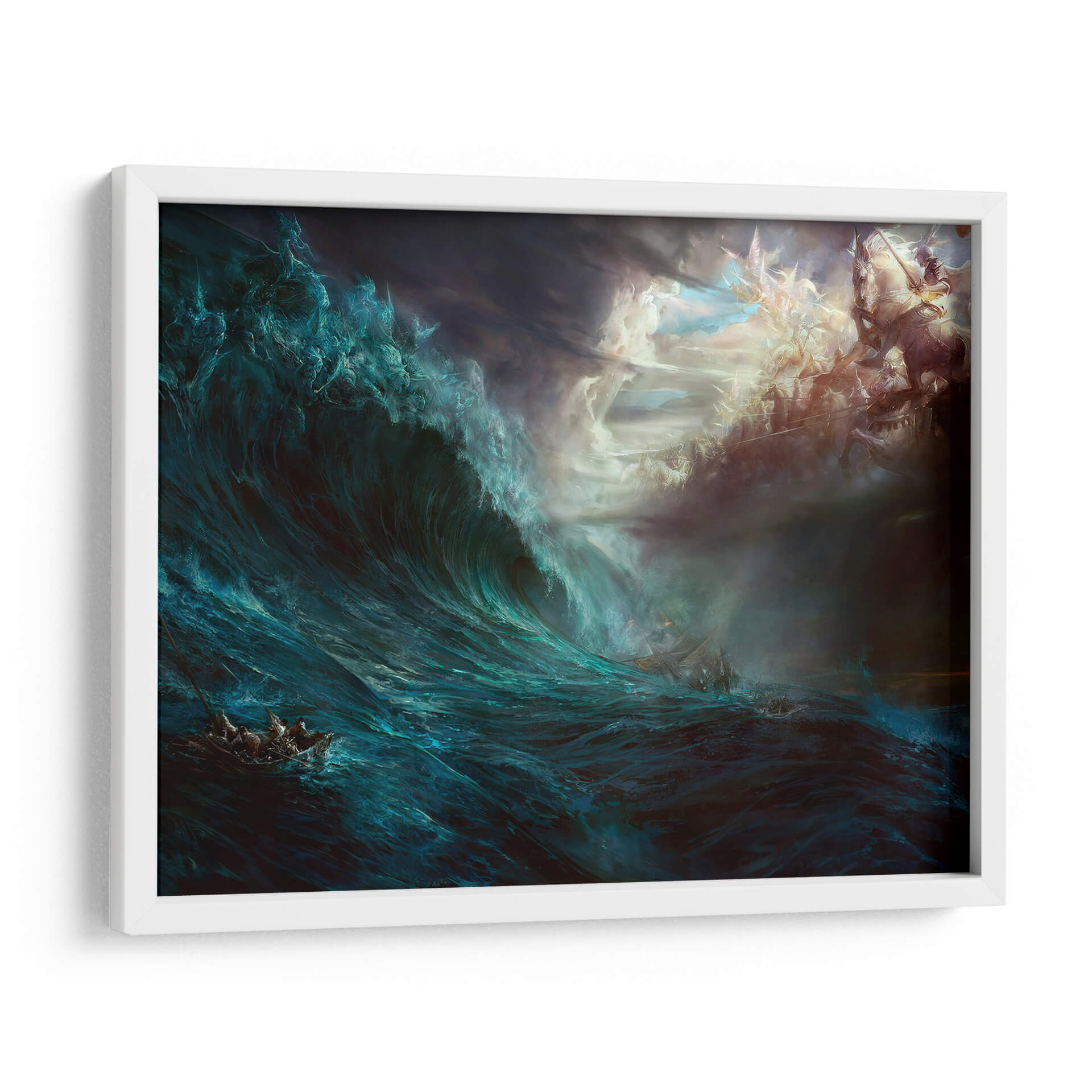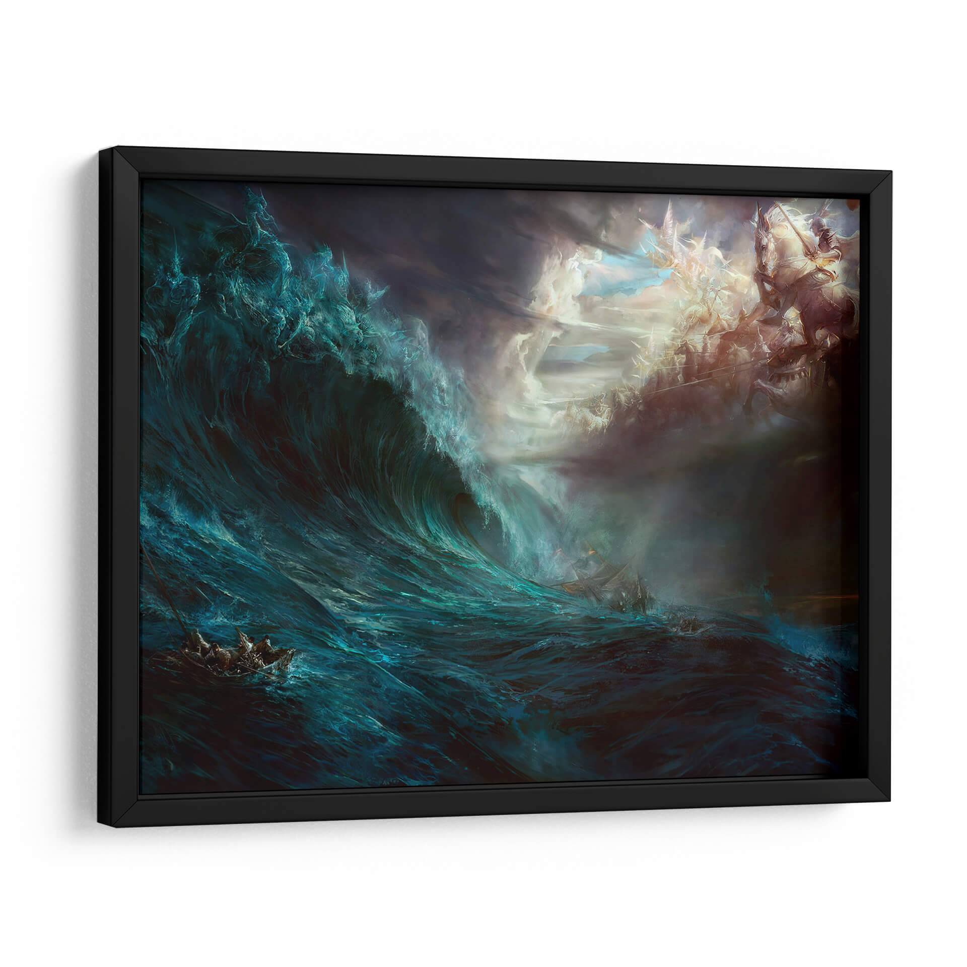 Sumérgete en la potencia cruda y la majestuosidad de "Guerra Elemental", una obra de arte que captura la furia indómita de la naturaleza y la lucha humana contra sus fuerzas. Esta pieza visualmente impactante presenta una ola colosal, teñida en profundos tonos de azul y turquesa, que se alza amenazadoramente, lista para engullir pequeños barcos que luchan por sobrevivir en su inmensidad. El contraste entre la oscuridad tormentosa del cielo y los rayos de luz que se filtran, iluminando una batalla celestial o una escena épica en la distancia, añade una capa de misterio y drama. La paleta de colores, dominada por los intensos azules del mar y los tonos sombríos del cielo, evoca una sensación de poder, desafío y la fragilidad de la existencia. El estilo detallado y casi realista de la representación, combinado con su composición dinámica, crea una experiencia inmersiva que invita a la reflexión sobre la resiliencia y la insignificancia ante lo sublime. "Guerra Elemental" es un cuadro decorativo perfecto para espacios que buscan transmitir fuerza y emoción, ideal para un estudio, una sala de estar moderna o cualquier lugar donde se desee un punto focal dramático y evocador. Una invitación a contemplar la belleza salvaje y la fuerza imparable del mundo natural.
