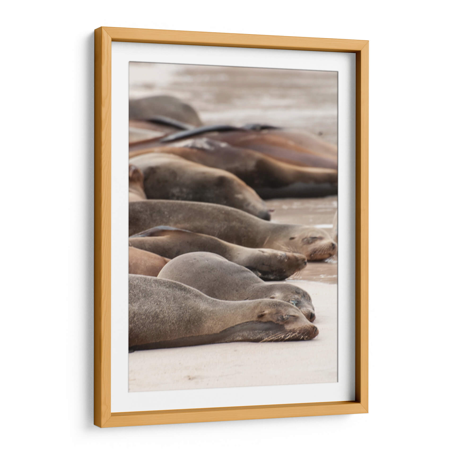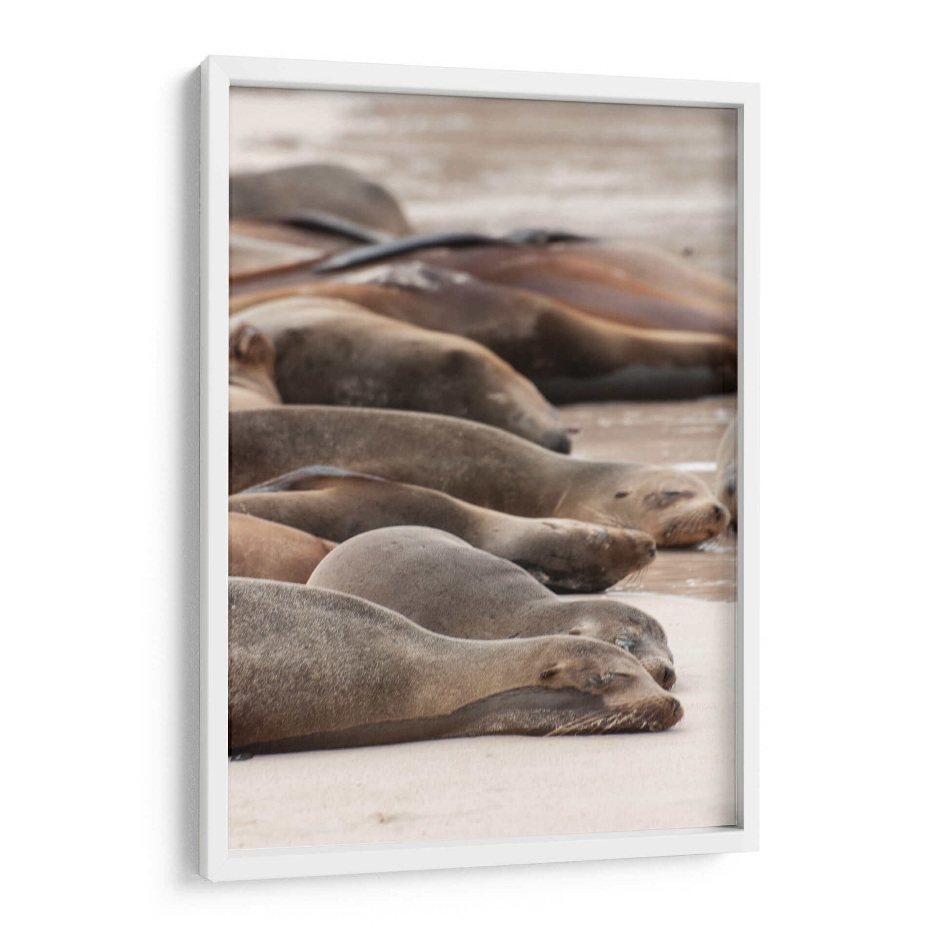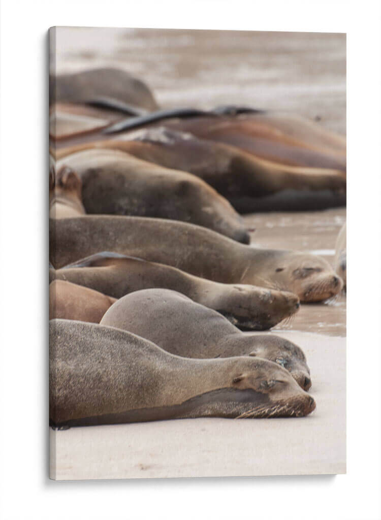 Sumérgete en la serena belleza de las Islas Galápagos con esta cautivadora obra de arte de Jaime López Portillo. La fotografía captura un momento íntimo de lobos marinos descansando en la playa, sus formas relajadas y la suave luz creando una atmósfera de paz y tranquilidad. La paleta de colores, dominada por tonos tierra y suaves grises, evoca la naturalidad del entorno, mientras que la composición en primer plano atrae la mirada hacia el detalle de las texturas de la piel y la quietud de los animales. Esta pieza es ideal para quienes buscan infundir calma y una conexión con la naturaleza en su hogar u oficina. Imagina este cuadro decorativo aportando un toque de serenidad exótica a tu sala de estar, dormitorio o estudio, recordándote la belleza salvaje y la armonía del ecosistema de Galápagos. Una elección perfecta para amantes de la vida silvestre y la fotografía contemplativa.