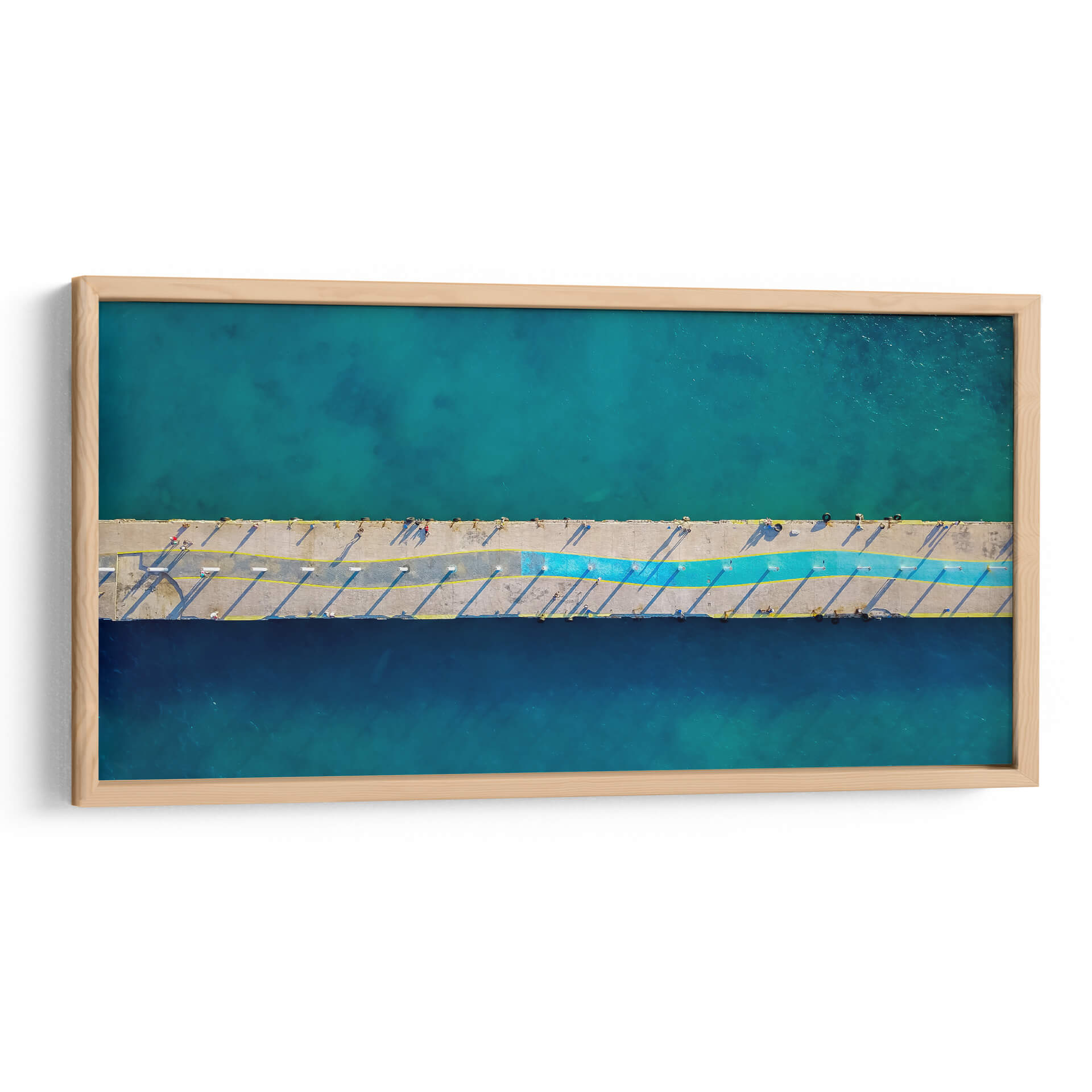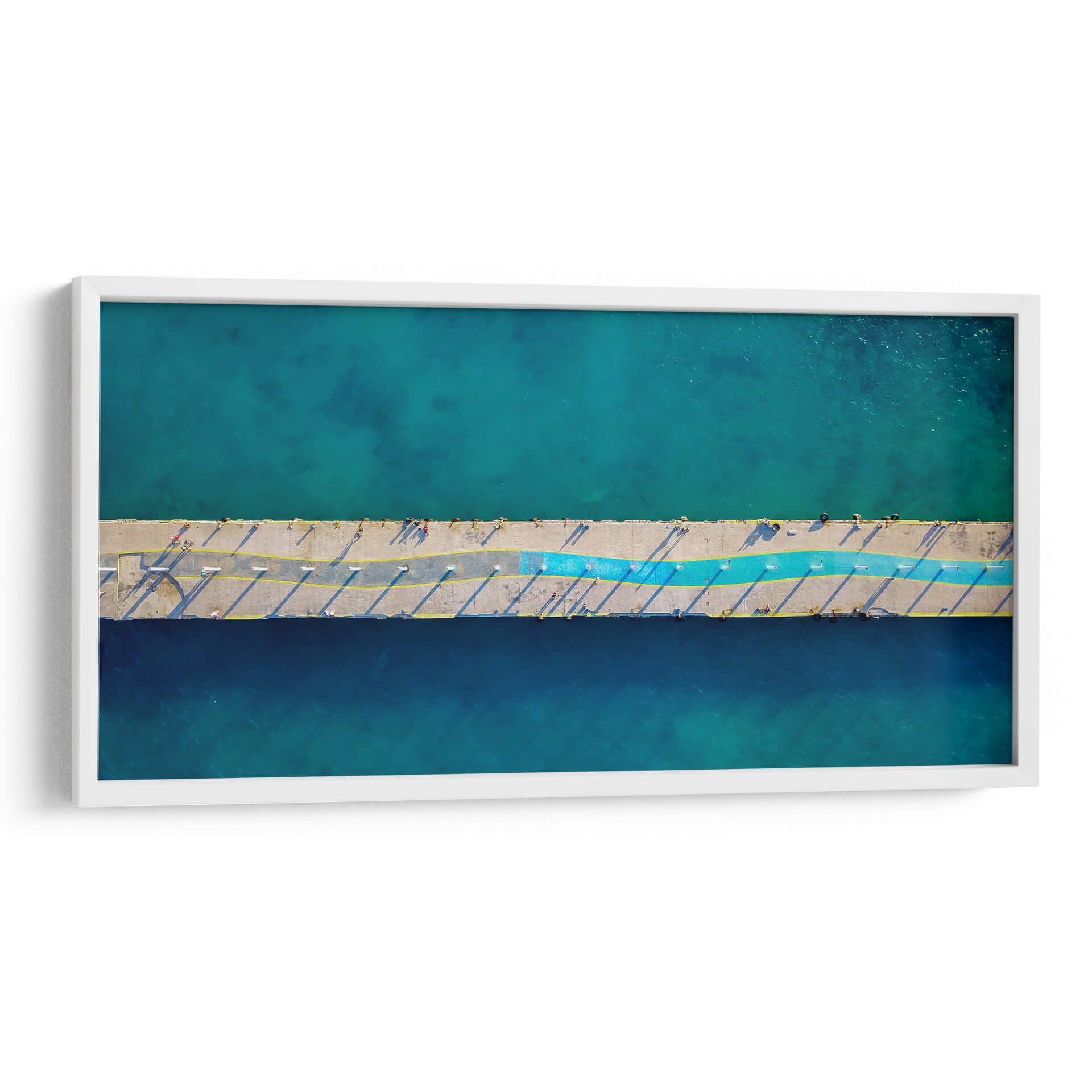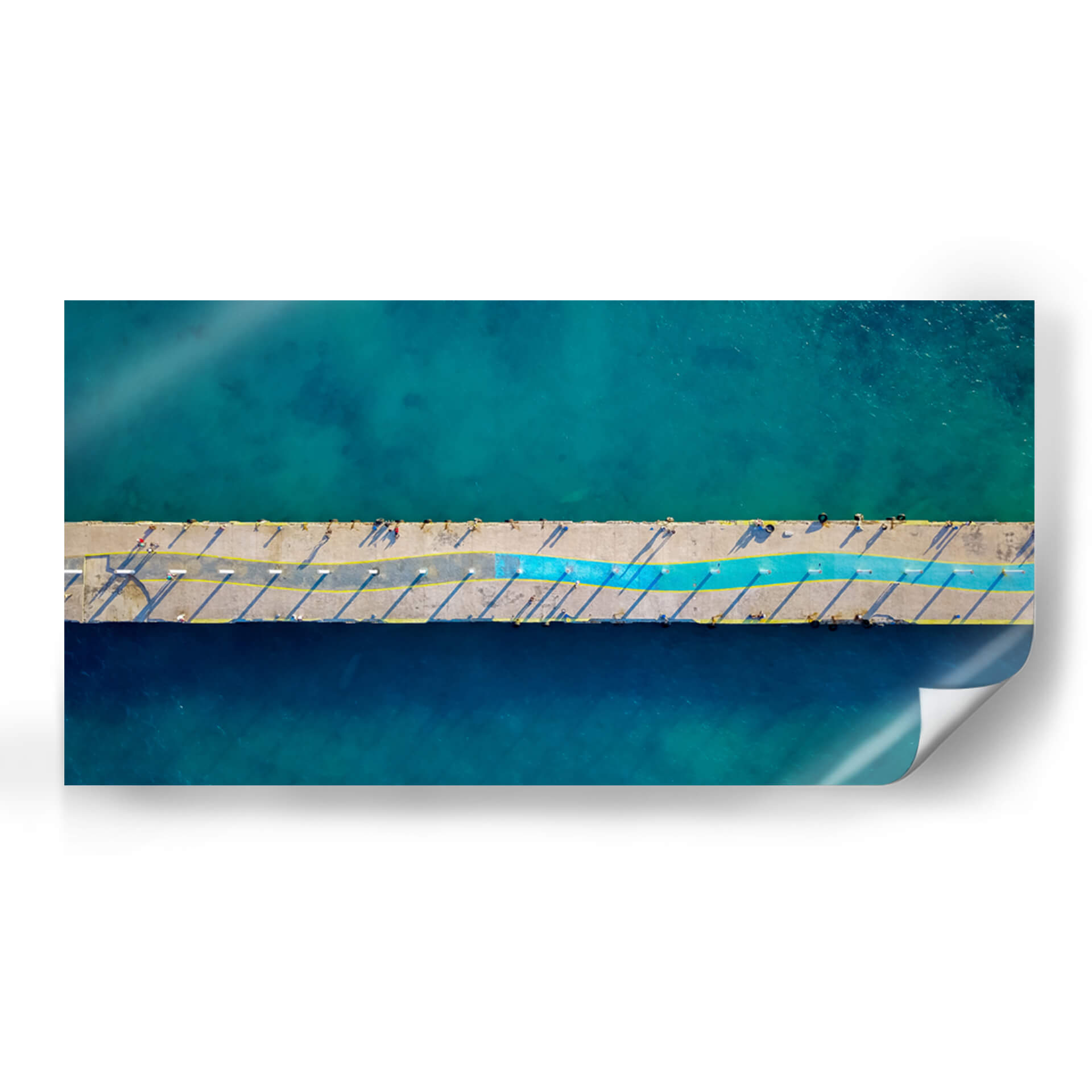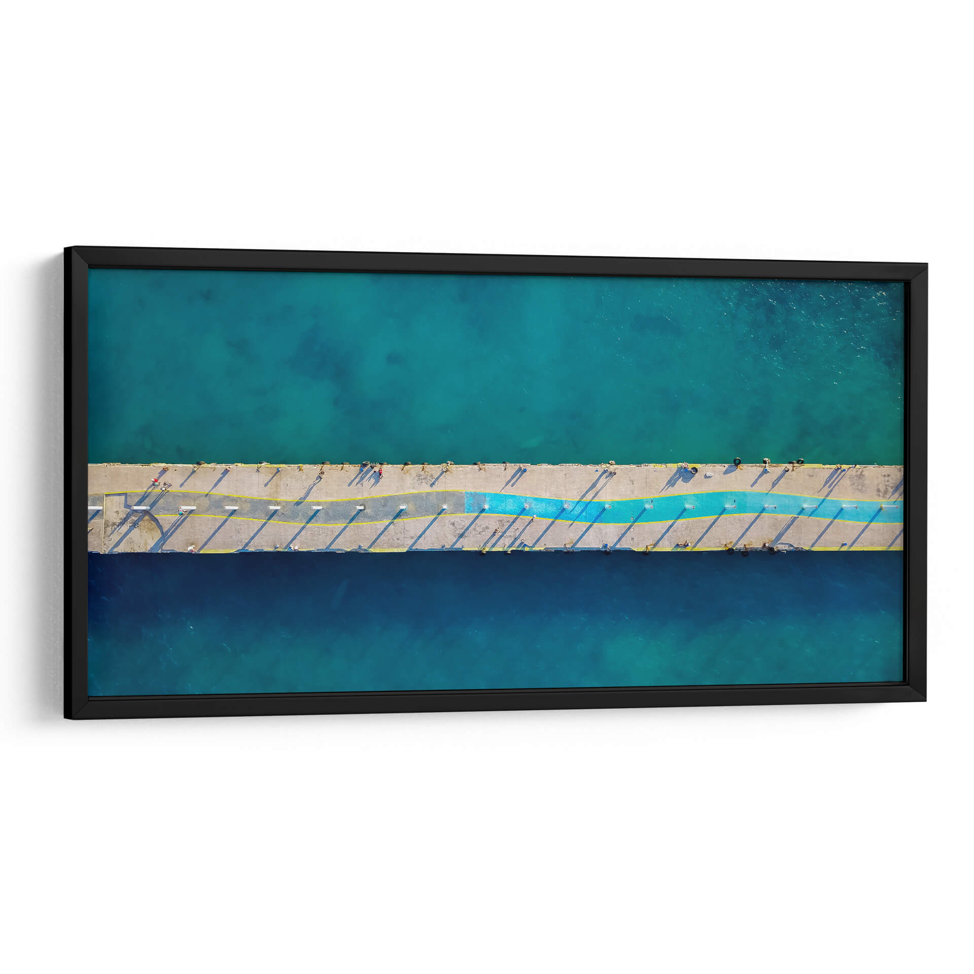 Sumérgete en la serenidad del mar con "Muelle principal", una obra de arte que captura la esencia de la costa desde una perspectiva aérea única. Esta pieza, titulada "Muelle principal" y firmada por LuisFloresPhoto, te transporta a un día soleado junto al agua, donde el concreto del muelle se encuentra con el vibrante azul turquesa y profundo del océano. La composición, vista desde arriba, revela la geometría del muelle, acentuada por las sombras alargadas y líneas amarillas que dividen el espacio. Un toque de azul vibrante recorre el centro, añadiendo un dinamismo sutil a la escena. La fotografía evoca una sensación de calma, libertad y la belleza serena de la vida costera. Ideal para espacios que buscan una conexión con la naturaleza y un toque de sofisticación moderna, este cuadro decorativo es perfecto para salones, dormitorios o incluso oficinas, aportando una atmósfera de tranquilidad y escapismo. La paleta de azules y grises, con destellos de amarillo y un toque de color, la convierte en una adición versátil para cualquier decoración contemporánea.