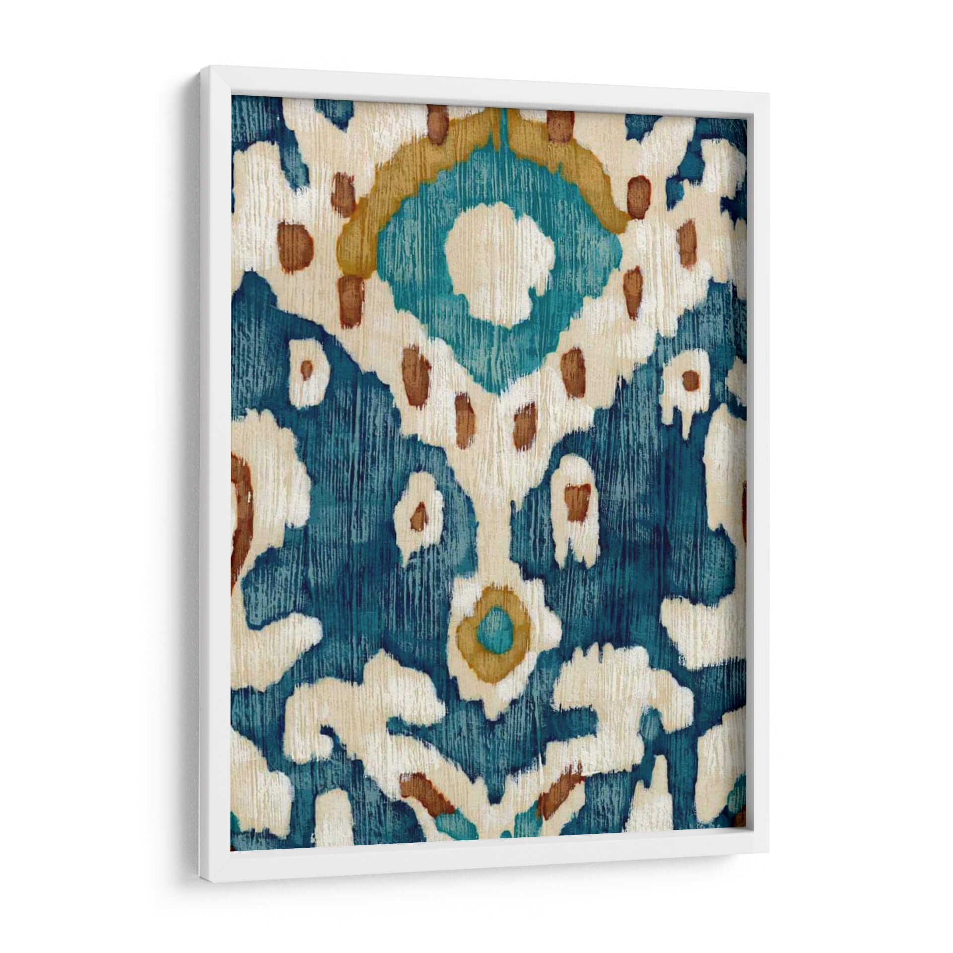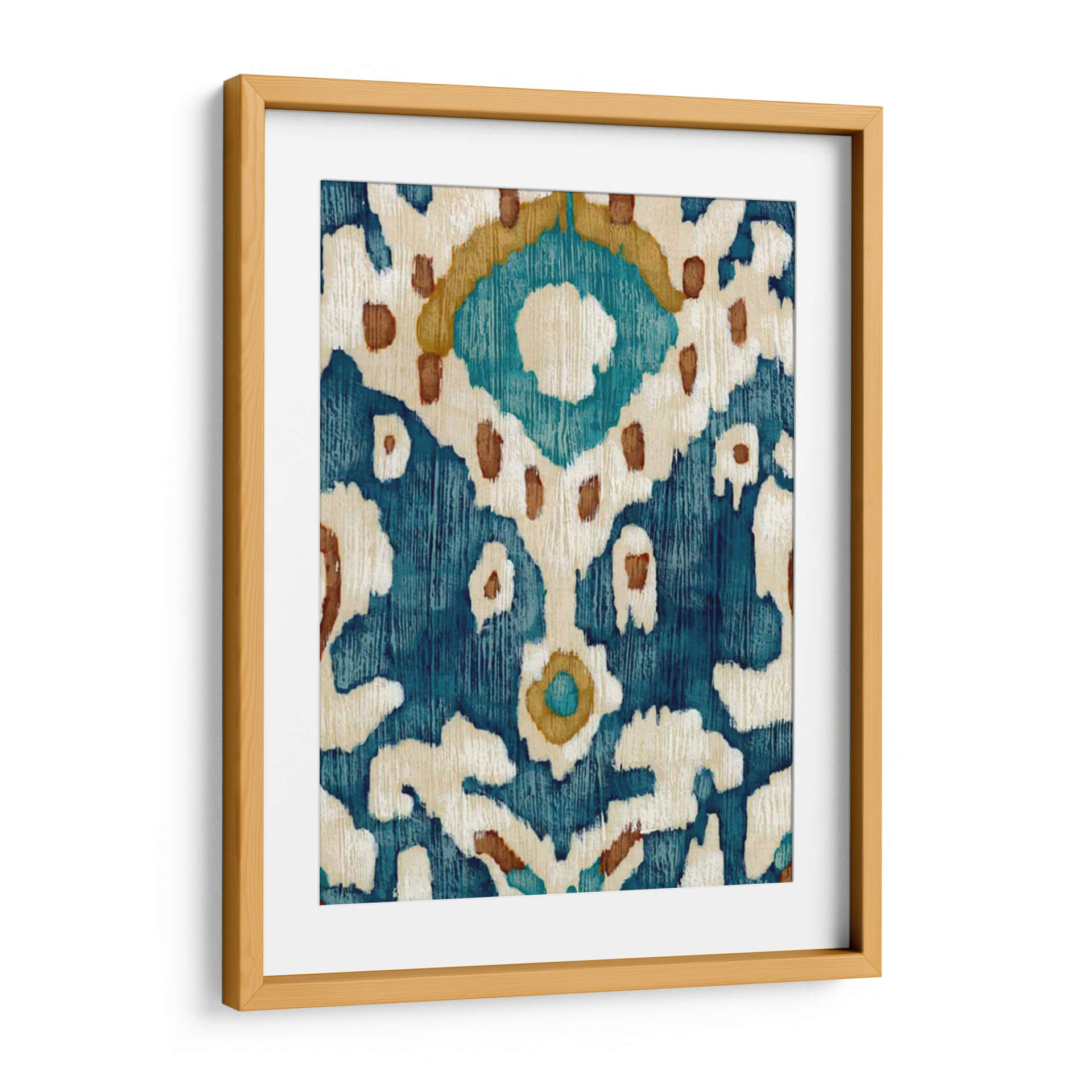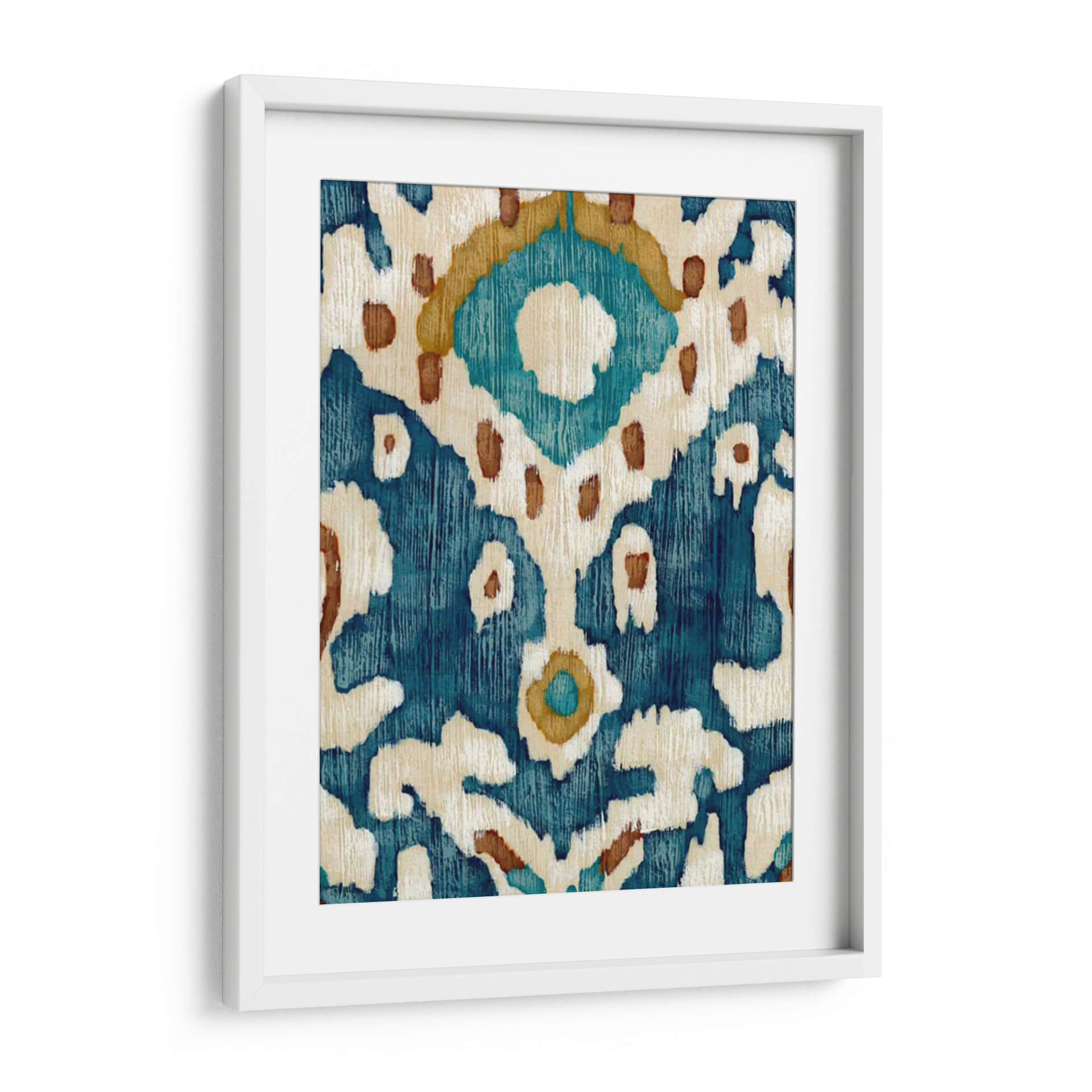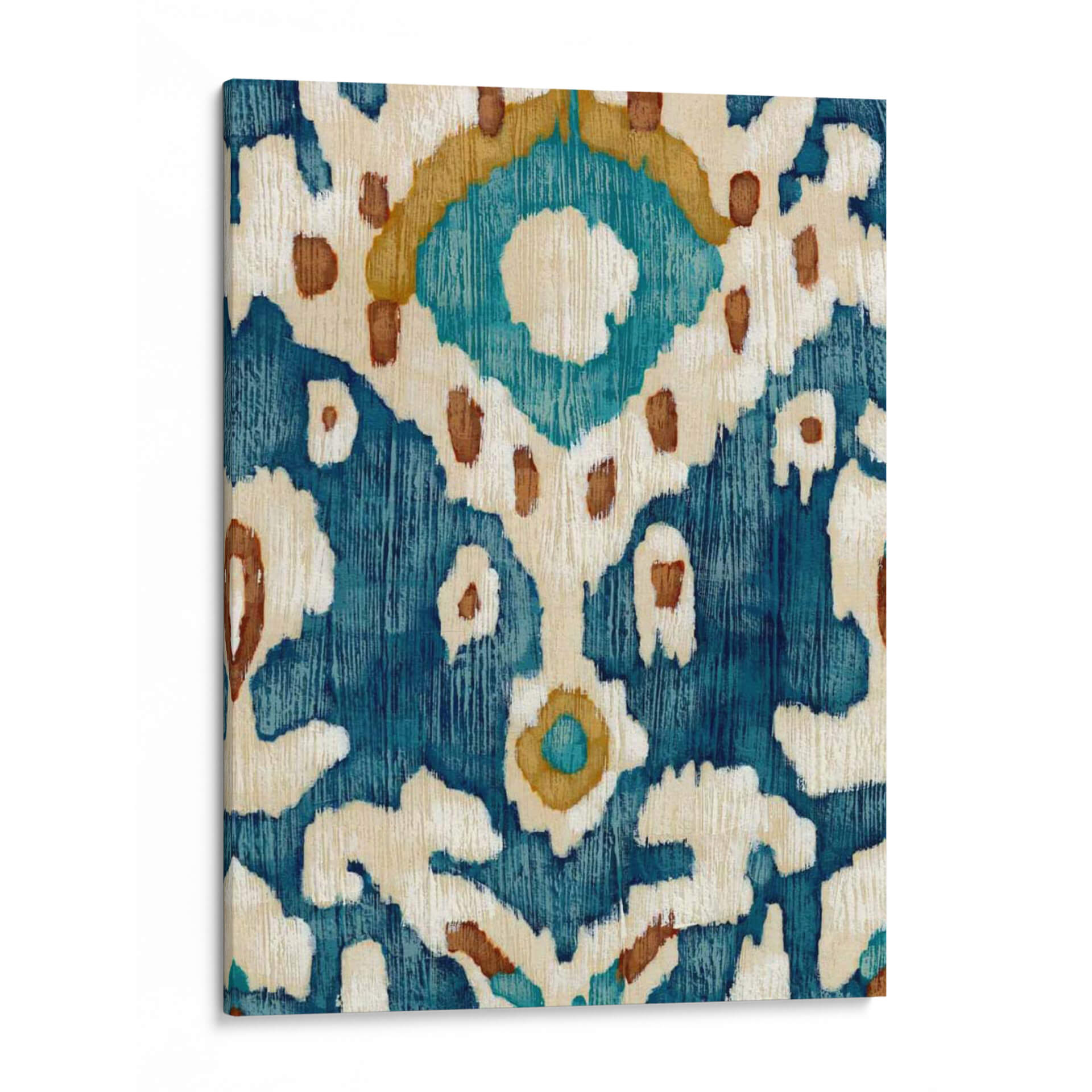 Sumérgete en la serenidad y el estilo étnico con "Océano Ikat II", una obra de arte contemporáneo de Chariklia Zarris. Este cuadro decorativo evoca la riqueza de los textiles tradicionales con su intrincado patrón que recuerda a la técnica ikat. La paleta de colores, dominada por profundos azules marinos y turquesas vibrantes, se complementa con toques cálidos de ocre y detalles en blanco roto, creando una atmósfera de calma y sofisticación. Las pinceladas texturizadas y el diseño orgánico de las formas abstractas sugieren un movimiento suave, como las olas del océano que inspiran su nombre, aportando dinamismo y profundidad visual a cualquier espacio. "Océano Ikat II" es una pieza versátil, perfecta para añadir un toque de color y un aire bohemio chic a salones modernos, dormitorios acogedores u oficinas que buscan un ambiente inspirador y relajado. Su diseño atemporal y su conexión con motivos culturales lo convierten en una elección excepcional para quienes aprecian el arte abstracto con un toque de historia y exotismo. Transforma tu pared en una ventana a la serenidad y el estilo.
