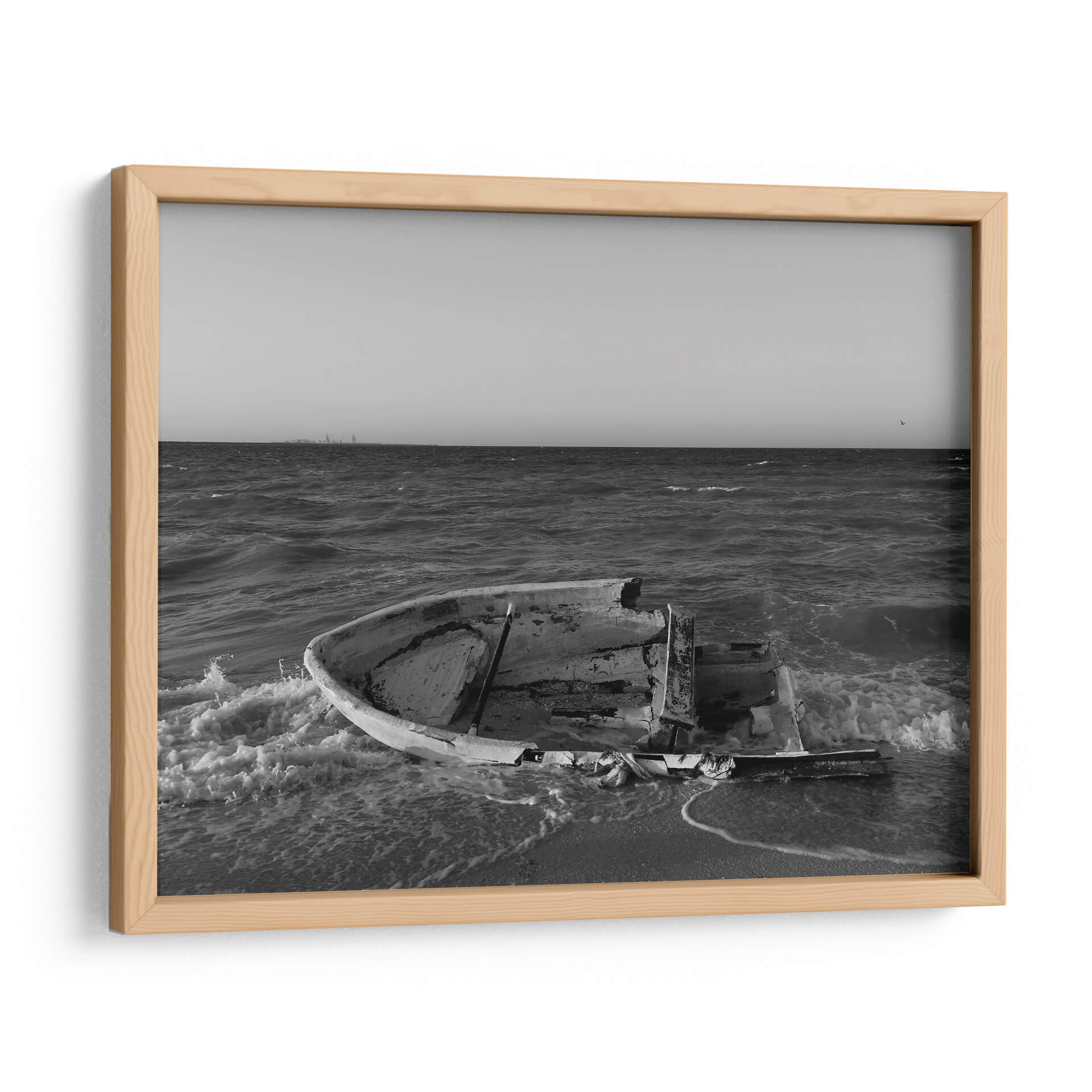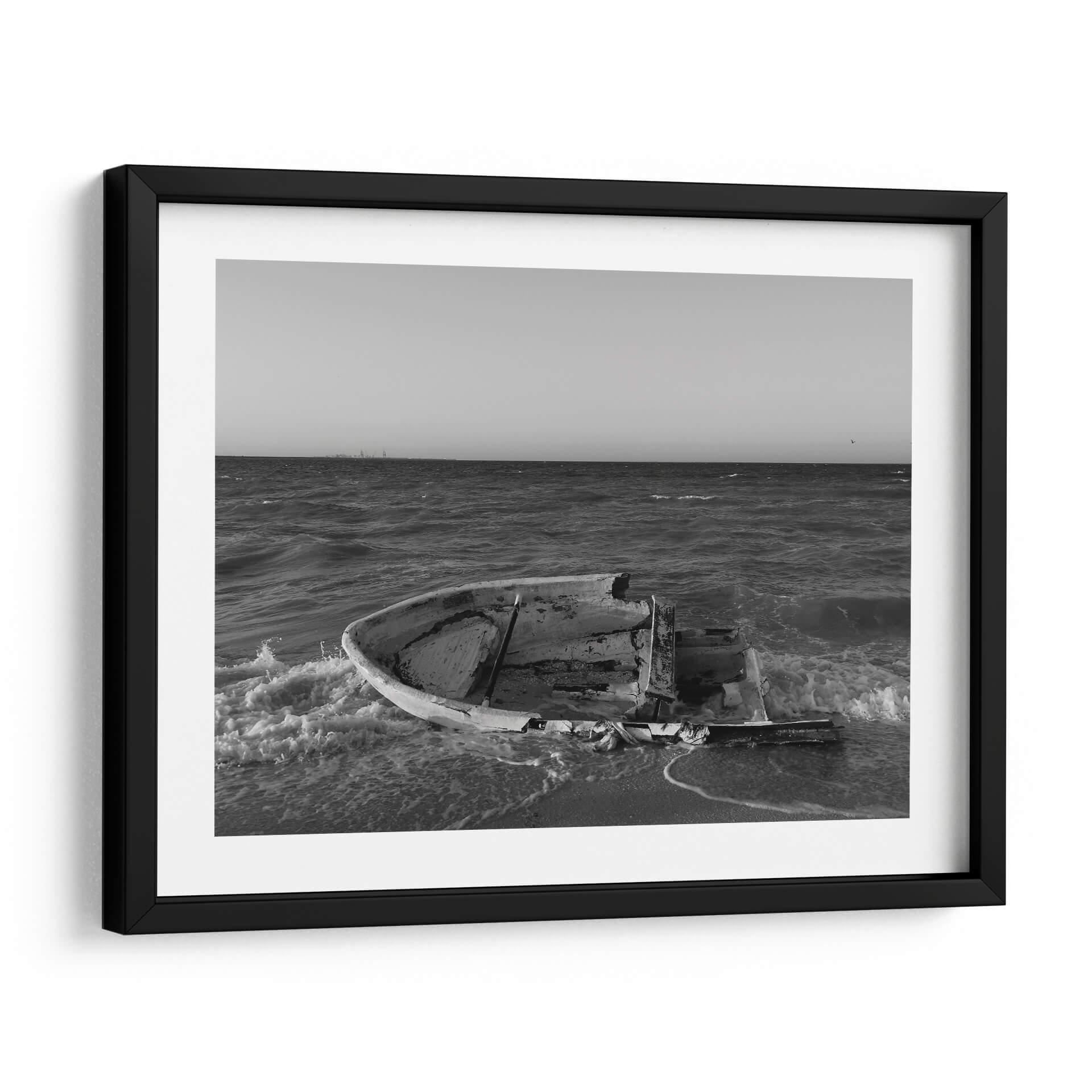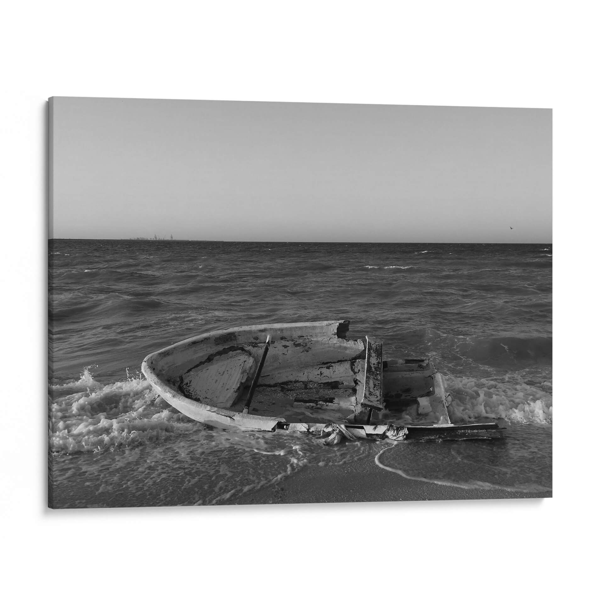 Sumérgete en la melancolía y la belleza del abandono con "Olvido", una obra fotográfica en blanco y negro del artista Hugo Segura. Esta impactante pieza captura un bote semihundido en la orilla, a merced de las olas que rompen suavemente sobre la arena. La fotografía, con su estética monocromática, realza las texturas del mar agitado y el deterioro de la embarcación, creando una atmósfera de reflexión sobre el paso del tiempo y la impermanencia. La composición, que sitúa el horizonte a dos tercios de la imagen, enfatiza la inmensidad del océano y la soledad del sujeto principal. Los sutiles detalles, como la lejanía de una silueta industrial y un pájaro diminuto en el cielo, añaden capas de significado a la narrativa visual. "Olvido" es ideal para espacios que buscan evocar introspección y serenidad, como un estudio, una biblioteca o un dormitorio, aportando un toque de profundidad y carácter. Este cuadro decorativo invita a la contemplación, convirtiéndose en un punto focal que dialoga con la quietud y la fuerza de la naturaleza, y los ecos de historias pasadas. Es una pieza que, a pesar de su temática, irradia una serena dignidad.