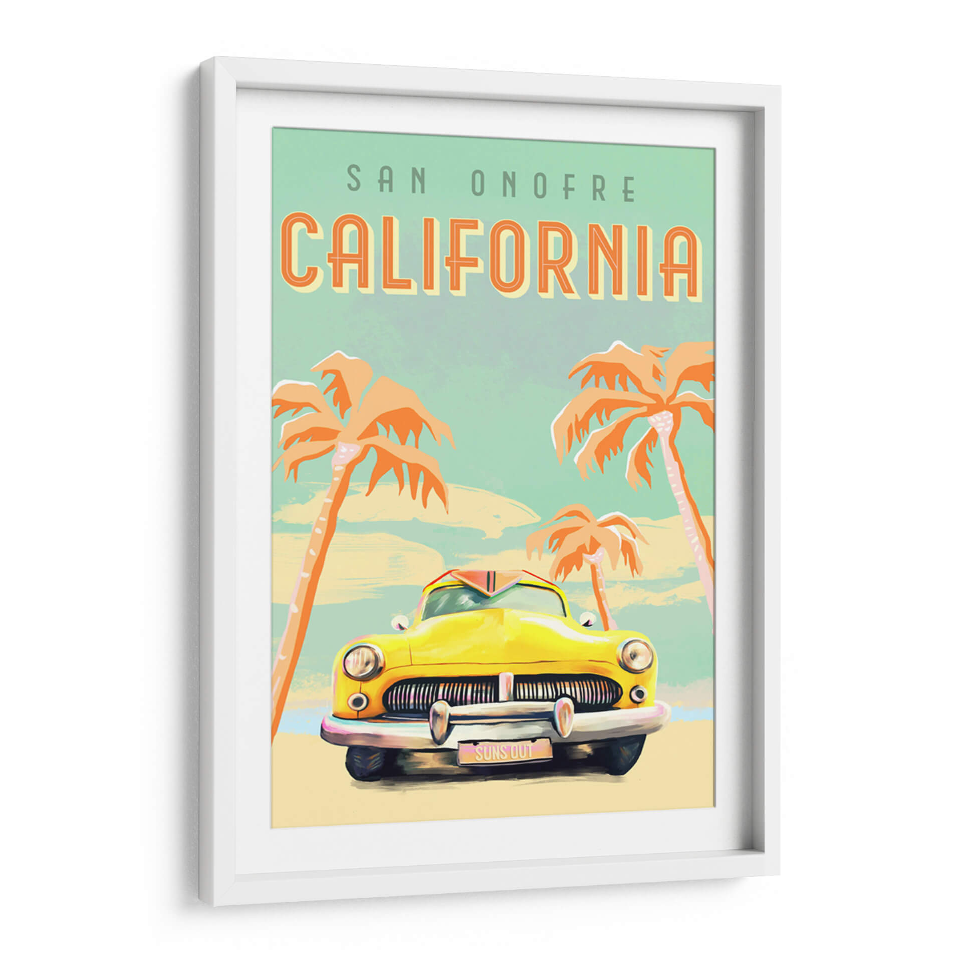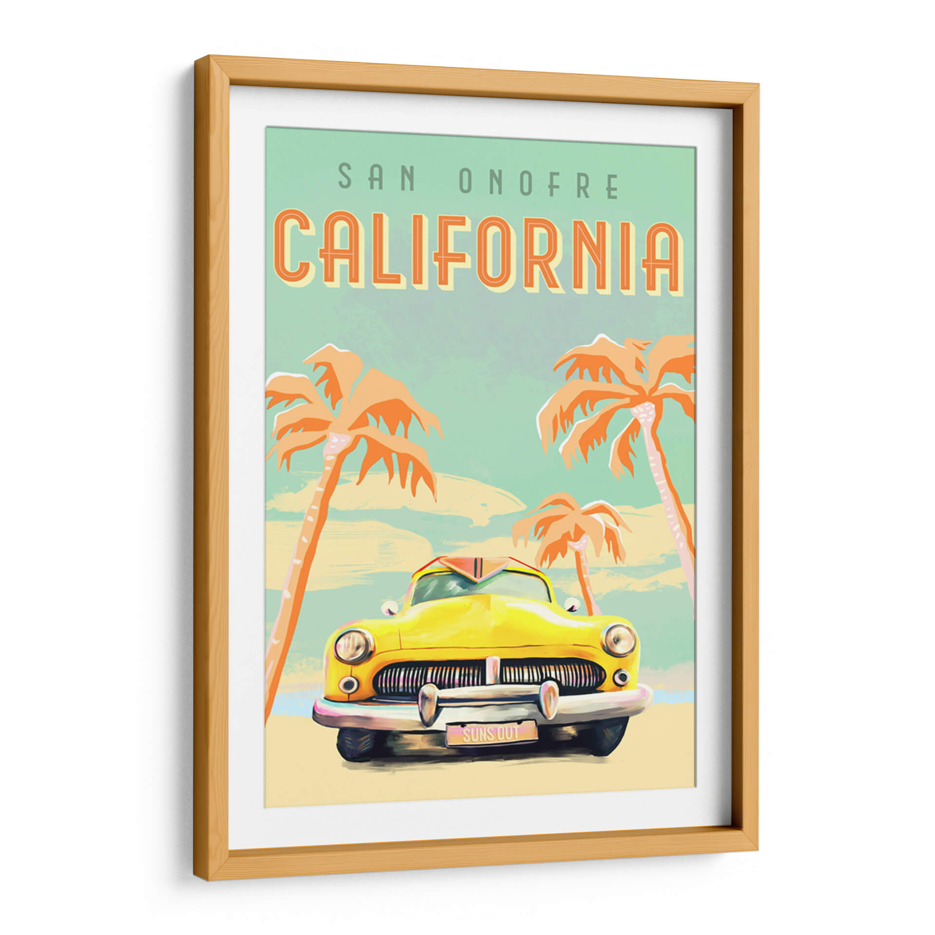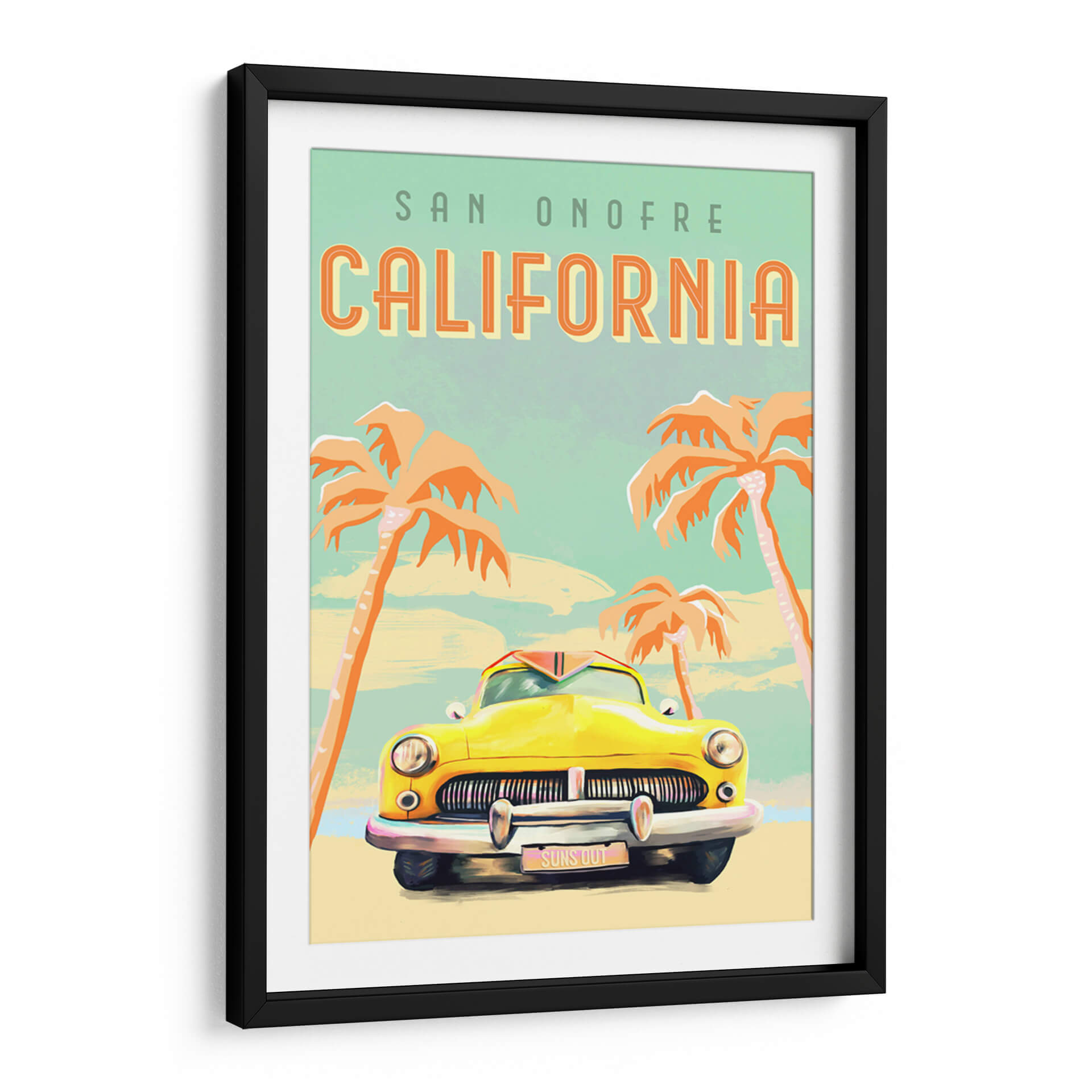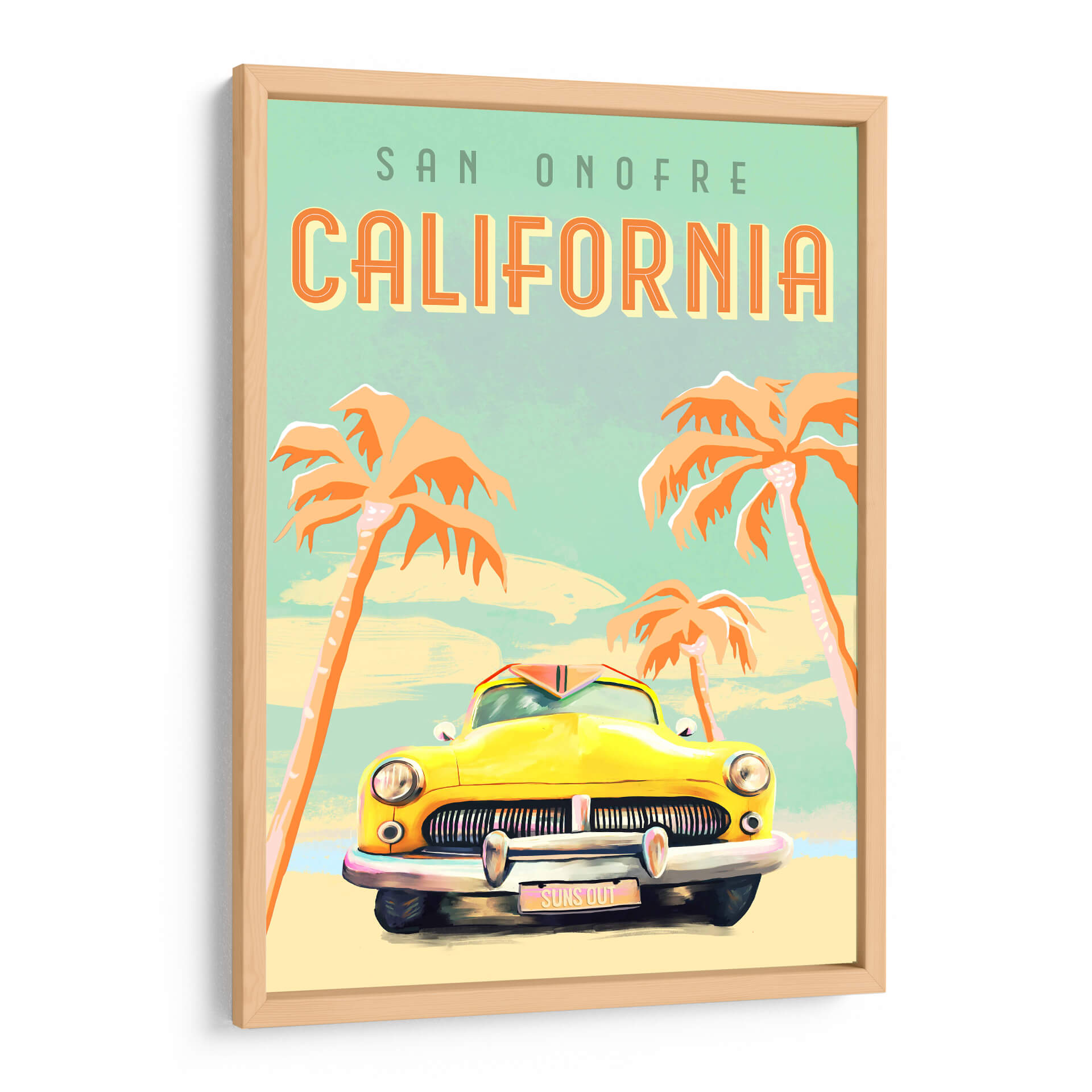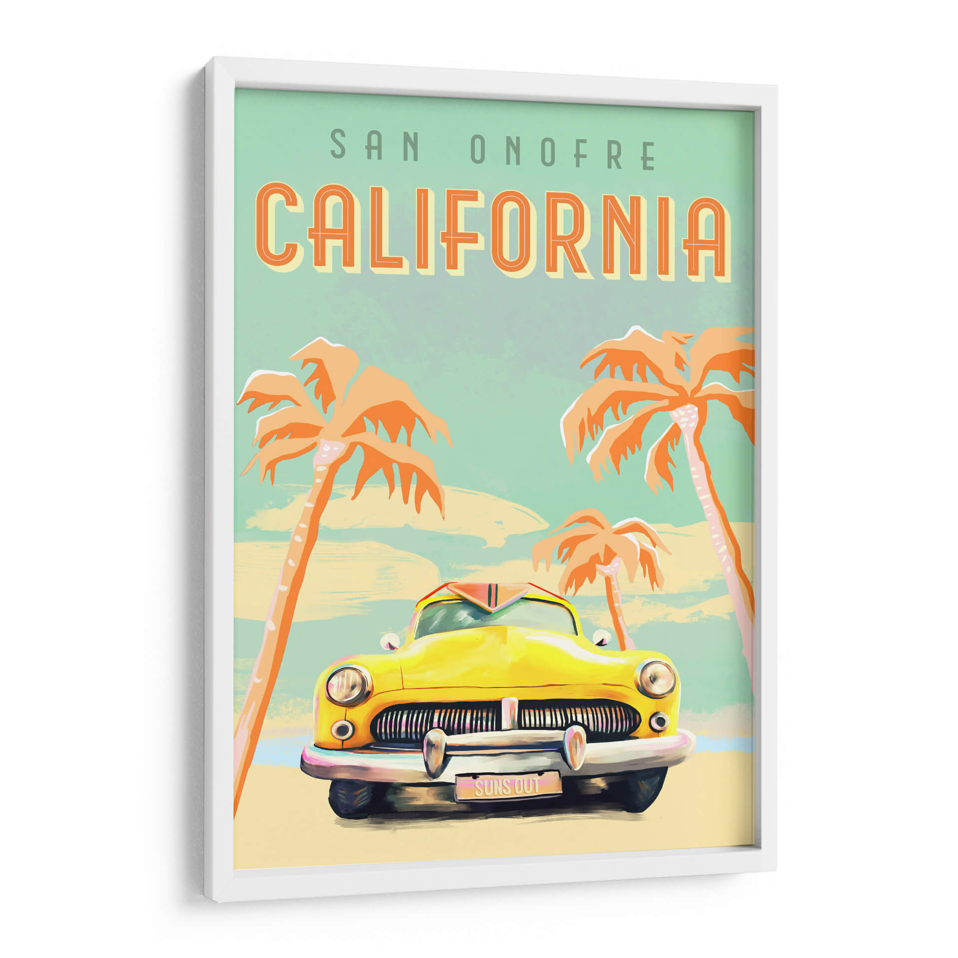 Sumérgete en la nostalgia y el espíritu vibrante de la costa oeste con este cautivador cuadro decorativo 'Póster de Surf de California'. La obra captura la esencia de un día soleado y relajado en San Onofre, con una icónica caravana amarilla como protagonista, evocando viajes por carretera y aventuras playeras. Los vibrantes tonos anaranjados de las palmeras contrastan maravillosamente con el cielo azul verdoso pálido y el suave tono arena de la playa, creando una atmósfera de cálida bienvenida y despreocupación veraniega. El estilo artístico, con sus trazos distintivos y una paleta de colores retro, añade un toque de encanto vintage que es a la vez nostálgico y moderno. Ideal para cualquier espacio que necesite un toque de sol y buen rollo, este cuadro es perfecto para dar vida a salones, estudios o dormitorios, transportando la energía positiva del surf y el estilo de vida californiano directamente a tu hogar. Añade un aire de escapada y alegría a tu decoración con esta pieza única.