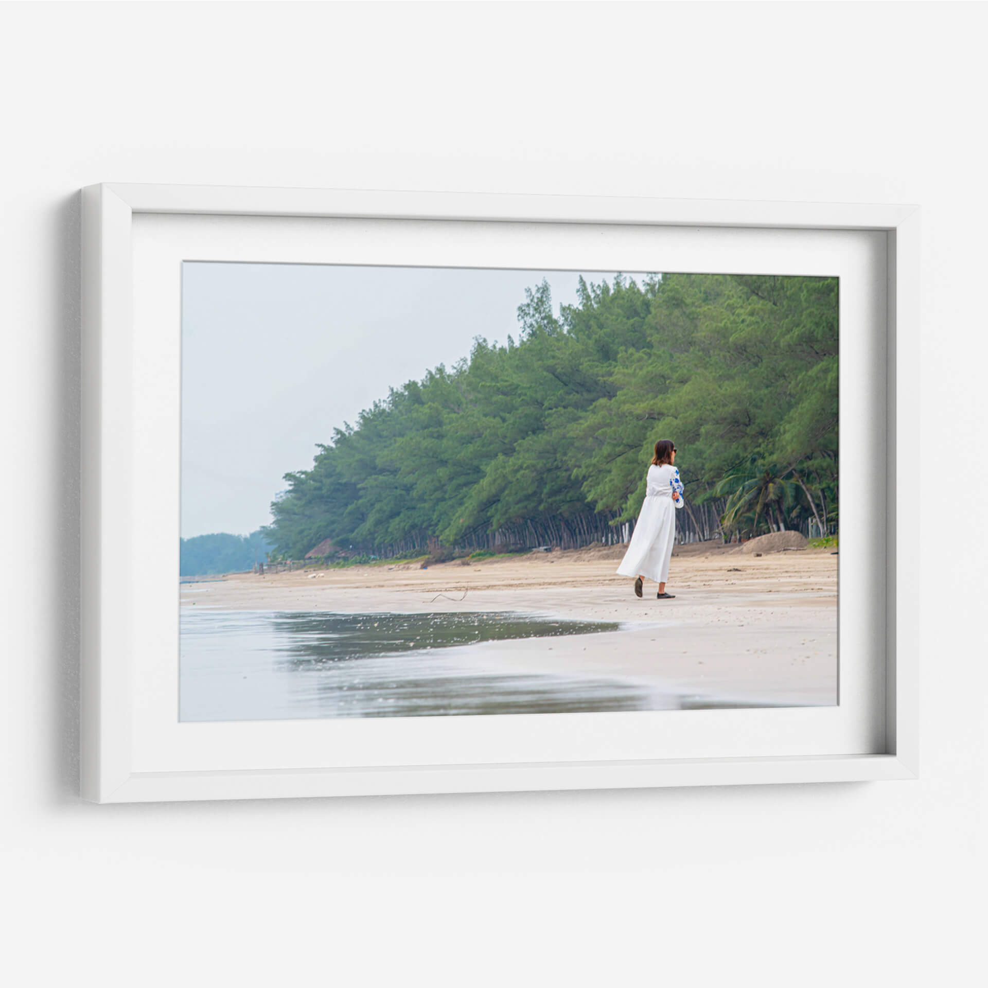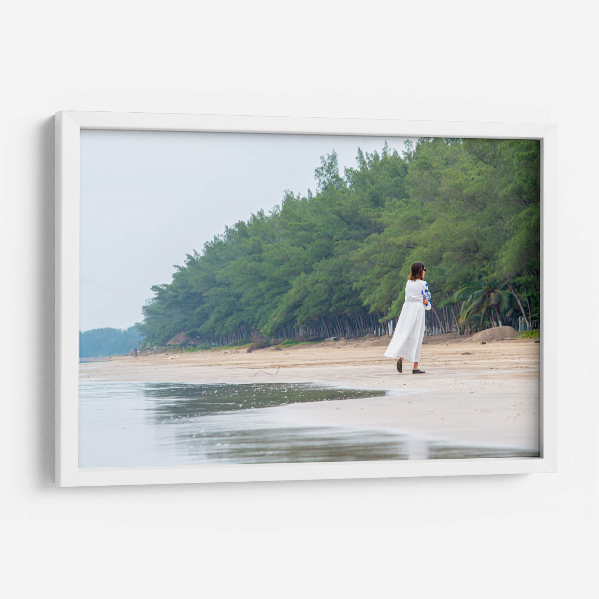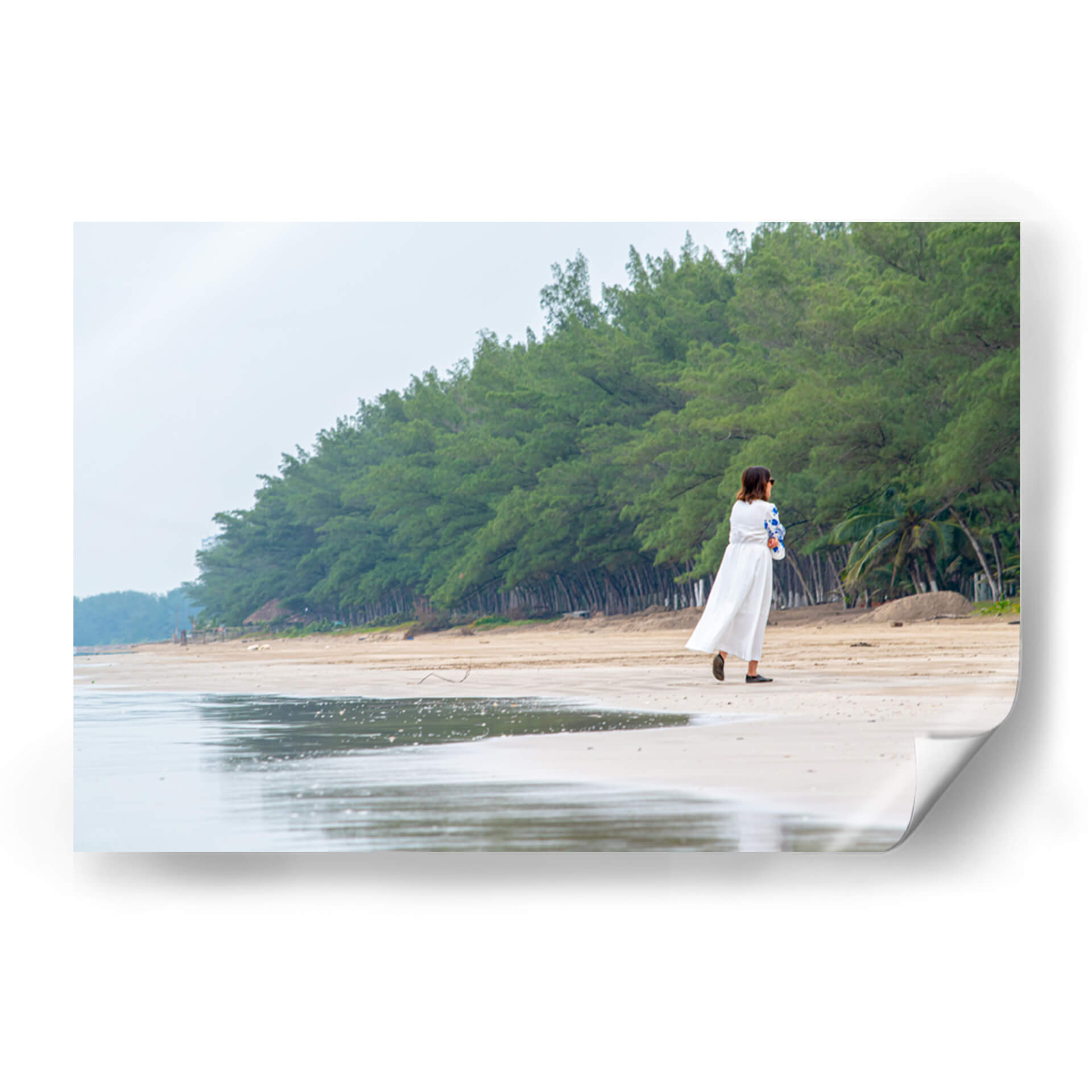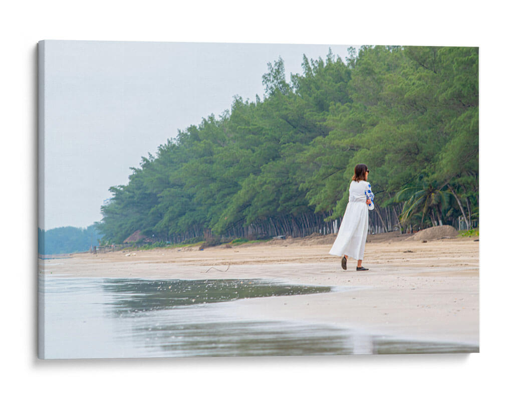 Sumérgete en la serenidad de "Retiro", una obra de arte que captura un momento de introspección en la tranquilidad de la costa. La imagen presenta a una mujer vestida de blanco caminando por una playa de arena clara, flanqueada por una densa línea de árboles verdes que se extiende hasta el horizonte. El cielo nublado y los tonos suaves de la arena y el mar crean una atmósfera de calma y paz. El reflejo del agua en la orilla añade una dimensión etérea a la escena, invitando a la contemplación. Este cuadro decorativo es perfecto para quienes buscan infundir a sus espacios una sensación de tranquilidad y conexión con la naturaleza. Su estilo fotográfico realista y su composición equilibrada lo convierten en un punto focal suave pero impactante para cualquier habitación, desde un dormitorio acogedor hasta un salón que aspire a la calma. "Retiro" no es solo una imagen, es una invitación a encontrar tu propio espacio de paz. Ideal para amantes de la fotografía de paisajes, escenas playeras y arte con un toque personal y reflexivo. Añade esta pieza a tu colección para un recordatorio diario de la belleza de los momentos sencillos y la naturaleza.