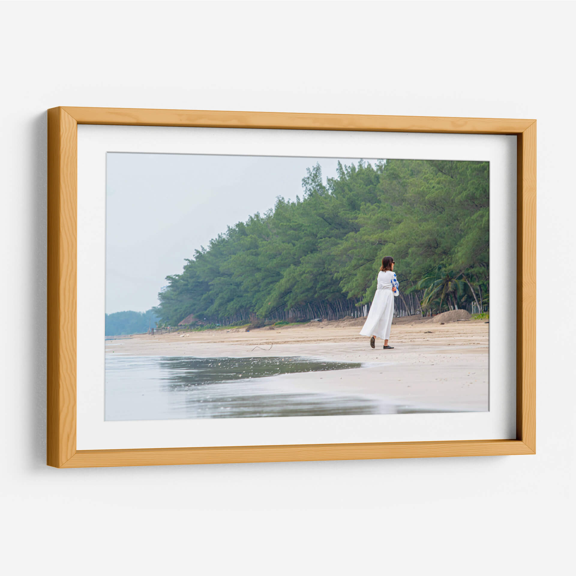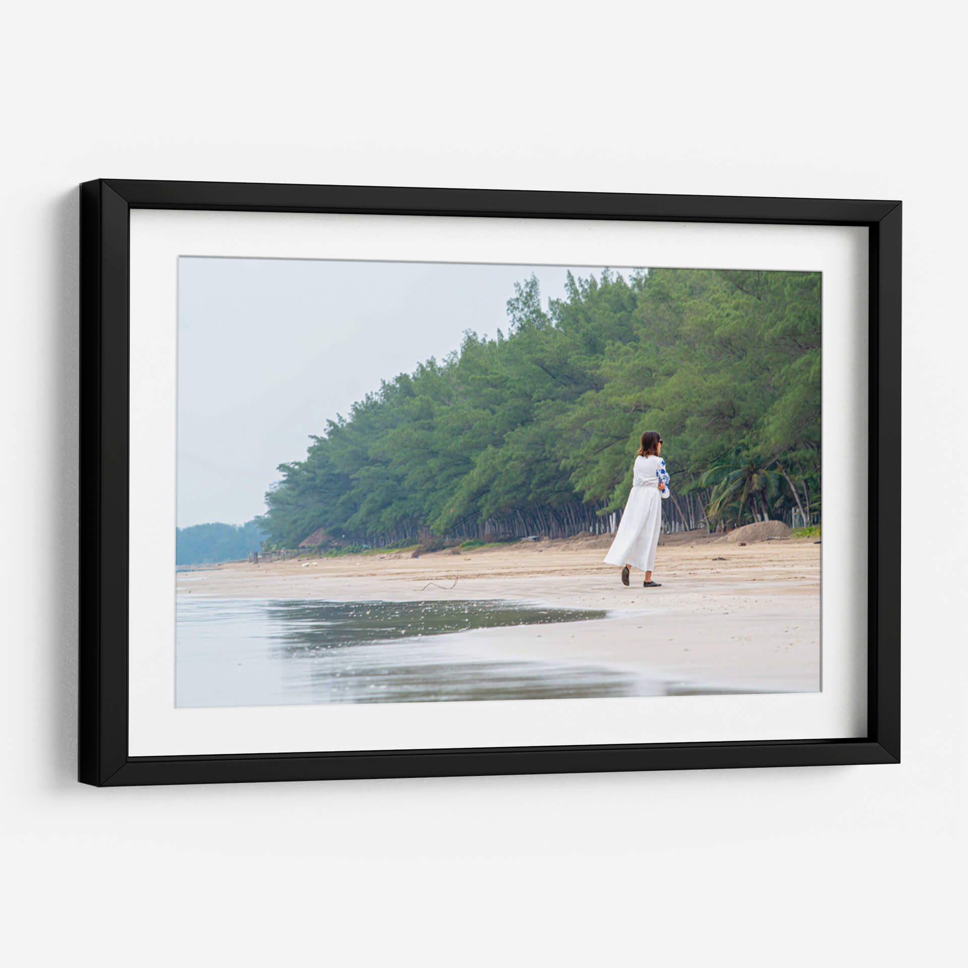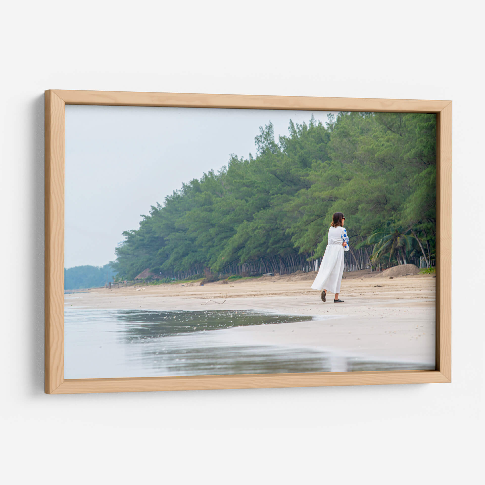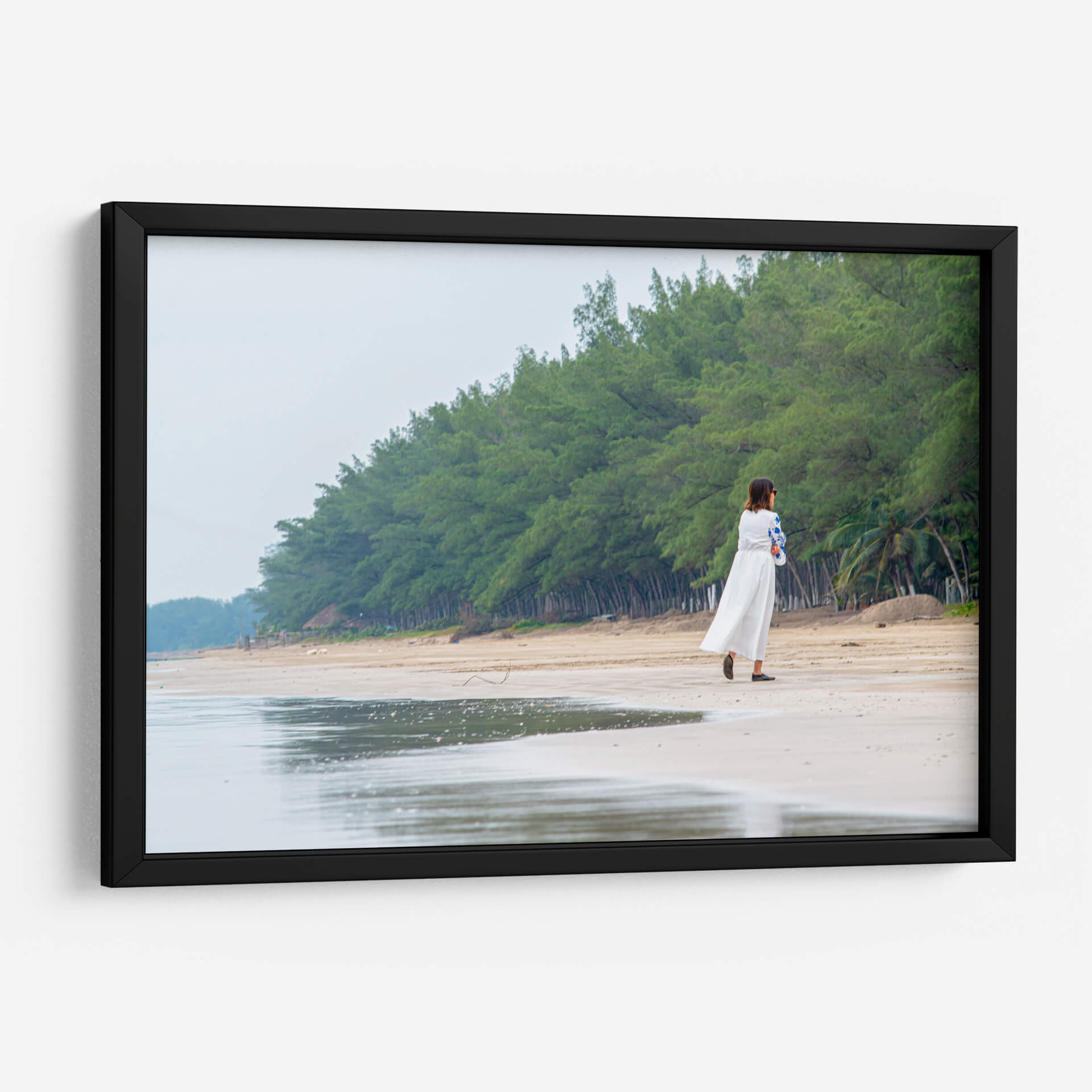 Sumérgete en la serenidad de "Retiro", una obra de arte que captura un momento de introspección en la tranquilidad de la costa. La imagen presenta a una mujer vestida de blanco caminando por una playa de arena clara, flanqueada por una densa línea de árboles verdes que se extiende hasta el horizonte. El cielo nublado y los tonos suaves de la arena y el mar crean una atmósfera de calma y paz. El reflejo del agua en la orilla añade una dimensión etérea a la escena, invitando a la contemplación. Este cuadro decorativo es perfecto para quienes buscan infundir a sus espacios una sensación de tranquilidad y conexión con la naturaleza. Su estilo fotográfico realista y su composición equilibrada lo convierten en un punto focal suave pero impactante para cualquier habitación, desde un dormitorio acogedor hasta un salón que aspire a la calma. "Retiro" no es solo una imagen, es una invitación a encontrar tu propio espacio de paz. Ideal para amantes de la fotografía de paisajes, escenas playeras y arte con un toque personal y reflexivo. Añade esta pieza a tu colección para un recordatorio diario de la belleza de los momentos sencillos y la naturaleza.