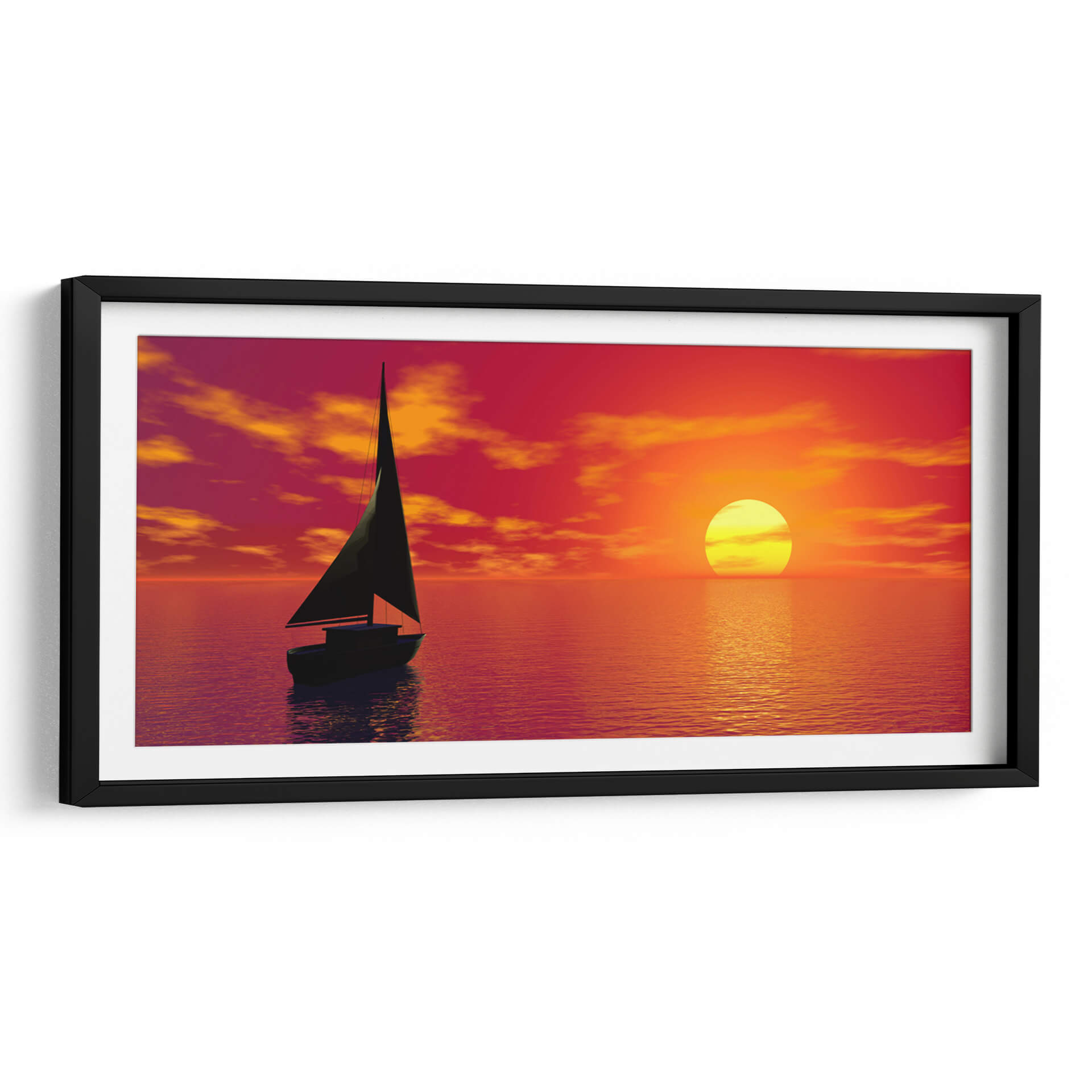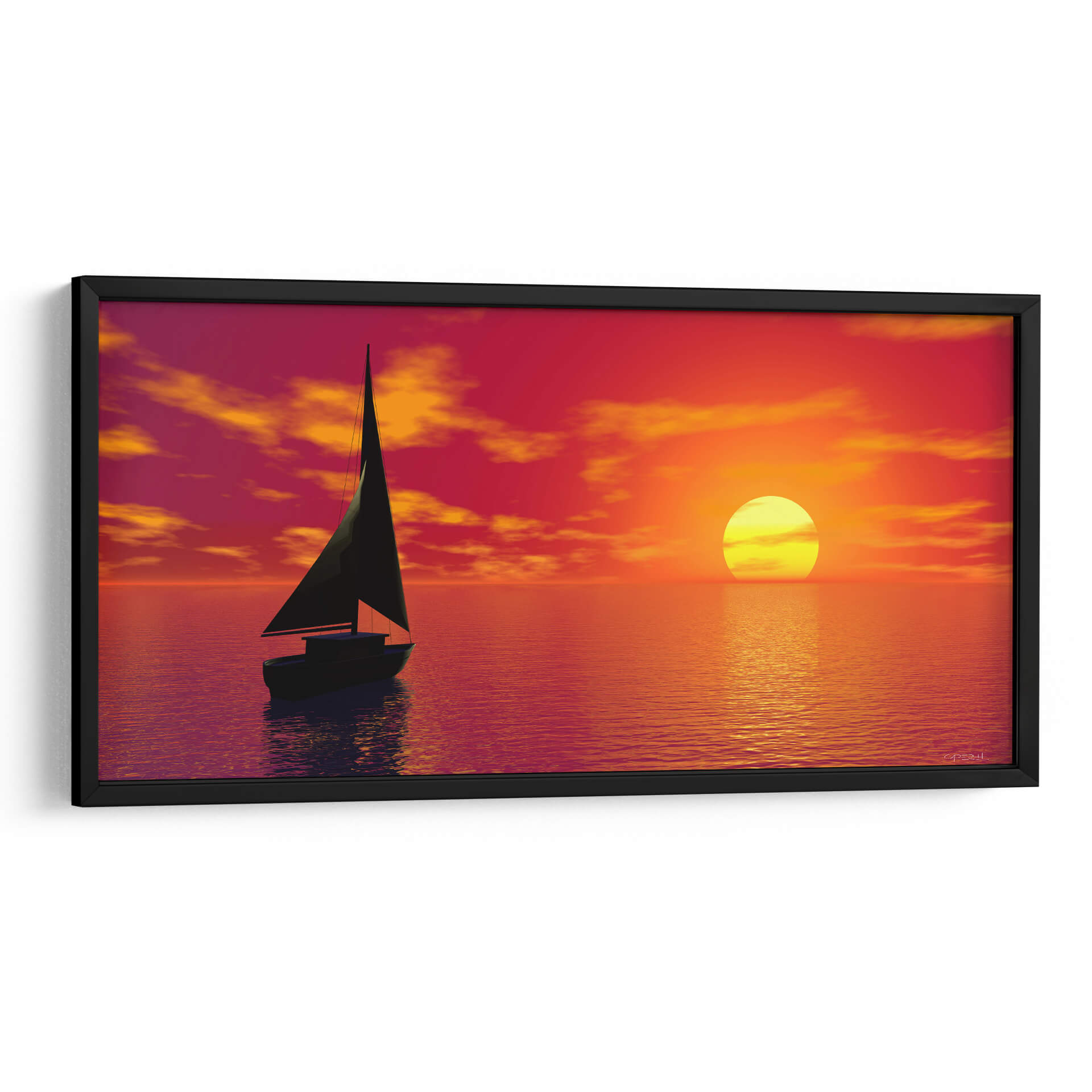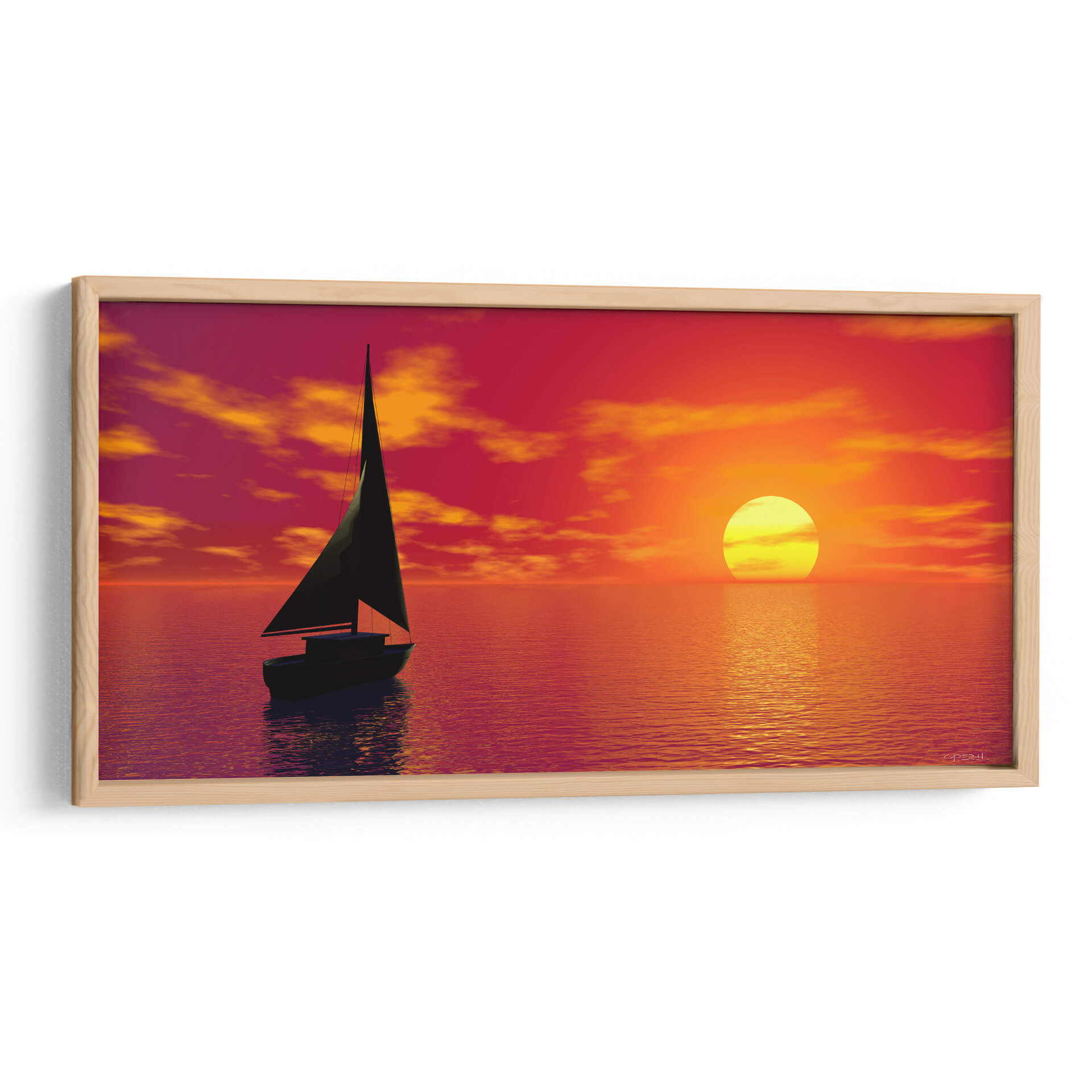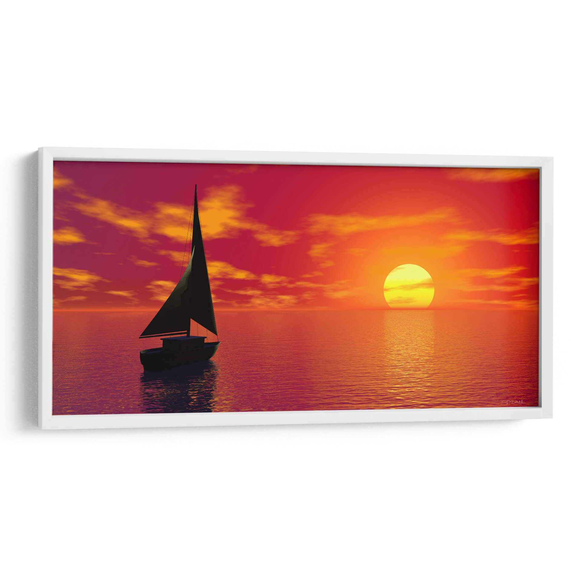 Sumérgete en la serenidad del mar al atardecer con este cautivador cuadro decorativo 'Velero' del artista Caperh. La obra captura la majestuosidad de un velero solitario navegando en aguas tranquilas, bajo un cielo vibrante de tonos rojos, naranjas y amarillos. El sol, un círculo brillante, se refleja en el agua, creando un camino de luz dorada que invita a la contemplación. Las nubes, teñidas por los últimos rayos del día, añaden profundidad y dramatismo a la escena. Este lienzo es perfecto para quienes buscan infundir calma y un toque de aventura en sus espacios. Su paleta de colores cálidos y envolventes lo convierte en una pieza ideal para salones, dormitorios o incluso estudios, aportando una atmósfera de paz y escapismo. El estilo realista, con un toque de idealización, hace que esta obra sea un punto focal que estimula la imaginación y transporta al espectador a un viaje de tranquilidad. Añade esta pieza única a tu colección y deja que la belleza de un atardecer en el mar decore tu hogar.