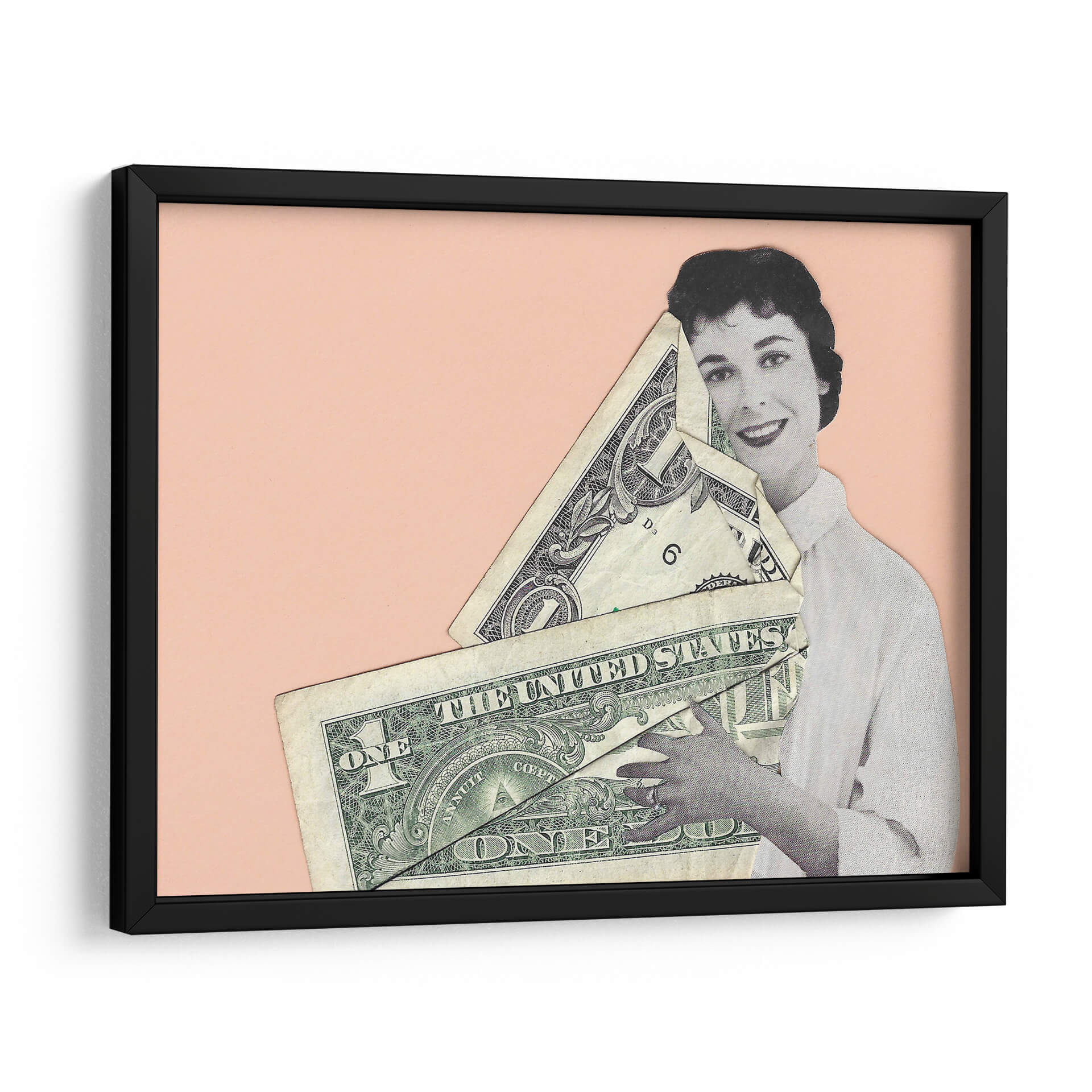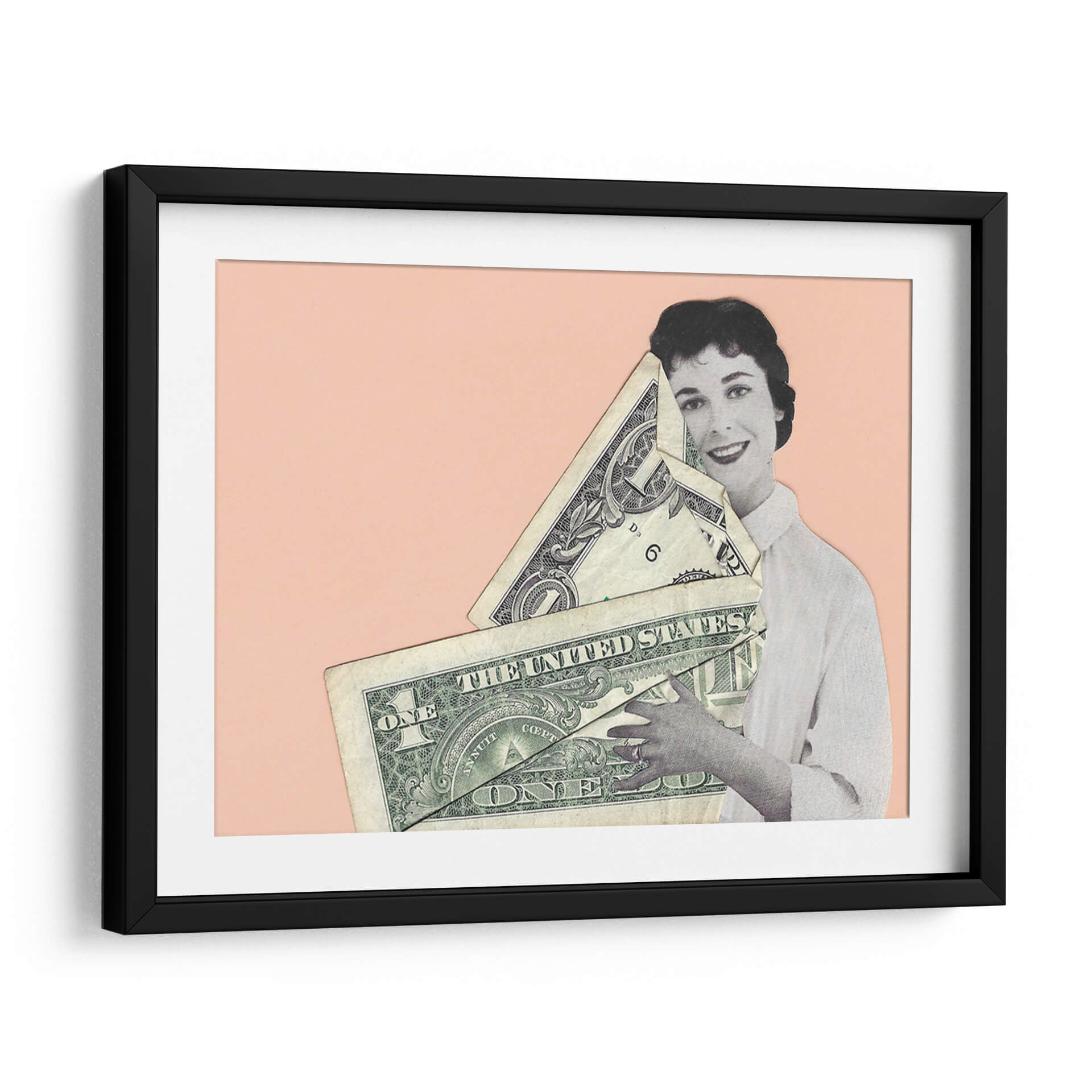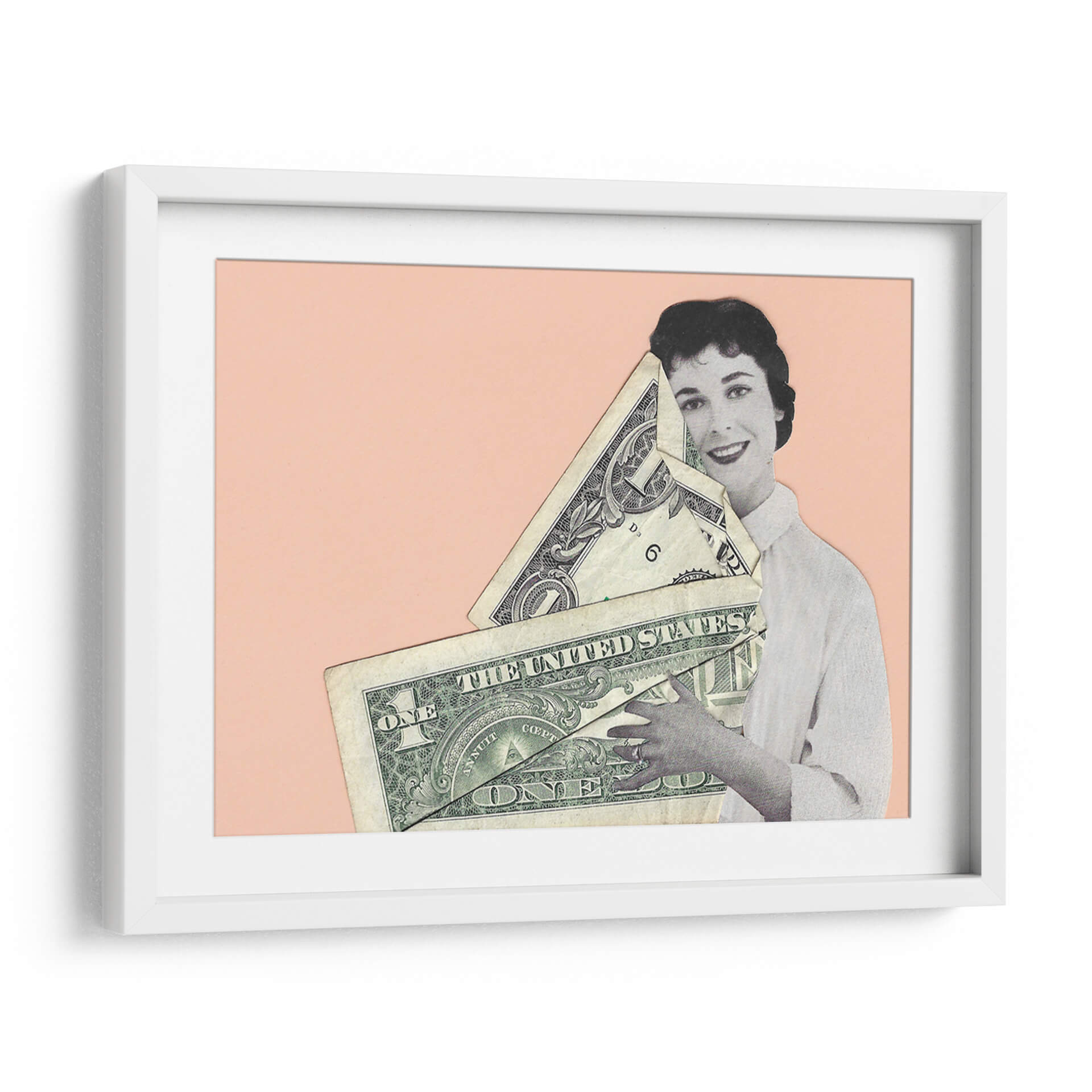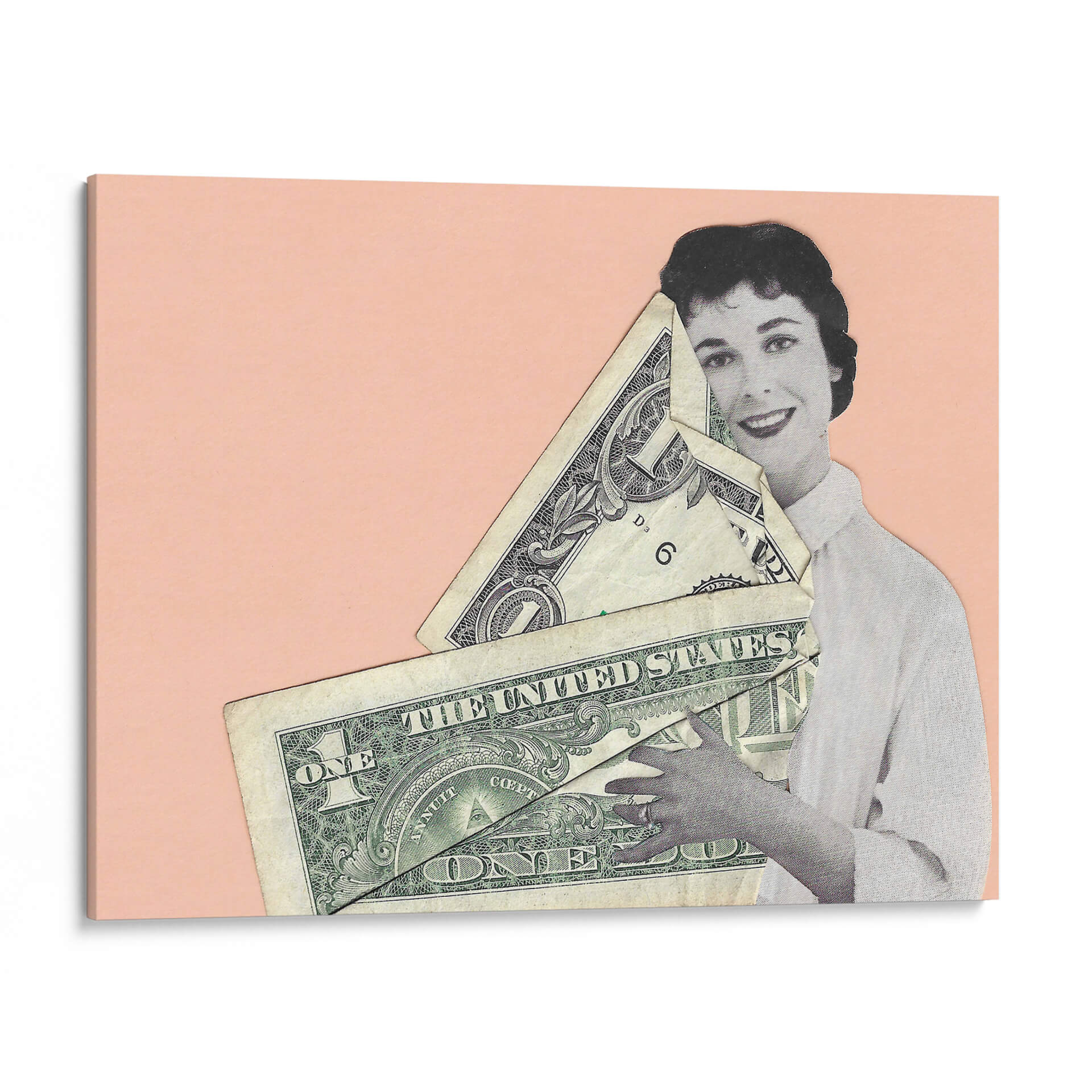Sumérgete en la provocadora obra de Rankin Willard, "Abrazo en Efectivo", una pieza que fusiona arte y comentario social con una estética cautivadora. La composición presenta una figura femenina en blanco y negro, con una expresión serena y una sonrisa enigmática, abrazando un manojo de billetes de dólar estadounidense. El fondo de color melocotón suave crea un contraste visual que realza los detalles del collage y la textura de los billetes. Esta obra de arte digital, a caballo entre lo retro y lo contemporáneo, invita a la reflexión sobre el valor, el materialismo y la relación del ser humano con el dinero. "Abrazo en Efectivo" es ideal para añadir un toque de intriga y conversación a cualquier espacio, desde un salón moderno hasta una oficina vanguardista. Su estilo único la convierte en una pieza decorativa que no pasará desapercibida, estimulando el diálogo y aportando una dimensión intelectual a tu decoración de pared.