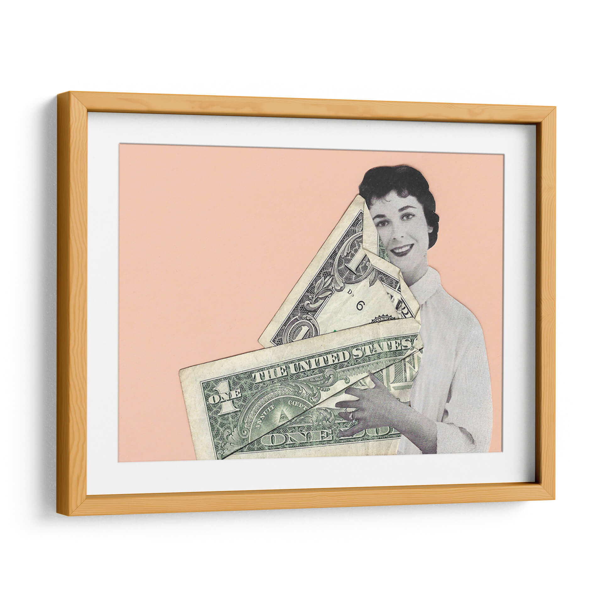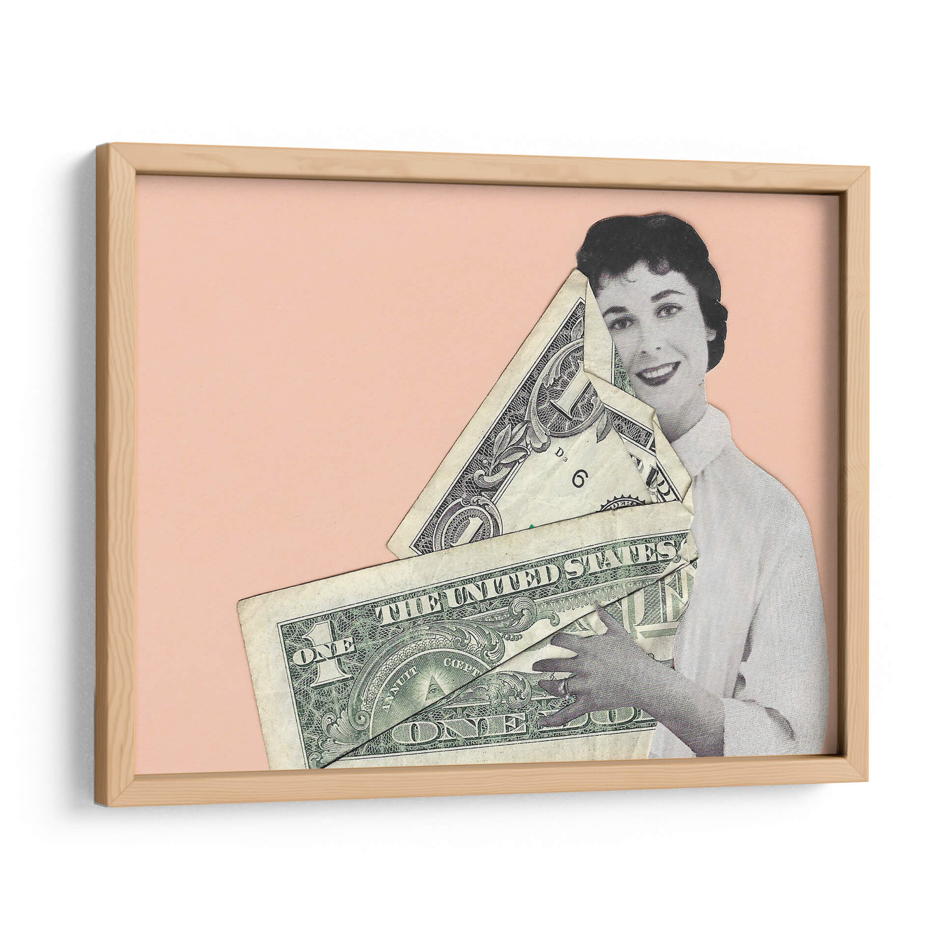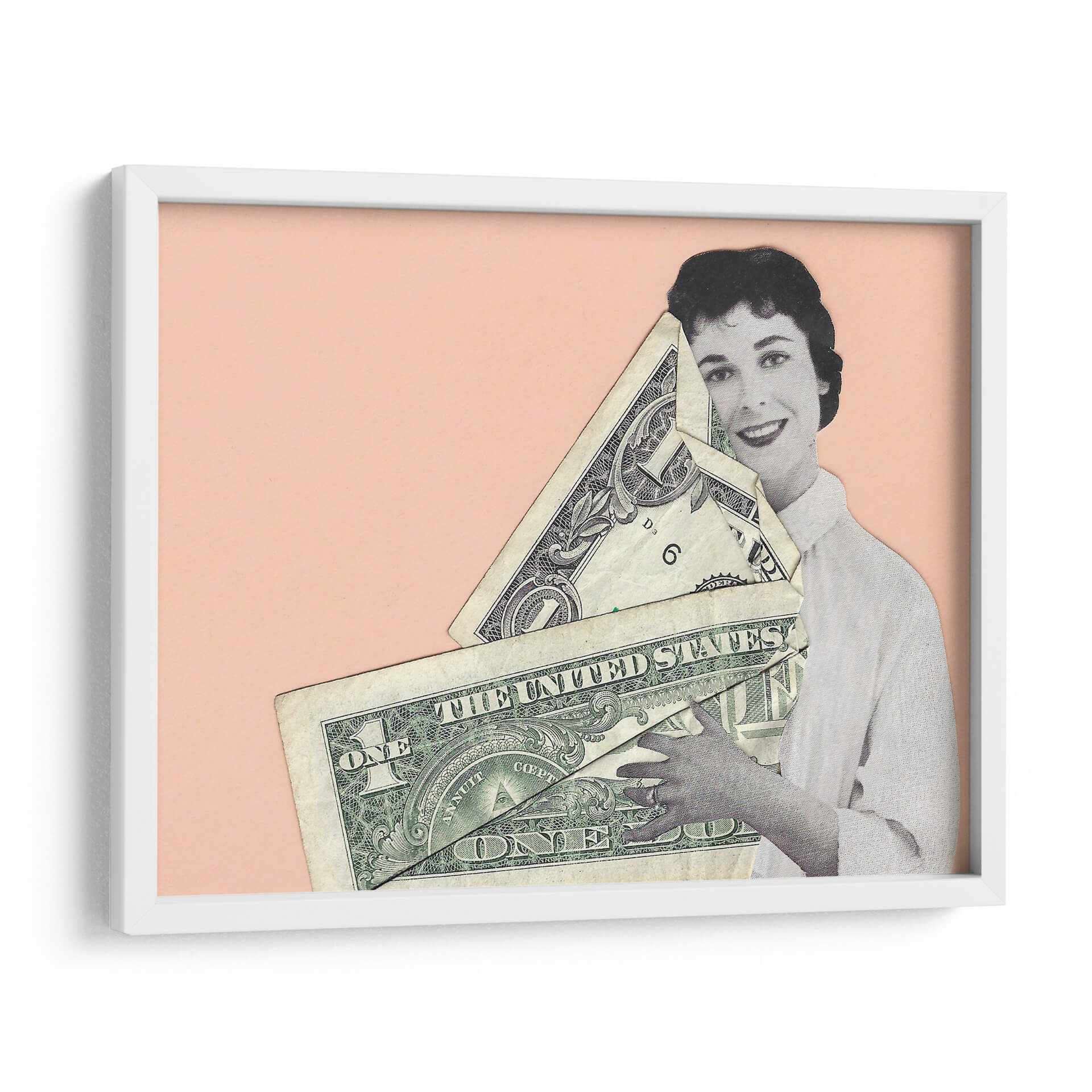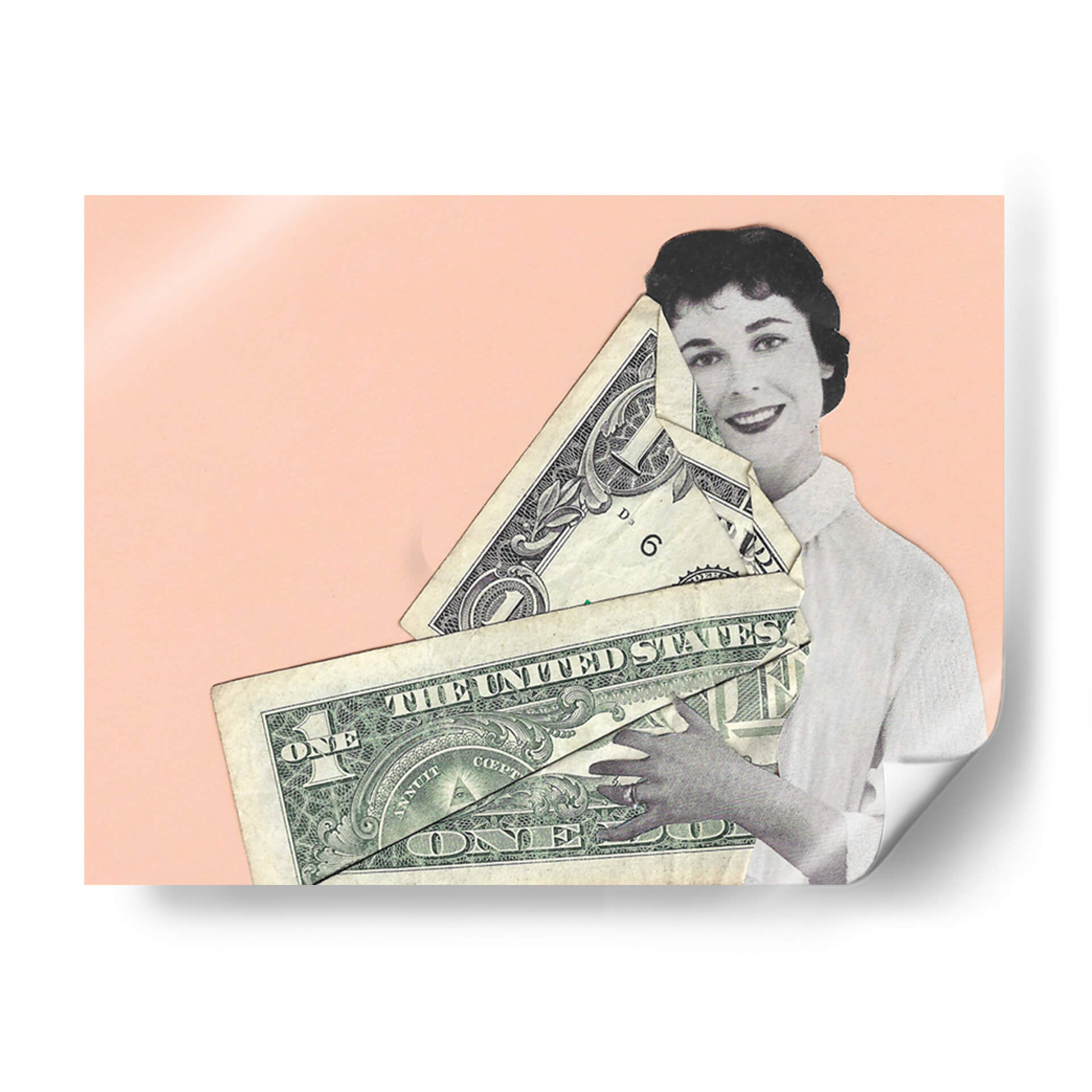 Sumérgete en la provocadora obra de Rankin Willard, "Abrazo en Efectivo", una pieza que fusiona arte y comentario social con una estética cautivadora. La composición presenta una figura femenina en blanco y negro, con una expresión serena y una sonrisa enigmática, abrazando un manojo de billetes de dólar estadounidense. El fondo de color melocotón suave crea un contraste visual que realza los detalles del collage y la textura de los billetes. Esta obra de arte digital, a caballo entre lo retro y lo contemporáneo, invita a la reflexión sobre el valor, el materialismo y la relación del ser humano con el dinero. "Abrazo en Efectivo" es ideal para añadir un toque de intriga y conversación a cualquier espacio, desde un salón moderno hasta una oficina vanguardista. Su estilo único la convierte en una pieza decorativa que no pasará desapercibida, estimulando el diálogo y aportando una dimensión intelectual a tu decoración de pared.