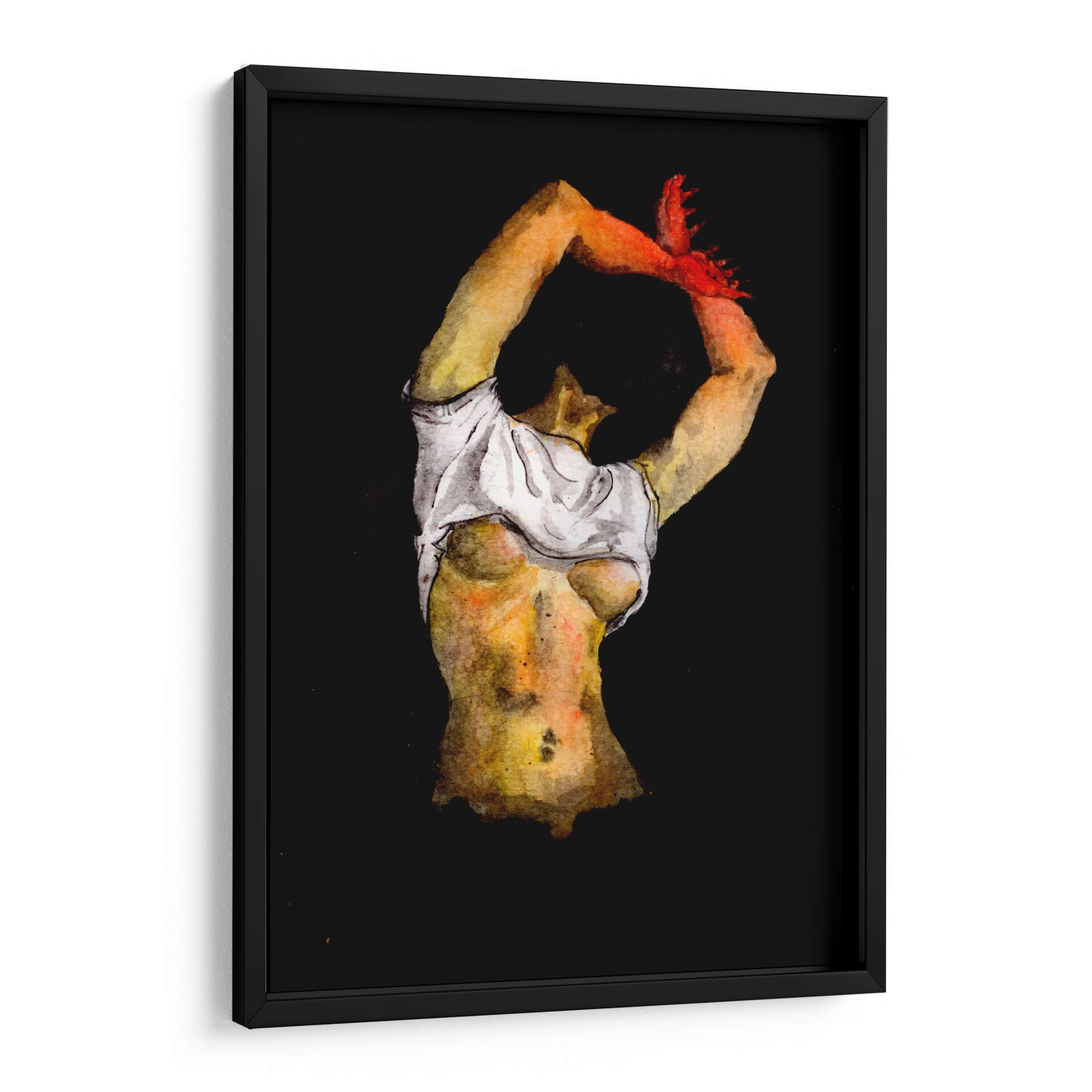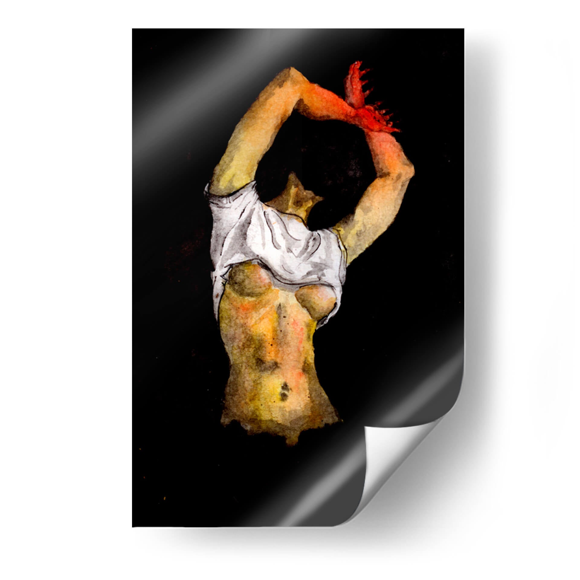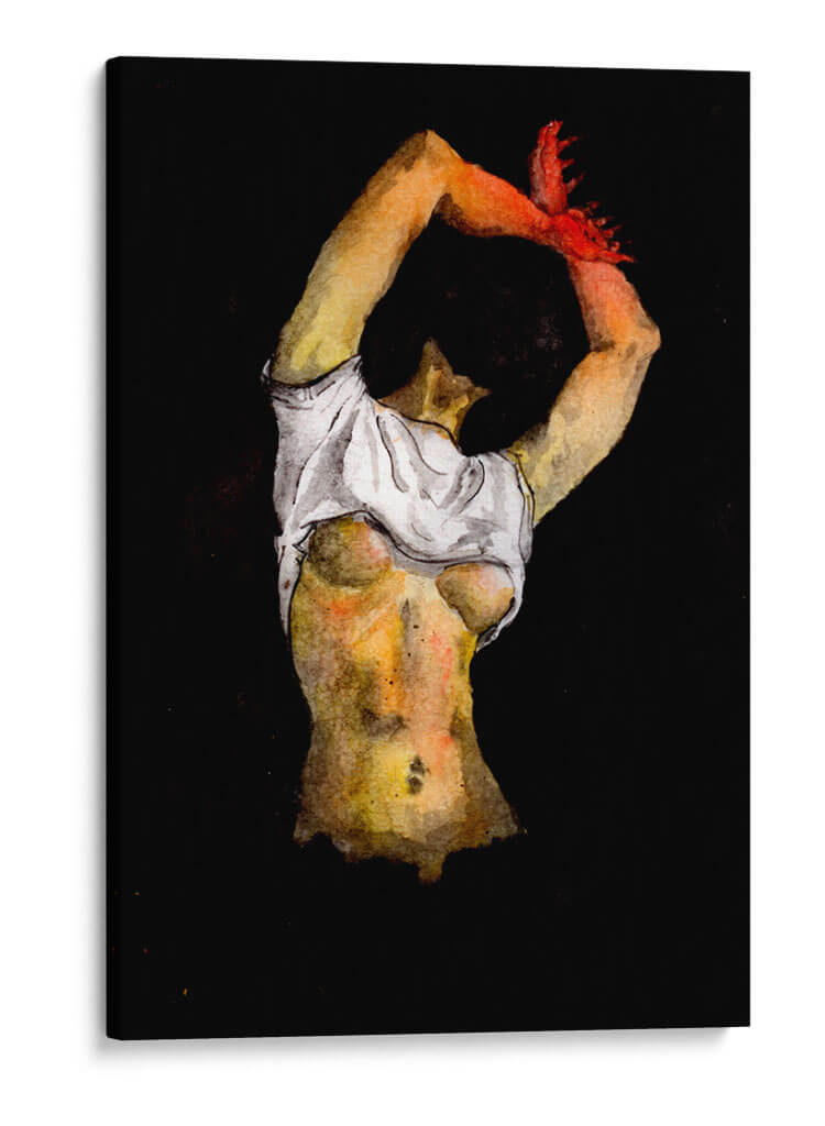 Sumérgete en la intensidad y la expresión artística de "Denuedo", una obra maestra contemporánea que captura un momento íntimo y poderoso. La pieza presenta una figura femenina, representada con trazos sugerentes y una paleta de colores que oscila entre cálidos tonos tierra y contrastes dramáticos sobre un fondo oscuro y profundo. La acuarela, con su fluidez característica, otorga una textura única y una atmósfera etérea a la composición. La artista ORLCE ha logrado plasmar no solo la forma humana, sino también una narrativa de introspección y fuerza. Los sutiles detalles en la piel, iluminados por una luz que parece emanar del interior, invitan a la contemplación. Las manos, elevadas y teñidas de un vibrante rojo, añaden un punto focal de pasión y energía. Este cuadro decorativo es ideal para espacios que buscan un toque de audacia y profundidad emocional, como un salón moderno, un estudio privado o incluso un dormitorio que aspire a ser un refugio personal y sofisticado. "Denuedo" no es solo una imagen, es una invitación a explorar la conexión entre el cuerpo, la emoción y el arte, transformando cualquier pared en un lienzo de expresión.
