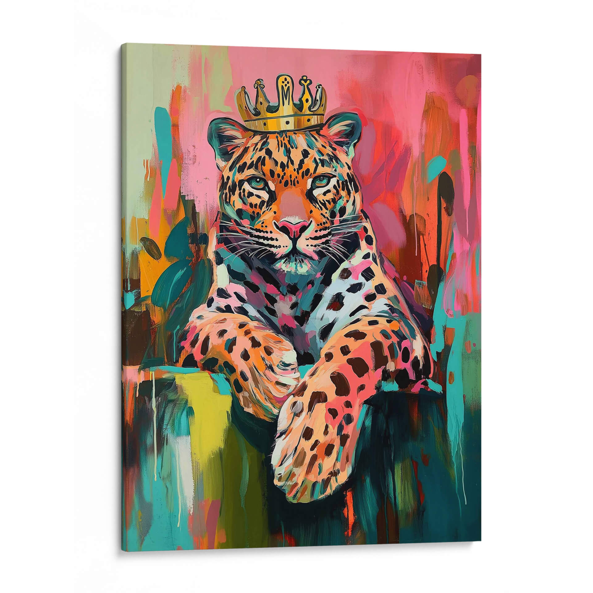 Sumérgete en la majestuosidad de "La Reina Jaguar", una obra de arte contemporáneo que irradia poder y estilo. Este cuadro decorativo presenta un jaguar imponente, coronado y recostado con una mirada penetrante que captura la atención. La explosión de colores vibrantes, desde el rosa intenso y el naranja cálido hasta toques de verde azulado y toques de verde lima, crea una atmósfera dinámica y moderna. El estilo abstracto, con pinceladas audaces y expresivas, añade profundidad y textura a la pieza, haciendo que cada detalle sea una invitación a la contemplación. "La Reina Jaguar" es perfecta para transformar cualquier espacio, desde una sala de estar sofisticada hasta una oficina moderna, infundiendo carácter y una energía salvaje pero elegante. Su composición centrada y la rica paleta de colores la convierten en un punto focal ideal para quienes buscan un arte que hable de fuerza, belleza y un toque de realeza en su decoración. Añade esta pieza única a tu colección y deja que la mirada del jaguar reine en tu hogar.