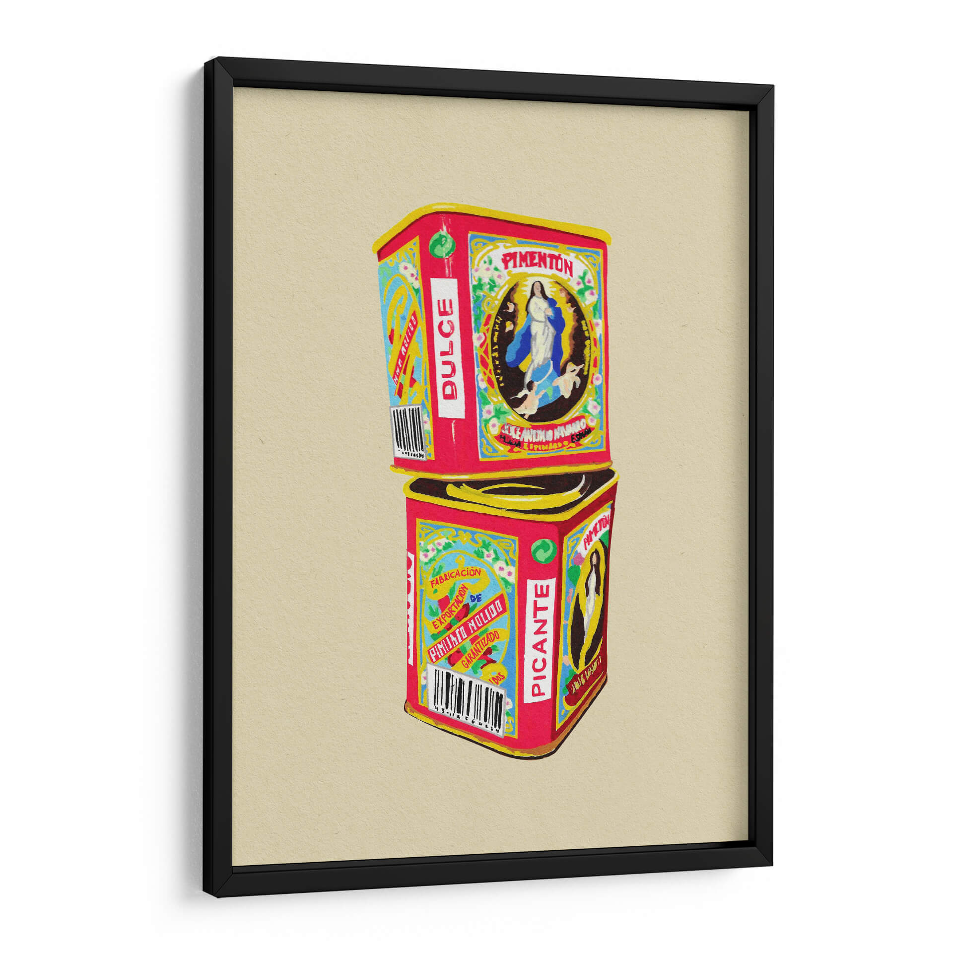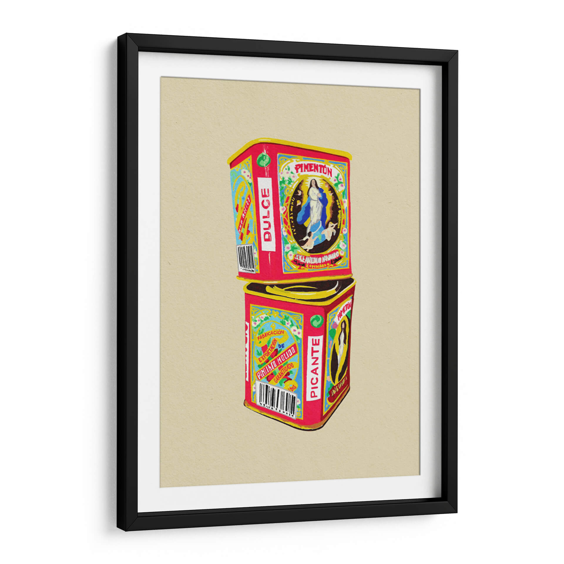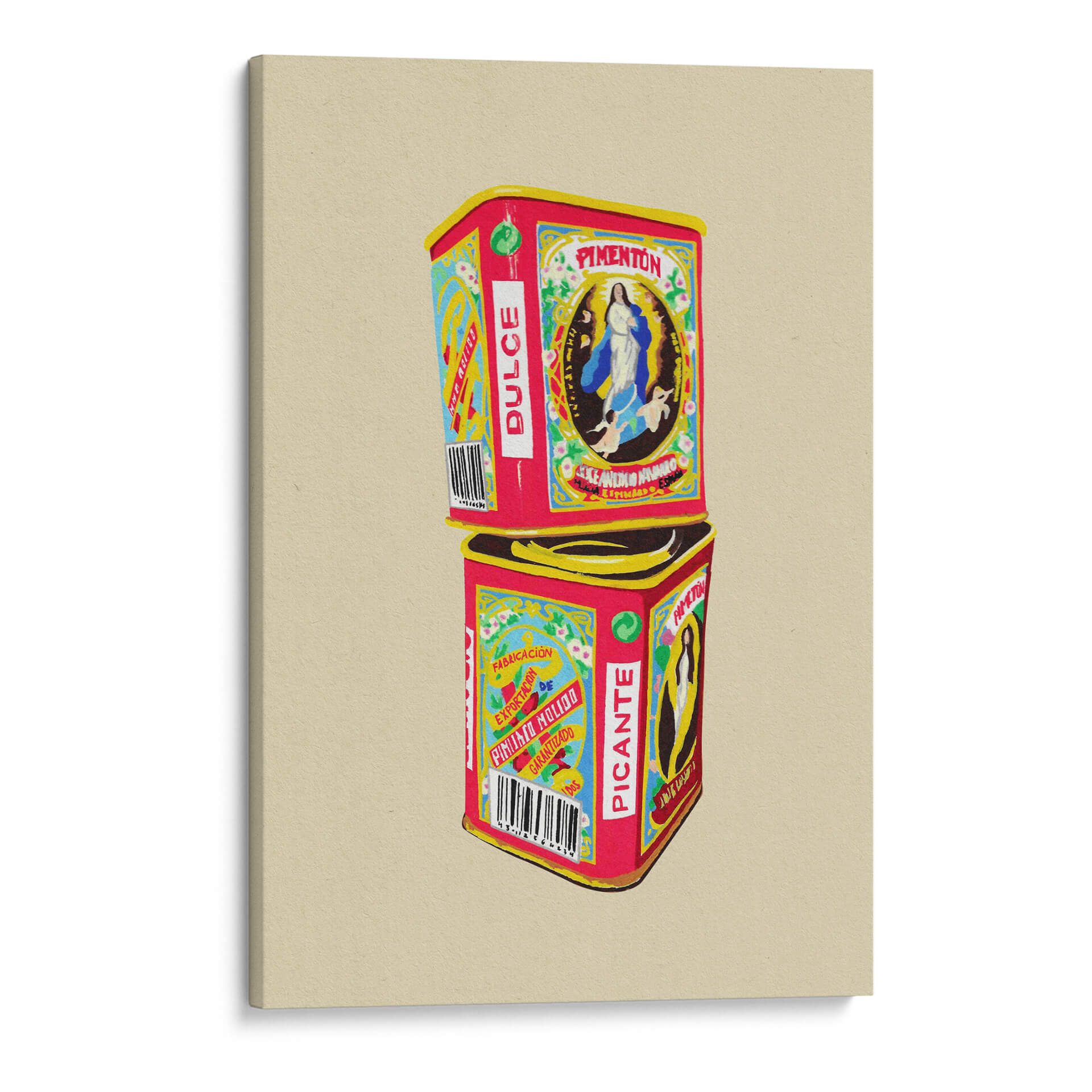 Sumérgete en el vibrante mundo de "Pimentón" de Studio Mandariini, una obra de arte decorativo que captura la esencia de los envases vintage con un toque contemporáneo. Este cuadro decorativo presenta dos latas apiladas, una etiquetada como "Pimentón Dulce" y la otra como "Picante", evocando nostalgia y un sentido de tradición. La paleta de colores es audaz y llamativa, dominada por rojos intensos, amarillos brillantes y azules vibrantes, contrastando con detalles delicados en blanco y negro, y un sutil verde. La composición es simétrica y equilibrada, con la imagen de la Virgen María en la lata superior y patrones gráficos distintivos en ambas. El estilo recuerda a las ilustraciones de etiquetas antiguas, pero con una ejecución moderna que le otorga frescura. "Pimentón" es una pieza que irradia calidez, autenticidad y un aire retro chic, ideal para añadir personalidad a cocinas, comedores o cualquier espacio que busque un acento de color y carácter. Su diseño detallado y su temática culinaria la convierten en una excelente opción para amantes de la gastronomía y del arte con historia. Este cuadro decorativo contemporáneo es perfecto para quienes buscan evocar sensaciones de hogar, sabor y herencia cultural en su decoración.