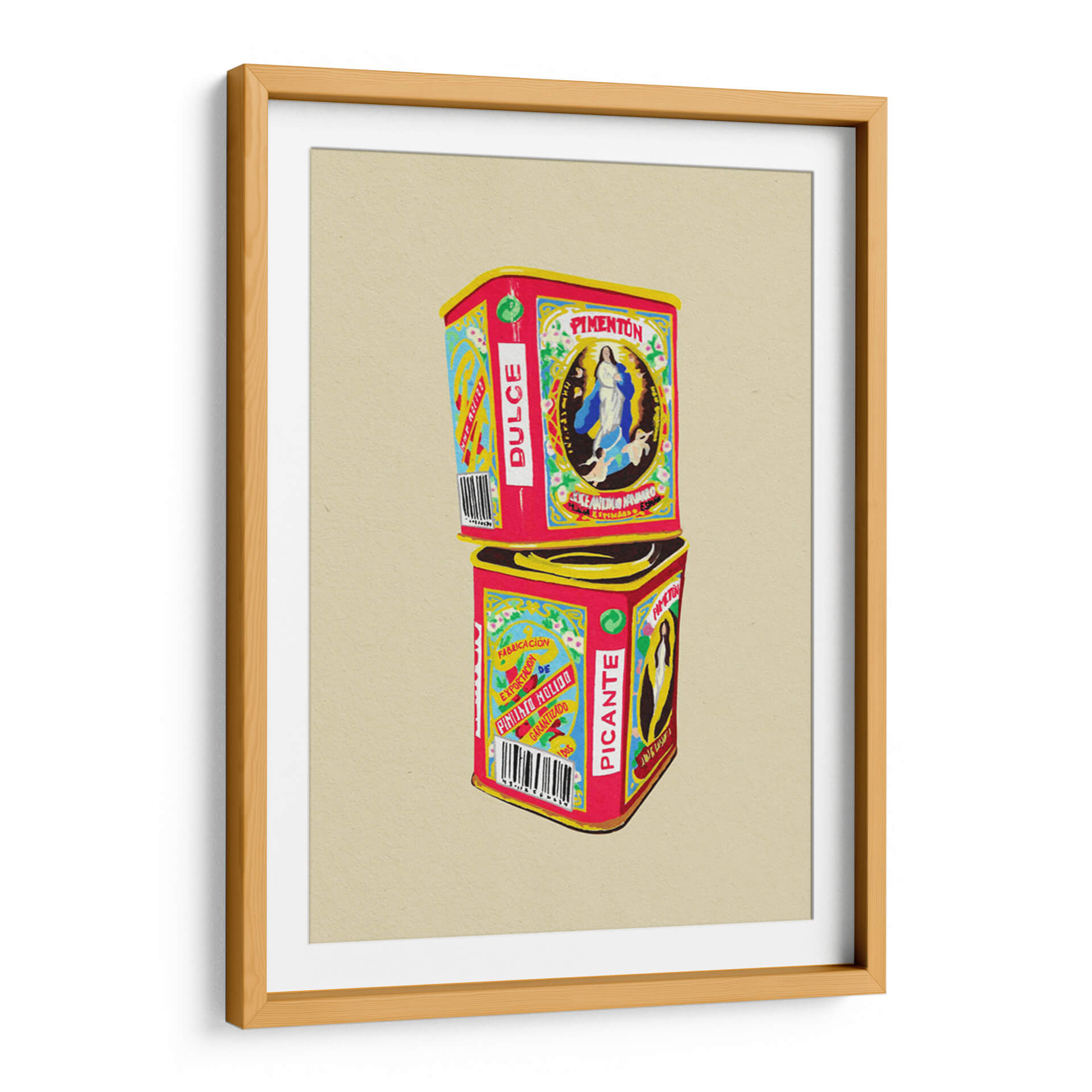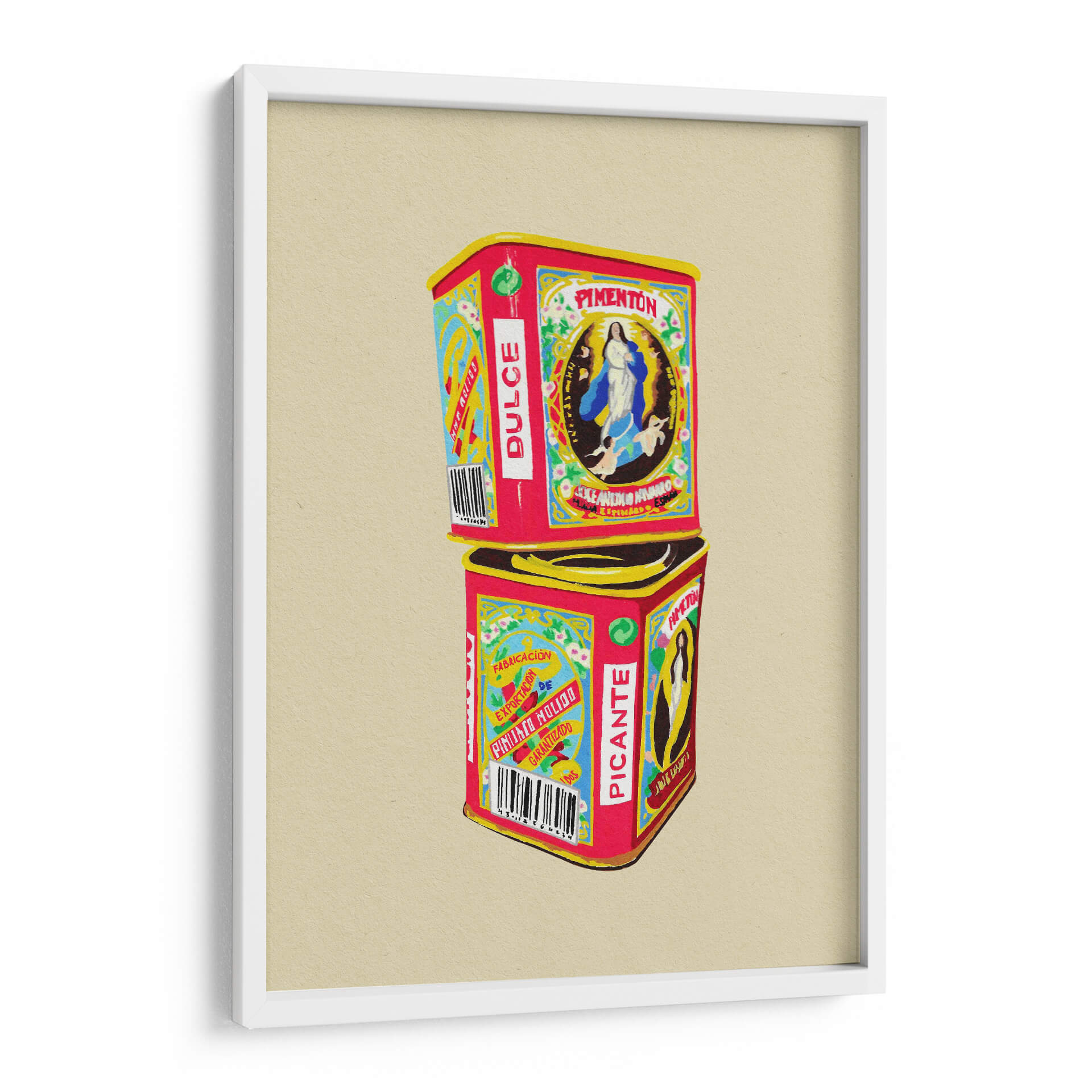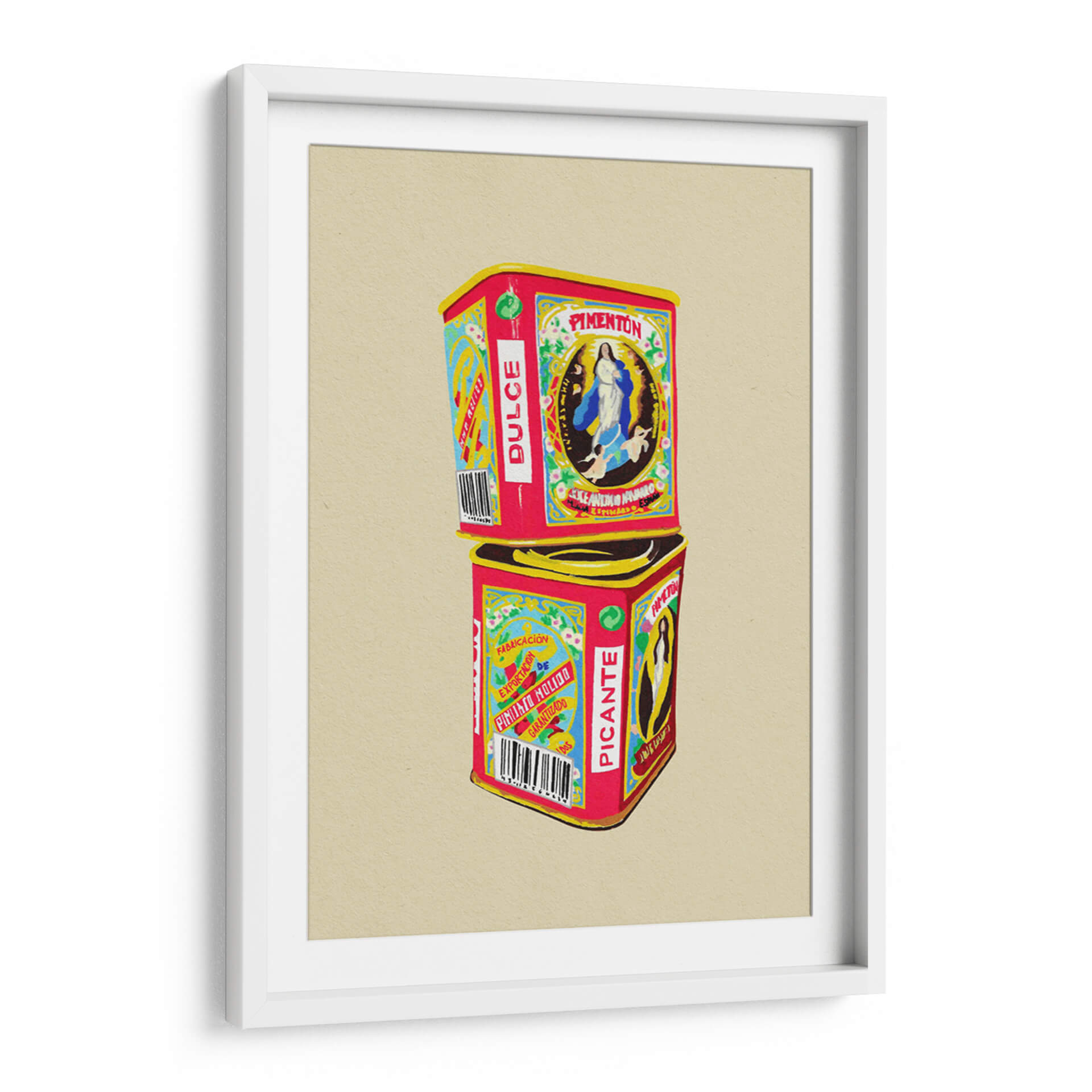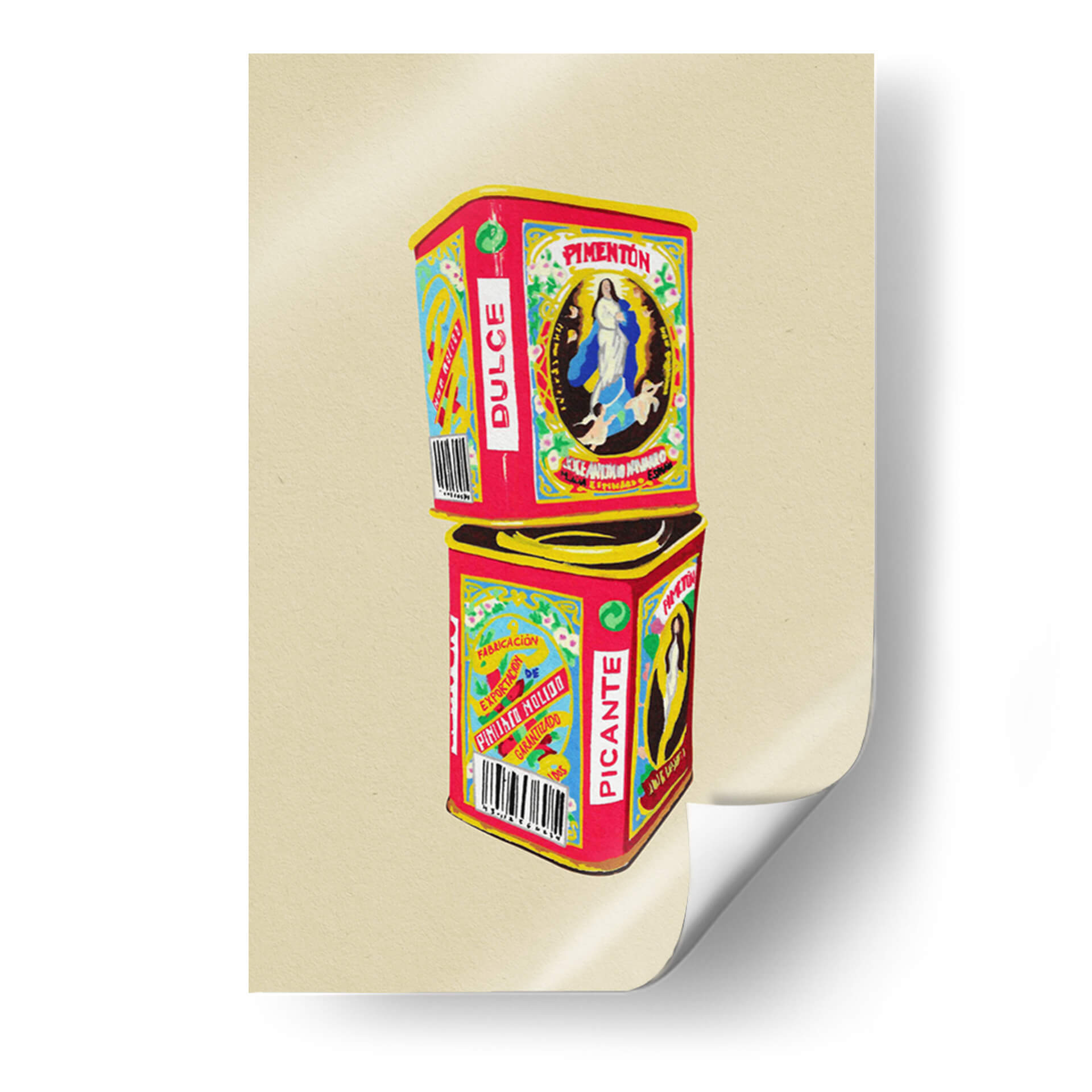 Sumérgete en el vibrante mundo de "Pimentón" de Studio Mandariini, una obra de arte decorativo que captura la esencia de los envases vintage con un toque contemporáneo. Este cuadro decorativo presenta dos latas apiladas, una etiquetada como "Pimentón Dulce" y la otra como "Picante", evocando nostalgia y un sentido de tradición. La paleta de colores es audaz y llamativa, dominada por rojos intensos, amarillos brillantes y azules vibrantes, contrastando con detalles delicados en blanco y negro, y un sutil verde. La composición es simétrica y equilibrada, con la imagen de la Virgen María en la lata superior y patrones gráficos distintivos en ambas. El estilo recuerda a las ilustraciones de etiquetas antiguas, pero con una ejecución moderna que le otorga frescura. "Pimentón" es una pieza que irradia calidez, autenticidad y un aire retro chic, ideal para añadir personalidad a cocinas, comedores o cualquier espacio que busque un acento de color y carácter. Su diseño detallado y su temática culinaria la convierten en una excelente opción para amantes de la gastronomía y del arte con historia. Este cuadro decorativo contemporáneo es perfecto para quienes buscan evocar sensaciones de hogar, sabor y herencia cultural en su decoración.