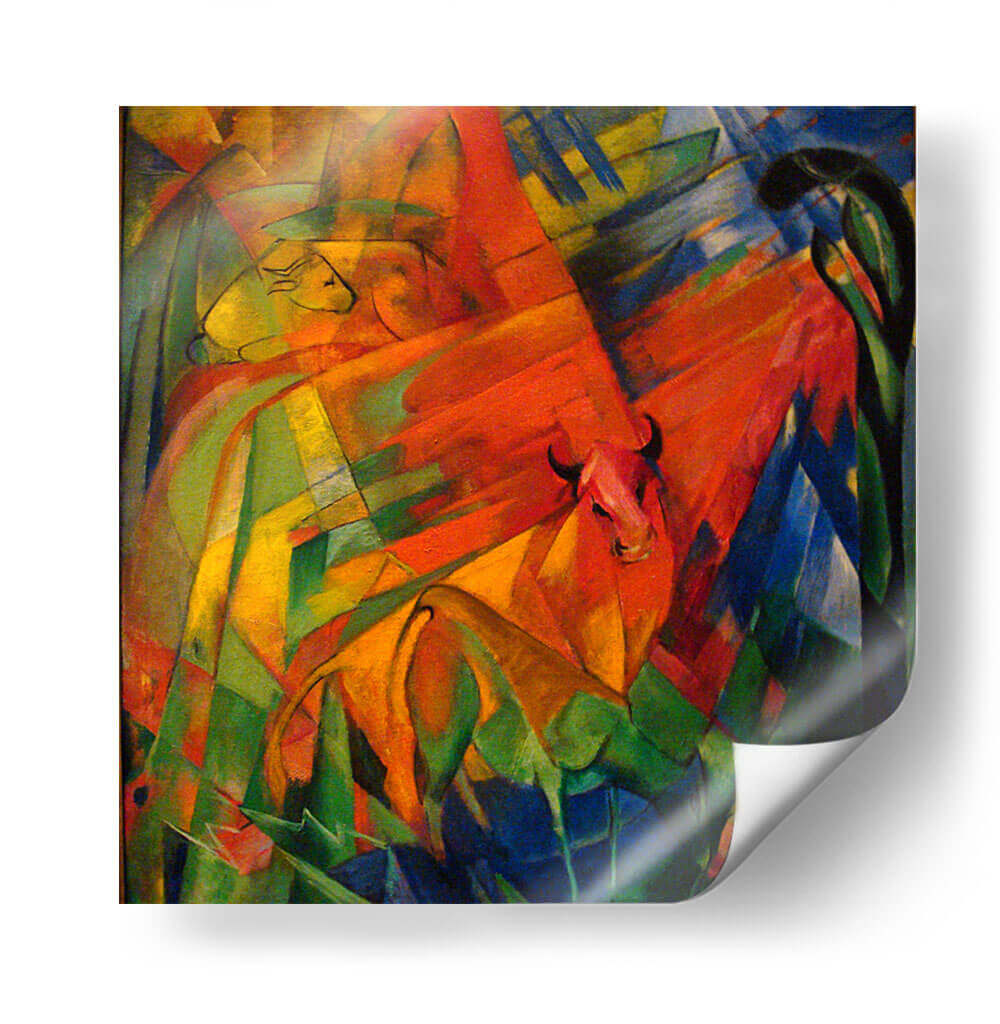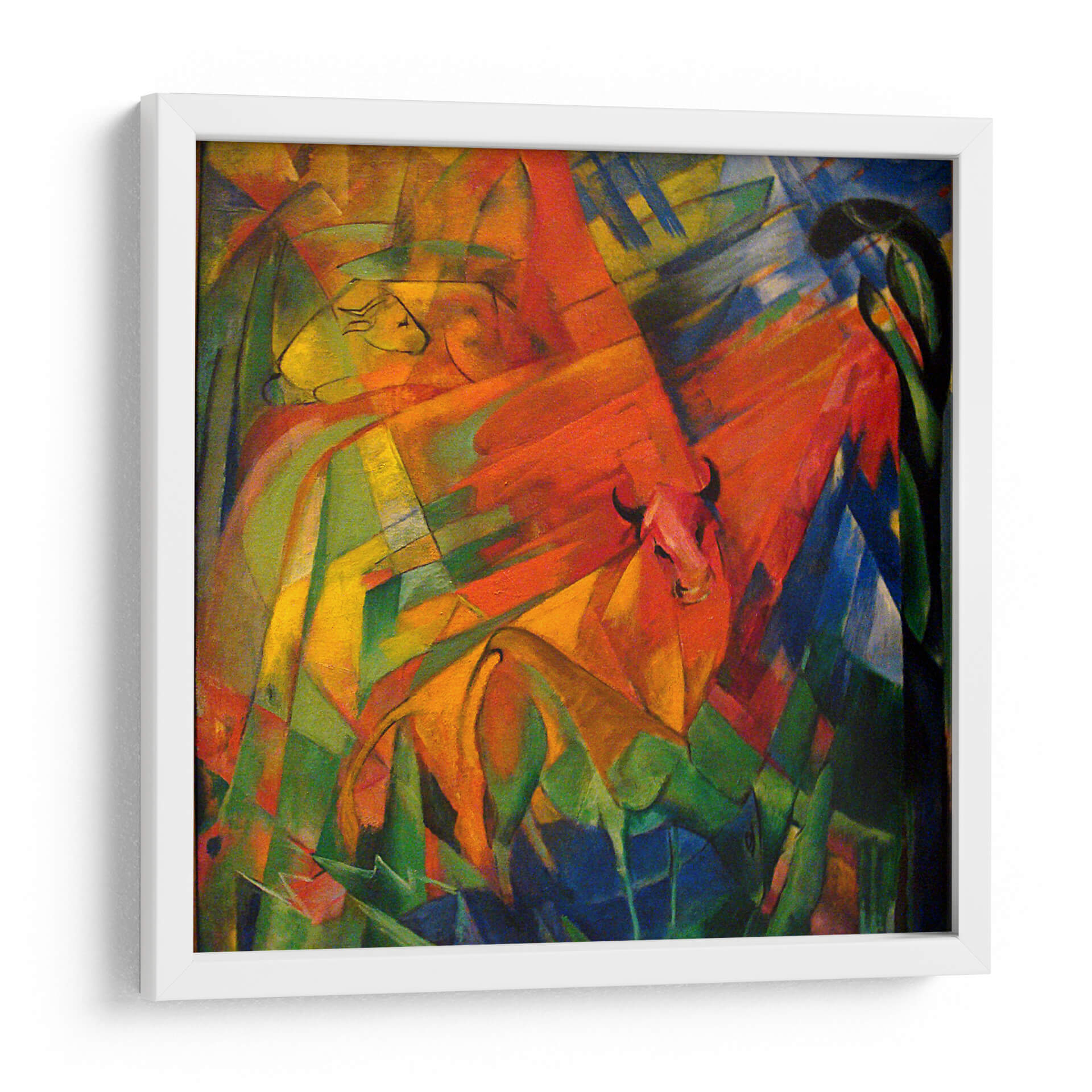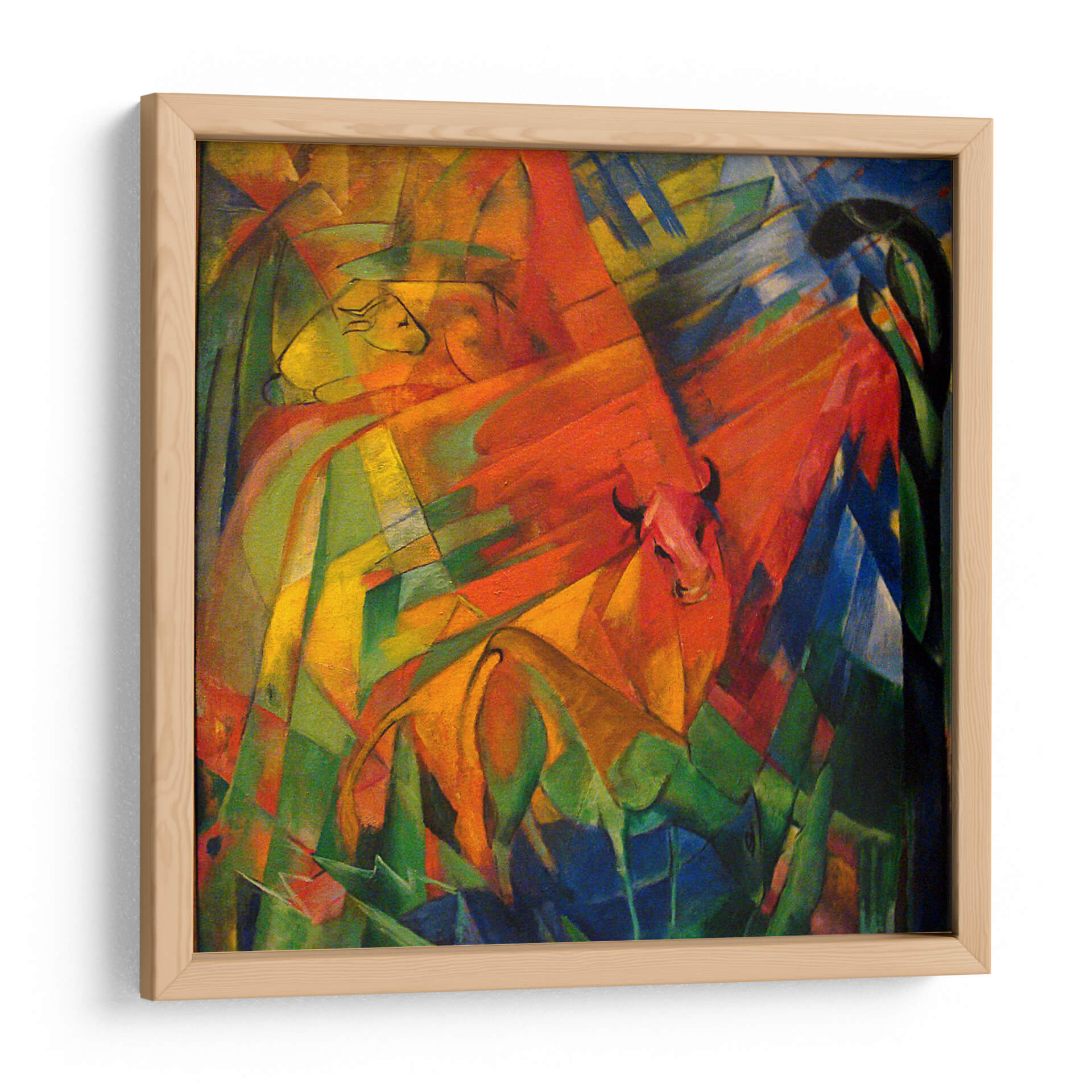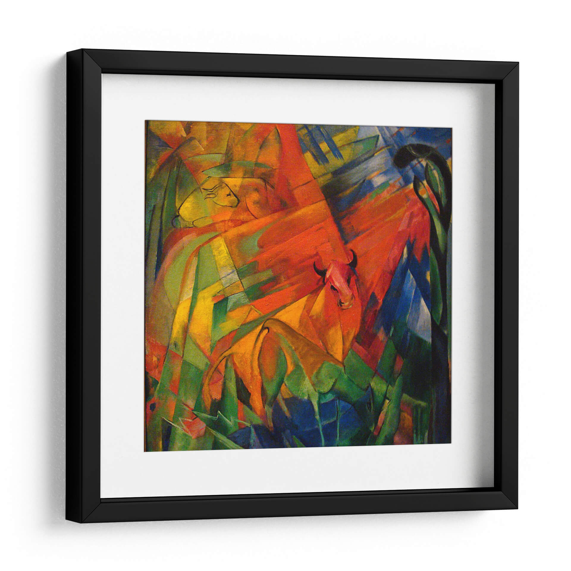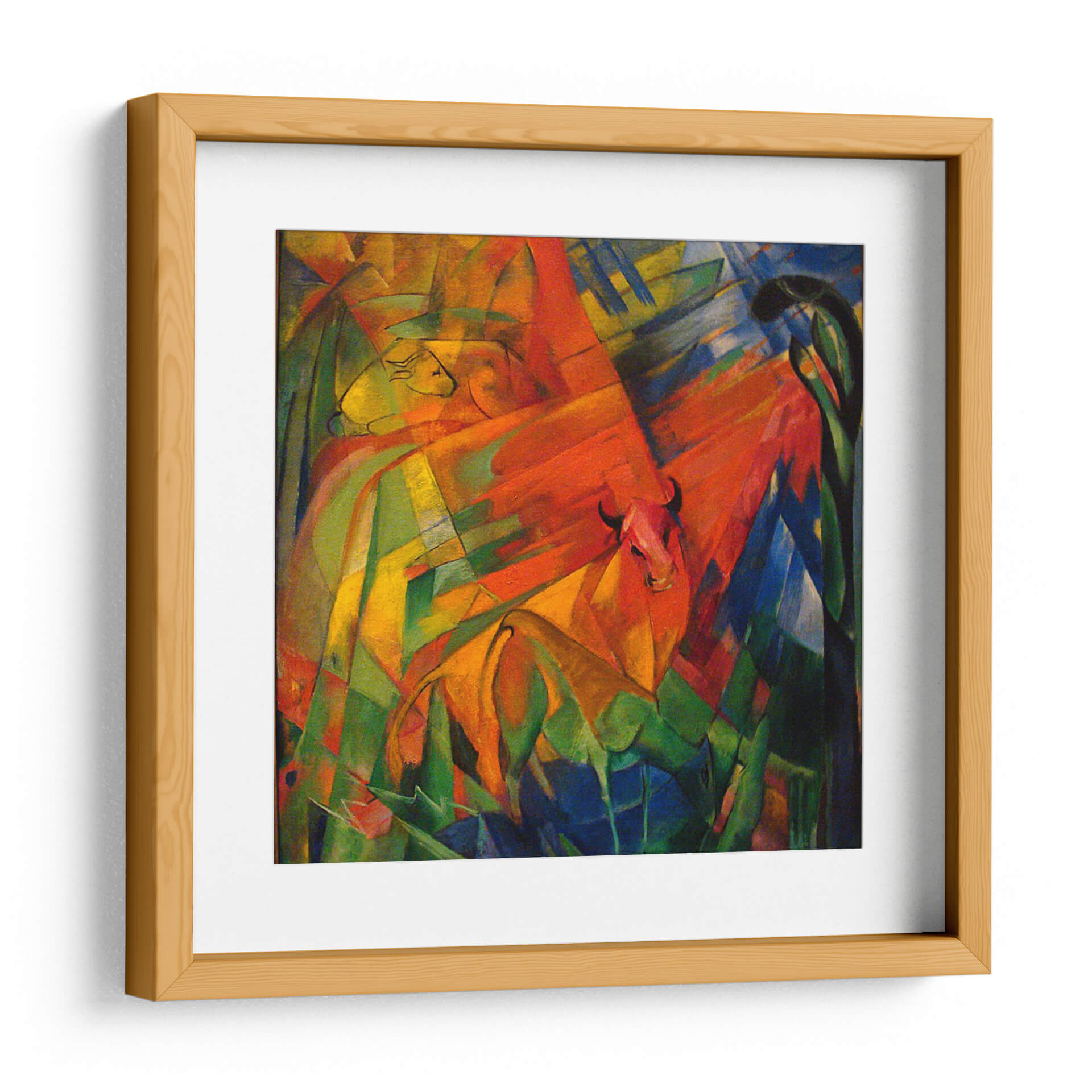 Sumérgete en la vibrante y enérgica obra 'Animales en Paisaje' del aclamado artista Franz Marc. Este cautivador cuadro decorativo es una explosión de color y forma, donde las figuras animales se fusionan con un entorno abstracto y dinámico. Los intensos tonos rojos, naranjas y amarillos se entrelazan con verdes profundos y azules eléctricos, creando una atmósfera de vitalidad y movimiento. Marc utiliza una técnica expresionista que descompone las formas tradicionales para revelar la esencia emocional de sus sujetos. Las líneas audaces y los planos geométricos dan una sensación de profundidad y dinamismo, invitando al espectador a una experiencia visual inmersiva. Ideal para espacios que buscan un toque de audacia y un punto focal artístico, como salas de estar modernas, estudios o cualquier lugar donde se desee infundir energía y color. Este cuadro decorativo no es solo una pieza de arte, sino una ventana a la visión única de Marc sobre la naturaleza y sus criaturas, transformando cualquier pared en una declaración de estilo y personalidad. Deja que la intensidad cromática y la composición audaz de este cuadro inspiren tu día a día y aporten una dimensión artística única a tu decoración.