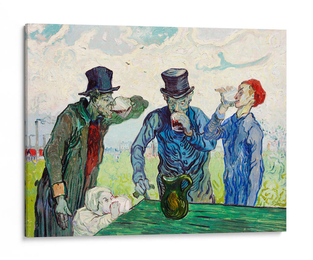 Sumérgete en la atmósfera vibrante y expresiva de "Los Bebedores", una obra maestra que captura un momento íntimo y cotidiano con la inconfundible pincelada de Vincent Van Gogh. Este cuadro decorativo representa a tres figuras en lo que parece ser un encuentro social, cada una inmersa en su propia acción, con un enfoque particular en el acto de beber. La paleta de colores es audaz y característica del postimpresionismo, con tonos verdes intensos que dominan la mesa y el paisaje de fondo, contrastando con los azules profundos y los toques rojizos de las vestimentas y los rostros. Las pinceladas cortas y enérgicas de Van Gogh dan vida a la escena, aportando textura y movimiento, transmitiendo una sensación de crudeza y humanidad. La composición, aunque centrada en los personajes, sugiere un entorno más amplio y social, posiblemente un jardín o una terraza, con una sutil representación de elementos arquitectónicos e industriales en la distancia. "Los Bebedores" no es solo una representación visual, sino una ventana a las emociones y la vida de sus sujetos, invitando a la reflexión sobre la conexión humana y los placeres simples. Este cuadro es ideal para añadir un toque de carácter y profundidad a tu sala de estar, estudio o comedor, atrayendo miradas y generando conversación. Transforma tu espacio con la intensidad artística y la emotividad de esta icónica pieza.