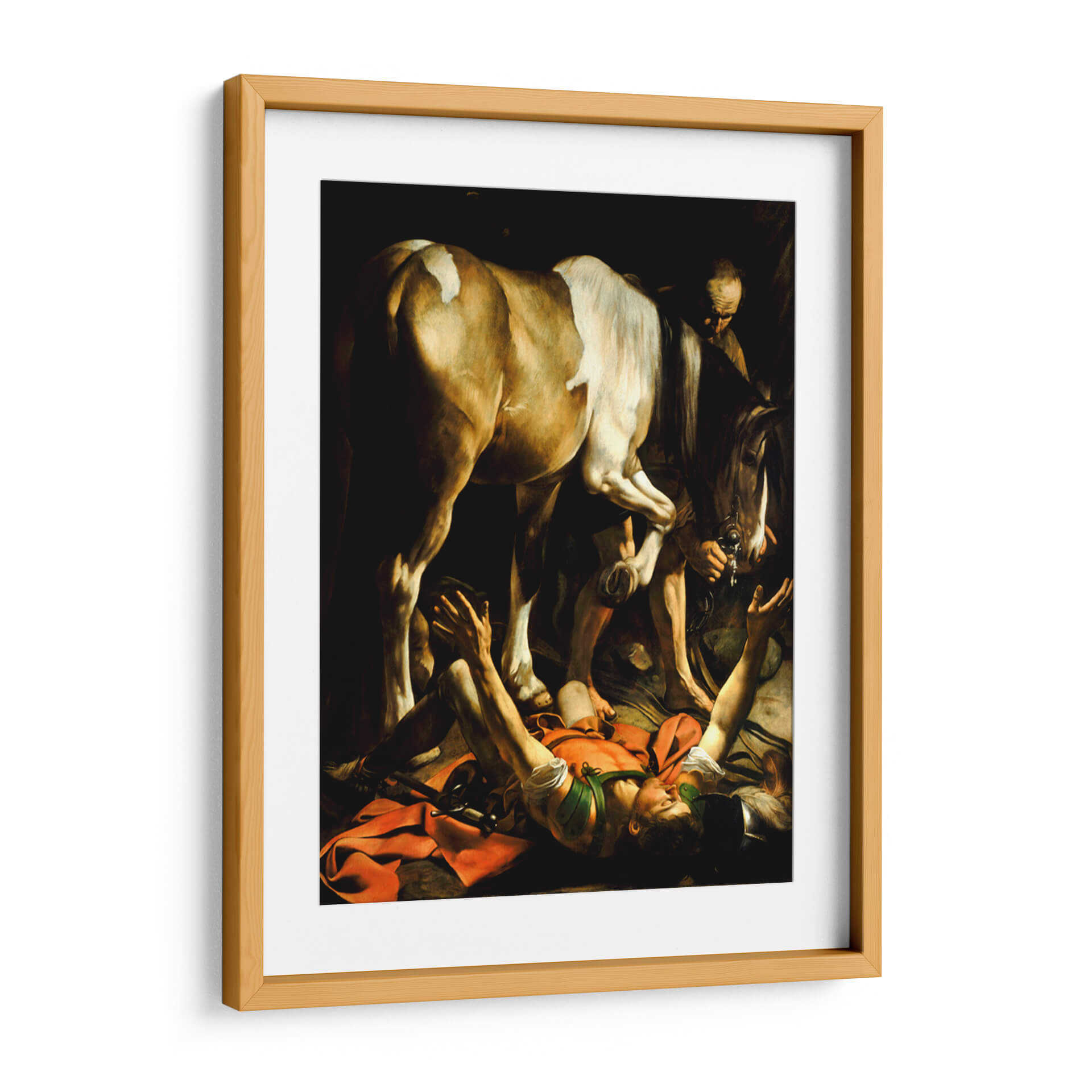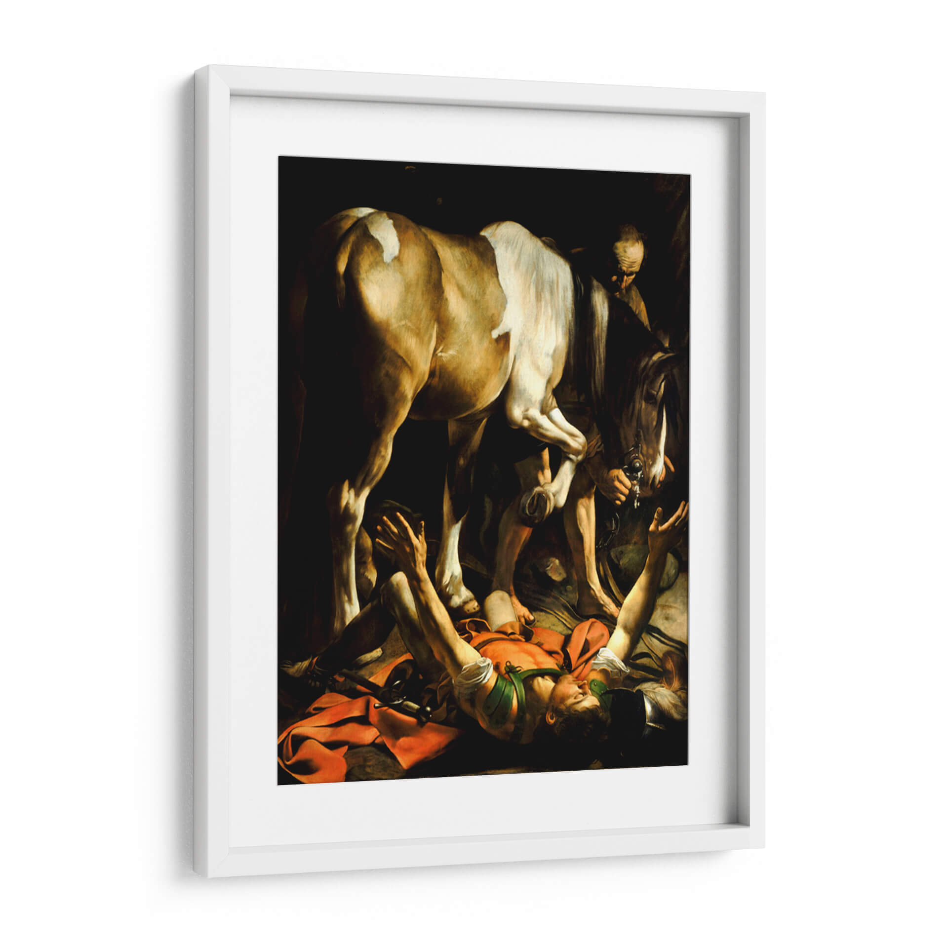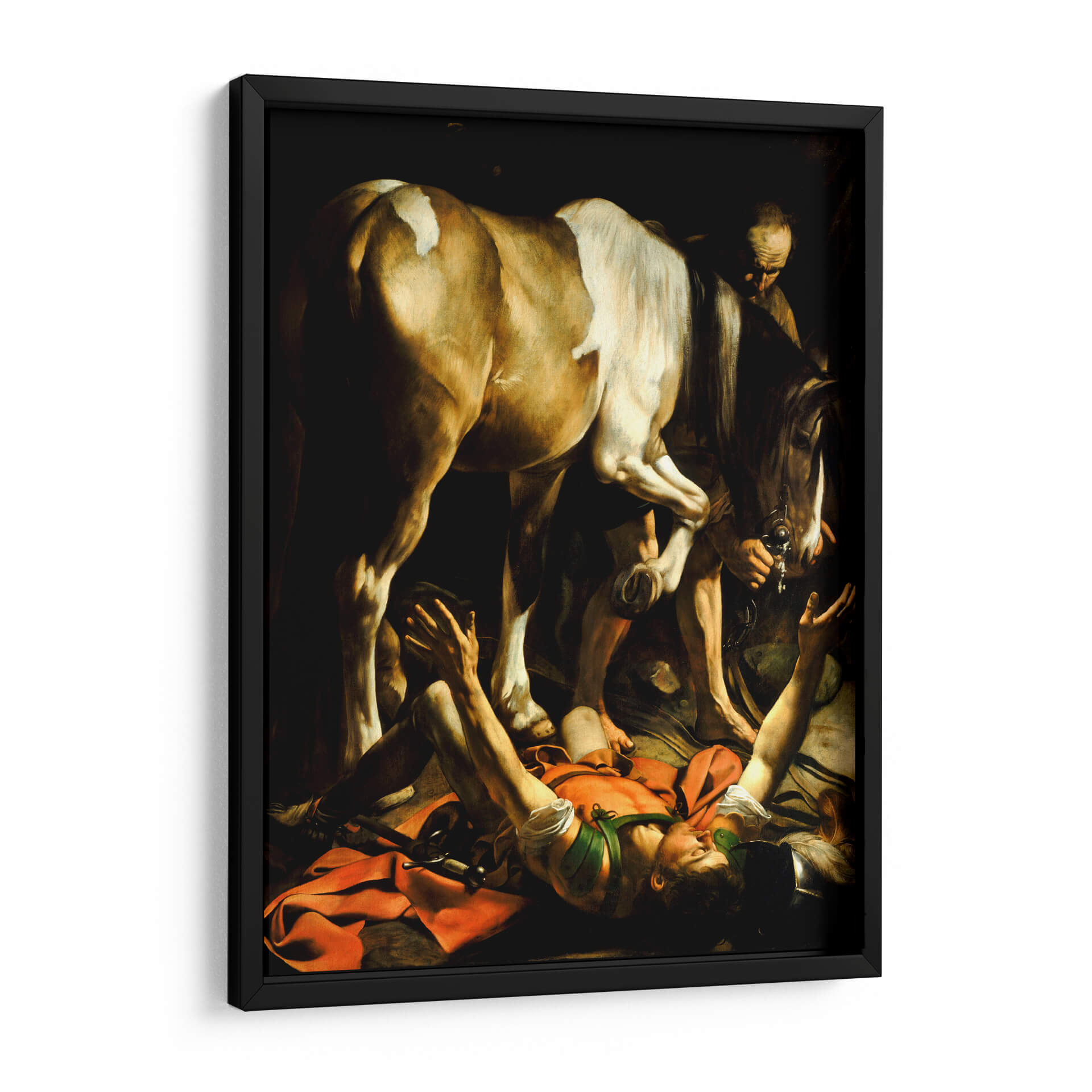 Sumérgete en la intensidad dramática de "La Conversión en el Camino de Damasco" de Caravaggio, una obra maestra que captura un momento de profunda revelación espiritual. Esta icónica pintura reproduce la inmediatez y el realismo característicos del artista, mostrando la figura de Saulo cayendo de su caballo en un cegador encuentro con la divinidad. La composición, dominada por el poderoso caballo y la figura caída, se realza con un juego de luces y sombras tenebristas que acentúan el dramatismo y la emoción del instante. Los colores terrosos y cálidos, salpicados por el rojo vibrante de la tela, guían la mirada hacia el epicentro de la acción, creando una atmósfera de gran impacto visual y espiritual. Este cuadro decorativo es ideal para quienes buscan añadir una pieza de arte clásico con una narrativa poderosa y una ejecución magistral a su hogar u oficina, aportando un toque de introspección y trascendencia a cualquier espacio. Su realismo crudo y la intensidad emocional lo convierten en un punto focal inolvidable para salas de estar, estudios o cualquier lugar donde se aprecie el arte con profundidad y carácter.