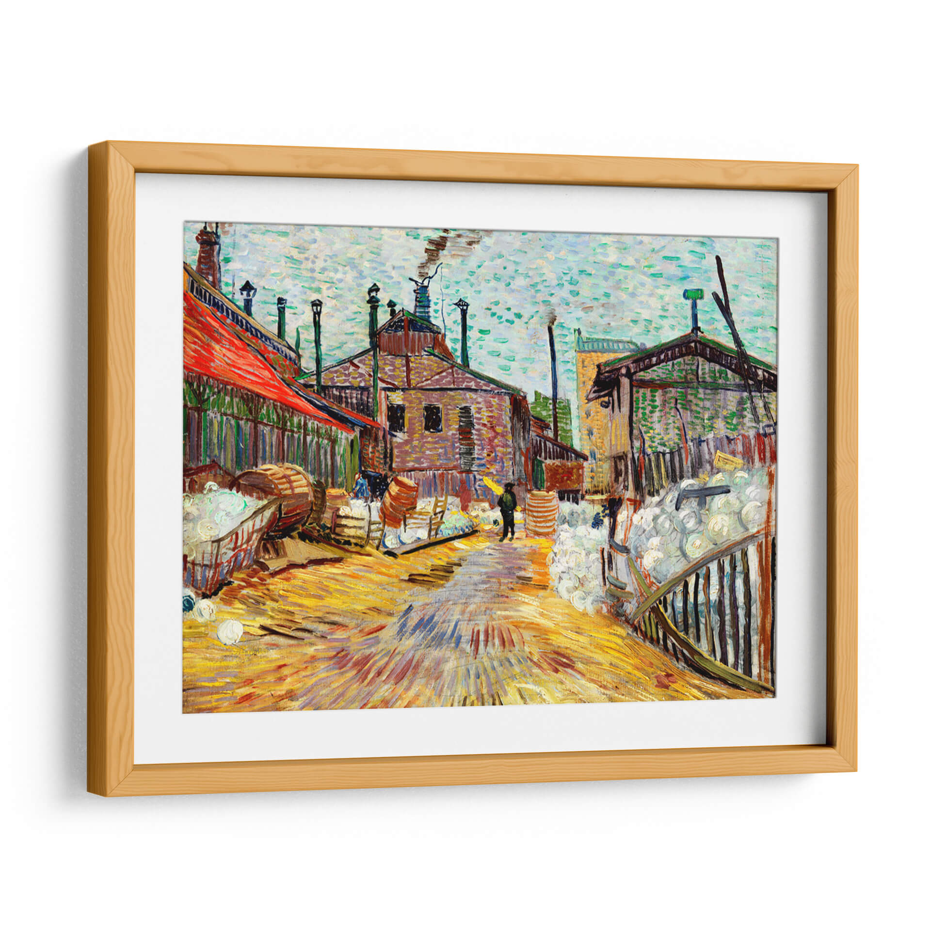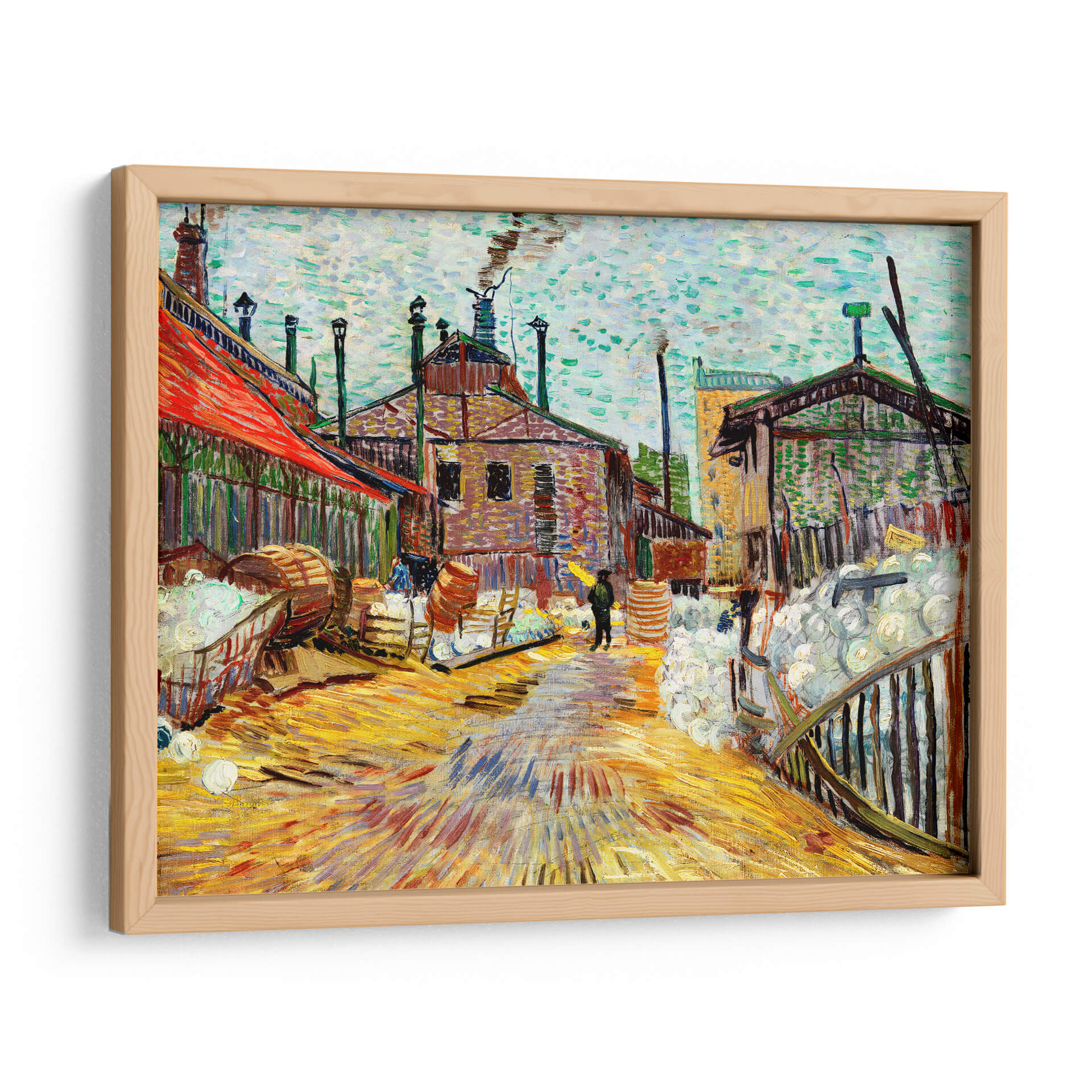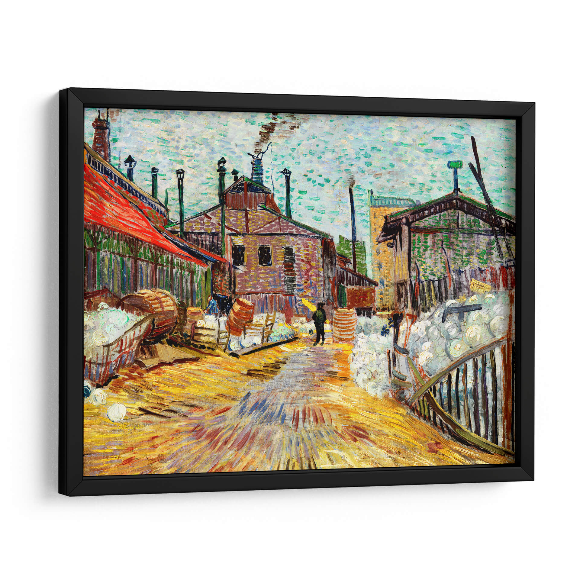 Sumérgete en la vibrante atmósfera industrial de 'La Fábrica', una obra maestra que captura la esencia de la vida laboral con la inconfundible pincelada de Vincent Van Gogh. Este cuadro decorativo transporta a tu hogar u oficina a una escena llena de energía y textura, donde los edificios de ladrillo se alzan bajo un cielo nublado y el suelo refleja los intensos tonos amarillos y ocres. La paleta de colores, dominada por cálidos ocres, rojos intensos y toques de azul verdoso, crea una sensación de actividad y vitalidad. La técnica postimpresionista de Van Gogh, con sus trazos audaces y expresivos, da vida a cada elemento, desde las chimeneas humeantes hasta los barriles apilados y la figura solitaria que camina bajo un paraguas amarillo. "La Fábrica" es más que una simple representación; es una invitación a sentir la dinámica de un entorno de trabajo. Ideal para aquellos que aprecian el arte con carácter y buscan infundir sus espacios con un toque de historia y emoción, este cuadro decorativo es perfecto para salas de estar, estudios o cualquier lugar donde se desee un punto focal impactante. Añade esta pieza icónica a tu colección y deja que su fuerza narrativa y su riqueza visual inspiren tu día a día.