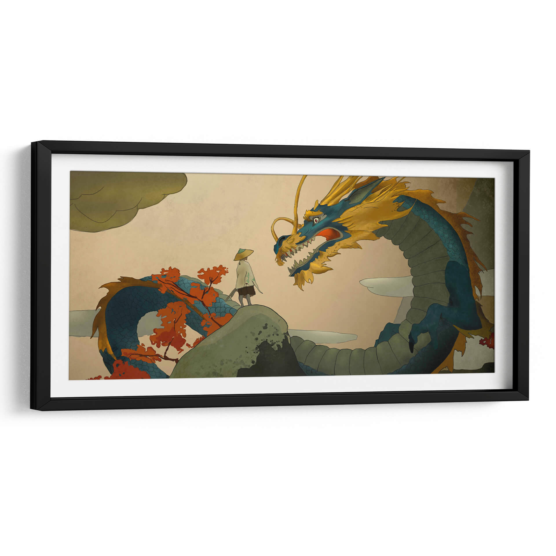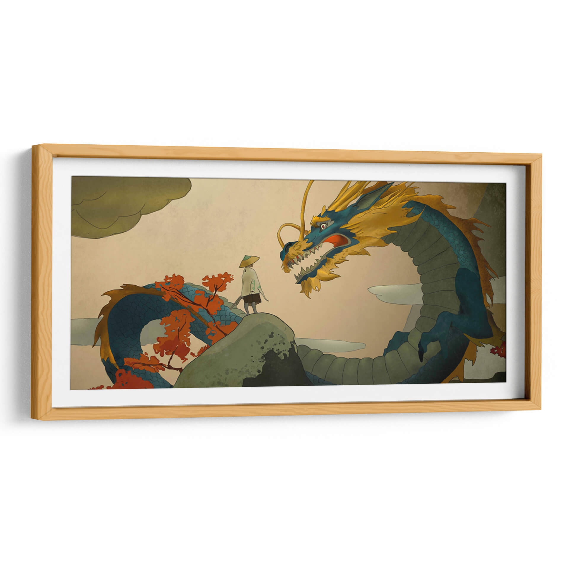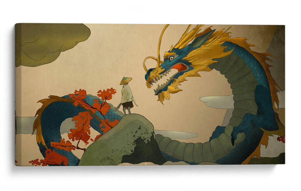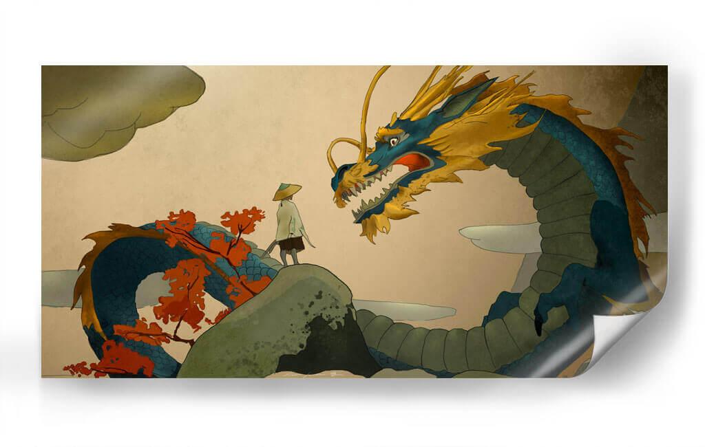 Sumérgete en el misticismo oriental con "El niño que sabía demasiado", una cautivadora obra de arte del artista Raúl Bermúdez. Esta pieza visualmente impactante te transportará a un reino de leyendas, donde un joven con un sombrero cónico se enfrenta a un majestuoso dragón de escamas azul profundo y detalles dorados. La composición evoca una narrativa de coraje y conocimiento ancestral, con el dragón serpenteando en un gesto imponente y el niño manteniéndose firme ante la criatura mítica. La paleta de colores, dominada por tonos tierra suaves, verdes musgo y vibrantes acentos de coral y oro, crea una atmósfera serena pero cargada de misterio. El estilo distintivo, que fusiona elementos tradicionales orientales con un toque contemporáneo, hace de este cuadro decorativo una adición única a cualquier espacio. Ideal para inspirar reflexión en tu estudio, añadir un punto de intriga a tu sala de estar, o como pieza central en una habitación temática. Este cuadro decorativo de Raúl Bermúdez no es solo una imagen, sino una invitación a explorar la sabiduría y la fuerza que residen en los cuentos antiguos, convirtiendo tu pared en un portal a otro mundo. Añade un toque de leyenda y sofisticación a tu hogar u oficina.