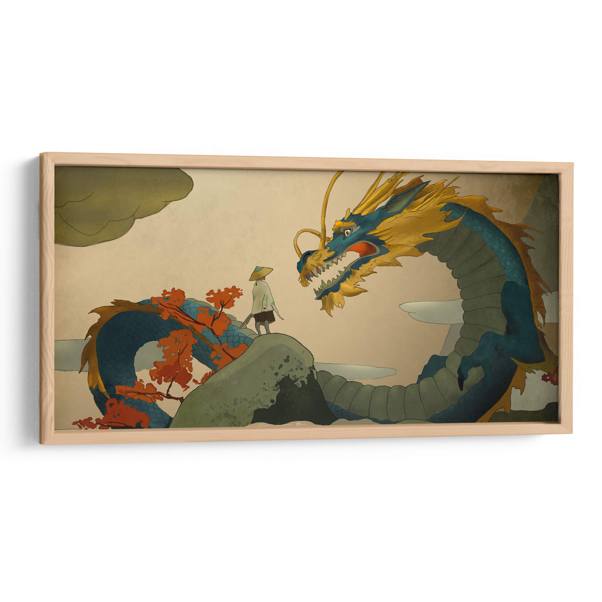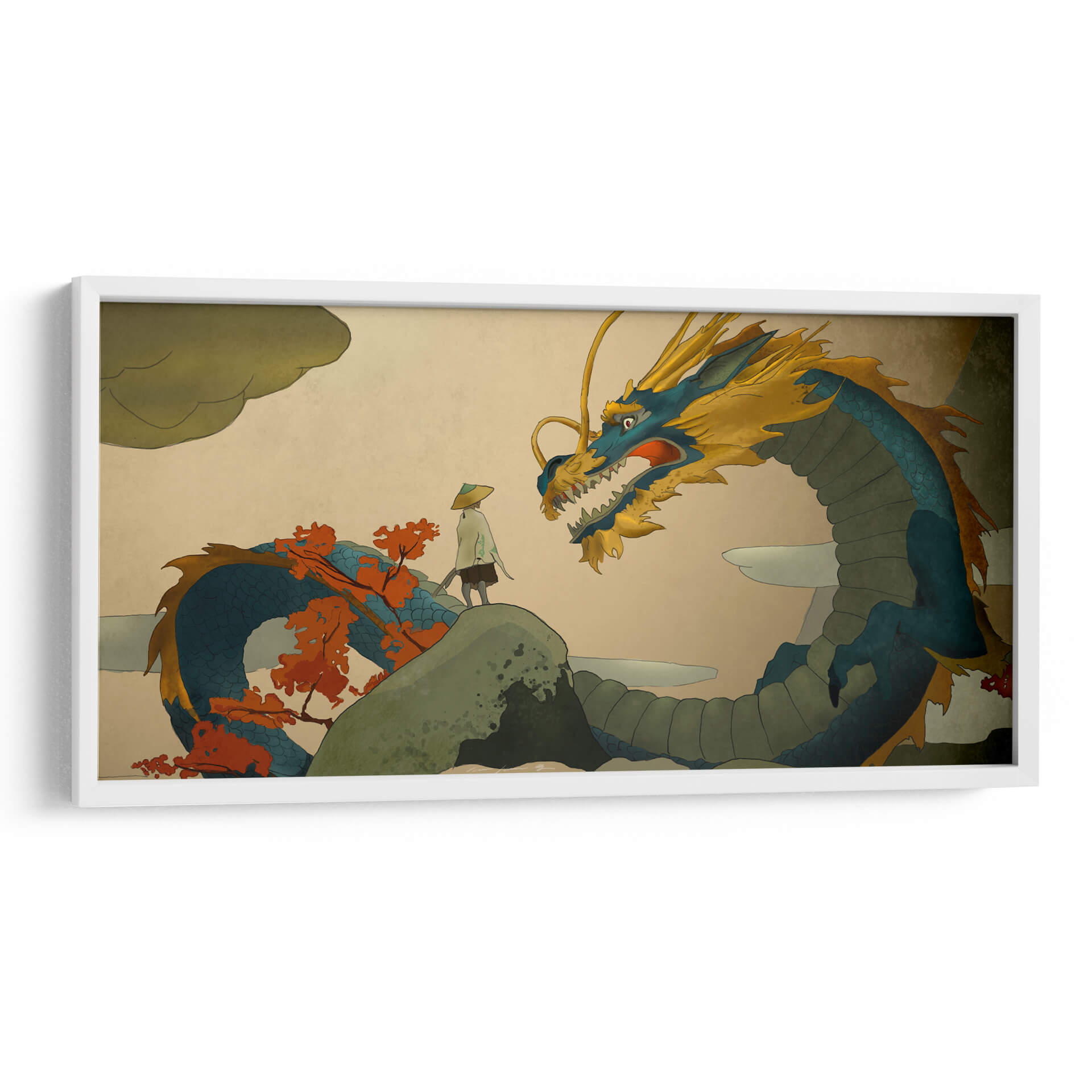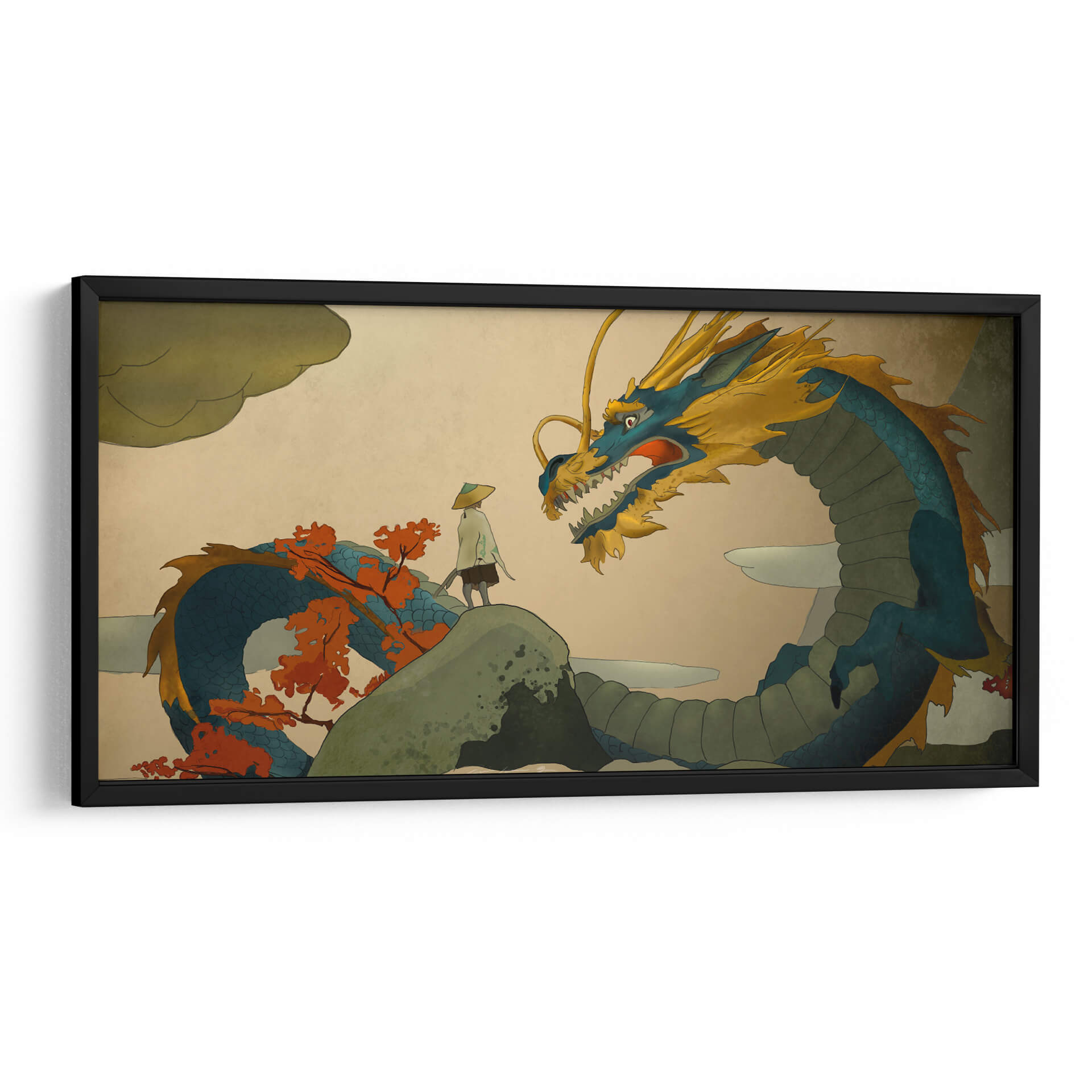 Sumérgete en el misticismo oriental con "El niño que sabía demasiado", una cautivadora obra de arte del artista Raúl Bermúdez. Esta pieza visualmente impactante te transportará a un reino de leyendas, donde un joven con un sombrero cónico se enfrenta a un majestuoso dragón de escamas azul profundo y detalles dorados. La composición evoca una narrativa de coraje y conocimiento ancestral, con el dragón serpenteando en un gesto imponente y el niño manteniéndose firme ante la criatura mítica. La paleta de colores, dominada por tonos tierra suaves, verdes musgo y vibrantes acentos de coral y oro, crea una atmósfera serena pero cargada de misterio. El estilo distintivo, que fusiona elementos tradicionales orientales con un toque contemporáneo, hace de este cuadro decorativo una adición única a cualquier espacio. Ideal para inspirar reflexión en tu estudio, añadir un punto de intriga a tu sala de estar, o como pieza central en una habitación temática. Este cuadro decorativo de Raúl Bermúdez no es solo una imagen, sino una invitación a explorar la sabiduría y la fuerza que residen en los cuentos antiguos, convirtiendo tu pared en un portal a otro mundo. Añade un toque de leyenda y sofisticación a tu hogar u oficina.