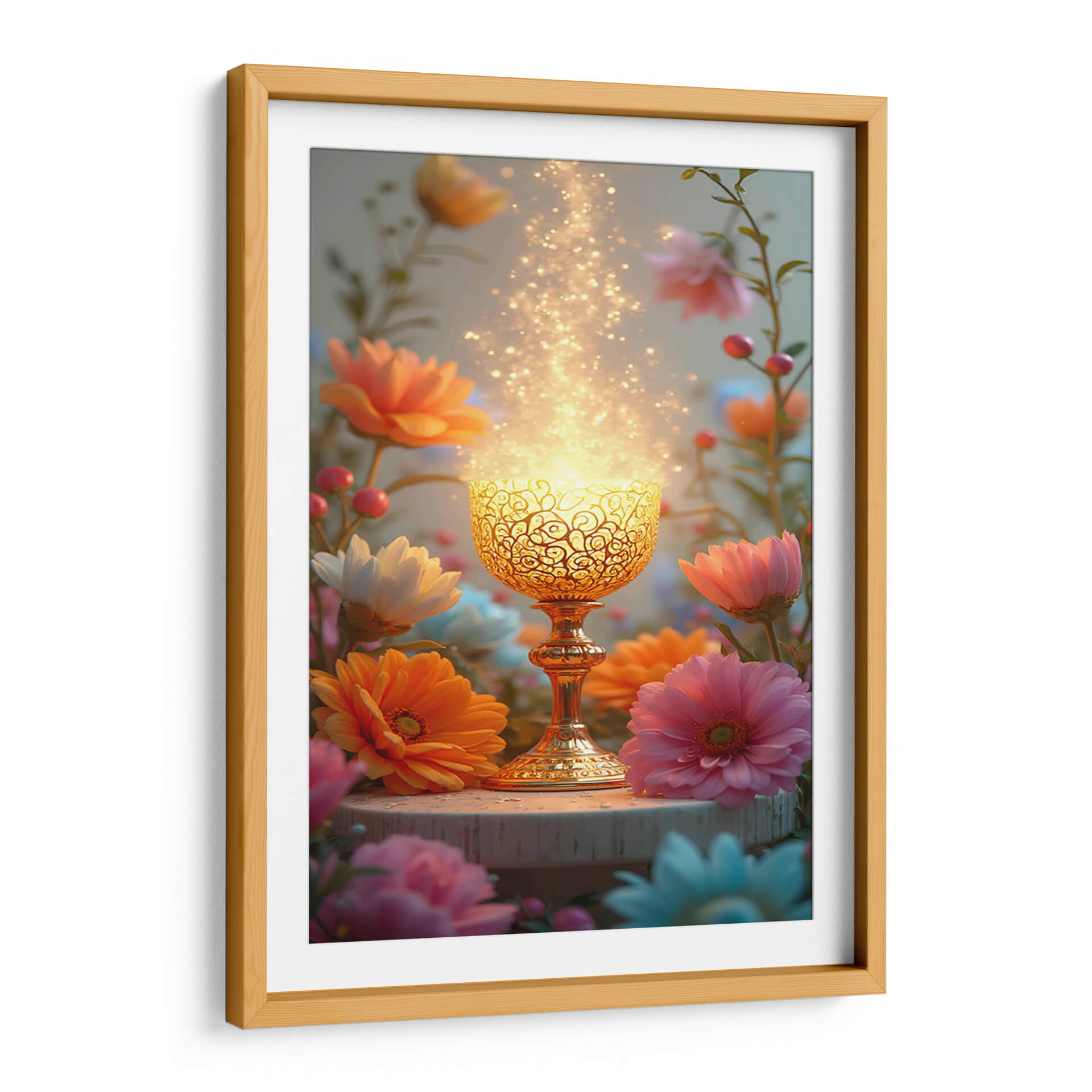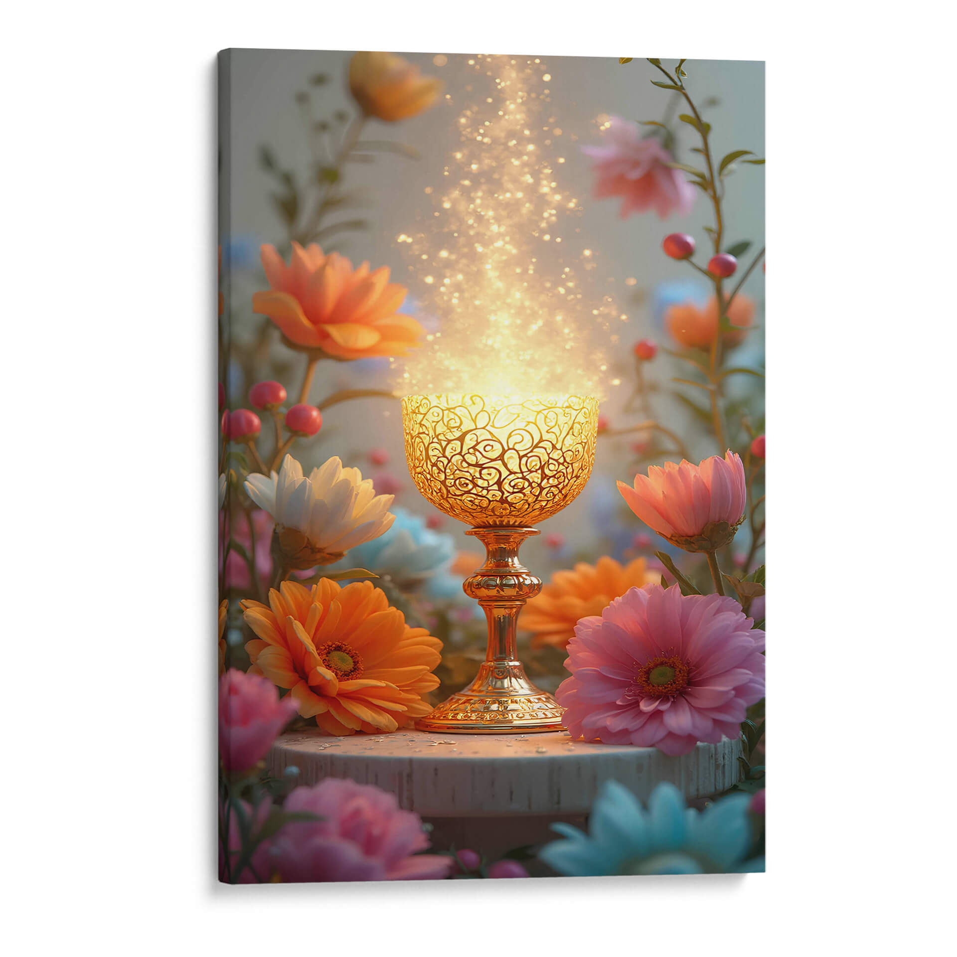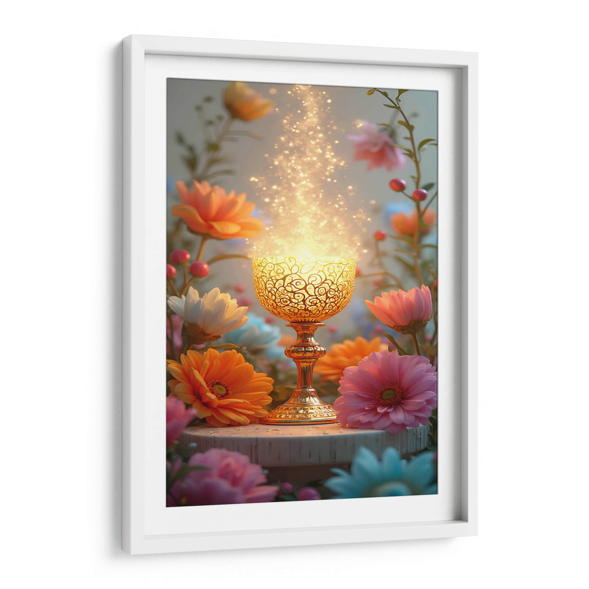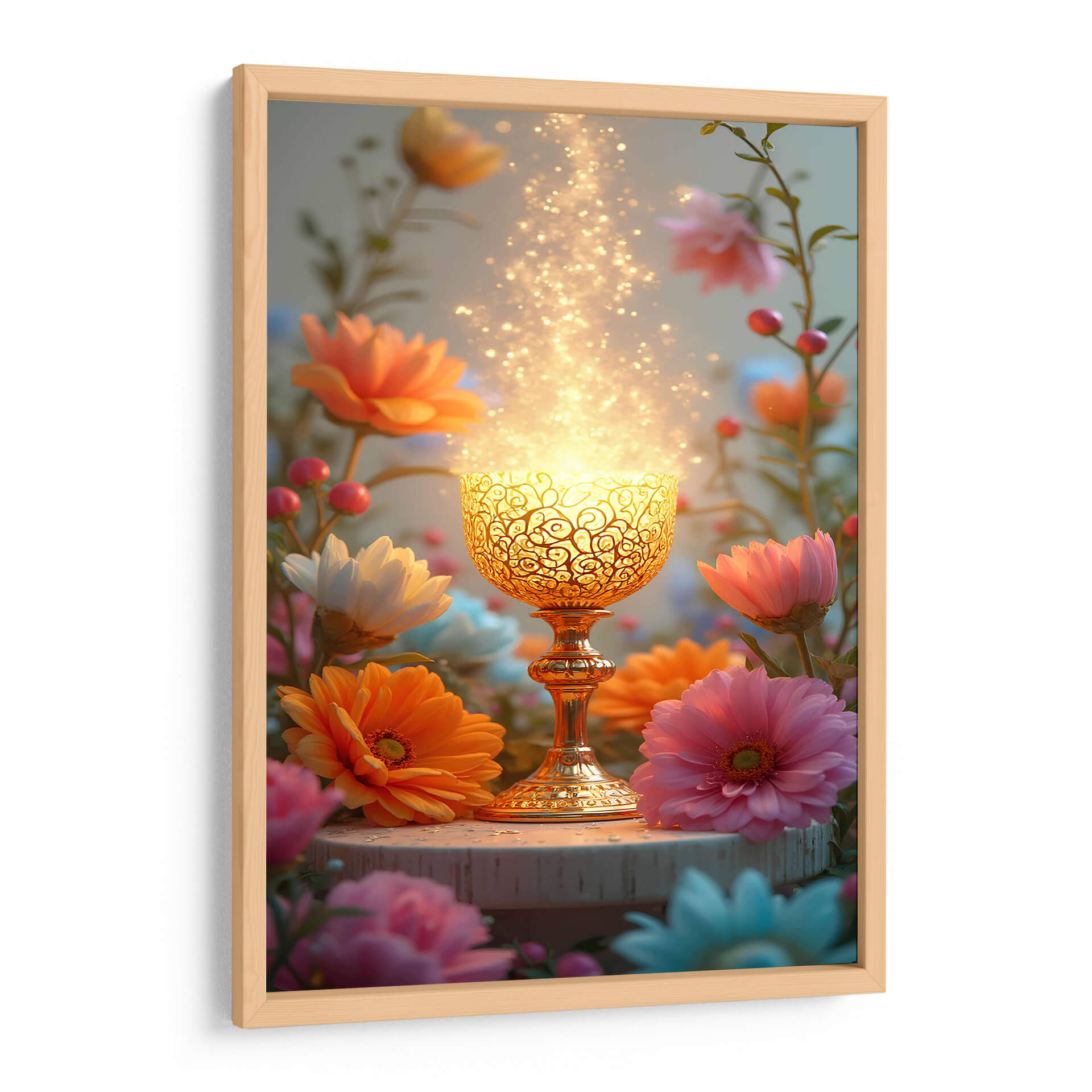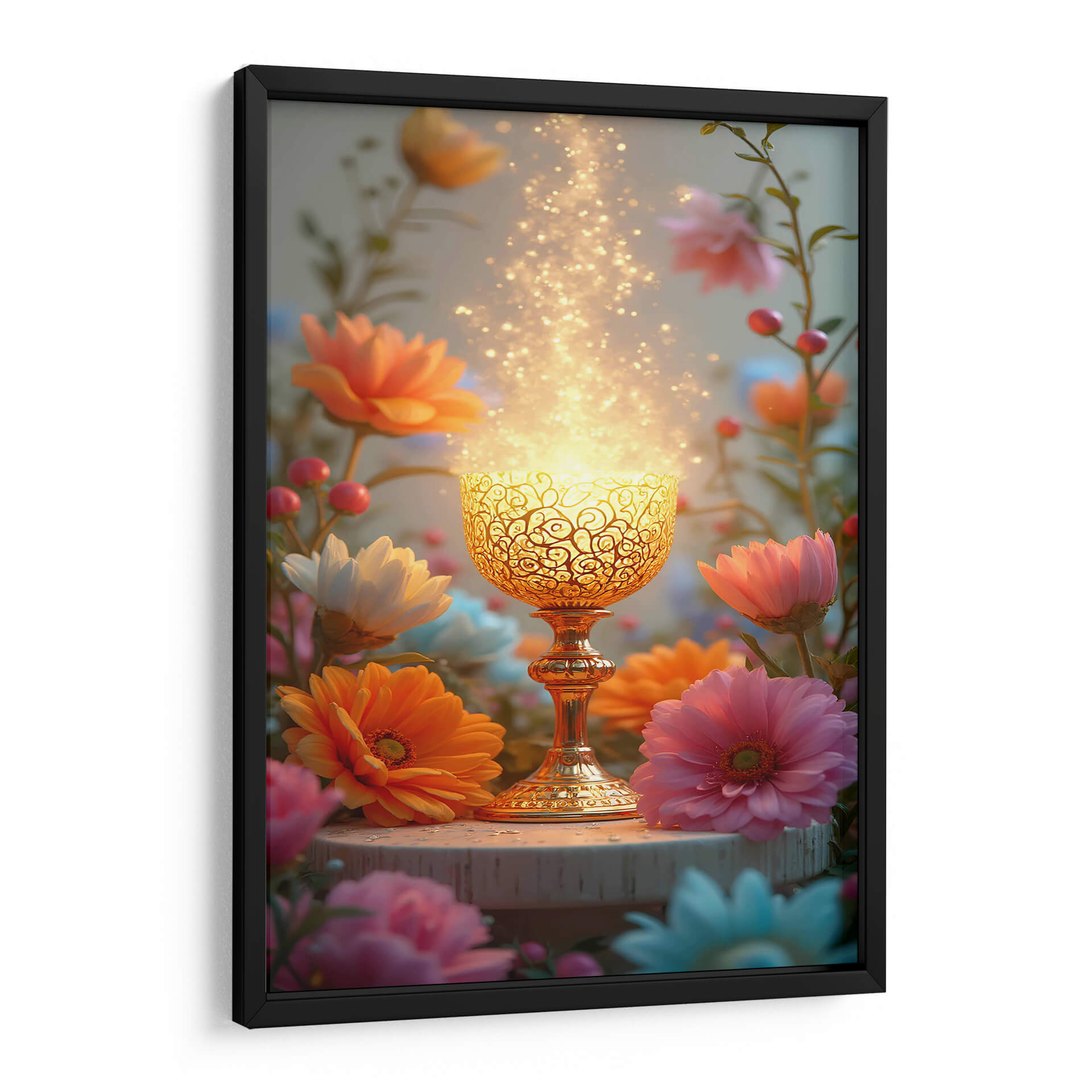 Sumérgete en la serenidad y el misterio con "Arte Sacro 009", una obra digital que irradia una luz etérea y transformadora. La pieza central es un cáliz dorado intrincadamente diseñado, que parece contener una energía brillante y chispeante, elevándose hacia un cielo suavemente iluminado. Alrededor de este punto focal, un jardín vibrante florece con gerberas en tonos anaranjados, rosas intensos y blancos puros, junto con delicados capullos y bayas rojas, creando un contraste cautivador entre lo sagrado y lo terrenal. La paleta de colores, dominada por cálidos dorados, rosas, naranjas y toques de azul pálido, evoca una sensación de paz, renovación y espiritualidad. El estilo digital detallado pero con un toque onírico, junto con la composición que enmarca el cáliz con la exuberancia floral, invita a la contemplación. Este cuadro decorativo es perfecto para añadir un toque de magia y calma a tu dormitorio, un rincón de meditación o como un punto de interés inspirador en tu sala de estar, creando un ambiente de serenidad y esperanza en cualquier espacio. Un recordatorio visual de la belleza que emana de lo invisible.