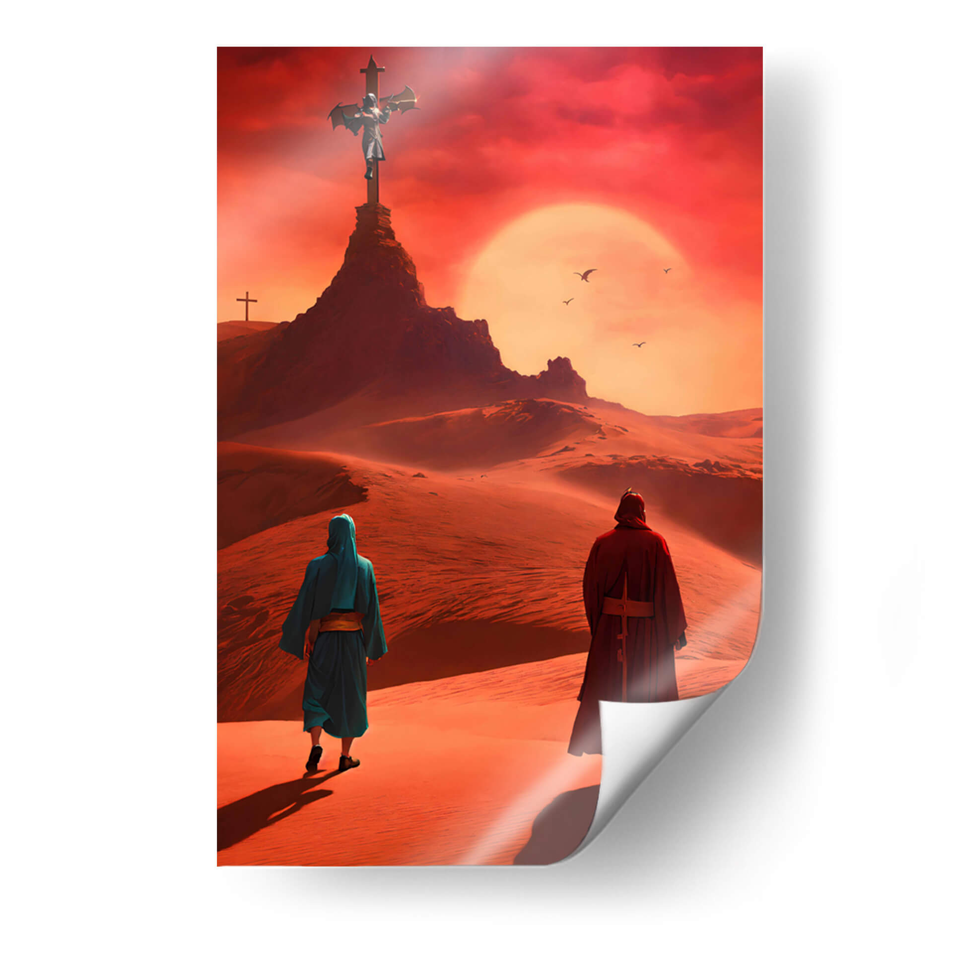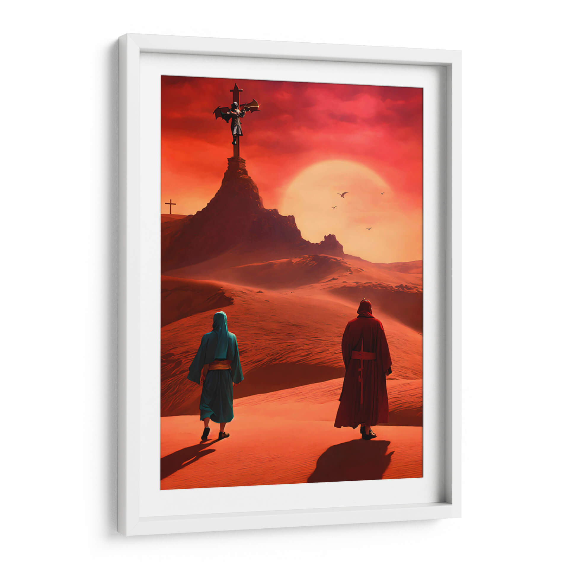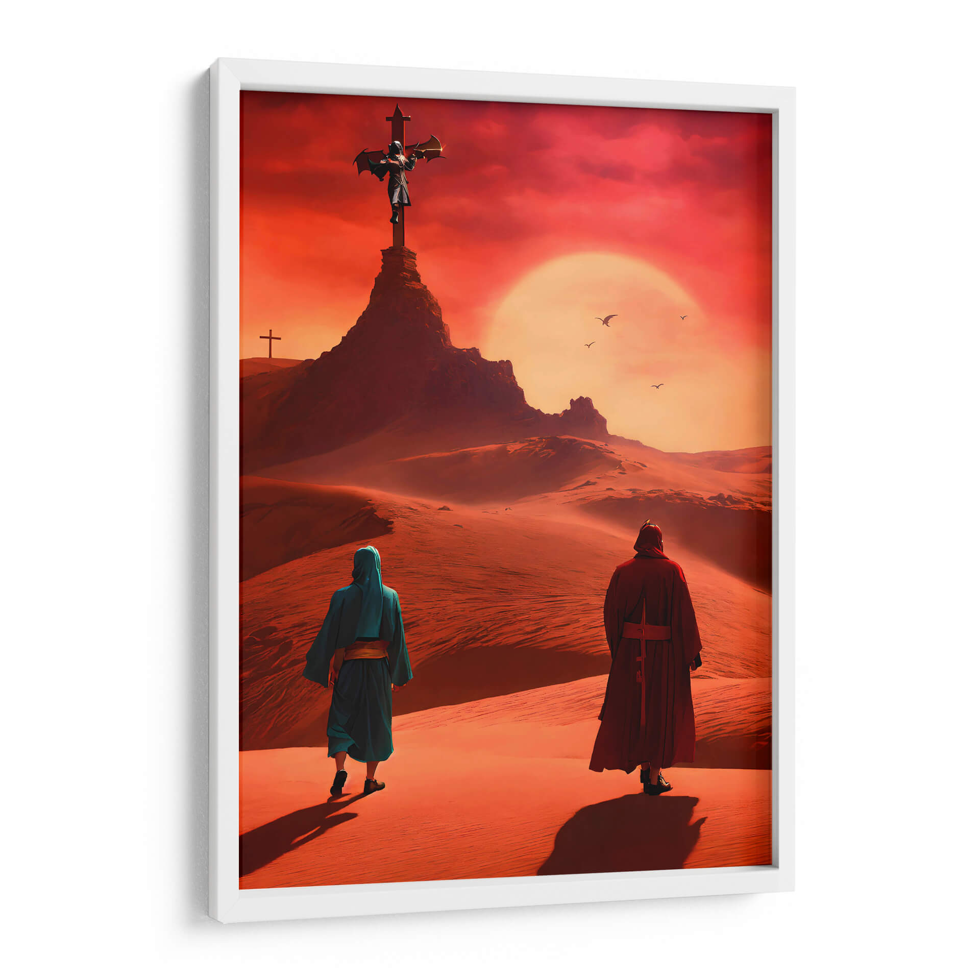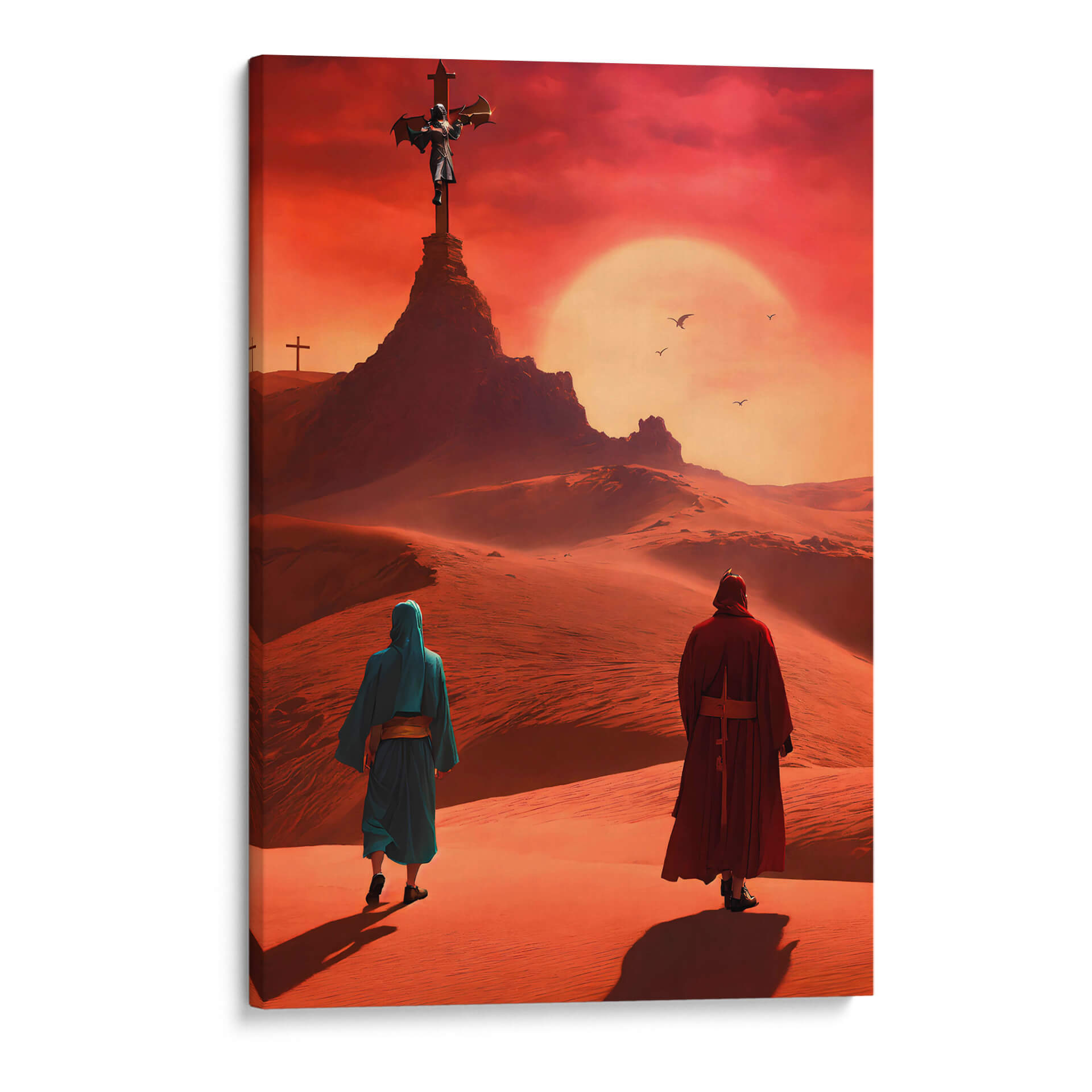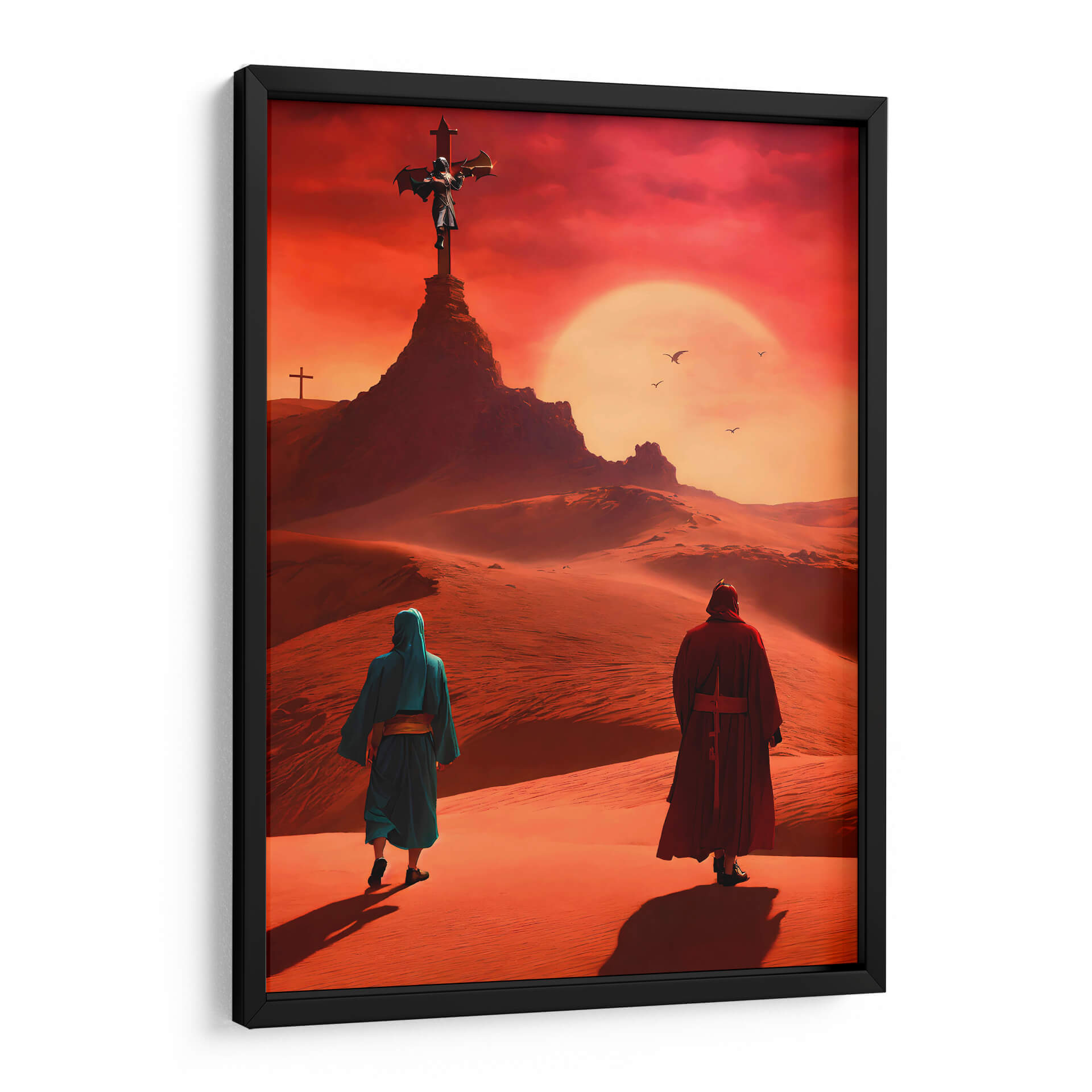 Sumérgete en la desolación y el misticismo con el cuadro decorativo 'Arte Sacro 012', una obra digital que evoca paisajes desérticos bajo un cielo ardiente. La composición nos presenta a dos figuras en túnicas caminando a través de dunas de arena, dirigiendo la mirada hacia una imponente cruz en la cima de una colina rocosa. El sol, un disco brillante y anaranjado, domina el horizonte, creando una atmósfera de intensidad espiritual y misterio. La paleta de colores, dominada por tonos ocres, rojizos y anaranjados intensos, transporta al espectador a un lugar árido y cargado de significado. El estilo digital y la atmósfera etérea sugieren una profunda reflexión sobre la fe, la peregrinación y la búsqueda de trascendencia. Este cuadro es ideal para aquellos que buscan una pieza de arte que provoque conversación y añada un toque de profundidad a su hogar u oficina, como una sala de estar moderna, un estudio o incluso un dormitorio que invite a la meditación. Su temática espiritual y su impacto visual lo convierten en un elemento decorativo potente y memorable, un lienzo que trasciende lo puramente estético para adentrarse en lo simbólico.