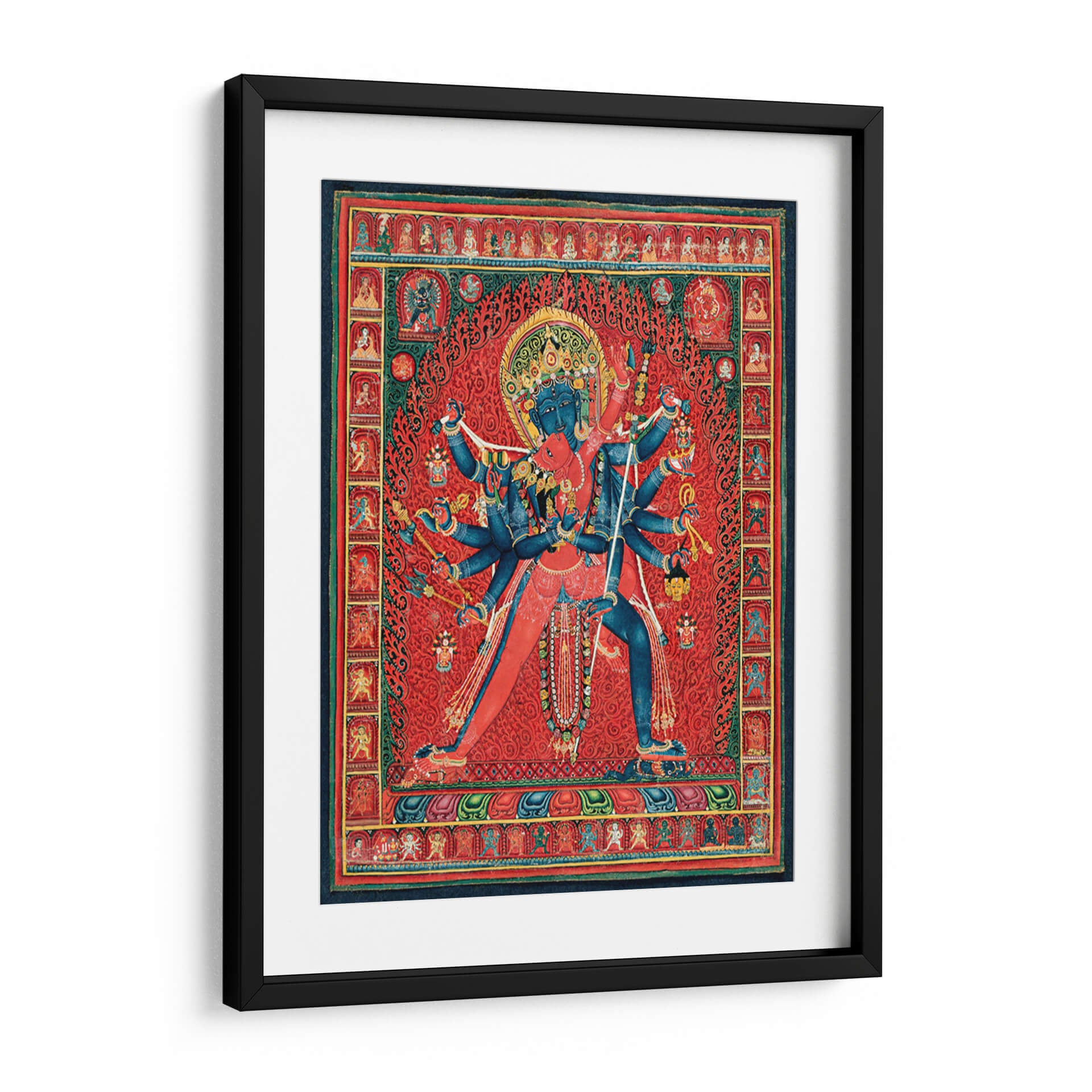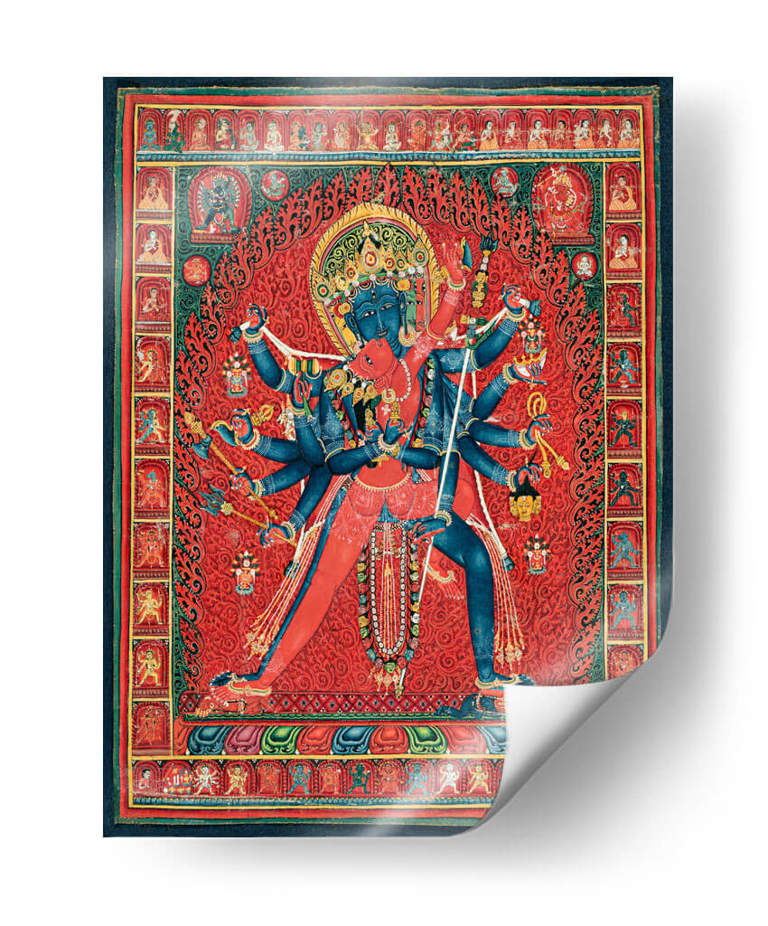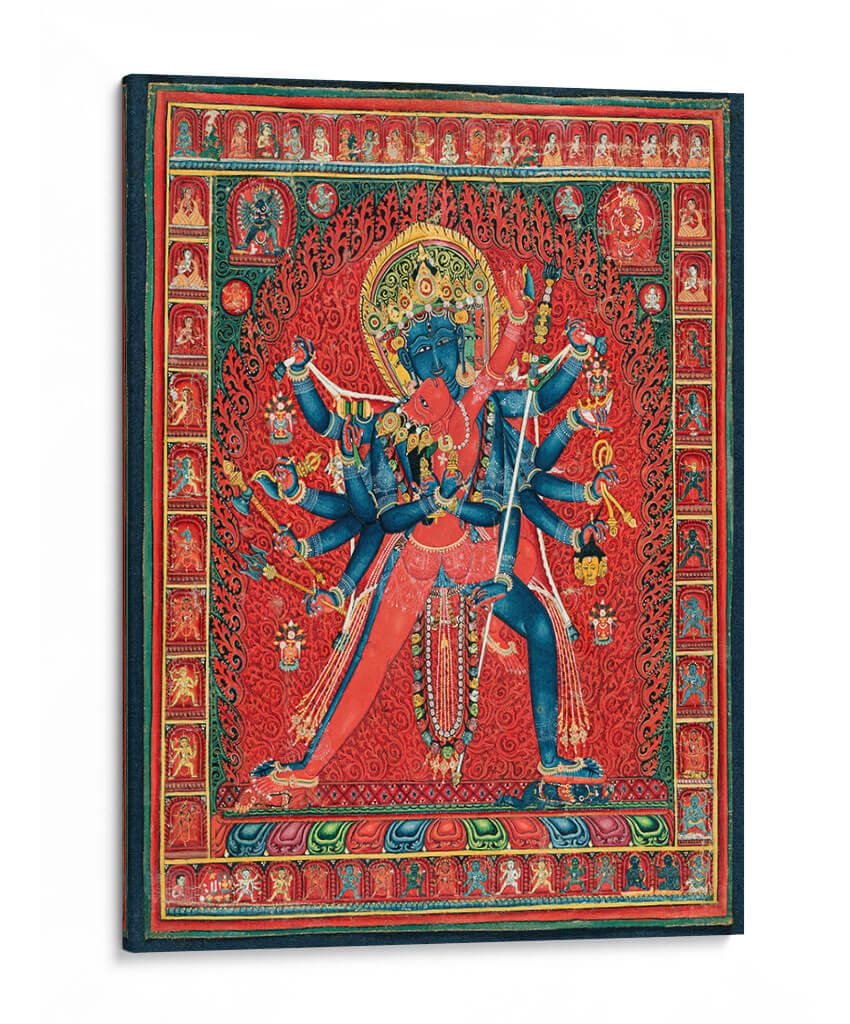 Sumérgete en la profundidad espiritual y la vibrante energía de este cautivador cuadro decorativo, inspirado en la iconografía budista tántrica. La obra representa a Chakrasamvara y su consorte Vajravarahi, una poderosa deidad tántrica, en una pose dinámica que simboliza la unión de la compasión y la sabiduría. La composición intrincada, con sus múltiples brazos y figuras detalladas, evoca un sentido de poder y protección. Predominan los tonos rojos intensos y vibrantes, creando un fondo lleno de energía que contrasta con el azul profundo de las figuras centrales, añadiendo un toque de misterio y trascendencia. Los patrones ornamentales y las pequeñas figuras que bordean la escena principal añaden una riqueza visual y una atmósfera de devoción y tradición. Este cuadro decorativo es ideal para aquellos que buscan infundir a su hogar u oficina un aura de espiritualidad, fuerza y arte culturalmente rico. Su complejidad y simbolismo lo convierten en un punto focal intrigante, perfecto para salas de estar, estudios o cualquier espacio que aspire a una conexión con lo sagrado y lo ancestral. Es una pieza que invita a la contemplación y al diálogo, aportando una dimensión única a la decoración de interiores.