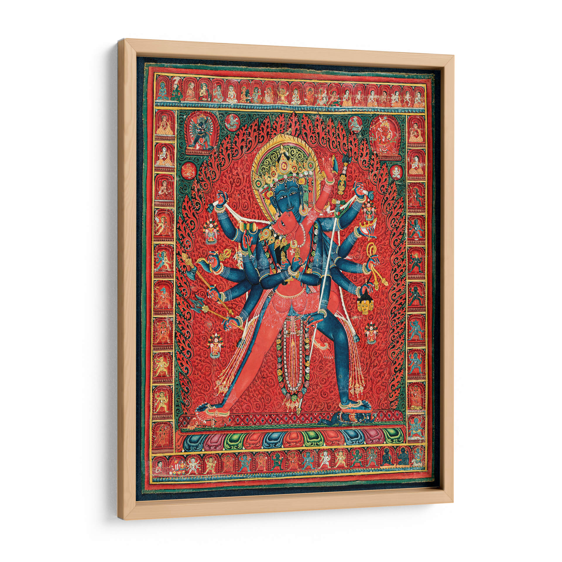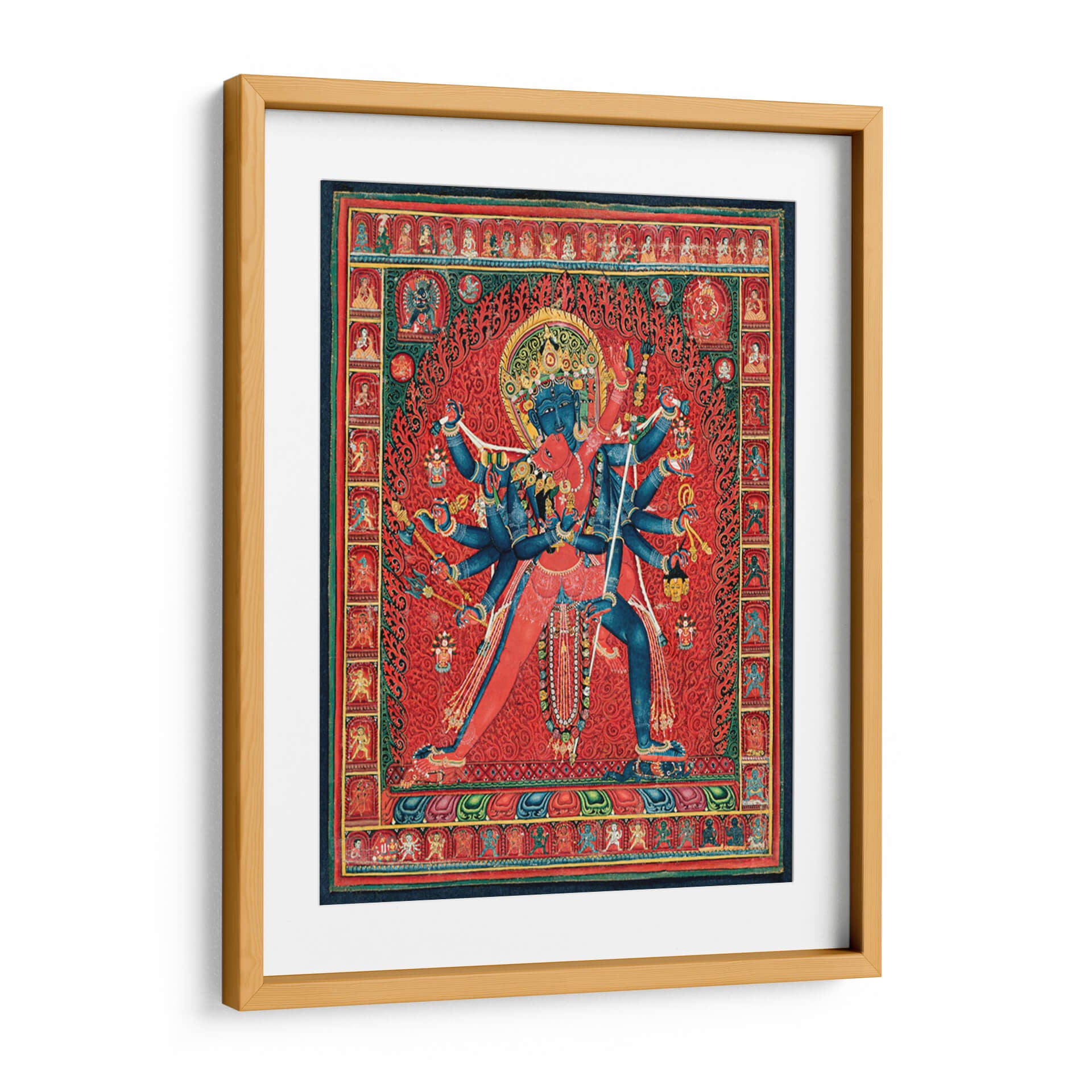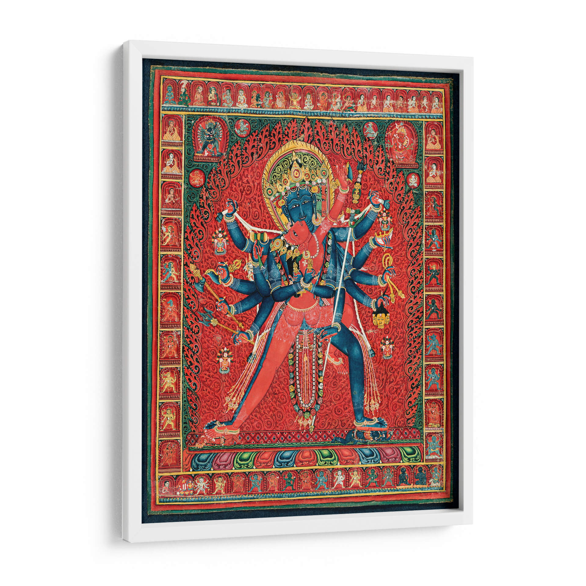 Sumérgete en la profundidad espiritual y la vibrante energía de este cautivador cuadro decorativo, inspirado en la iconografía budista tántrica. La obra representa a Chakrasamvara y su consorte Vajravarahi, una poderosa deidad tántrica, en una pose dinámica que simboliza la unión de la compasión y la sabiduría. La composición intrincada, con sus múltiples brazos y figuras detalladas, evoca un sentido de poder y protección. Predominan los tonos rojos intensos y vibrantes, creando un fondo lleno de energía que contrasta con el azul profundo de las figuras centrales, añadiendo un toque de misterio y trascendencia. Los patrones ornamentales y las pequeñas figuras que bordean la escena principal añaden una riqueza visual y una atmósfera de devoción y tradición. Este cuadro decorativo es ideal para aquellos que buscan infundir a su hogar u oficina un aura de espiritualidad, fuerza y arte culturalmente rico. Su complejidad y simbolismo lo convierten en un punto focal intrigante, perfecto para salas de estar, estudios o cualquier espacio que aspire a una conexión con lo sagrado y lo ancestral. Es una pieza que invita a la contemplación y al diálogo, aportando una dimensión única a la decoración de interiores.