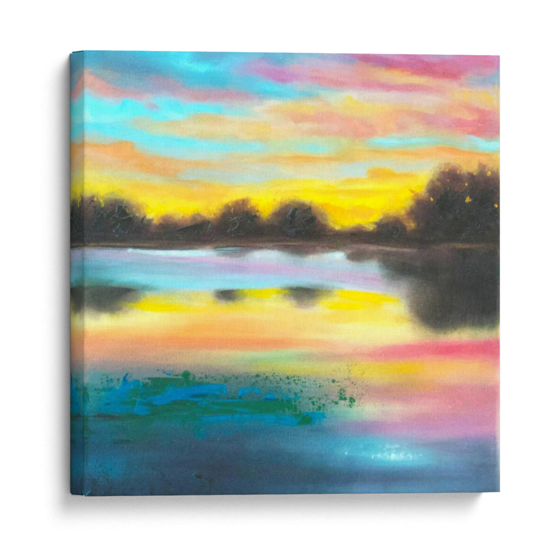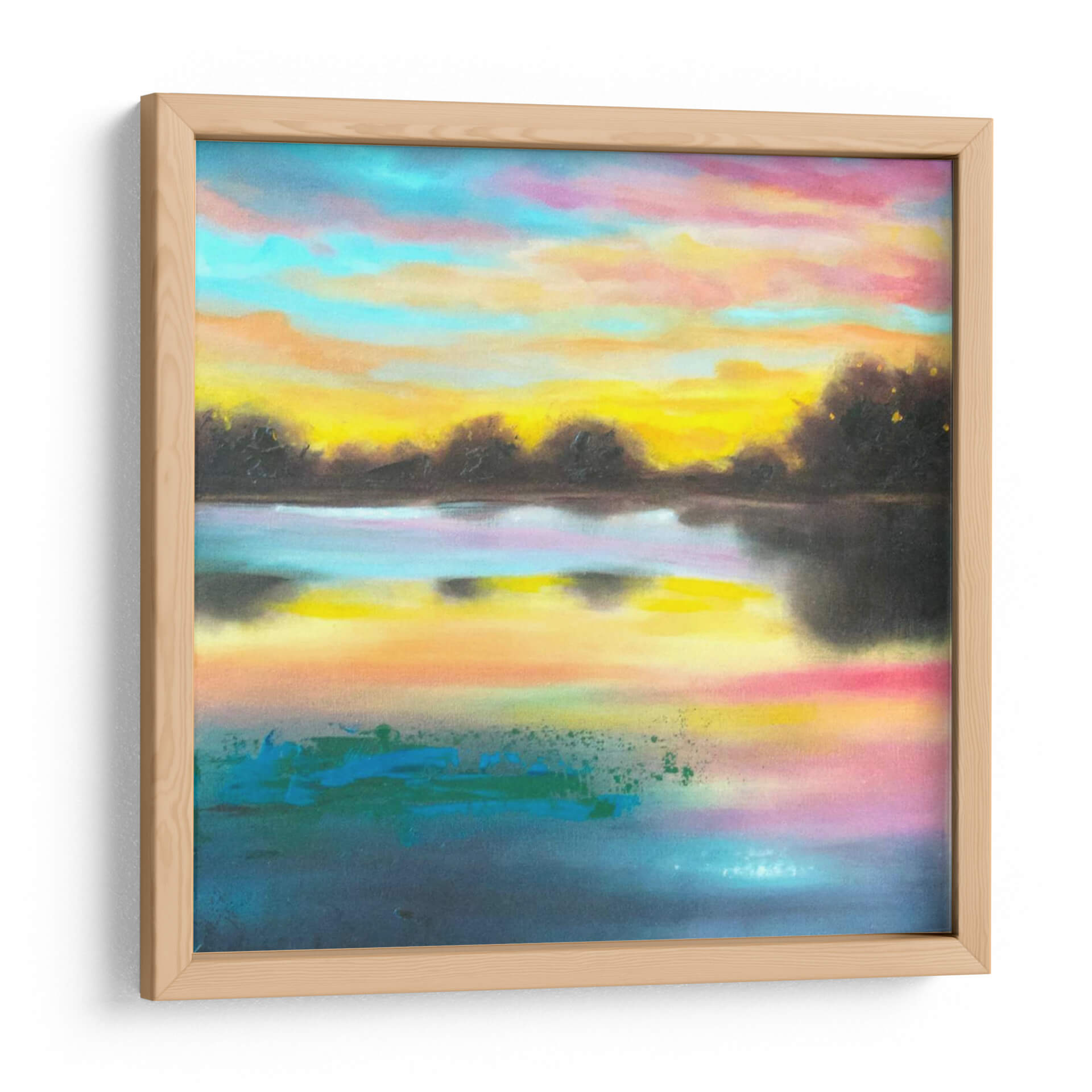 Sumérgete en la serena belleza de "El Gran Esquema De Las Cosas", una obra de arte cautivadora del artista Marabeth Quin. Este cuadro decorativo captura un paisaje etéreo al amanecer o atardecer, donde el cielo se funde en vibrantes tonos de amarillo, naranja, rosa y azul turquesa. Las nubes parecen pinceladas sueltas que añaden una textura suave y soñadora. Debajo, un cuerpo de agua tranquilo refleja los colores del cielo y la silueta oscura de árboles o vegetación en la distancia, creando un efecto de espejo hipnotizante. La parte inferior de la obra presenta toques audaces de azul y verde, que añaden un contraste dinámico y moderno a la escena, sugiriendo la fluidez y la profundidad del agua. El estilo artístico es una mezcla evocadora de impresionismo y abstracción, invitando a la contemplación y a la interpretación personal. "El Gran Esquema De Las Cosas" es ideal para añadir un toque de tranquilidad y color a cualquier hogar u oficina, convirtiéndose en un punto focal que inspira calma y asombro. Perfecto para quienes buscan arte contemporáneo que dialogue con la naturaleza y la emoción.