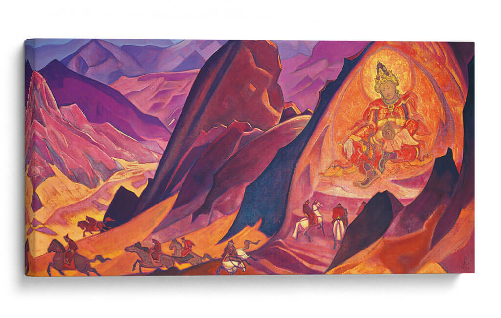 Sumérgete en la mística y majestuosidad de "El mando de Rigden Jyepo" de Nicholas Roerich, una obra que transporta al espectador a paisajes espirituales y épicos. Este cuadro decorativo captura la esencia de la contemplación y la búsqueda espiritual a través de una paleta de colores vibrantes que fusiona tonos ocres y dorados cálidos con profundos púrpuras y azules en las montañas. La composición dinámica muestra a jinetes en caravana atravesando un terreno escarpado, mientras una figura central radiante, llena de simbolismo místico, emerge de una luz dorada. La técnica de Roerich, con sus formas estilizadas y su énfasis en la atmósfera, crea una sensación de trascendencia y poder. "El mando de Rigden Jyepo" es ideal para espacios que buscan infundir una sensación de sabiduría antigua, aventura espiritual y una conexión con lo sublime. Perfecto como pieza focal en una sala de estar, estudio u oficina, este cuadro decorativo invita a la reflexión y añade un toque de espiritualidad y arte de calidad a cualquier ambiente. Una obra que inspira y eleva, resonando con quienes buscan profundidad y belleza en su decoración.