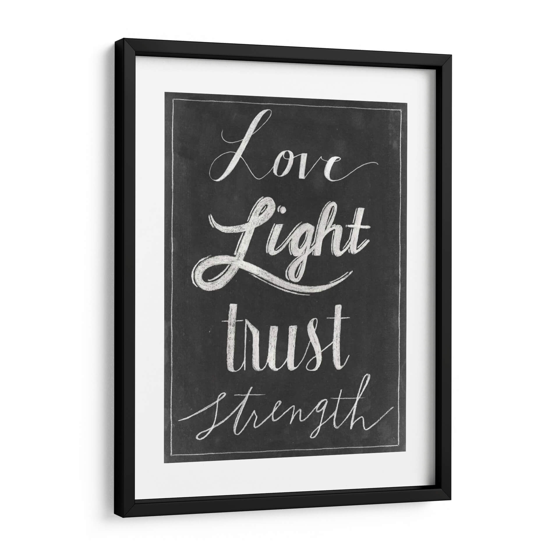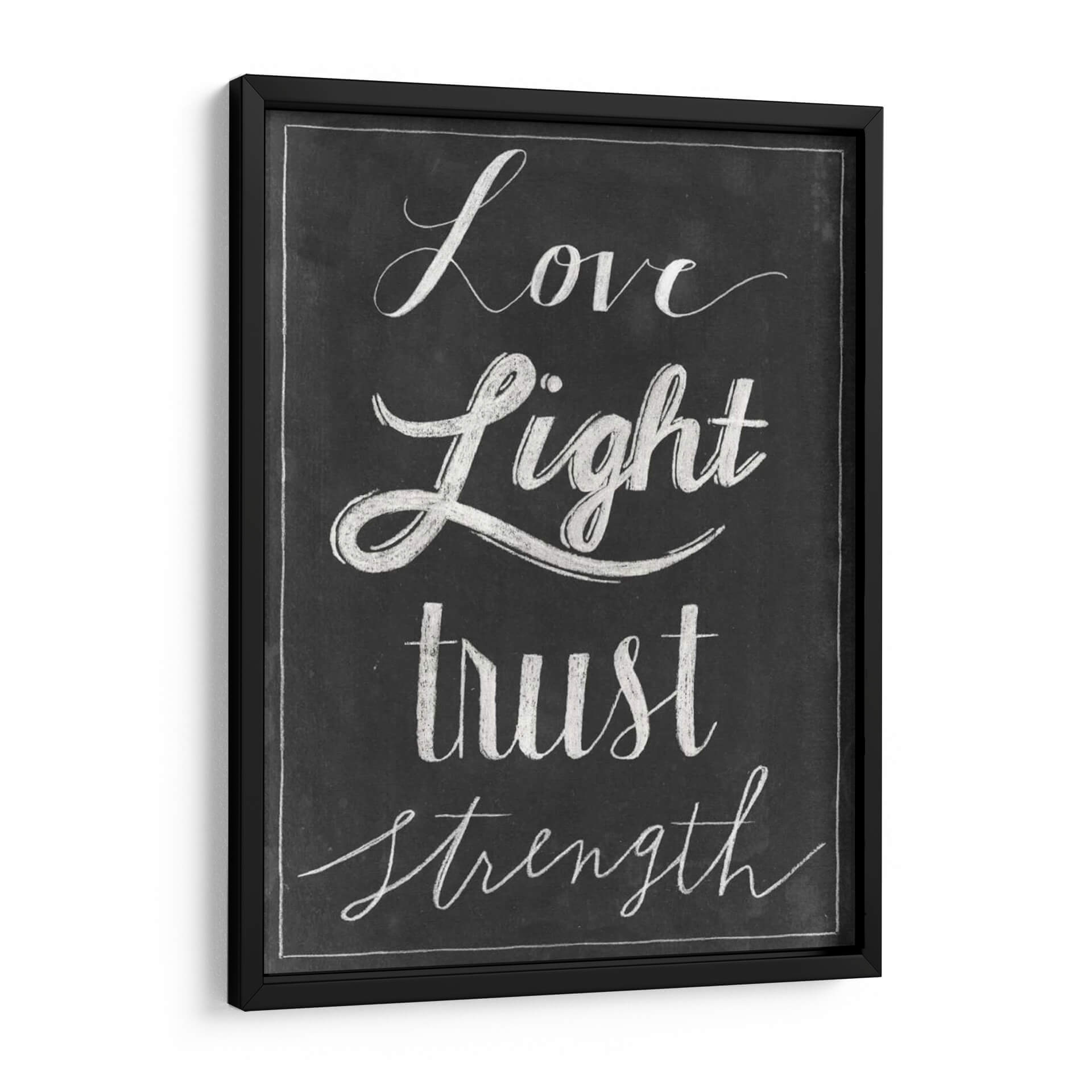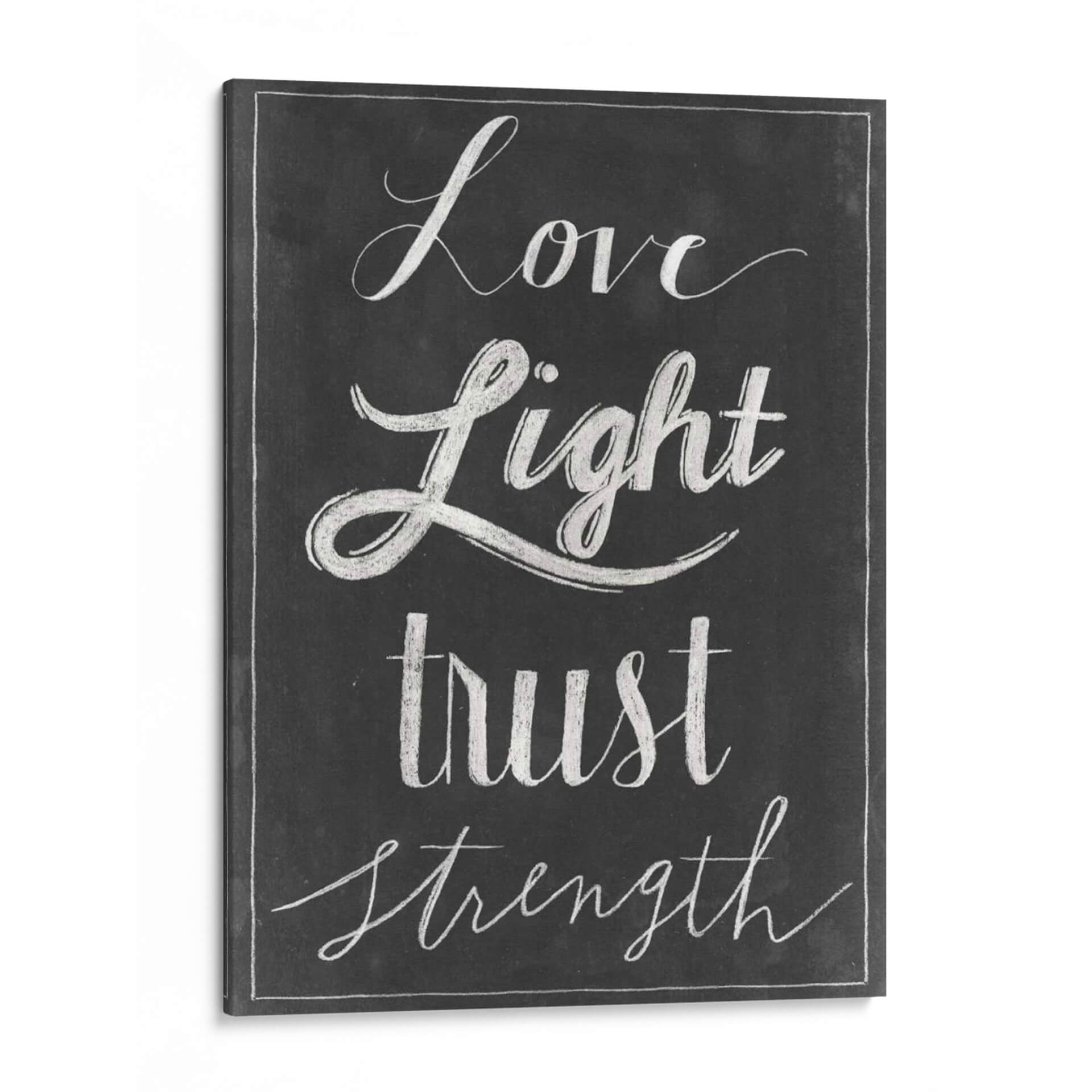 Inspira tu hogar u oficina con "Faith De La Pizarra Vi", una obra de arte que evoca serenidad y fortaleza. Este cuadro decorativo presenta una caligrafía elegante en blanco sobre un fondo oscuro que simula una pizarra, creando un contraste visual cautivador. Las palabras 'Love', 'Light', 'Trust' y 'Strength' se despliegan con trazos fluidos y expresivos, invitando a la reflexión y al optimismo. El estilo de pizarra, combinado con la tipografía cursiva, aporta un toque rústico y a la vez contemporáneo, perfecto para una decoración que busca mensajes positivos y estéticos. Ideal para espacios donde se valora la inspiración diaria, como estudios, salas de estar o zonas de meditación. Su diseño atemporal y sus potentes palabras lo convierten en un recordatorio constante de los pilares fundamentales de la vida. Añade un toque de significado y estilo a tus paredes con esta pieza única que combina arte visual y mensaje inspirador, ideal para cualquier persona que busque un ambiente de paz y confianza en su entorno.