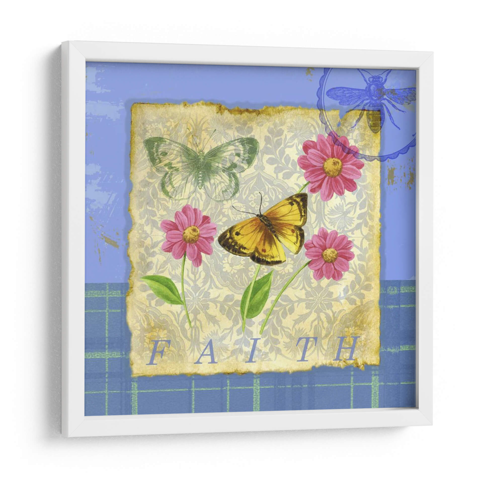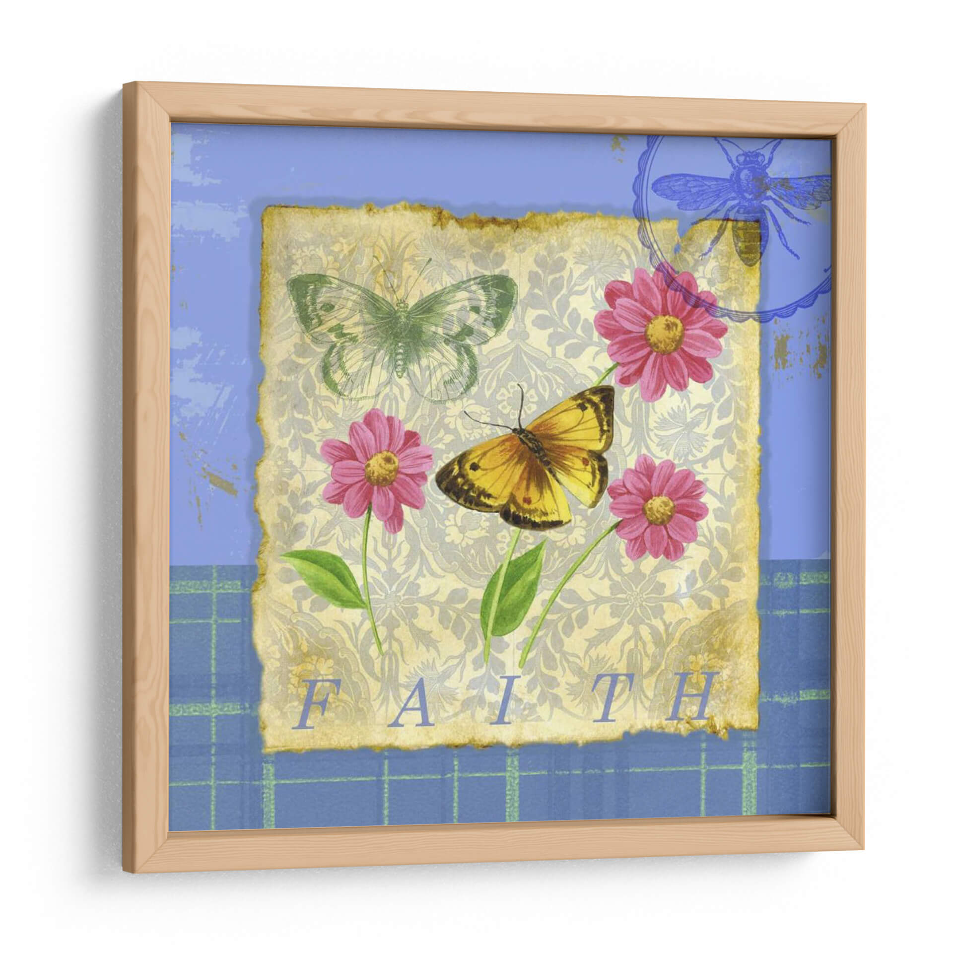 Embellece tu hogar con el encantador cuadro 'Papillon Plain II', una obra de arte que captura la delicadeza de la naturaleza en su máxima expresión. Este diseño presenta dos mariposas vibrantes, una de tonos dorados y marrones, y otra etérea en verde menta, posadas sobre un fondo texturizado que evoca papeles antiguos con sutiles motivos florales y un patrón damasco en tonos grises y beige. Tres alegres flores fucsia con centros amarillos aportan toques de color y vitalidad, complementadas por hojas verdes y un vibrante diseño de cuadros azules en los bordes. La palabra 'FAITH' inscrita en la parte inferior añade un toque inspirador y reflexivo a la composición. Con su estilo que combina elementos botánicos y un toque vintage, este cuadro es ideal para crear un ambiente de serenidad y encanto en tu sala de estar, dormitorio o estudio. Su paleta de colores, que fusiona el azul sereno con los cálidos tonos tierra y los vibrantes acentos fucsia, lo convierte en una pieza versátil, perfecta para añadir un toque de sofisticación natural a cualquier espacio moderno o rústico. 'Papillon Plain II' no es solo una decoración, es una invitación a la calma y a la belleza efímera de la vida.