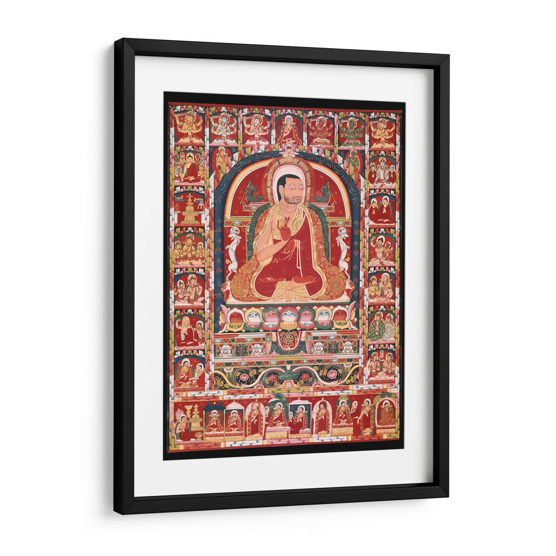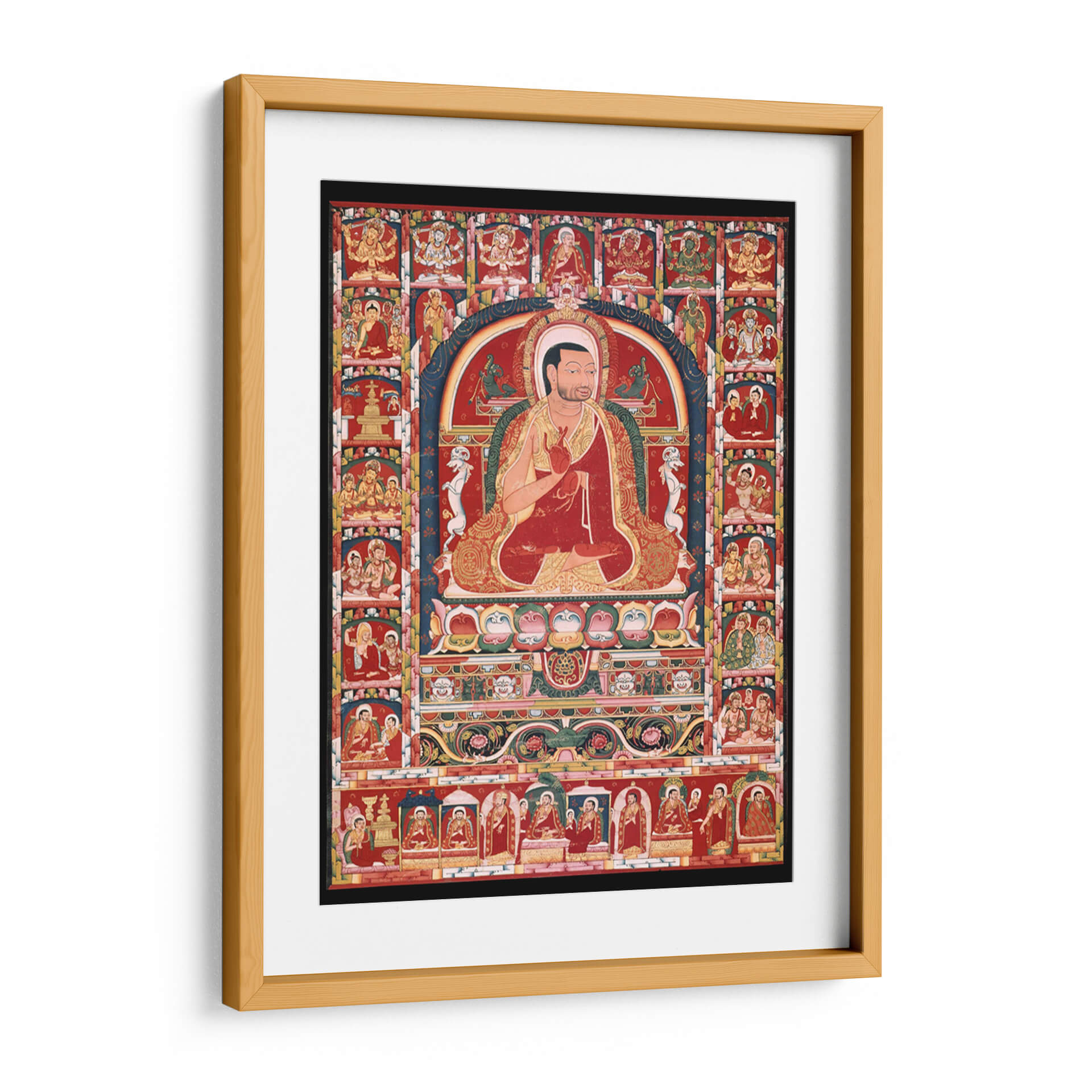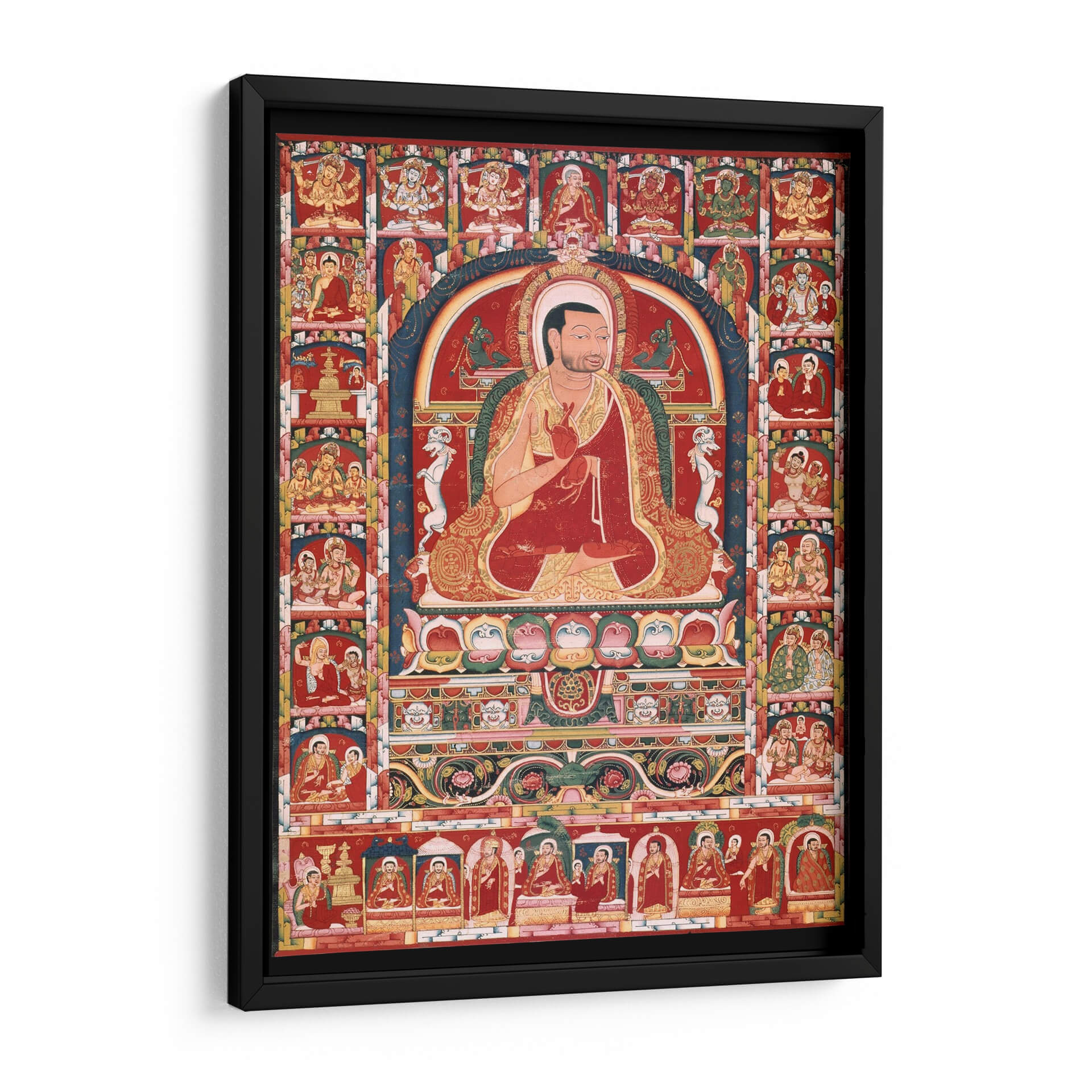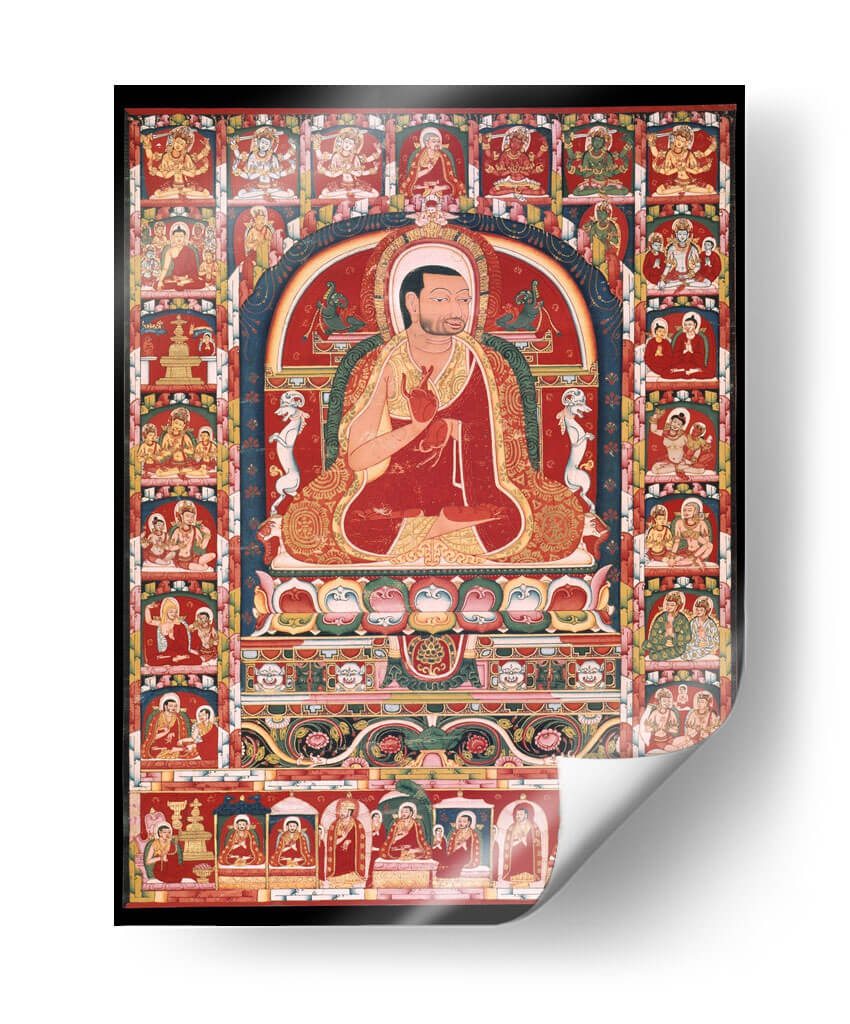 Sumérgete en la serenidad y la riqueza cultural con este evocador cuadro decorativo, inspirado en la figura de Phakmodrupa y sus episodios vitales. La obra despliega una paleta de colores vibrantes, dominada por el rojo intenso, el dorado suntuoso y acentos azules y verdes, que crean una atmósfera de profunda espiritualidad y tradición. La composición, con una figura central sentada en meditación, enmarcada por una serie de viñetas que narran historias, invita a la contemplación y al descubrimiento. Este cuadro decorativo es perfecto para quienes buscan infundir a su hogar u oficina un aire de paz, sabiduría y herencia cultural. Su detallada iconografía y su diseño intrincado lo convierten en un punto focal fascinante, ideal para espacios que buscan un toque de carácter y significado. Añade una dimensión de introspección y belleza a tu decoración con esta pieza única, que trasciende el tiempo y el espacio, ofreciendo una ventana a un mundo de devoción y arte ancestral. Su presencia en cualquier estancia es una invitación a la calma y a la reflexión, promoviendo un ambiente de tranquilidad y conexión.