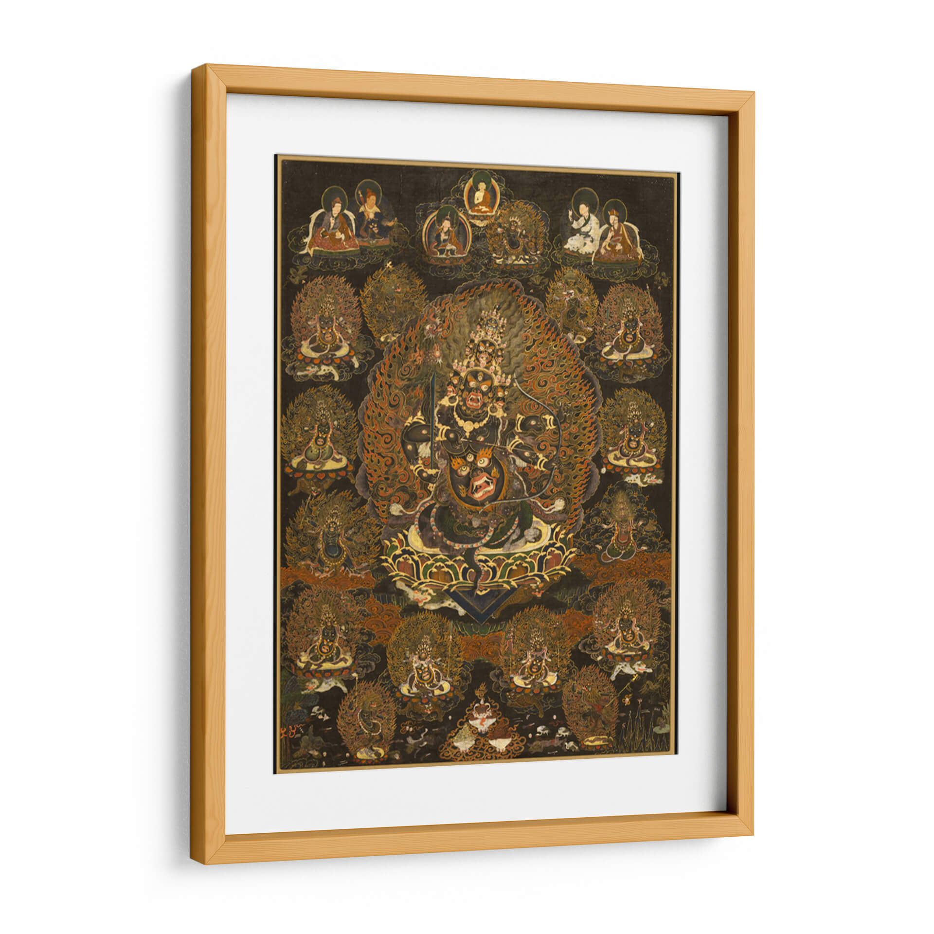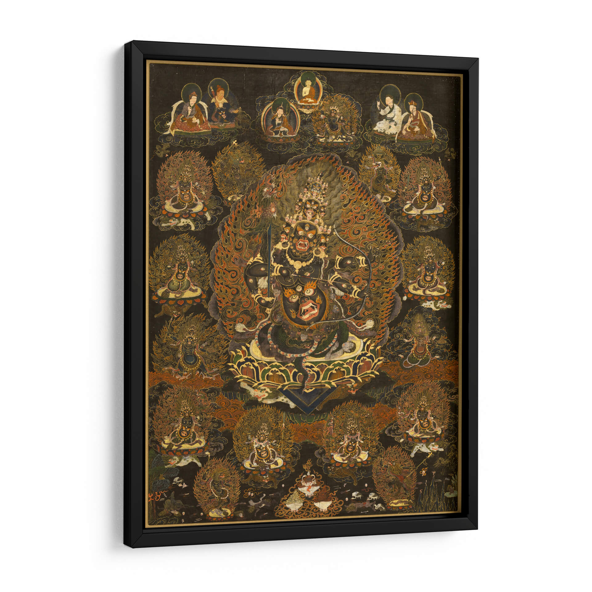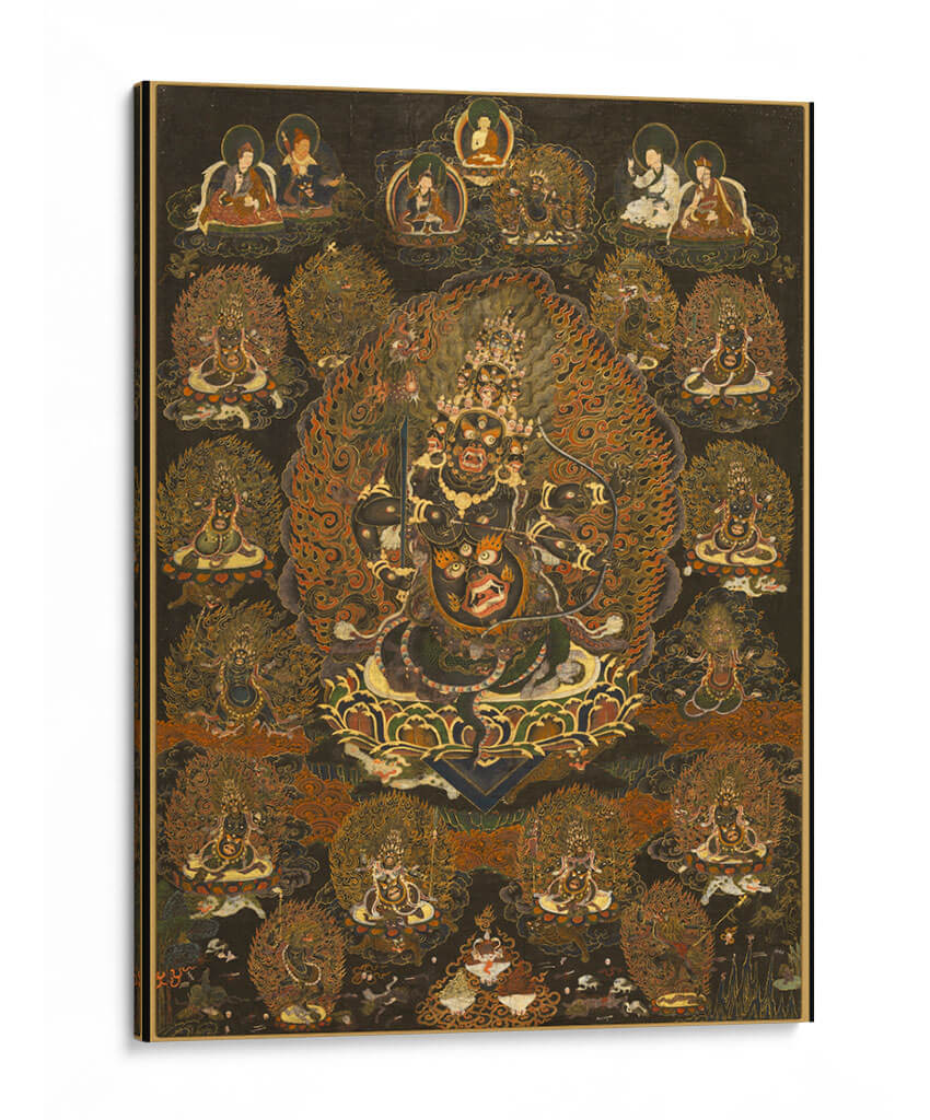 Sumérgete en la intensidad y el misticismo del cuadro decorativo 'Rahula y su Asamblea'. Esta obra de arte, de estilo tradicional y rica en simbolismo, presenta una figura central imponente rodeada por una miríada de deidades y seres celestiales, todos envueltos en una explosión de llamas doradas y detalles intrincados. La paleta de colores profundos, dominada por negros, dorados, naranjas y rojos intensos, crea una atmósfera de poder, protección y transformación espiritual. Cada figura está representada con una artesanía excepcional, invitando a la contemplación y al descubrimiento de sus historias ocultas. Ideal para aquellos que buscan infundir un sentido de energía espiritual y misterio en sus espacios, este cuadro decorativo es perfecto para salones, estudios o cualquier lugar donde se desee un punto focal dramático y lleno de significado. Su complejidad visual y su aura mística lo convierten en una pieza única para coleccionistas de arte y entusiastas de la iconografía espiritual, aportando profundidad y carácter a la decoración de interiores.