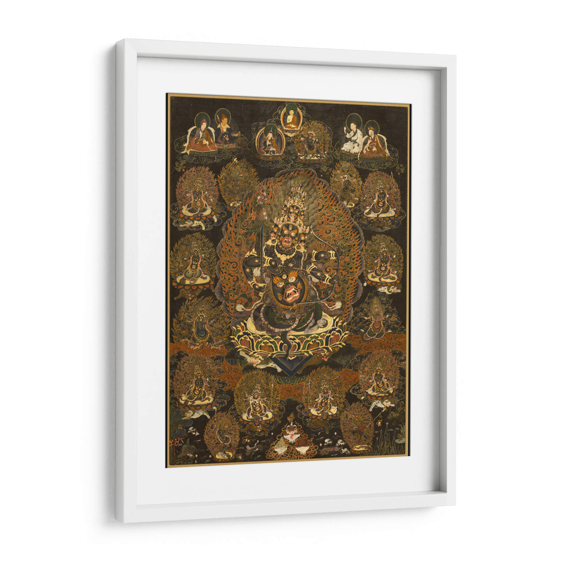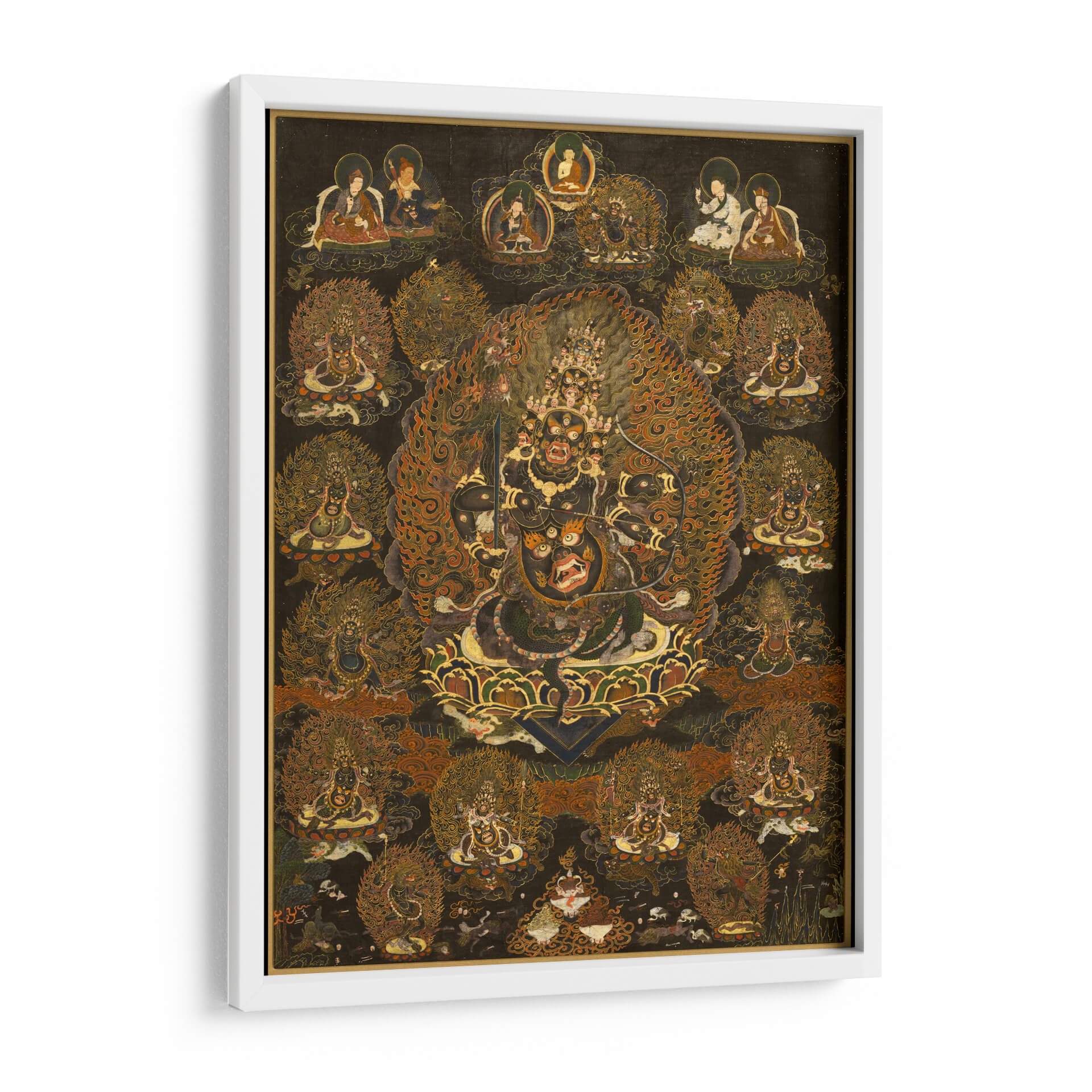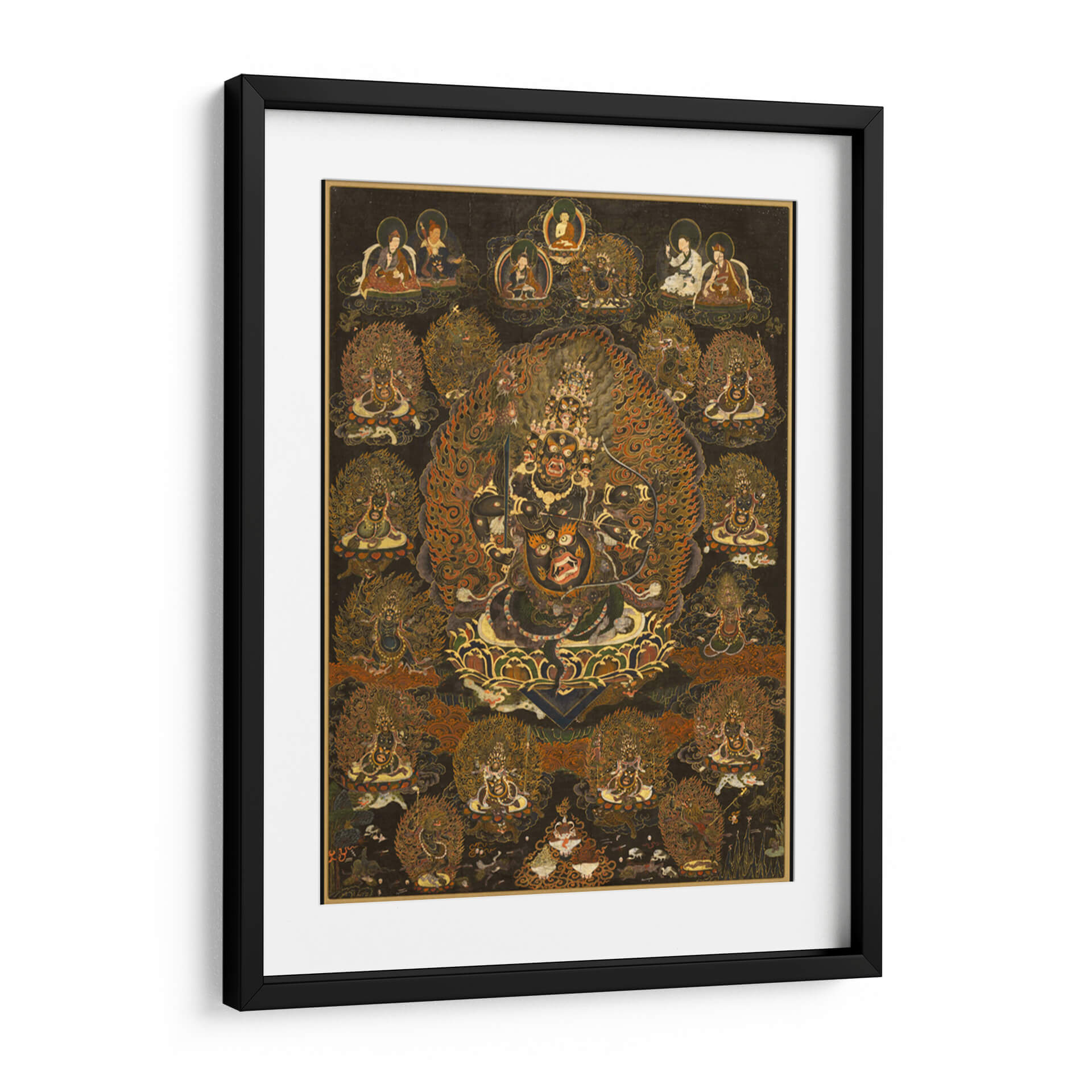 Sumérgete en la intensidad y el misticismo del cuadro decorativo 'Rahula y su Asamblea'. Esta obra de arte, de estilo tradicional y rica en simbolismo, presenta una figura central imponente rodeada por una miríada de deidades y seres celestiales, todos envueltos en una explosión de llamas doradas y detalles intrincados. La paleta de colores profundos, dominada por negros, dorados, naranjas y rojos intensos, crea una atmósfera de poder, protección y transformación espiritual. Cada figura está representada con una artesanía excepcional, invitando a la contemplación y al descubrimiento de sus historias ocultas. Ideal para aquellos que buscan infundir un sentido de energía espiritual y misterio en sus espacios, este cuadro decorativo es perfecto para salones, estudios o cualquier lugar donde se desee un punto focal dramático y lleno de significado. Su complejidad visual y su aura mística lo convierten en una pieza única para coleccionistas de arte y entusiastas de la iconografía espiritual, aportando profundidad y carácter a la decoración de interiores.