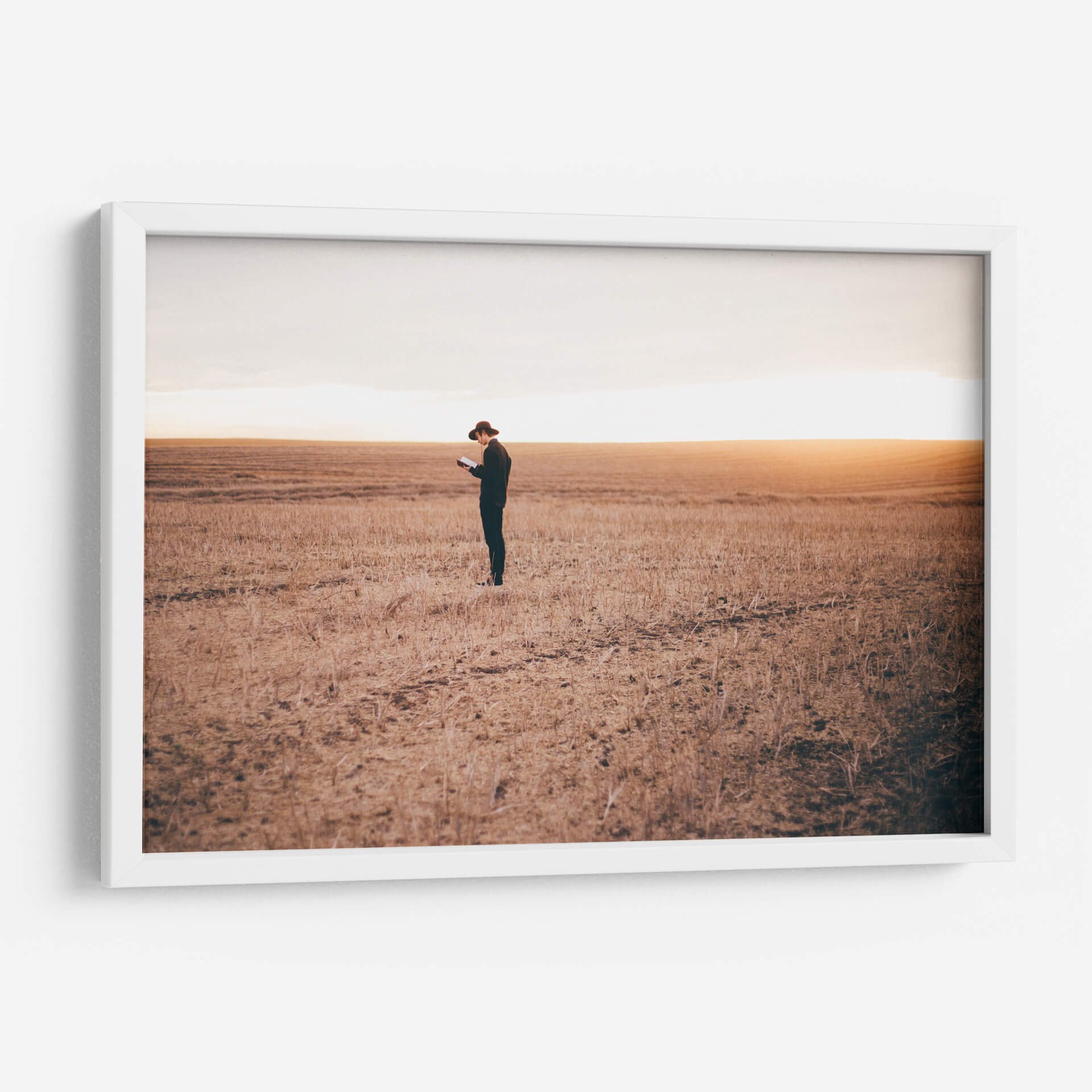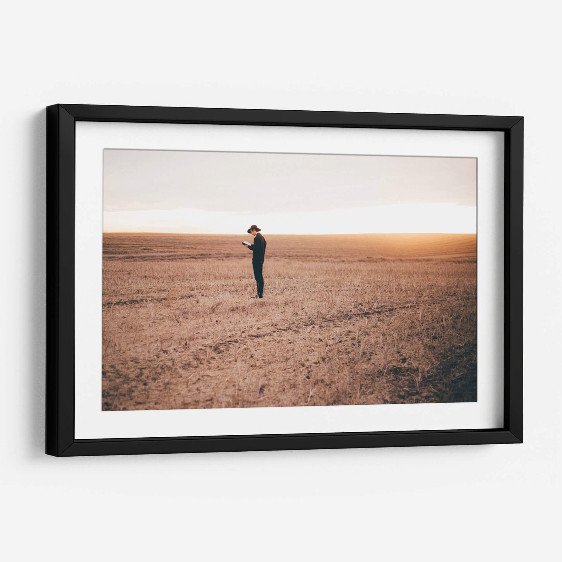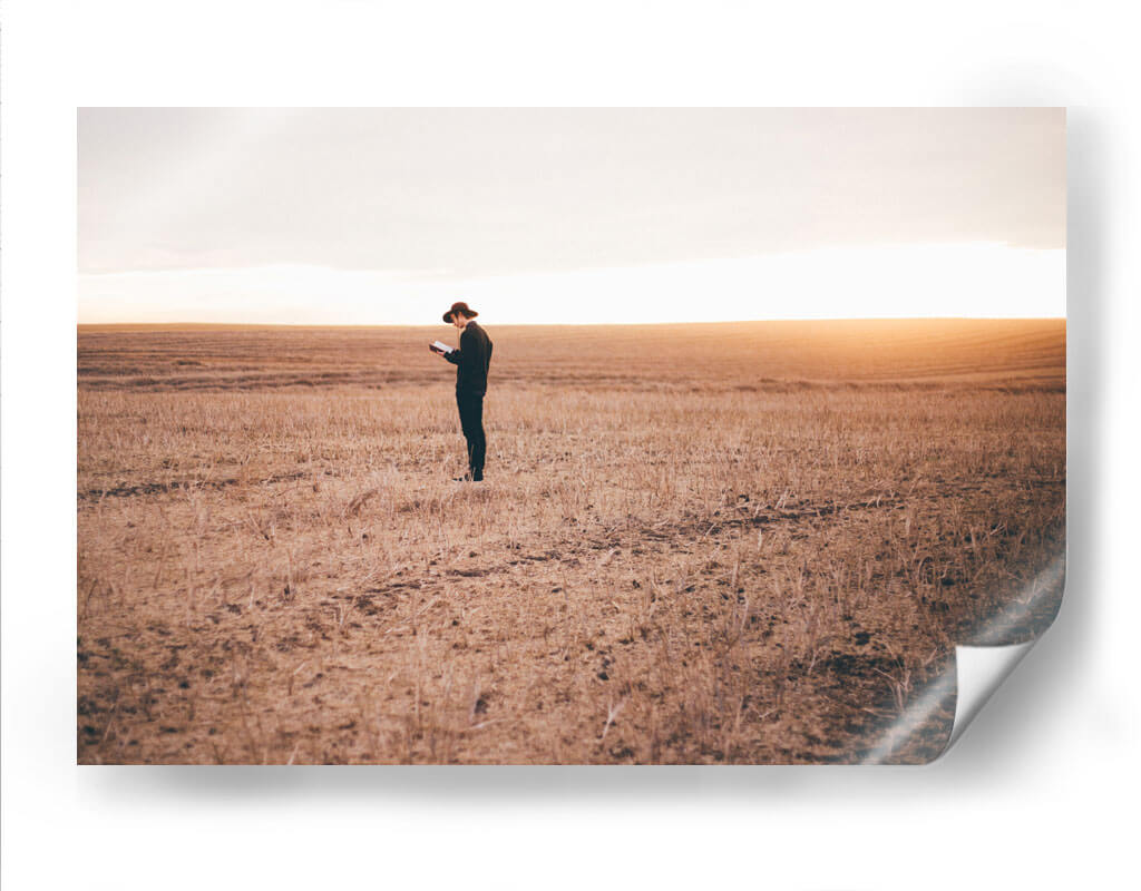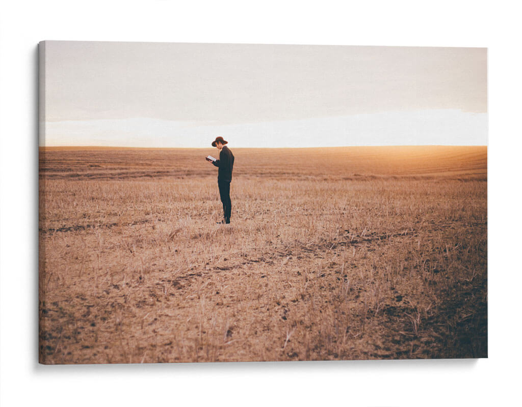 Sumérgete en la serenidad con "Un Momento Silencioso", una obra de arte que captura la esencia de la introspección y la paz en medio de un paisaje vasto. Esta pieza, que evoca una atmósfera contemplativa, presenta a una figura solitaria con sombrero, absorta en la lectura de un libro, enmarcada por un campo de tonos ocres y dorados bajo un cielo etéreo. La paleta de colores, dominada por cálidos tonos tierra y la luz suave del atardecer, crea una sensación de calma y calidez, ideal para cualquier espacio que busque un refugio de tranquilidad. El estilo fotográfico, con un enfoque sutilmente desaturado, realza la textura del terreno y la figura central, invitando a la reflexión. Este cuadro decorativo es perfecto para añadir un toque de sofisticación y profundidad a tu sala de estar, dormitorio o estudio. Su composición minimalista y temática universal lo convierten en una adición atemporal para tu decoración de pared, inspirando momentos de quietud y conexión personal. Deja que "Un Momento Silencioso" transforme tu hogar en un santuario de paz.