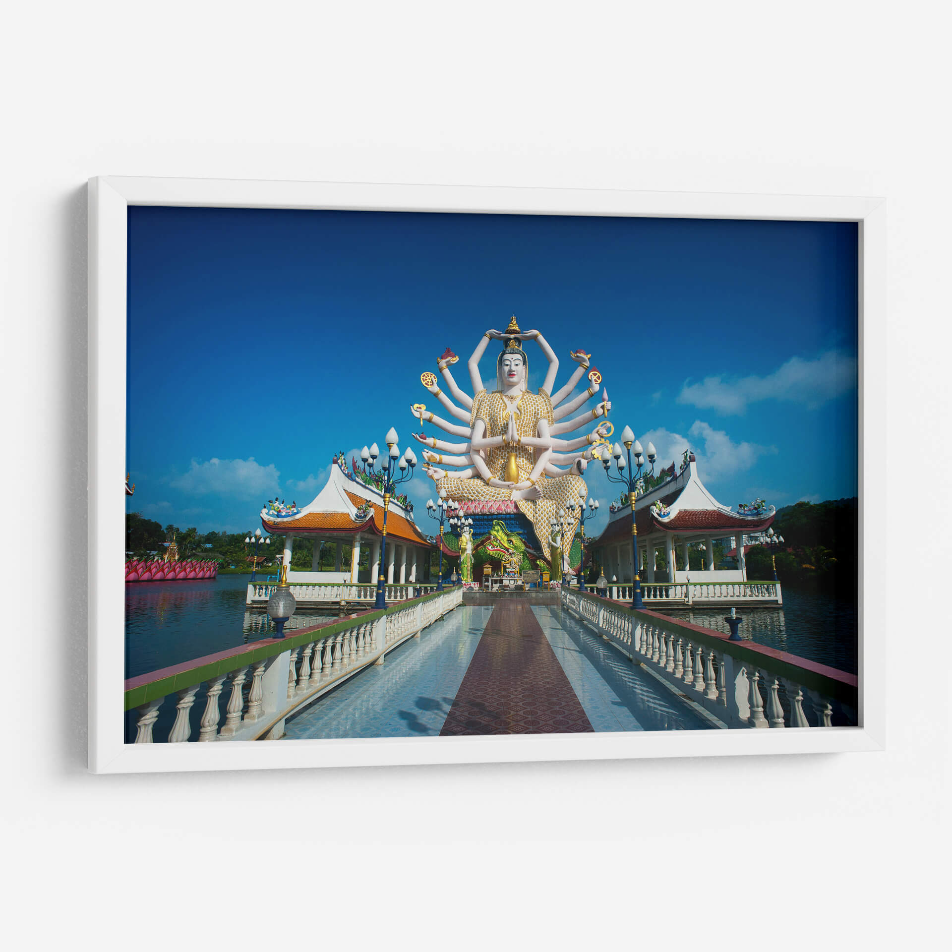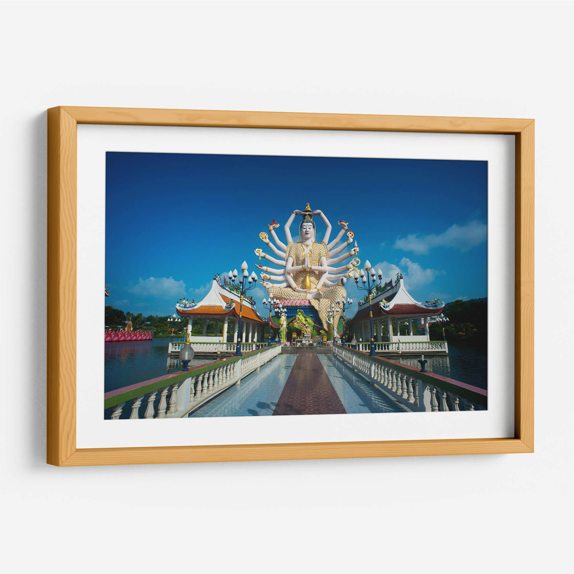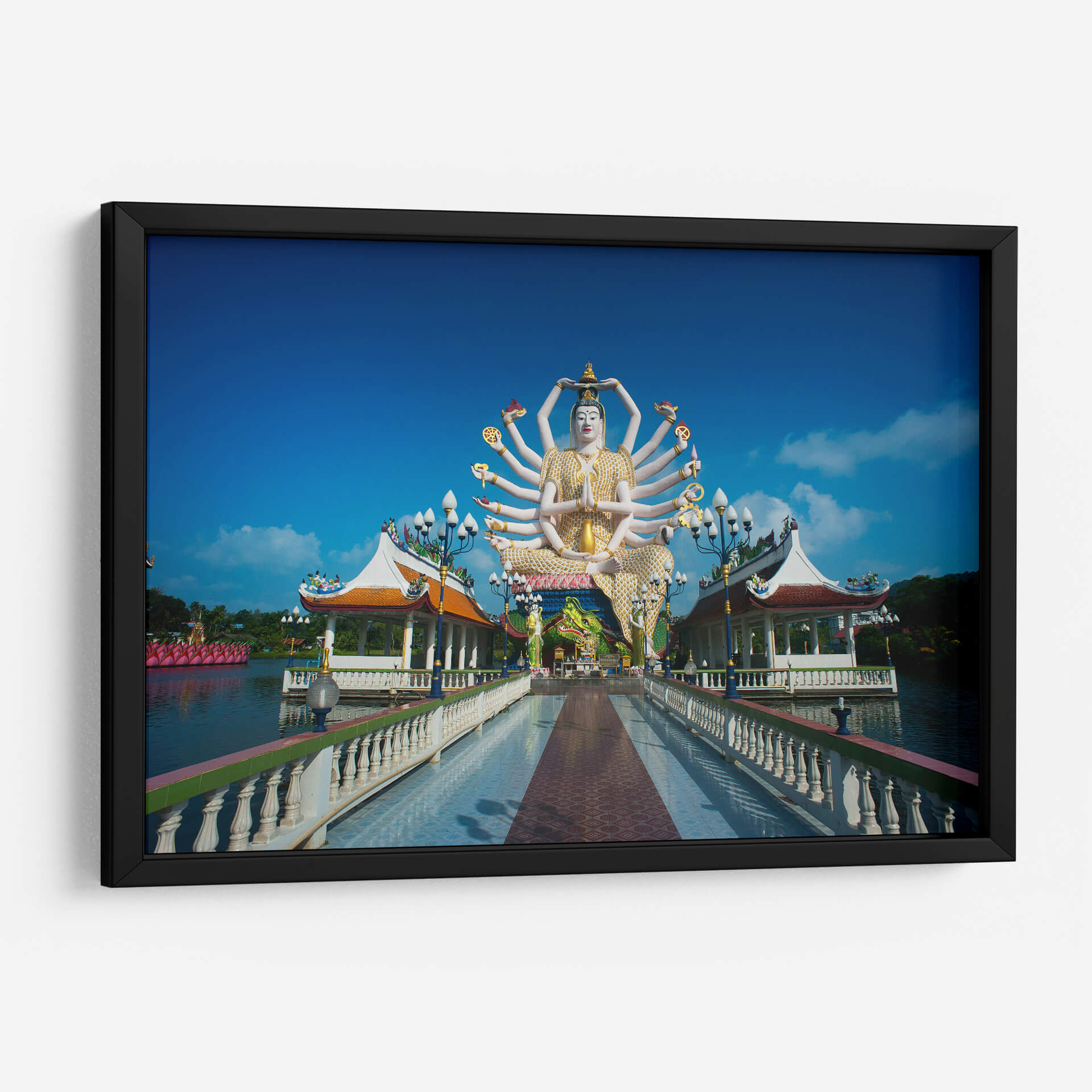 Sumérgete en la serenidad y el esplendor espiritual con este cautivador cuadro decorativo que representa el templo Wat Plai Laem. La obra captura la majestuosidad de una imponente estatua con múltiples brazos, un símbolo de poder y compasión, posada sobre un sereno cuerpo de agua bajo un cielo azul vibrante y salpicado de nubes. La arquitectura detallada de los pabellones circundantes, junto con la exuberante vegetación al fondo, crea una atmósfera de tranquilidad y asombro. Los colores vivos, especialmente los azules intensos del cielo y el agua, contrastan armoniosamente con los tonos dorados y blancos de la figura central, aportando una sensación de calma y elevación. Este cuadro es ideal para añadir un toque de paz y espiritualidad a tu hogar u oficina, sirviendo como un recordatorio constante de la belleza y la contemplación. Su composición escenográfica lo convierte en una pieza focal perfecta para salas de estar, espacios de meditación o cualquier lugar donde se desee infundir una sensación de armonía y cultura asiática. Transforma tu espacio con esta obra maestra inspiradora que evoca viajes exóticos y momentos de reflexión profunda.