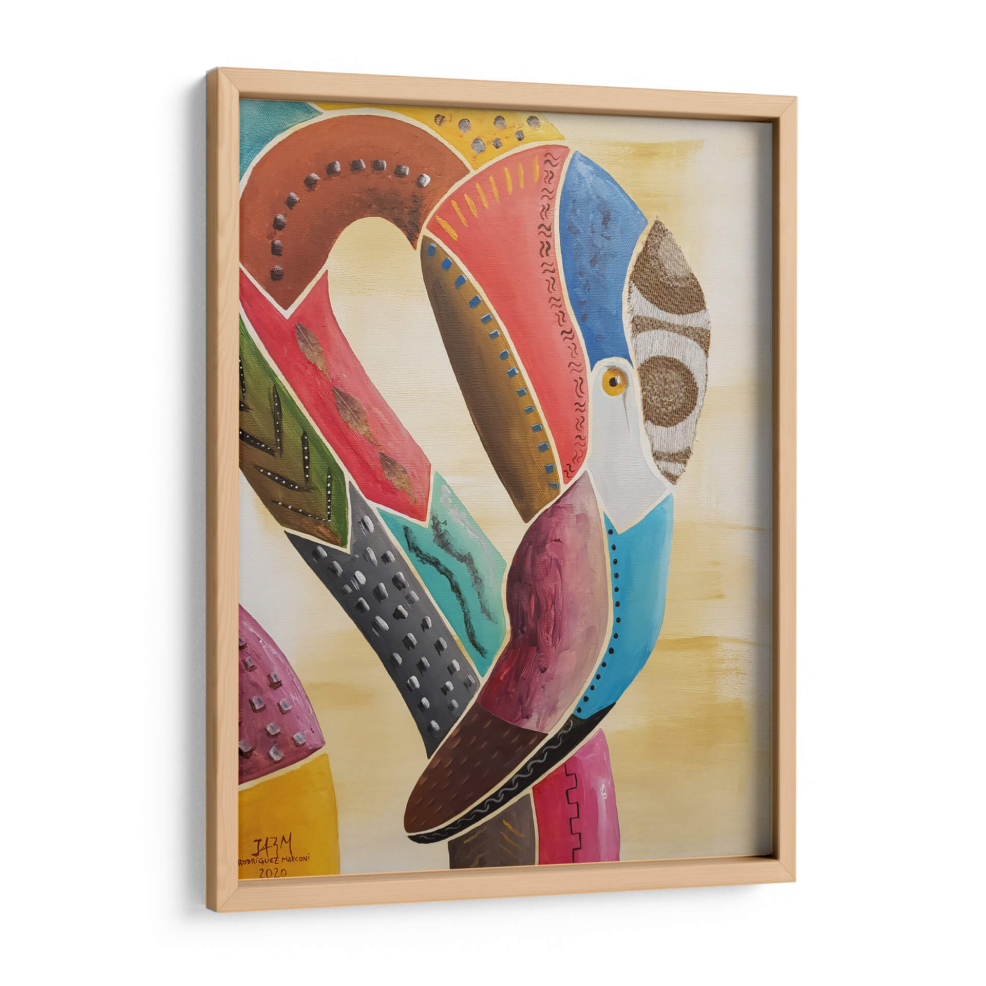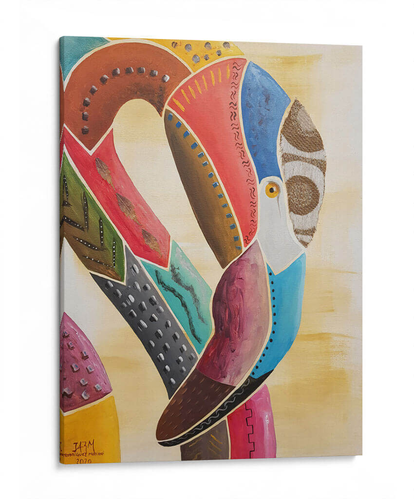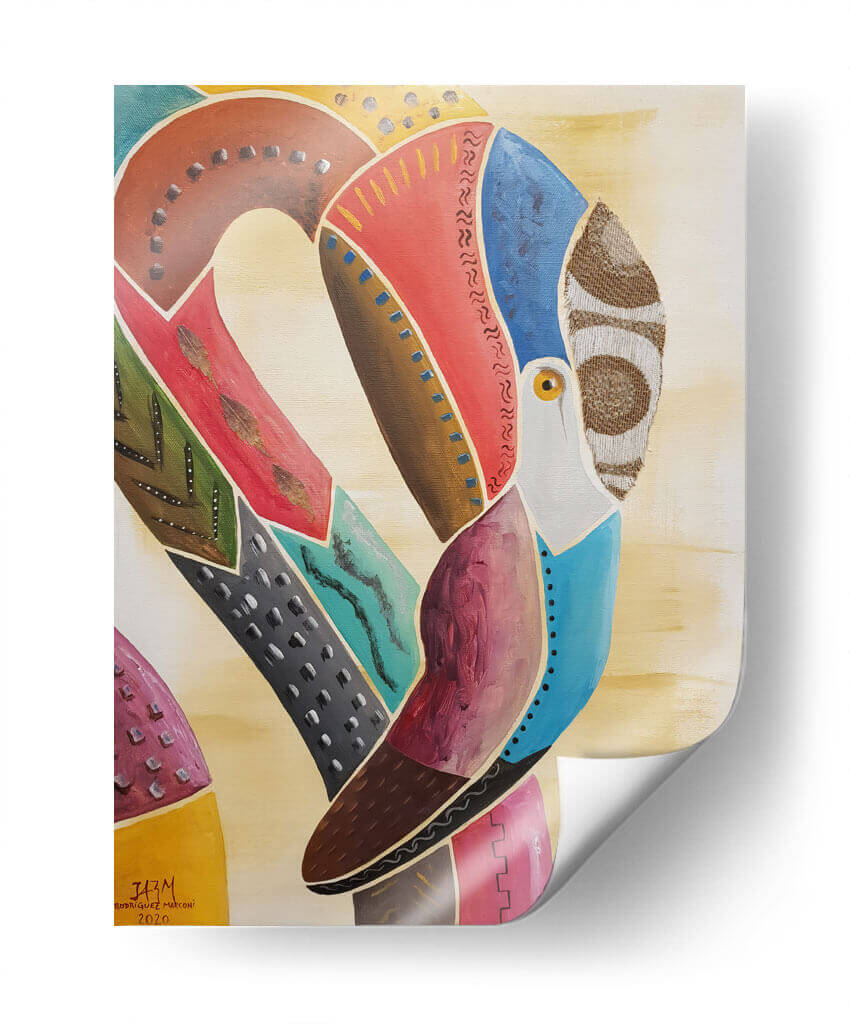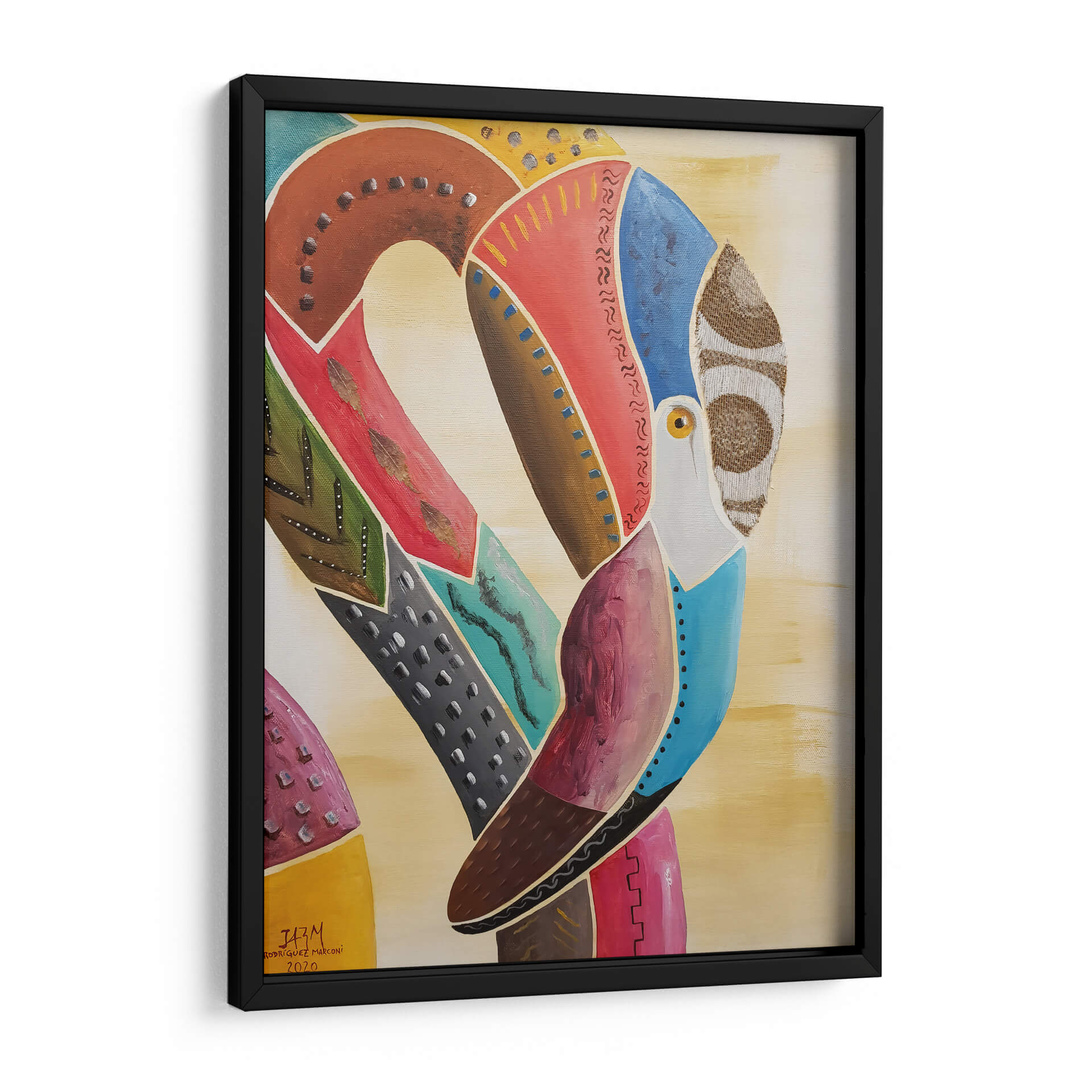 Sumérgete en la vibrante y estilizada representación del "Flamenco I" de Rodríguez Marconi, una obra de arte decorativo que irradia personalidad y un toque de modernidad. Esta pieza cautiva con su audaz abstracción geométrica y una paleta de colores rica y variada, donde predominan los tonos cálidos y terrosos complementados por toques de azul, rojo y verde. La composición se centra en la figura icónica de un flamenco, descompuesta en formas y texturas que invitan a la contemplación. Cada sección de la obra presenta patrones intrincados y líneas definidas, creando un ritmo visual dinámico que atrae la mirada. Los detalles, como los puntos y las ondas, añaden una dimensión lúdica y artesanal. El fondo, con su suave gradiente de color arena, permite que el flamenco destaque y se convierta en el punto focal de cualquier estancia. Este cuadro decorativo es perfecto para añadir un acento de color y sofisticación a salones modernos, oficinas o incluso dormitorios, aportando una energía sutil pero enérgica. Ideal para quienes buscan una decoración de pared que sea a la vez llamativa y elegante, "Flamenco I" es una expresión artística que dialoga con el espacio, invitando a la conversación y al disfrute estético. Añade esta pieza única a tu colección y transforma tu hogar en una galería personal.