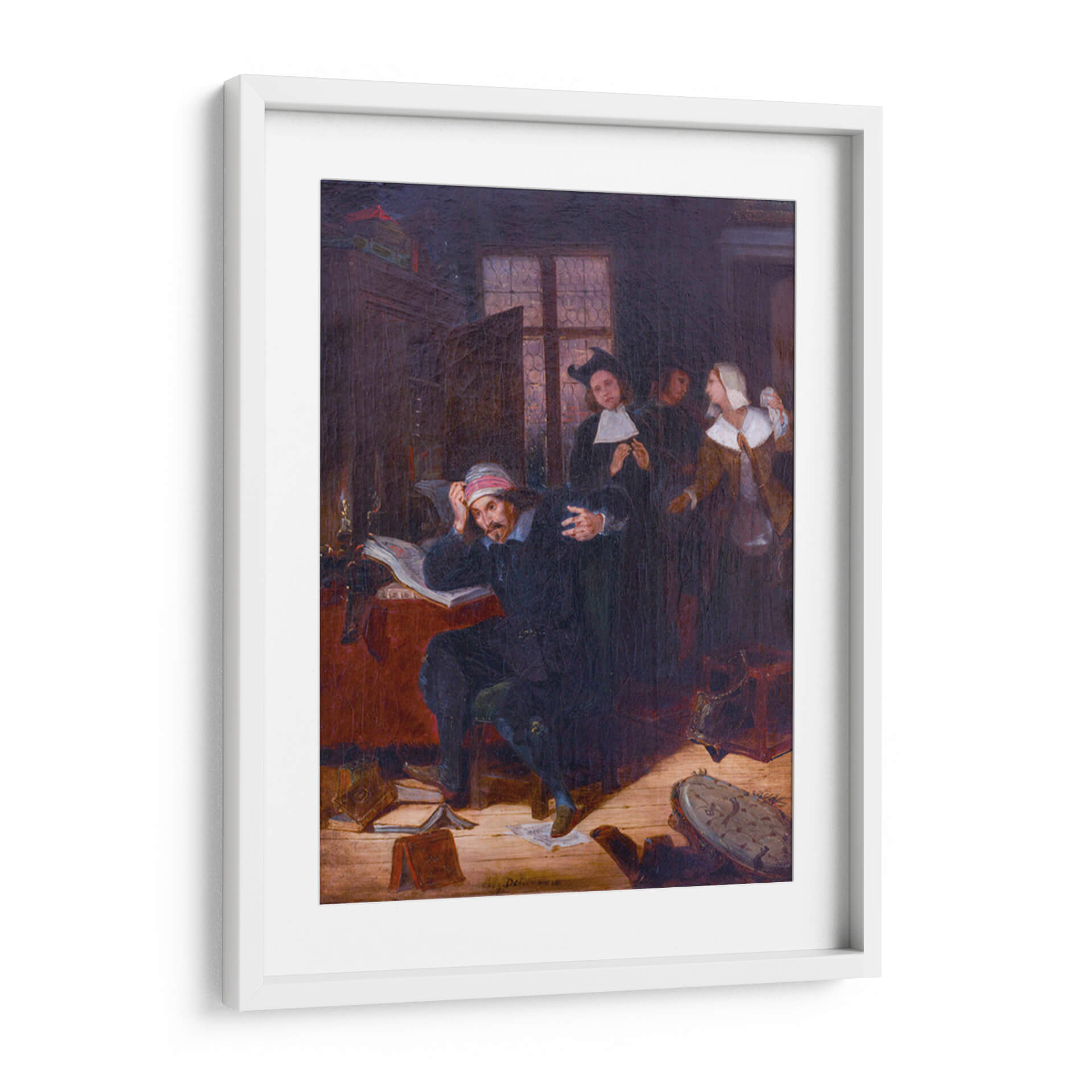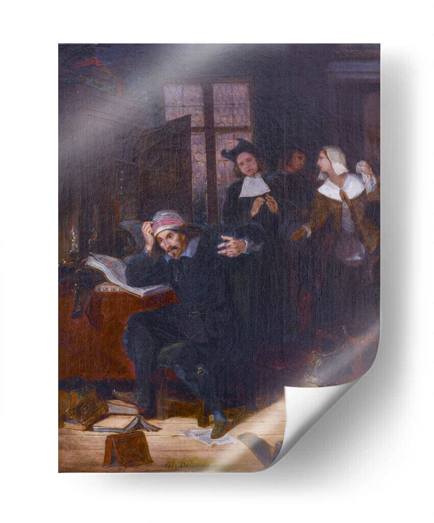 Sumérgete en la atmósfera intelectual y melancólica de "Don Quijote en su biblioteca", una obra maestra de Eugène Delacroix que captura un momento de profunda reflexión. Este cuadro decorativo transporta al espectador a un estudio íntimo, rebosante de libros y con una iluminación tenue que acentúa la introspección del personaje principal. Delacroix utiliza una paleta de colores oscuros y ricos, dominada por marrones profundos, azules y toques de luz que crean un ambiente de estudio y misterio. La composición, centrada en la figura absorta de Don Quijote, invita a la contemplación sobre la naturaleza de la imaginación y la realidad. Las figuras secundarias en el fondo, sutilmente representadas, añaden profundidad y sugieren un mundo exterior que contrasta con la inmersión del protagonista en sus pensamientos. Ideal para quienes buscan infundir un aire de cultura clásica y profundidad emocional a su hogar u oficina, este cuadro es perfecto para salas de lectura, estudios o cualquier espacio donde se aprecie la introspección y la conexión con la literatura y el arte. Añade un toque de sofisticación y un punto de partida para conversaciones fascinantes con esta pieza de arte inspiradora.