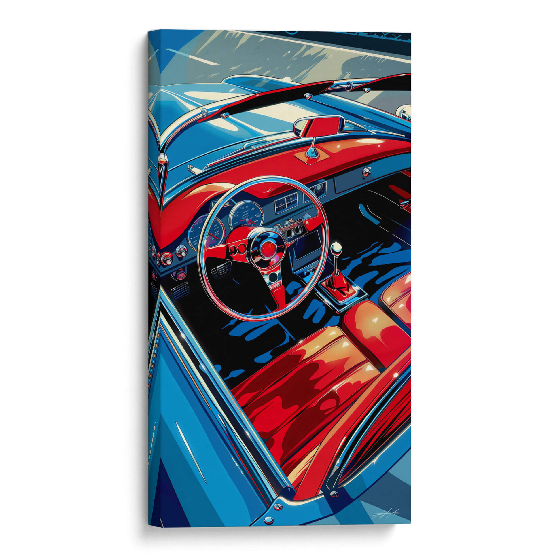 Adéntrate en el vibrante mundo del automovilismo clásico con "Pop Life - Drive", una obra de arte digital que captura la esencia de la velocidad y el estilo. Este cuadro decorativo presenta una vista inmersiva del interior de un coche deportivo retro, destacando el volante icónico y los asientos de cuero en un audaz contraste de rojos y azules intensos. La paleta de colores, dominada por azules eléctricos y rojos carmesí, evoca una sensación de energía, nostalgia y pura adrenalina, mientras que las líneas nítidas y el estilo gráfico aportan un toque moderno y audaz. "Pop Life - Drive" es ideal para espacios que buscan un toque de carácter y dinamismo, como salas de estar, estudios o incluso oficinas. Su composición dinámica invita a soñar con carreteras abiertas y aventuras sin fin, convirtiéndose en un punto focal que inspira conversaciones y admiración. Transforma tu entorno con esta pieza que celebra la libertad y la estética atemporal del diseño automotriz.