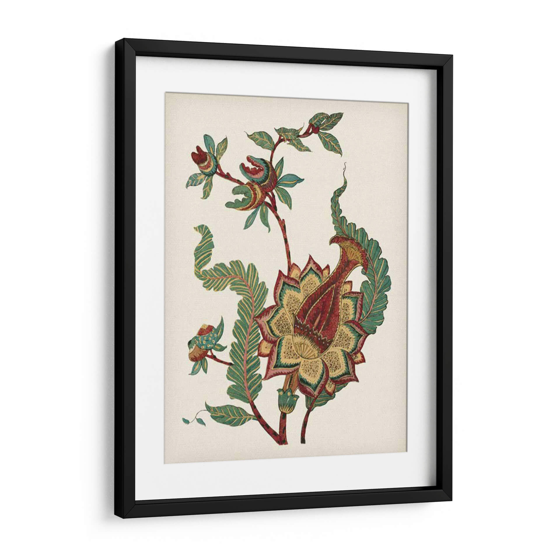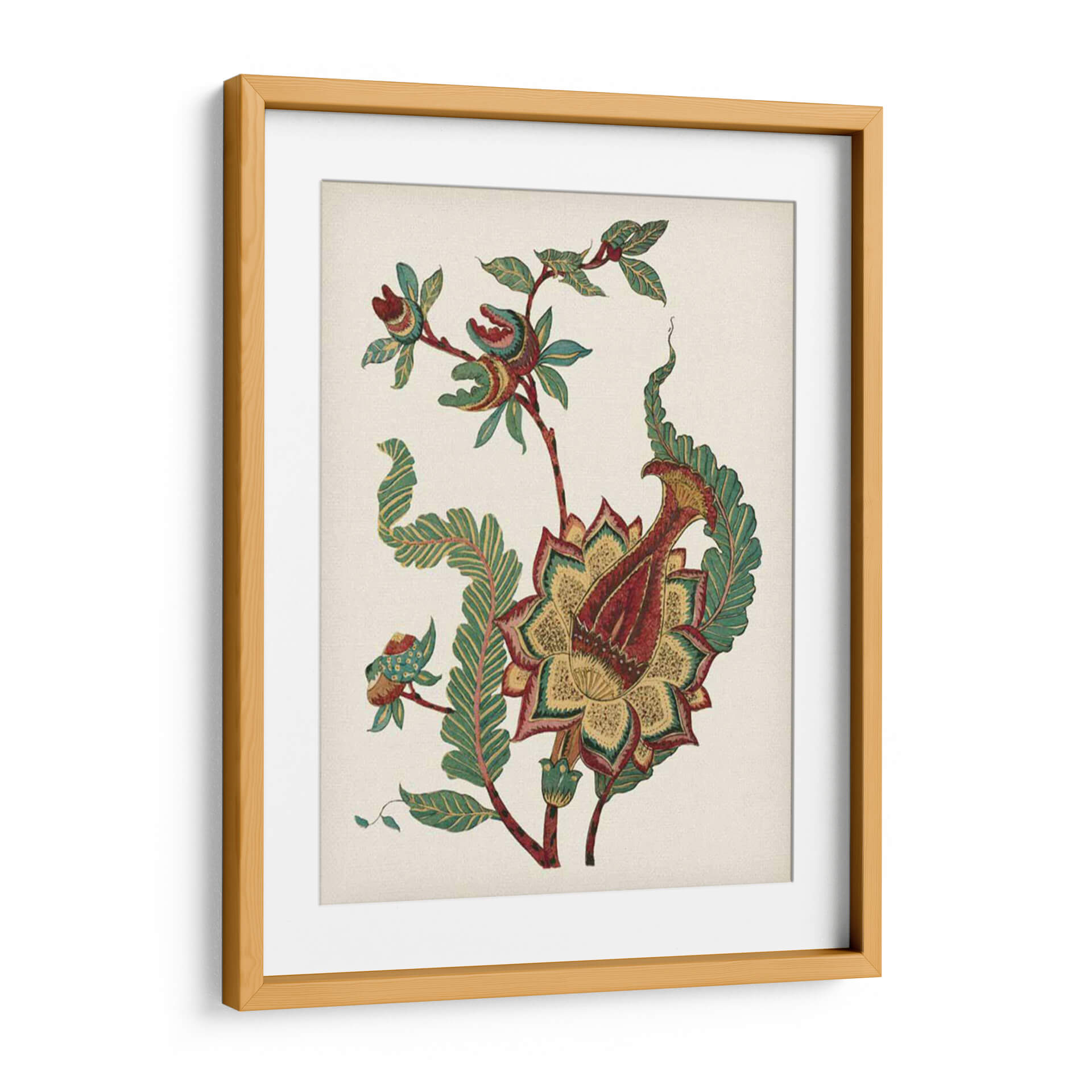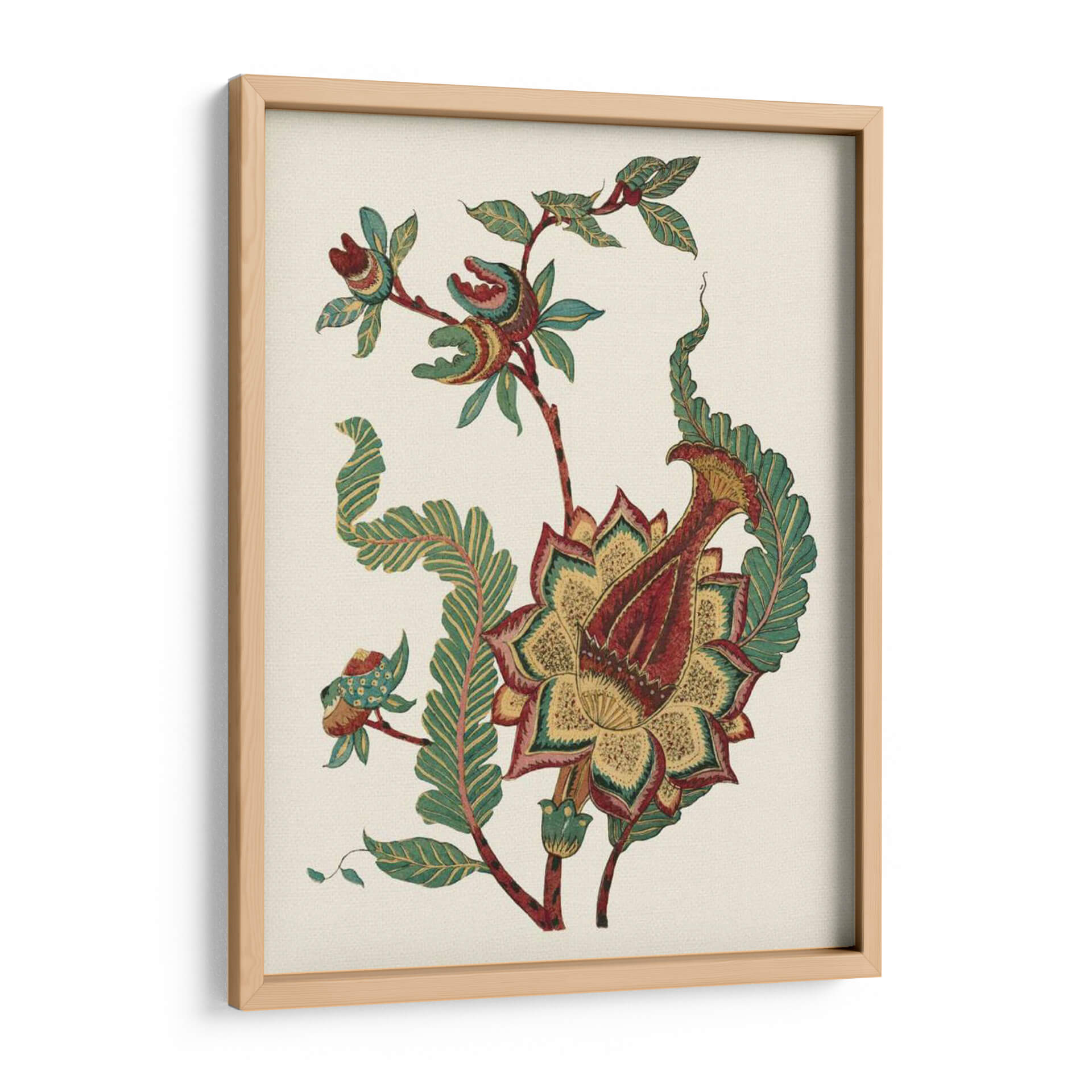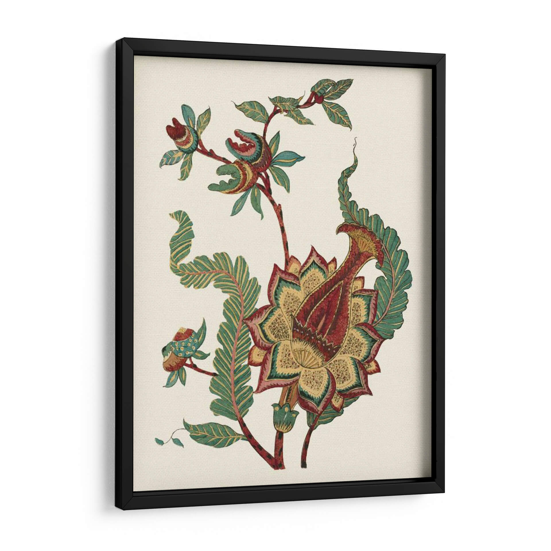 Sumérgete en la elegancia atemporal de "Pequeño Floral Jacobeano I", una obra de arte que evoca la sofisticación de los diseños botánicos clásicos con un toque contemporáneo. Esta pieza visualmente cautivadora presenta una intrincada flor central, detallada con pétalos en ricos tonos de rojo, amarillo ocre y verde esmeralda, rodeada por delicadas hojas y tallos que danzan con gracia sobre un fondo neutro y texturizado. La composición, que recuerda a los patrones textiles históricos, aporta una sensación de calma y refinamiento, ideal para transformar cualquier espacio en un oasis de serenidad. Su estilo detallado y su paleta de colores cuidadosamente seleccionada la convierten en un punto focal exquisito para salones, comedores o estudios que buscan añadir un toque de distinción y naturaleza estilizada. "Pequeño Floral Jacobeano I" no es solo una decoración, es una invitación a la contemplación y a la apreciación de la belleza en sus formas más puras, un cuadro decorativo que aportará carácter y un aire de sofisticación artística a tu hogar u oficina, resonando con quienes valoran el diseño detallado y la estética clásica renovada. Su presencia añadirá profundidad y un encanto sutil a tu decoración.
