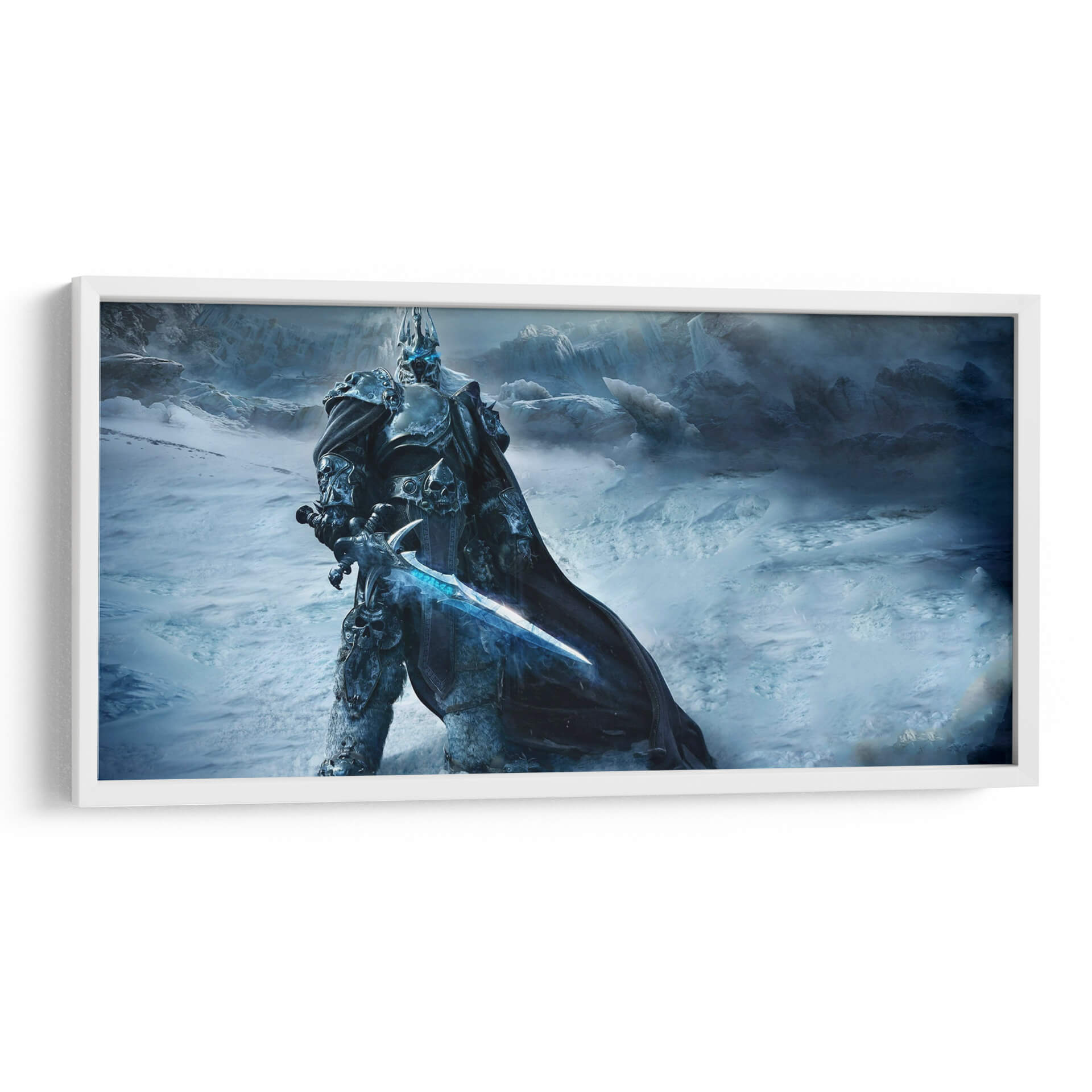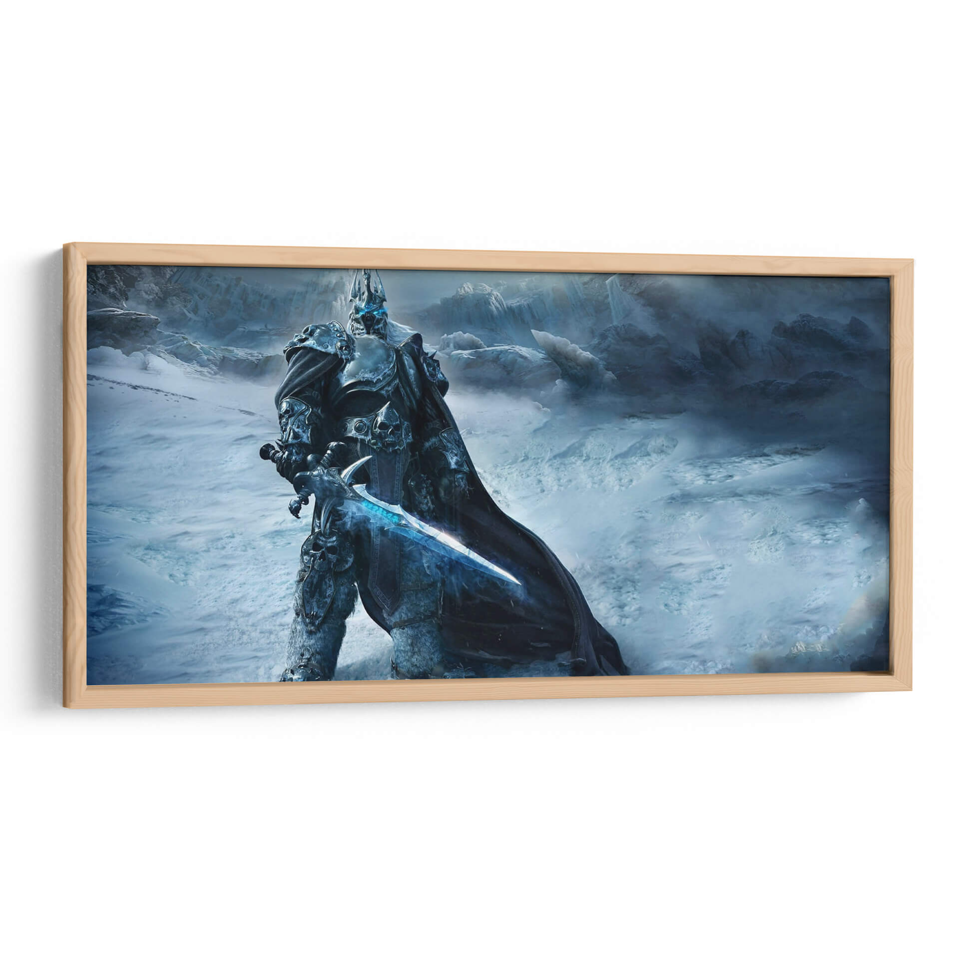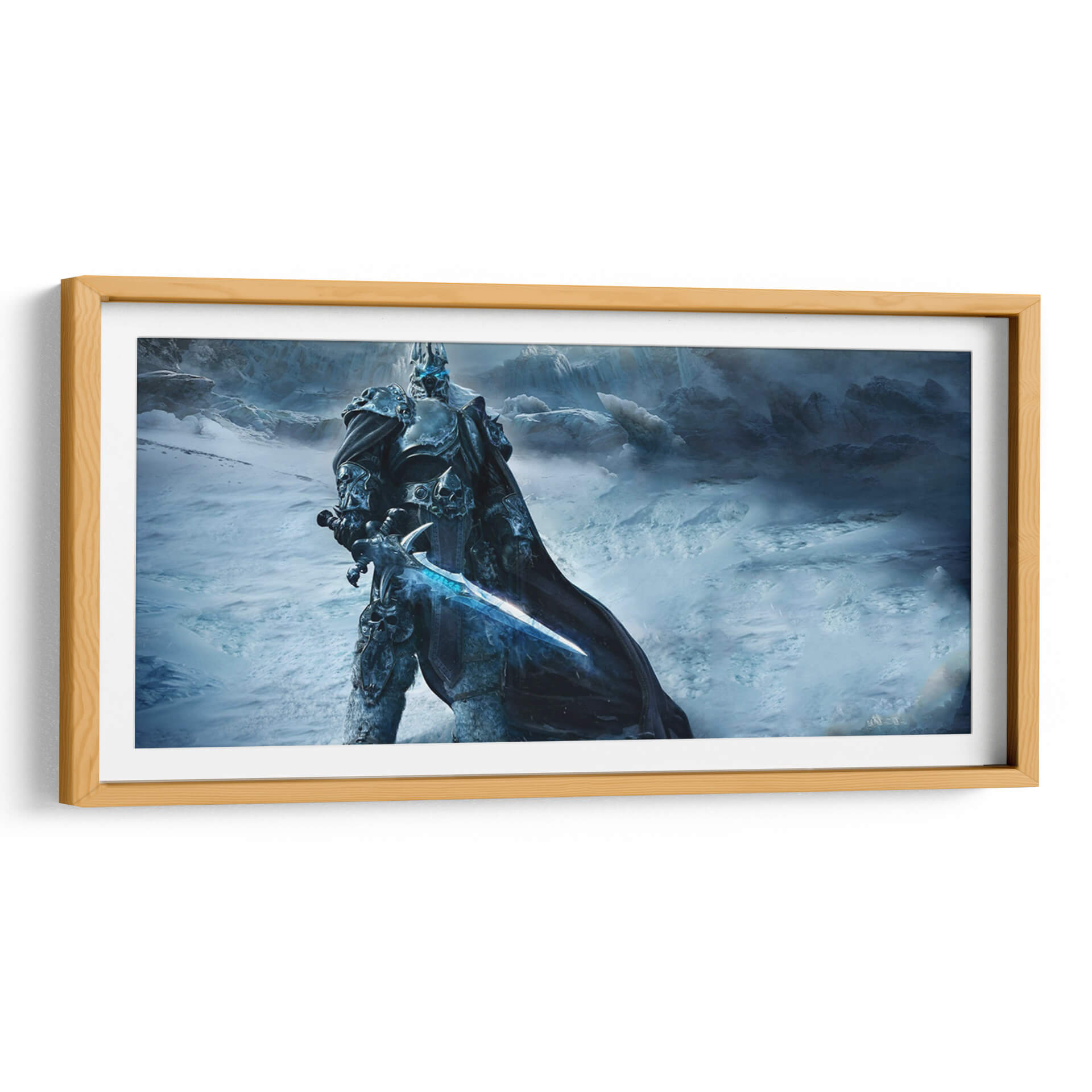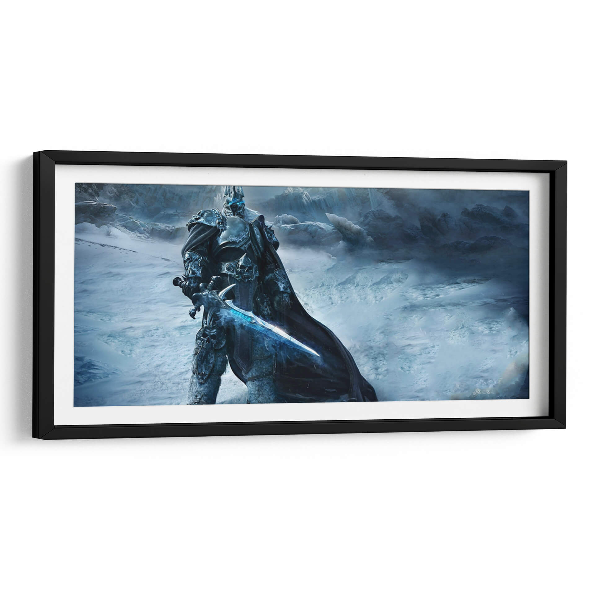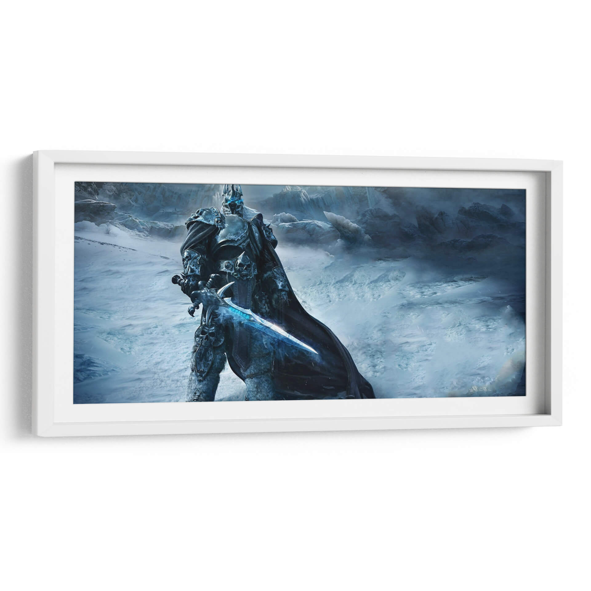 Sumérgete en la majestuosidad gélida y el poder innegable con este impactante cuadro decorativo 'Wrath of the Lich King'. La obra captura la imponente figura de un guerrero con armadura oscura, empuñando una espada brillante que emana una luz azul etérea, todo ello enmarcado por un paisaje nevado y brumoso de tonos fríos. Los detalles intrincados de la armadura, las calaveras adornando su vestimenta y la atmósfera misteriosa del entorno crean una pieza de arte de pared que evoca fuerza, dominio y un toque de fantasía épica. La paleta de colores, dominada por azules profundos, grises gélidos y blancos puros, junto con el contraste de la luz azul de la espada, confiere a la obra una presencia dramática y cautivadora. Ideal para espacios que buscan un punto focal audaz y con carácter, como una sala de estar moderna, un despacho o incluso una zona de entretenimiento. Este cuadro decorativo es perfecto para los amantes de la fantasía épica, los videojuegos o para aquellos que buscan añadir una dosis de poder y misterio a su decoración.