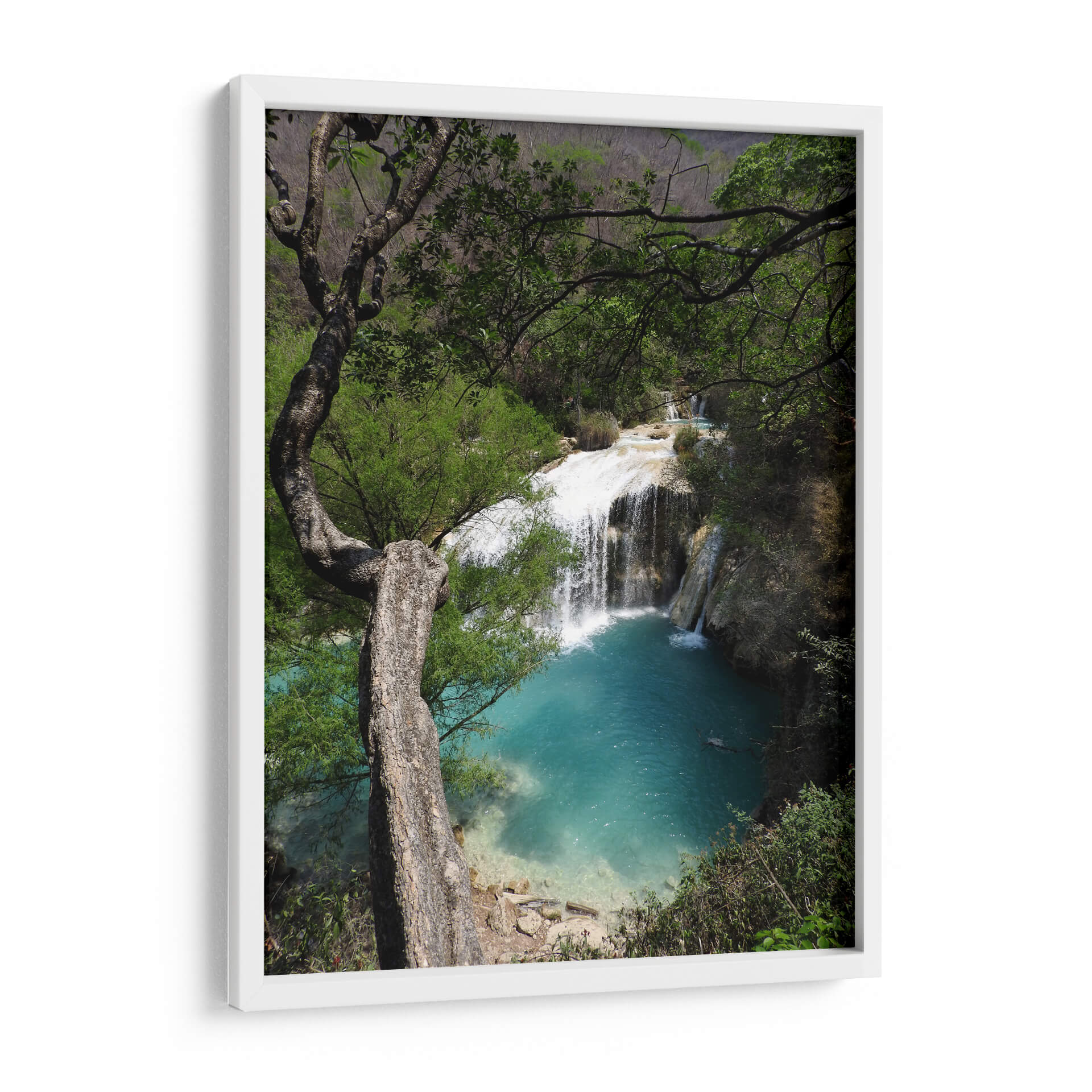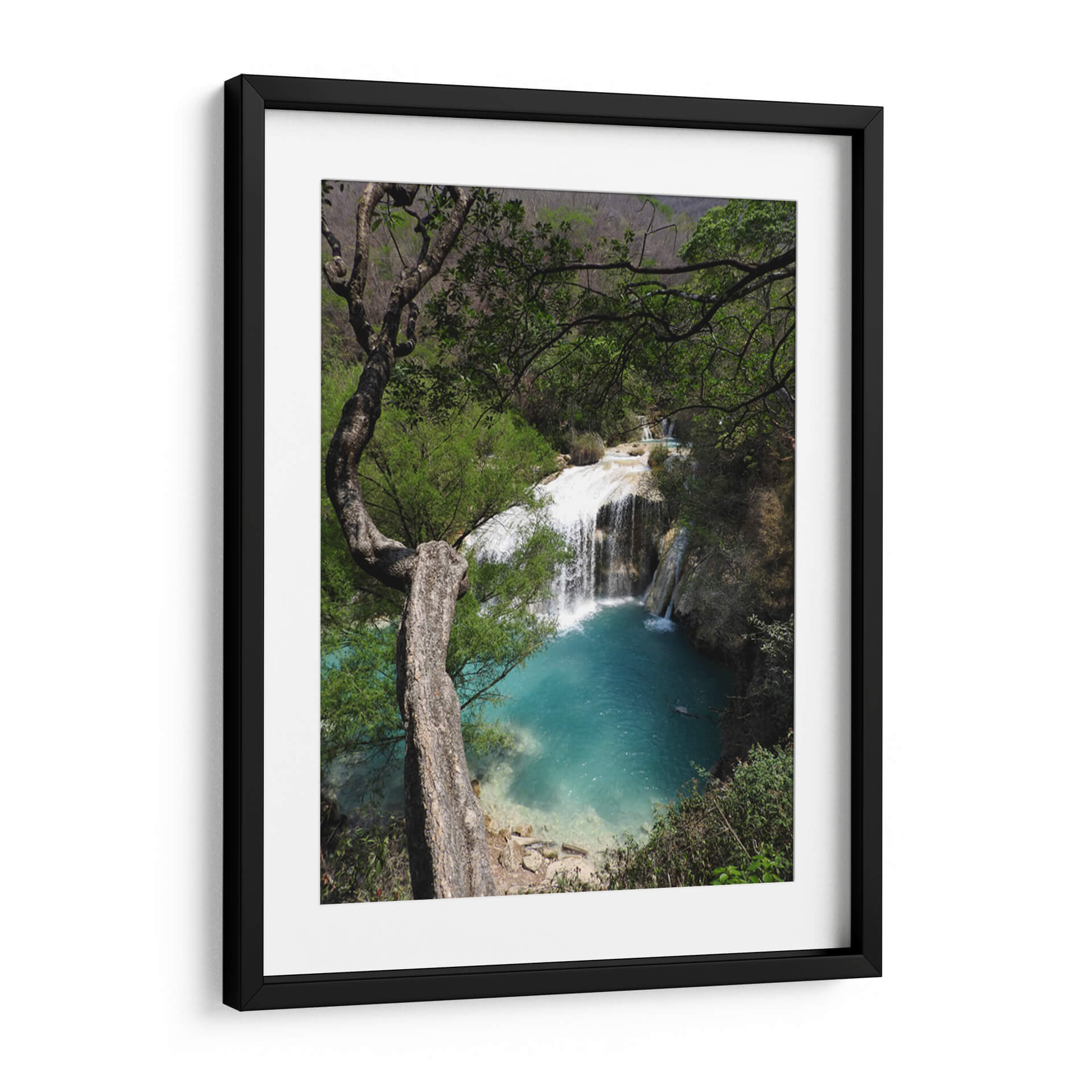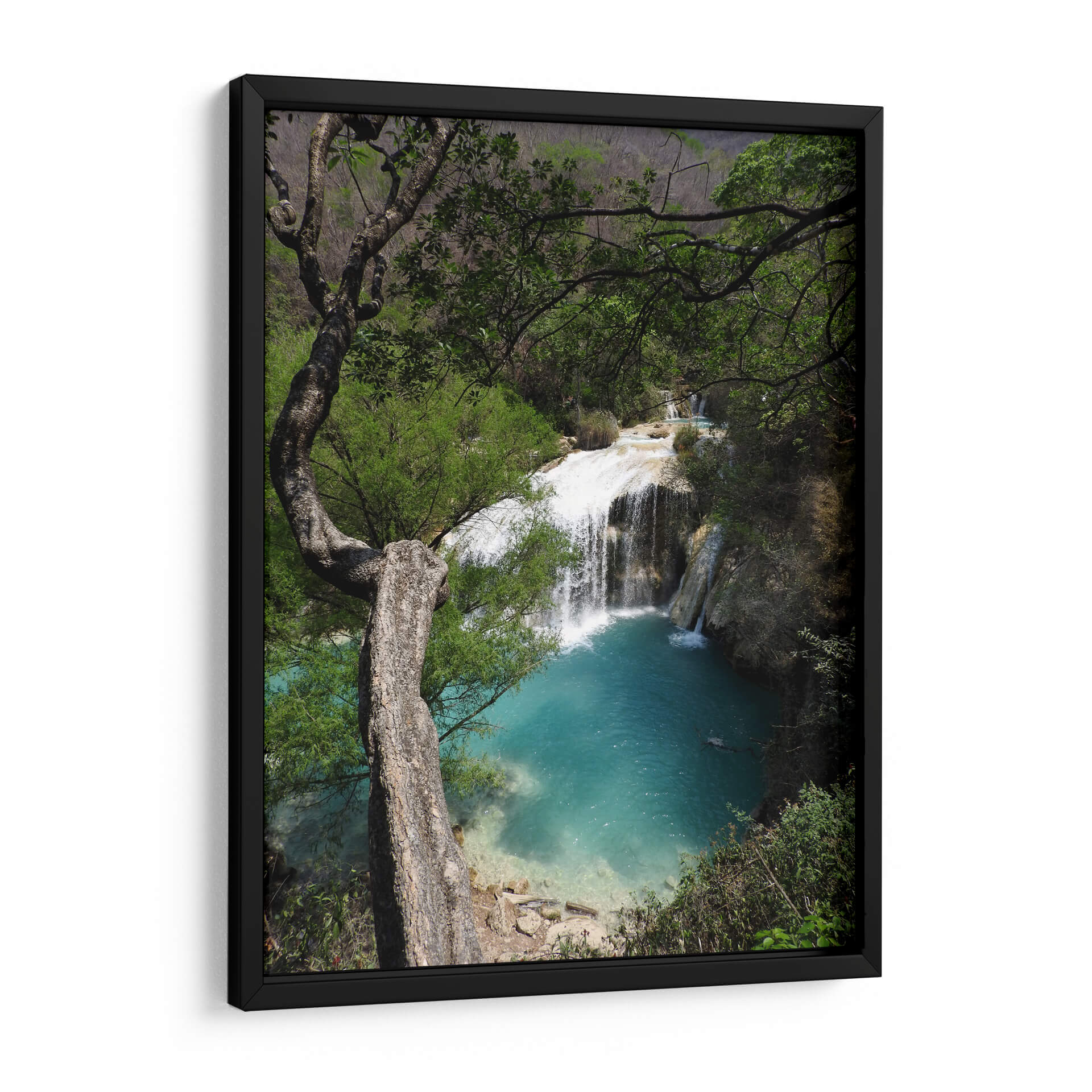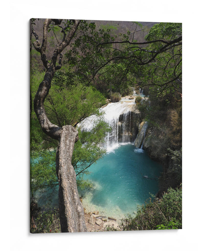 Sumérgete en la serenidad de la naturaleza con este cautivador cuadro decorativo que captura la majestuosidad de "Abajo", una obra del artista Hugo Segura. La imagen te transporta a un rincón paradisíaco donde una cascada cristalina se desploma en una poza de vibrante color turquesa, rodeada por exuberante vegetación y la imponente presencia de un árbol retorcido. La paleta de colores, dominada por los tonos verdes intensos de la selva y los azules profundos del agua, crea una atmósfera de paz y frescura. La composición, con el árbol actuando como un marco natural, dirige la mirada hacia el hipnótico movimiento del agua y el contraste entre la fuerza de la caída y la calma del estanque. Este cuadro decorativo es perfecto para infundir una sensación de tranquilidad y conexión con la naturaleza en tu hogar u oficina. Ideal para salones, dormitorios o estudios que busquen un toque de escapismo y belleza natural. "Abajo" no es solo una pieza de arte, sino una ventana a la armonía del mundo natural, invitando a la contemplación y al relax. Añade esta obra maestra a tu colección y transforma tu espacio en un oasis de calma visual y espiritual, una representación auténtica de la serenidad que solo la naturaleza puede ofrecer.