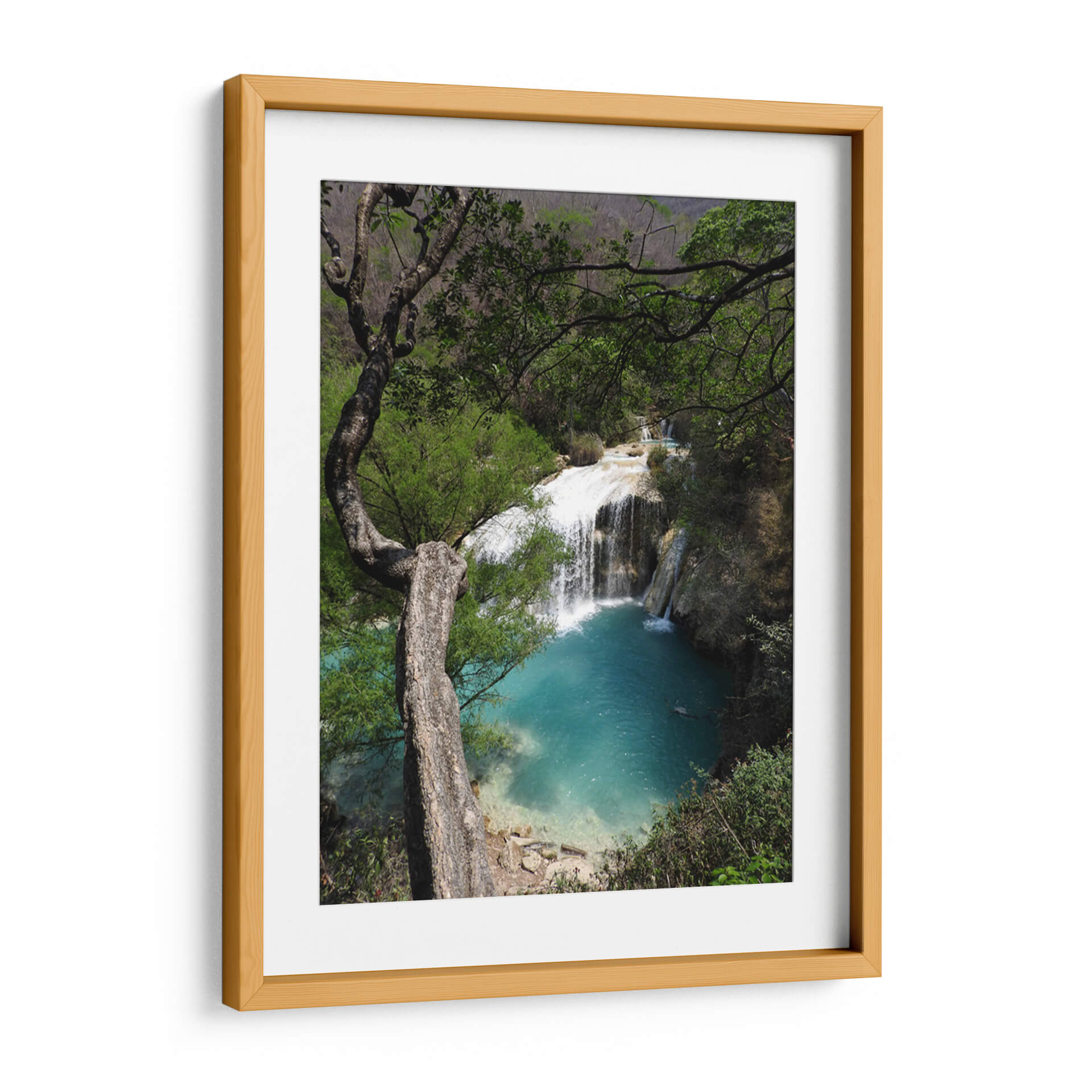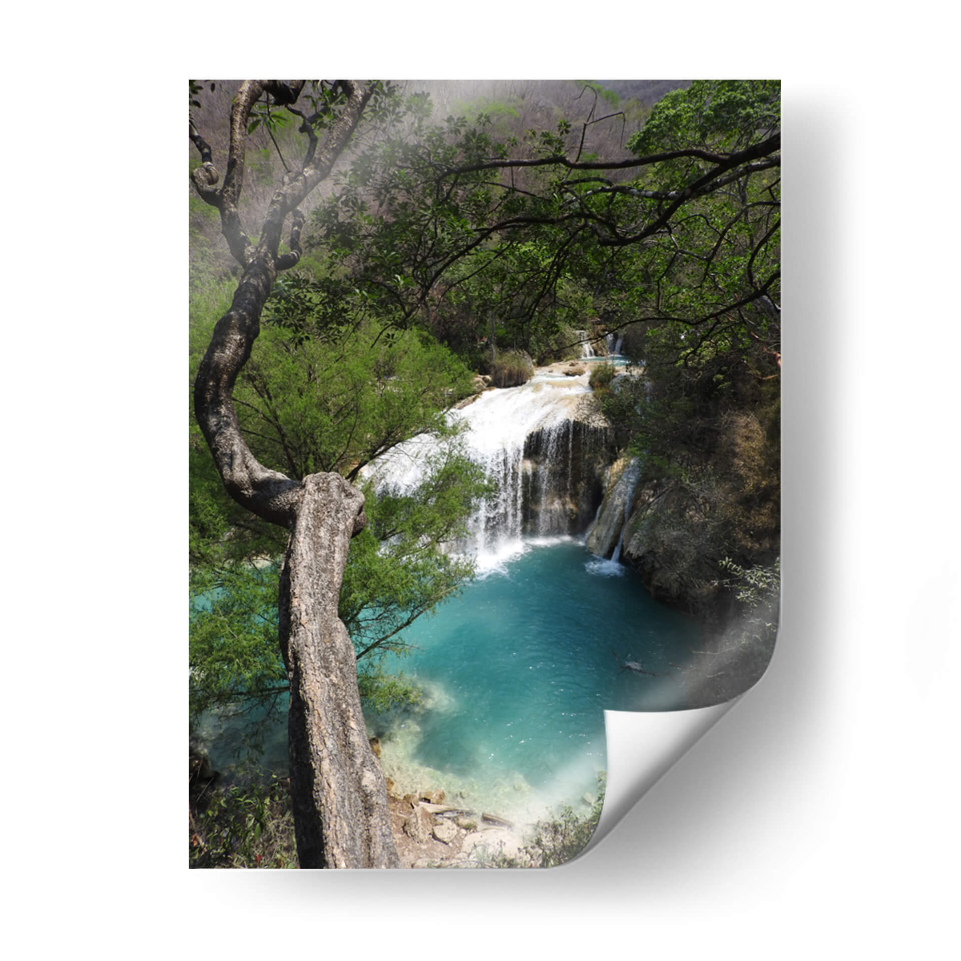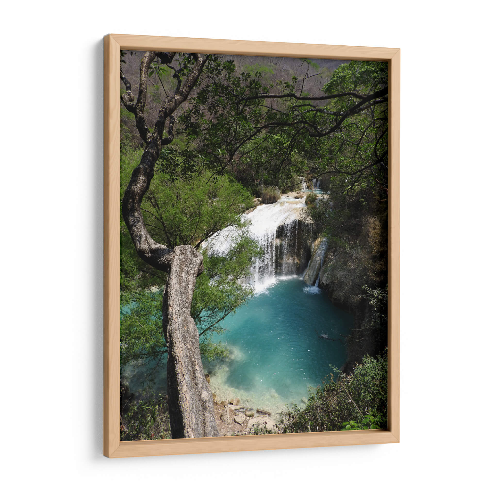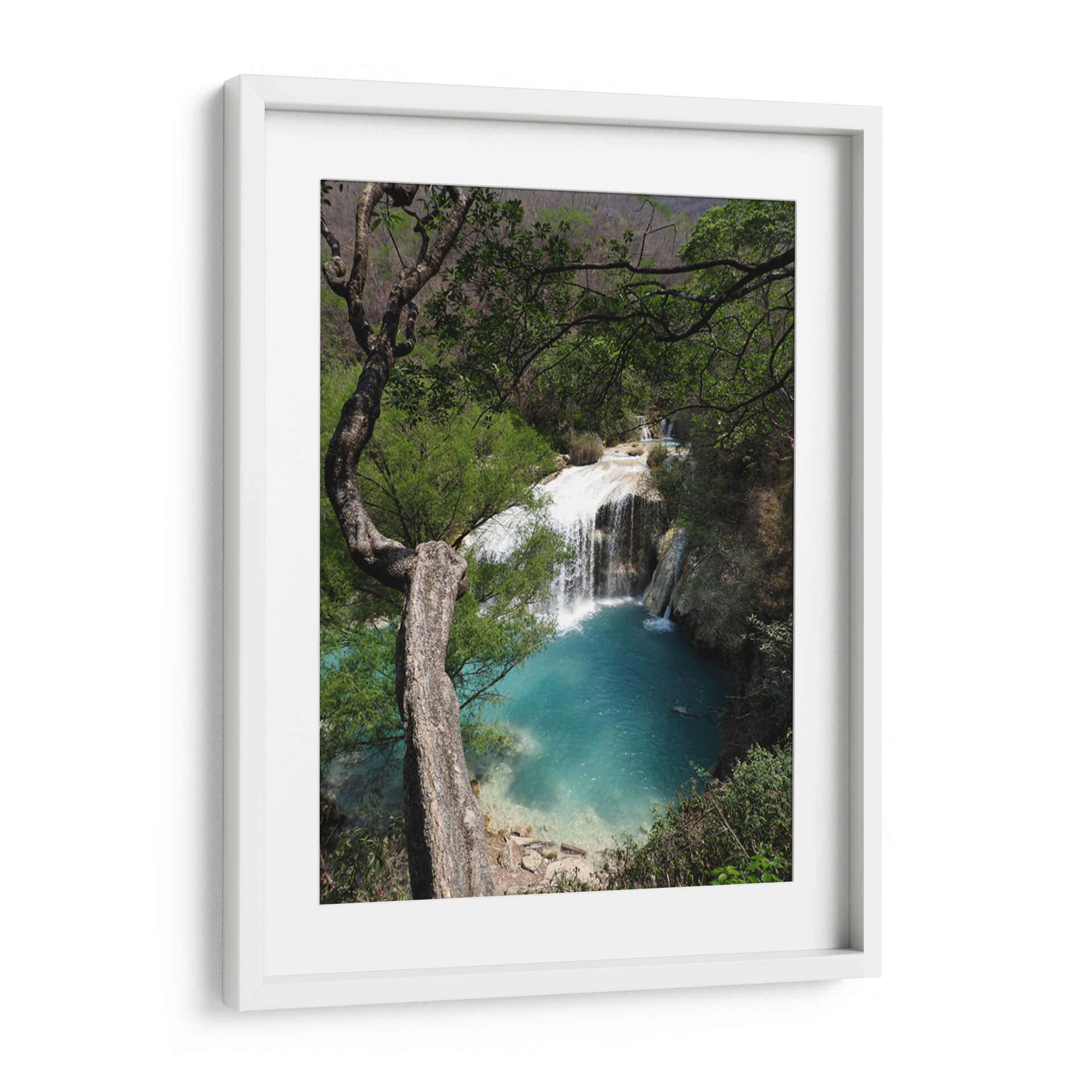Sumérgete en la serenidad de la naturaleza con este cautivador cuadro decorativo que captura la majestuosidad de "Abajo", una obra del artista Hugo Segura. La imagen te transporta a un rincón paradisíaco donde una cascada cristalina se desploma en una poza de vibrante color turquesa, rodeada por exuberante vegetación y la imponente presencia de un árbol retorcido. La paleta de colores, dominada por los tonos verdes intensos de la selva y los azules profundos del agua, crea una atmósfera de paz y frescura. La composición, con el árbol actuando como un marco natural, dirige la mirada hacia el hipnótico movimiento del agua y el contraste entre la fuerza de la caída y la calma del estanque. Este cuadro decorativo es perfecto para infundir una sensación de tranquilidad y conexión con la naturaleza en tu hogar u oficina. Ideal para salones, dormitorios o estudios que busquen un toque de escapismo y belleza natural. "Abajo" no es solo una pieza de arte, sino una ventana a la armonía del mundo natural, invitando a la contemplación y al relax. Añade esta obra maestra a tu colección y transforma tu espacio en un oasis de calma visual y espiritual, una representación auténtica de la serenidad que solo la naturaleza puede ofrecer.