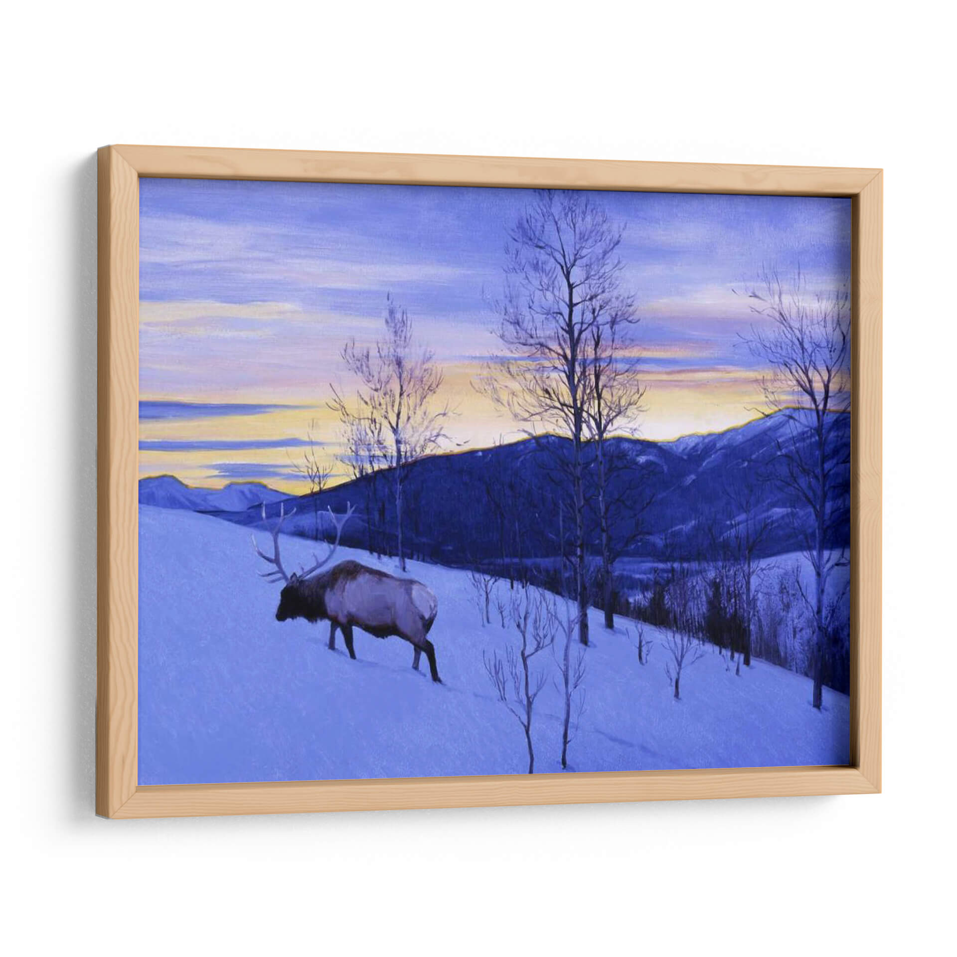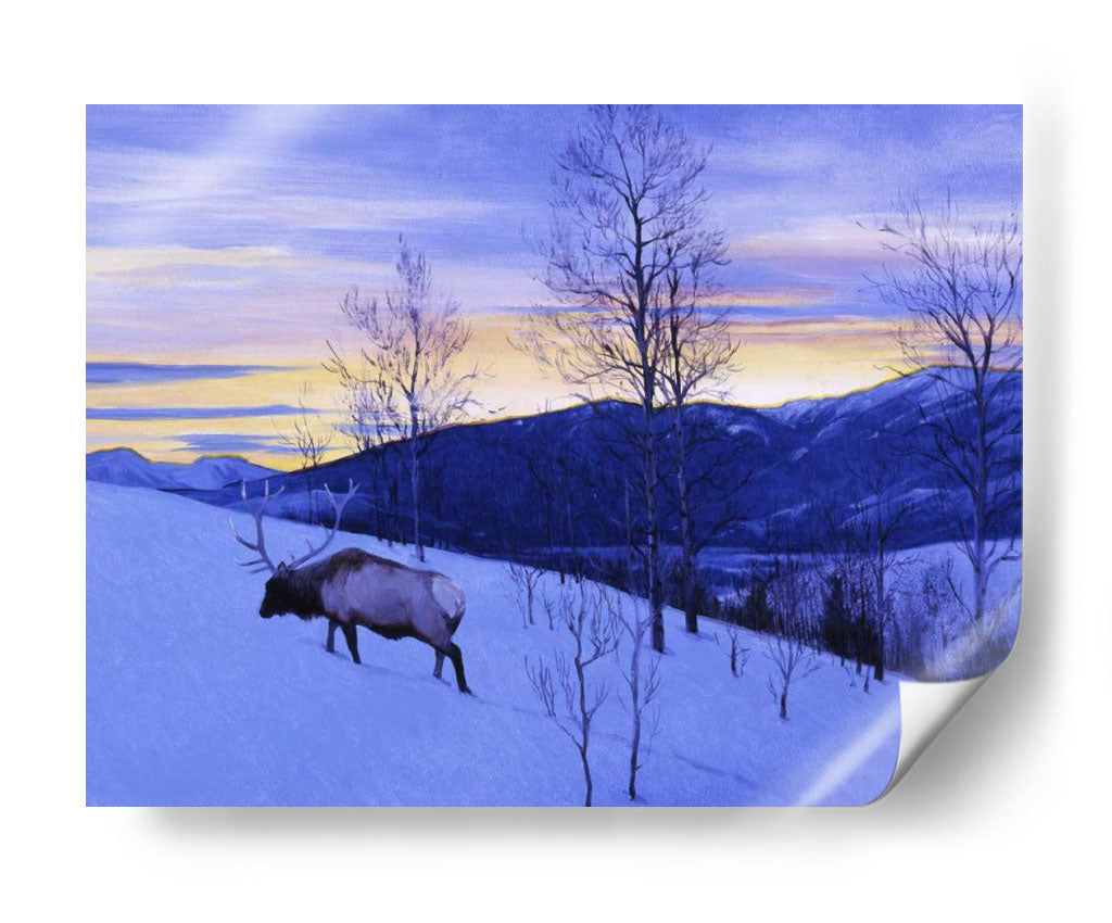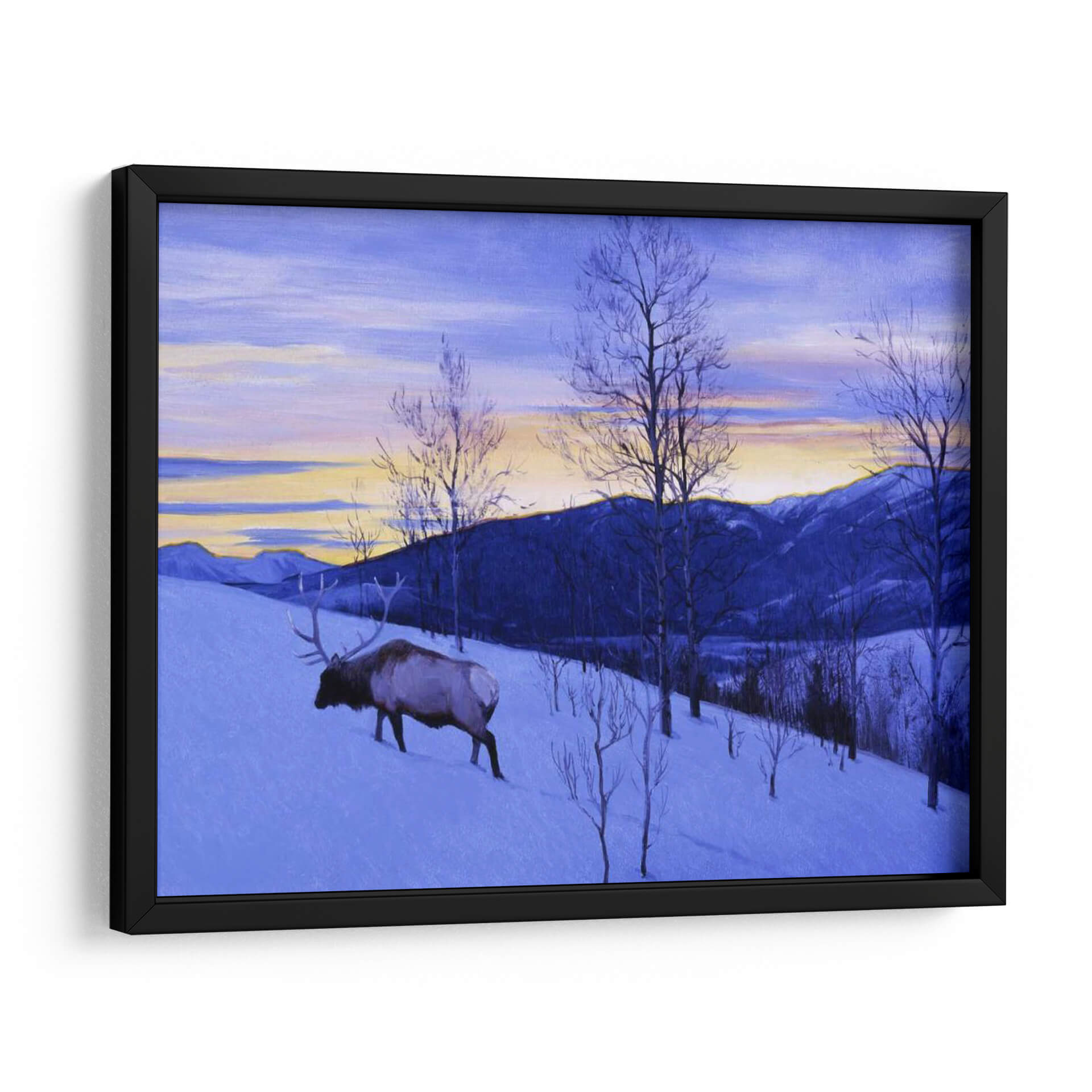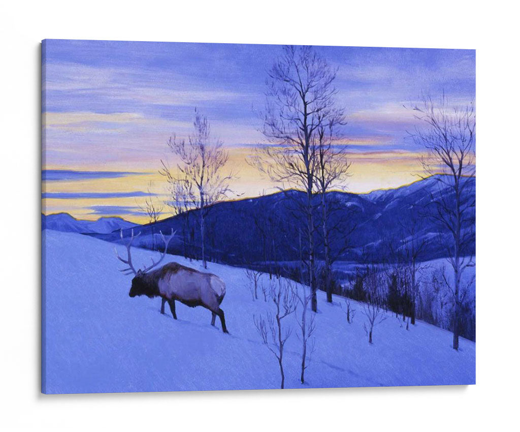 Sumérgete en la serena belleza invernal con "Acción De Gracias", una cautivadora obra de arte del artista Julie T. Chapman. Este cuadro decorativo captura un momento íntimo en un paisaje nevado bañado por la luz del atardecer. Un majestuoso ciervo se abre paso con determinación por una ladera cubierta de nieve, mientras el sol poniente tiñe el cielo de tonos dorados y violetas, creando un contraste hipnotizante con las siluetas oscuras de las montañas y los árboles desnudos. La paleta de colores, dominada por fríos azules y blancos que evocan la pureza del invierno, se ve realzada por el cálido resplandor del crepúsculo, aportando una sensación de paz y asombro. El estilo realista pero evocador de Chapman invita a la contemplación, haciendo de esta pieza un punto focal ideal para salones, comedores o estudios que busquen añadir un toque de naturaleza salvaje y tranquilidad. Este cuadro es perfecto para quienes aprecian el arte paisajístico con una narrativa sutil y una atmósfera envolvente, transformando cualquier espacio en un refugio de calma y belleza natural.