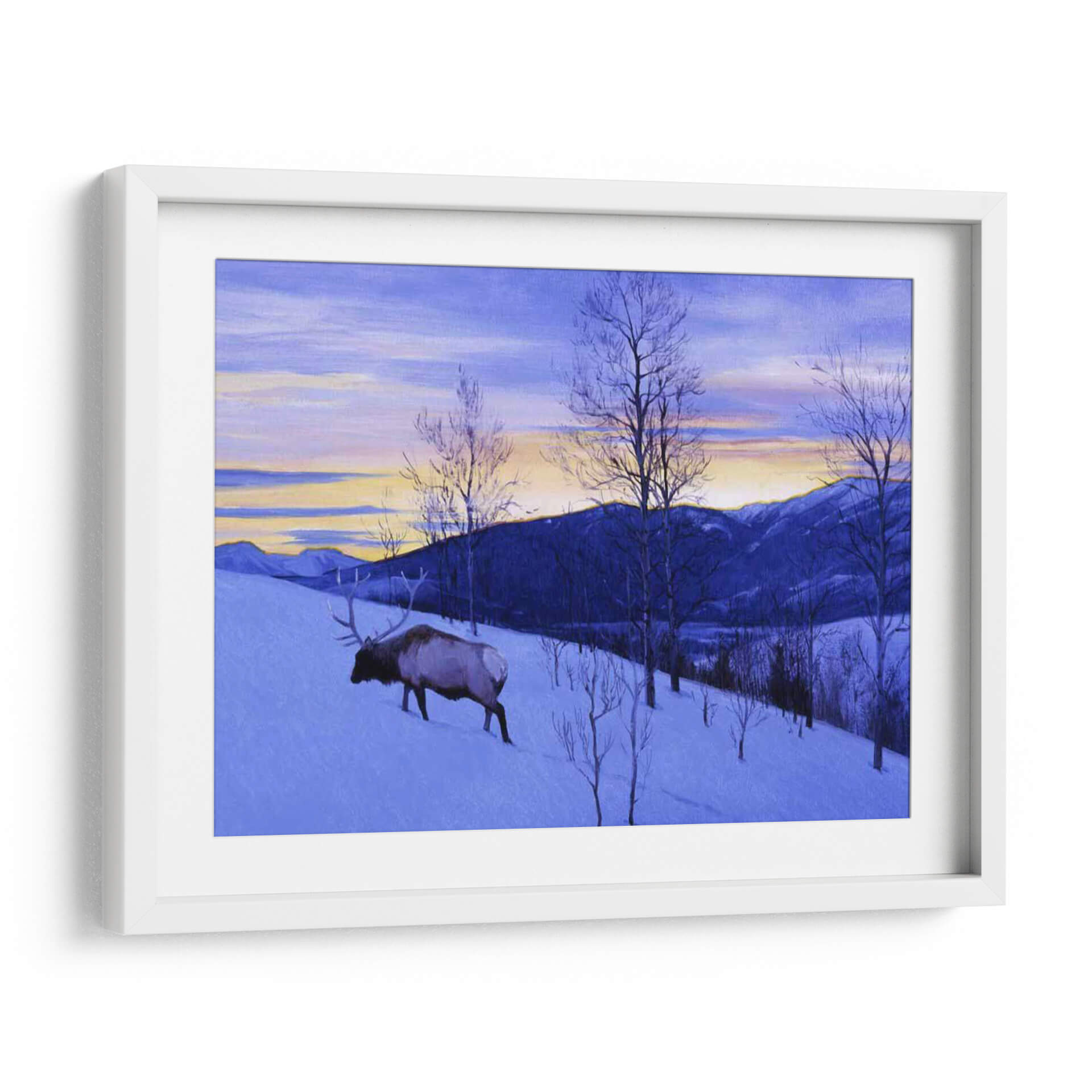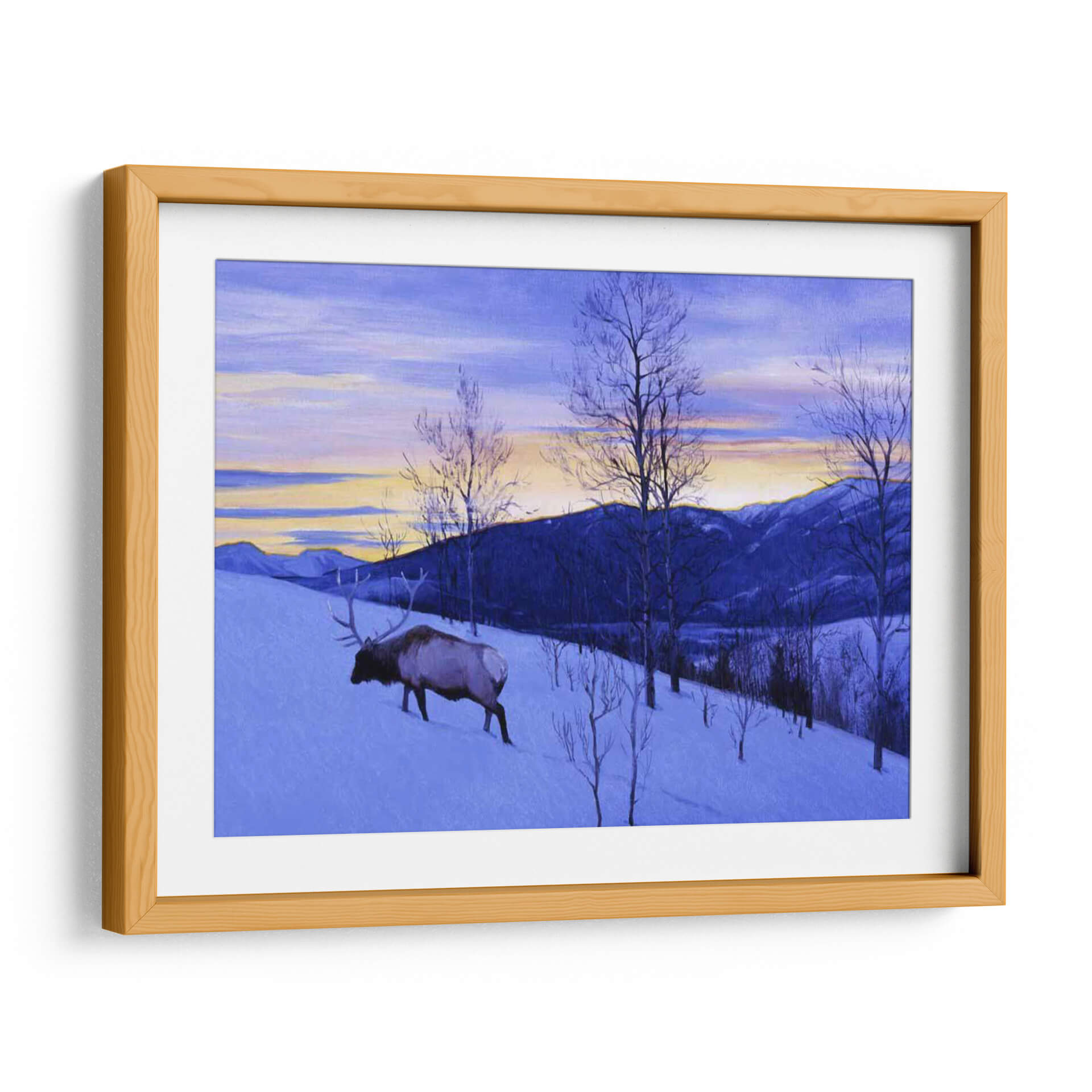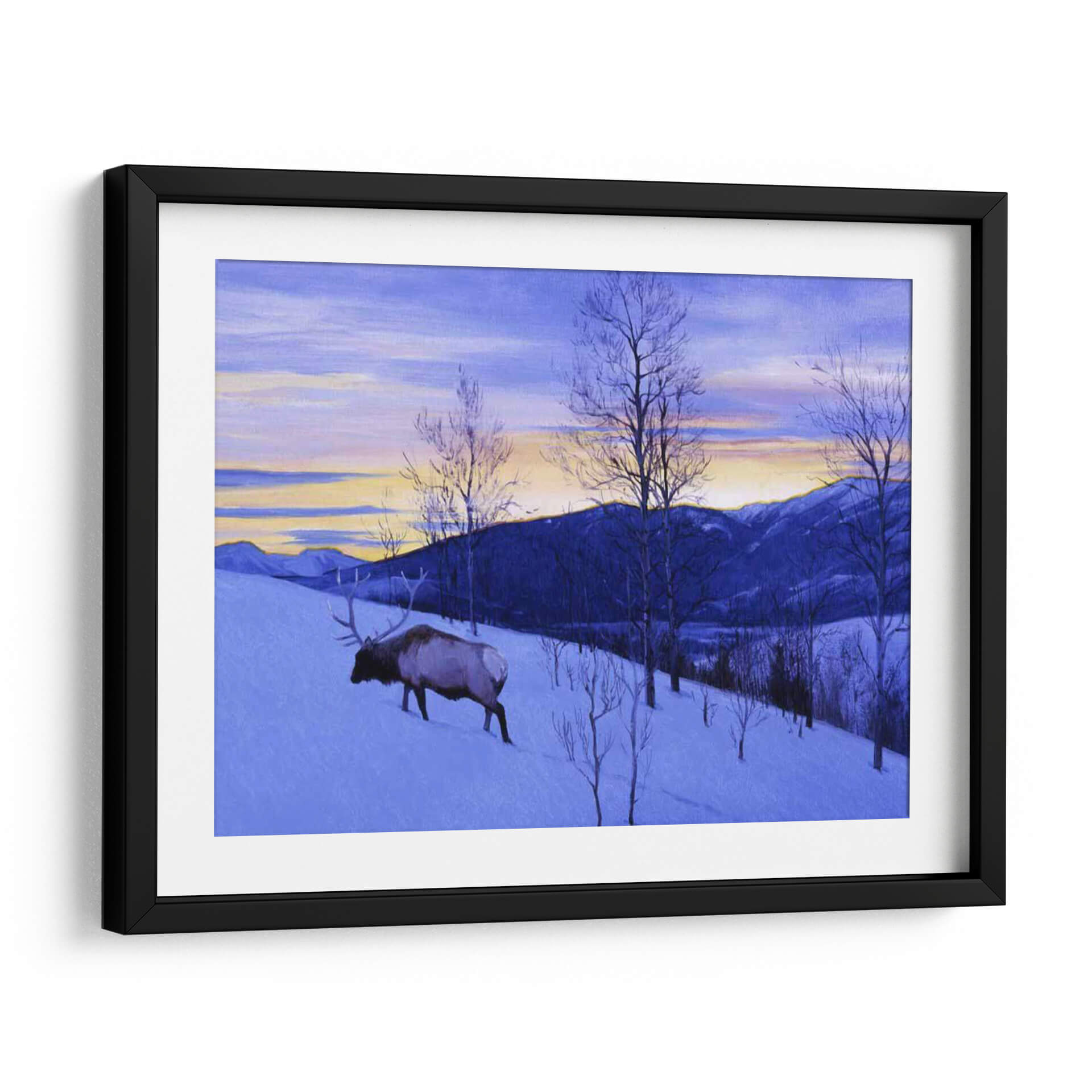 Sumérgete en la serena belleza invernal con "Acción De Gracias", una cautivadora obra de arte del artista Julie T. Chapman. Este cuadro decorativo captura un momento íntimo en un paisaje nevado bañado por la luz del atardecer. Un majestuoso ciervo se abre paso con determinación por una ladera cubierta de nieve, mientras el sol poniente tiñe el cielo de tonos dorados y violetas, creando un contraste hipnotizante con las siluetas oscuras de las montañas y los árboles desnudos. La paleta de colores, dominada por fríos azules y blancos que evocan la pureza del invierno, se ve realzada por el cálido resplandor del crepúsculo, aportando una sensación de paz y asombro. El estilo realista pero evocador de Chapman invita a la contemplación, haciendo de esta pieza un punto focal ideal para salones, comedores o estudios que busquen añadir un toque de naturaleza salvaje y tranquilidad. Este cuadro es perfecto para quienes aprecian el arte paisajístico con una narrativa sutil y una atmósfera envolvente, transformando cualquier espacio en un refugio de calma y belleza natural.