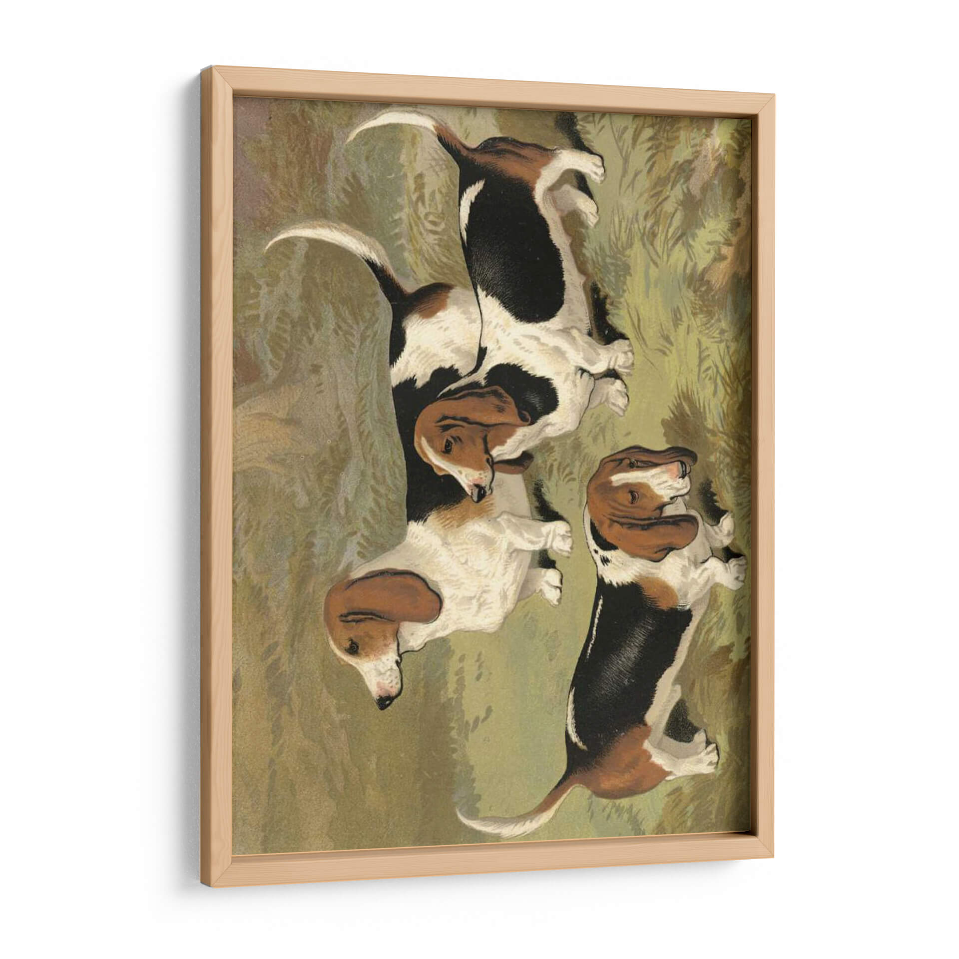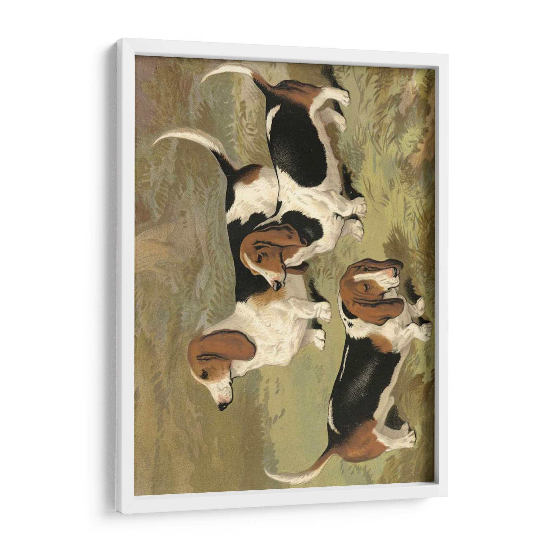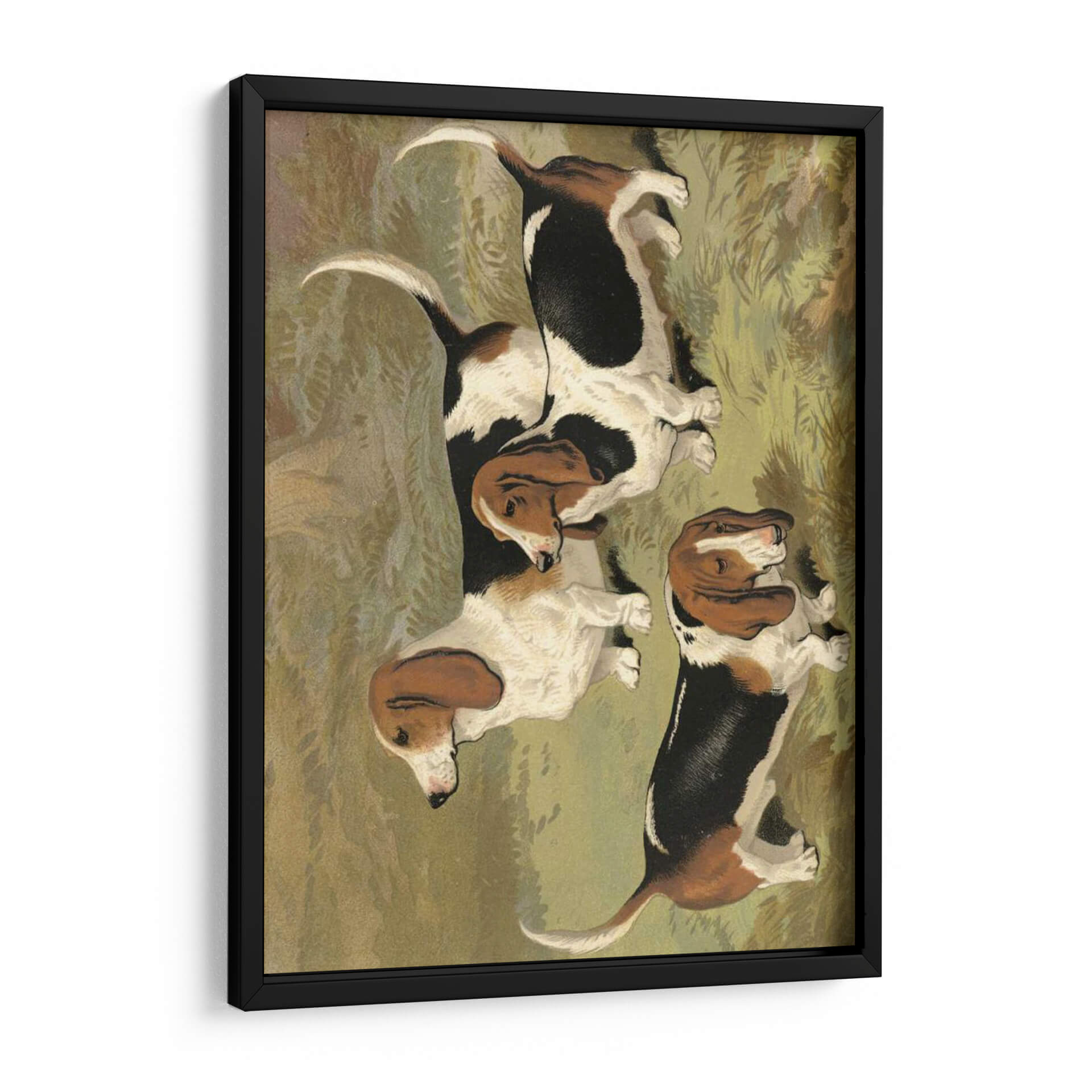 Emb uevo en un viaje visual con este encantador cuadro decorativo que presenta un grupo de Basset Hounds, obra de la artista Vero Shaw. La pieza capta la esencia de estos perros icónicos con sus largas orejas caídas y expresiones amables, desplegándose en un entorno que evoca la naturaleza y la tranquilidad. La paleta de colores se centra en tonos terrosos y verdes apagados, creando una atmósfera serena y acogedora que invita a la contemplación. El estilo de la obra, con pinceladas que sugieren un realismo nostálgico, añade profundidad y carácter a la composición. Cada Basset Hound está representado con un encanto particular, y su disposición conjunta transmite una sensación de camaradería y calma. Este cuadro es ideal para añadir un toque de calidez y personalidad a cualquier espacio, ya sea una sala de estar, un estudio o incluso una habitación infantil. Su temática centrada en mascotas y su ejecución artística lo convierten en una pieza versátil, perfecta para amantes de los perros y para aquellos que buscan un arte decorativo que combine ternura y sofisticación.