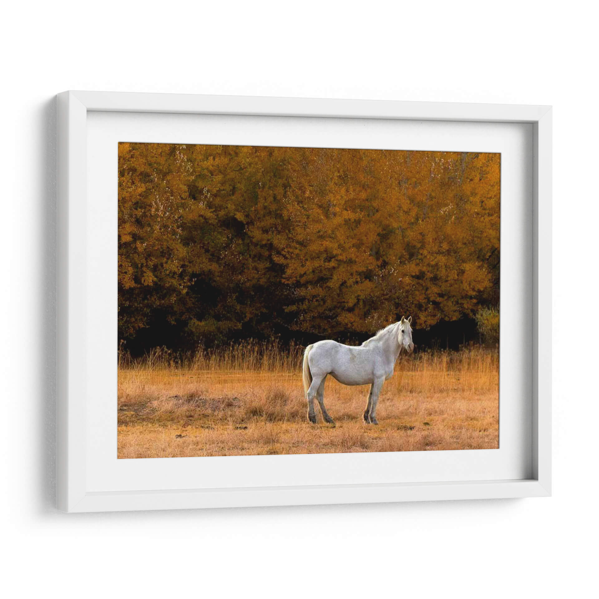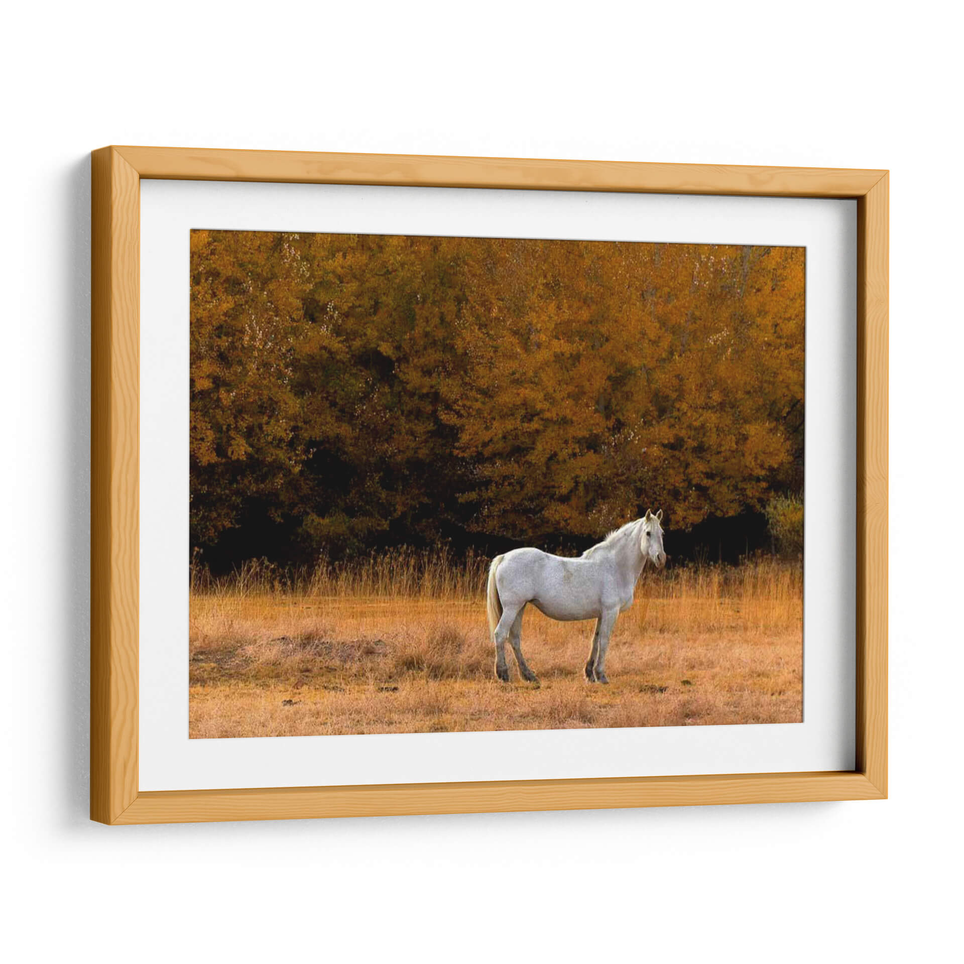 Captura la majestuosidad de la naturaleza con "Caballo Blanco", una obra de arte que evoca serenidad y fuerza. Este cuadro decorativo presenta un imponente caballo blanco de pie en un campo de hierba dorada, con un exuberante bosque de otoño como telón de fondo. Los vibrantes tonos ocres y dorados del follaje otoñal contrastan maravillosamente con la pureza del blanco del caballo, creando una composición visualmente cautivadora. La luz cálida baña la escena, sugiriendo una atmósfera pacífica y atemporal. La expresión serena del caballo y la profundidad del paisaje invitan a la contemplación, haciendo de esta pieza una adición perfecta para cualquier espacio que busque un toque de elegancia natural y tranquilidad. Ideal para salones, dormitorios o estudios que deseen infundir calma y sofisticación. "Caballo Blanco" es más que una imagen; es una ventana a la belleza indómita, una pieza que inspira y eleva cualquier decoración interior.