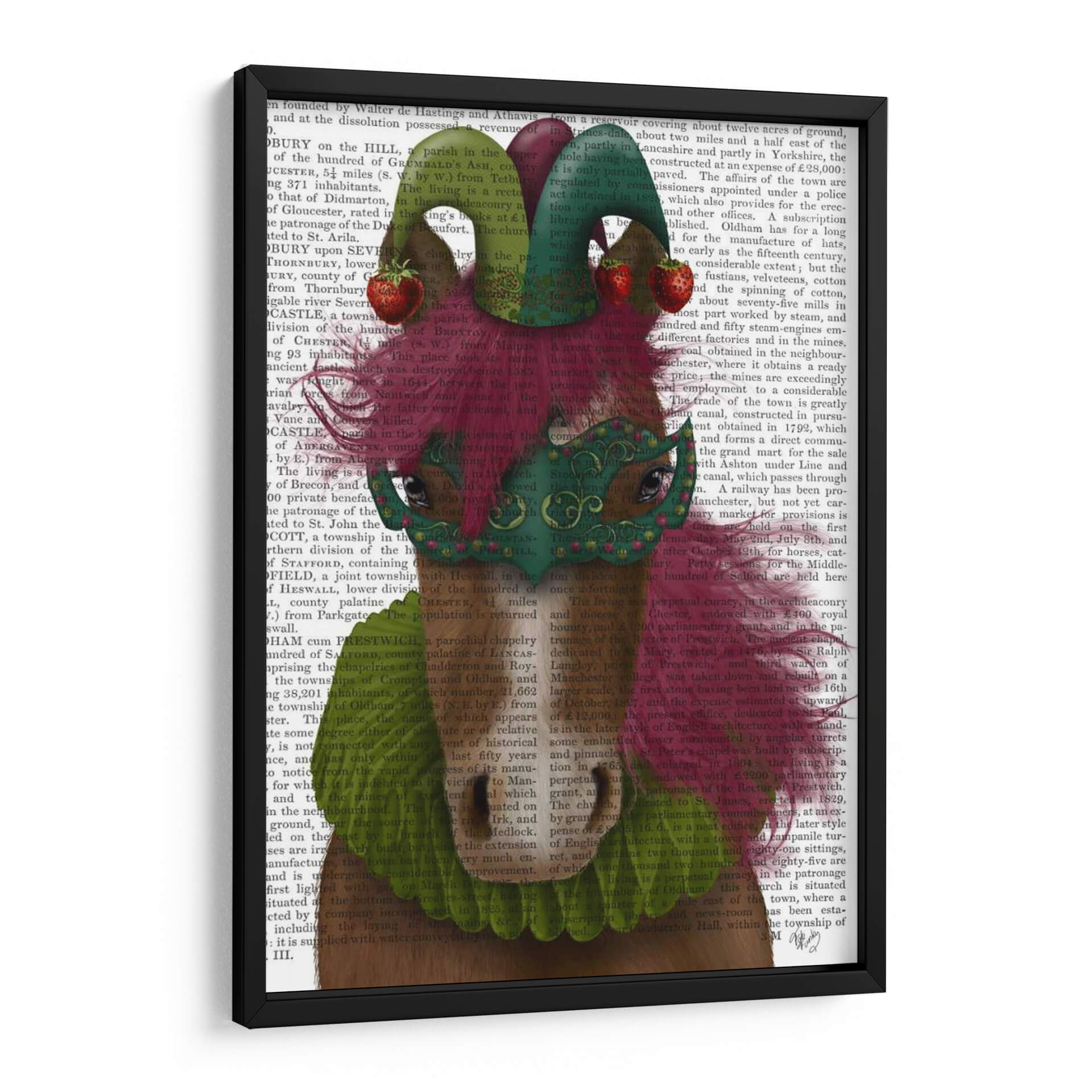 Sumérgete en el mundo caprichoso de "Caballo Fresa Tonto II", una obra de arte digital que combina la inocencia con un toque de misterio festivo. Este cuadro decorativo presenta un caballo ataviado con una máscara de arlequín y un gorro de bufón adornado con fresas, evocando una sensación de juego y fantasía. La paleta de colores, dominada por verdes profundos y acentos vibrantes de rojo y rosa, crea un contraste cautivador que atrae la mirada. El fondo texturizado, reminiscentes de páginas antiguas, añade una capa de profundidad e intriga a la pieza, sugiriendo una narrativa oculta. El estilo artístico, una mezcla única de lo juguetón y lo detallado, lo convierte en un punto focal ideal para cualquier espacio que busque un toque de personalidad y originalidad. Perfecto para una sala de estar moderna, un estudio creativo o incluso un dormitorio lleno de carácter, este cuadro decorativo invita a la contemplación y la sonrisa. Su composición equilibra la expresividad del sujeto con la sutileza del fondo, asegurando que sea tanto llamativo como armonioso. Transforma tu hogar en una galería de arte personal con esta pieza única que celebra la alegría y la imaginación. ---