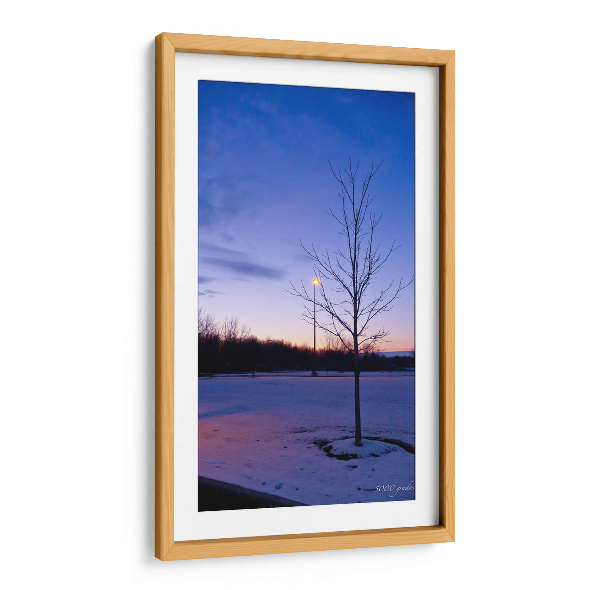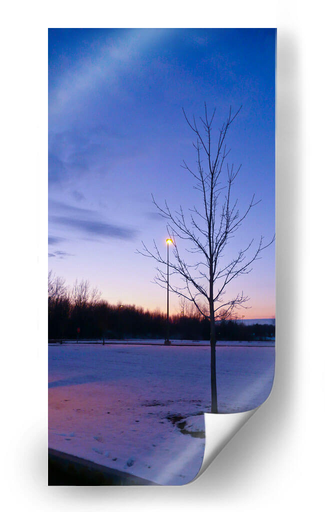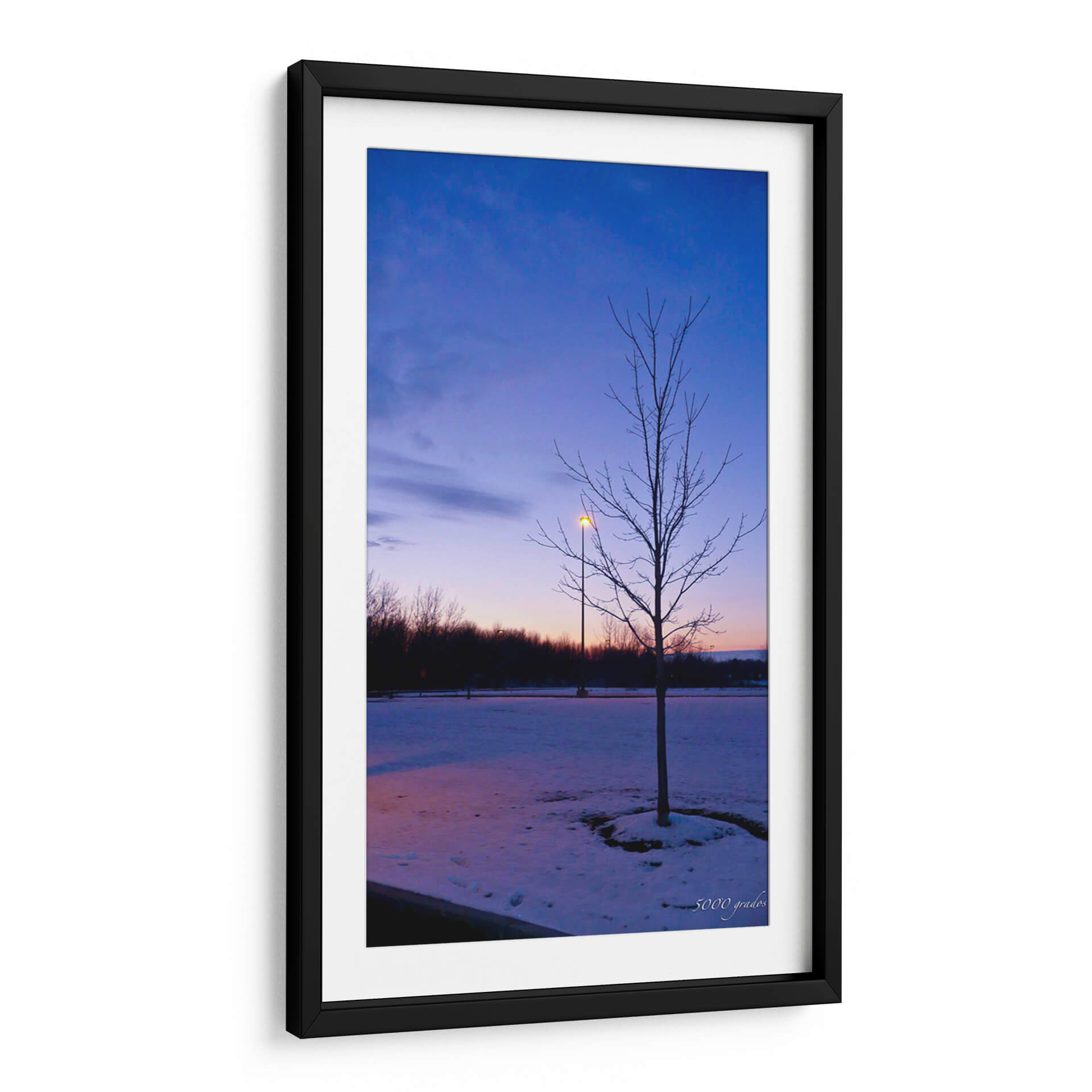 Captura la esencia del invierno y la serenidad con nuestro cuadro decorativo 'Caducifolio con Nieve', una obra de arte que evoca la calma de una tarde invernal. La imagen presenta un árbol desnudo y solitario recortándose contra un cielo crepuscular de profundos tonos azules y púrpuras, salpicado por las tenues luces de un farol. El paisaje nevado se extiende hasta el horizonte, donde una línea de árboles oscuros y un cielo teñido de los últimos rayos del sol crean una atmósfera de paz y contemplación. Los colores fríos predominantes, con toques cálidos del atardecer y la iluminación artificial, generan un contraste visual cautivador que aporta profundidad y carácter a cualquier espacio. Este cuadro decorativo es perfecto para añadir un toque de elegancia minimalista y naturaleza serena a tu sala de estar, dormitorio u oficina. Su composición limpia y su paleta de colores sutiles lo convierten en un elemento versátil que complementa tanto decoraciones modernas como clásicas, invitando a la reflexión y al disfrute de la belleza efímera de la estación invernal. Transforma tu hogar en un refugio de tranquilidad con esta pieza única que captura la melancolía y la belleza silenciosa de la nieve.