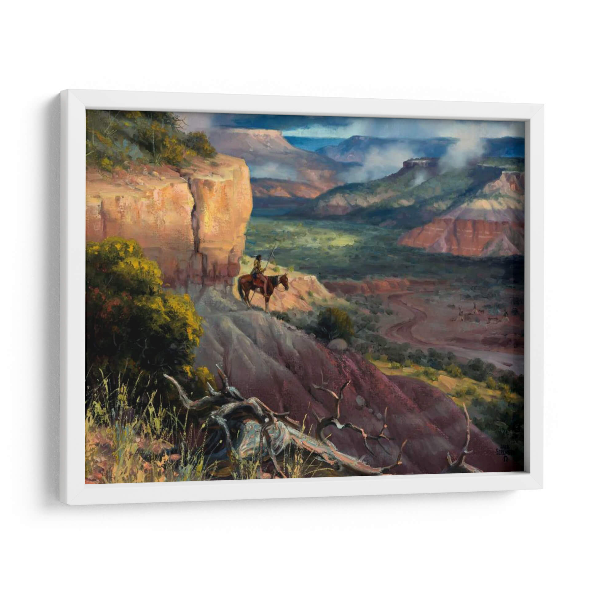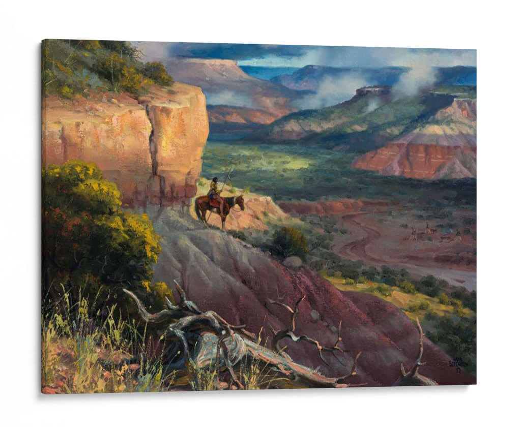 Sumérgete en la majestuosidad del oeste americano con "Campamento A Lo Largo Del Timbercreek", una obra de arte que captura la esencia de la exploración y la conexión con la naturaleza. Este cuadro decorativo te transporta a un paisaje imponente, donde un jinete solitario a caballo se alza sobre un acantilado, contemplando un vasto cañón bañado por la luz dorada del atardecer. Los colores cálidos de la tierra, los ocres, rojos y verdes profundos se entrelazan con las sombras que se alargan, creando una atmósfera de paz y aventura. La pincelada detallada y el estilo realista pero evocador de Jack Sorenson dan vida a cada elemento, desde la textura de las rocas hasta el follaje de los árboles y la serenidad del río que serpentea en la distancia. Esta pieza es perfecta para añadir un toque de historia, aventura y belleza natural a tu hogar u oficina. Imagina este impresionante paisaje como punto focal en tu sala de estar, estudio o incluso en un dormitorio, infundiendo un sentido de tranquilidad y asombro. "Campamento A Lo Largo Del Timbercreek" no es solo una decoración, es una invitación a la reflexión y a la contemplación de la indómita belleza del paisaje natural. Ideal para amantes del arte de temática western, paisajista o para quienes buscan una pieza que evoque historias y emociones.